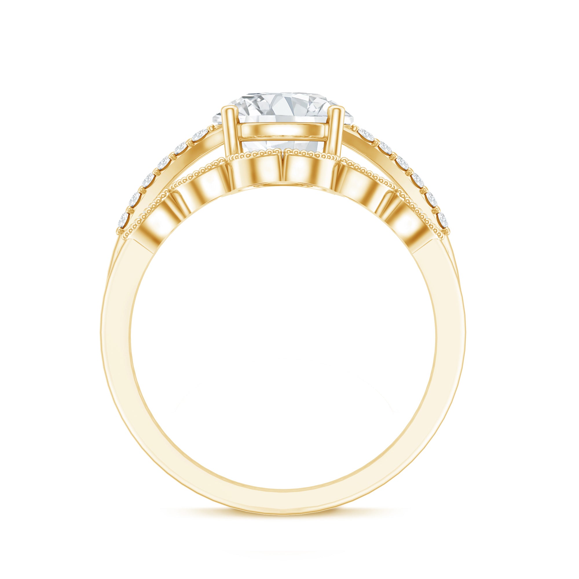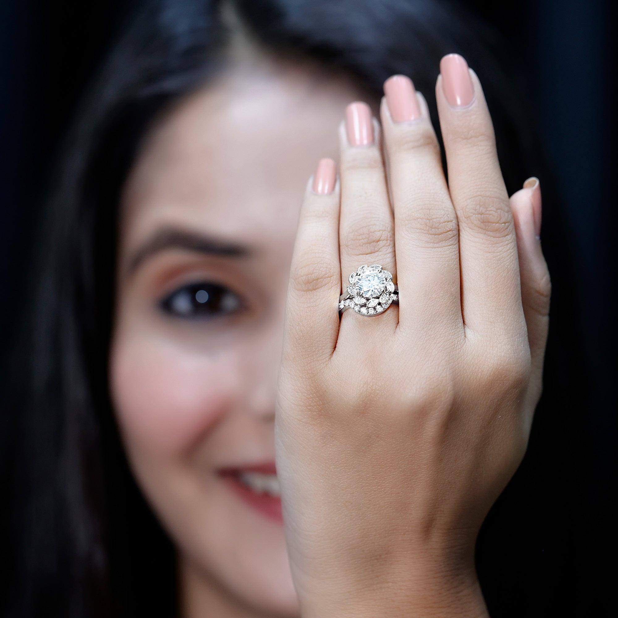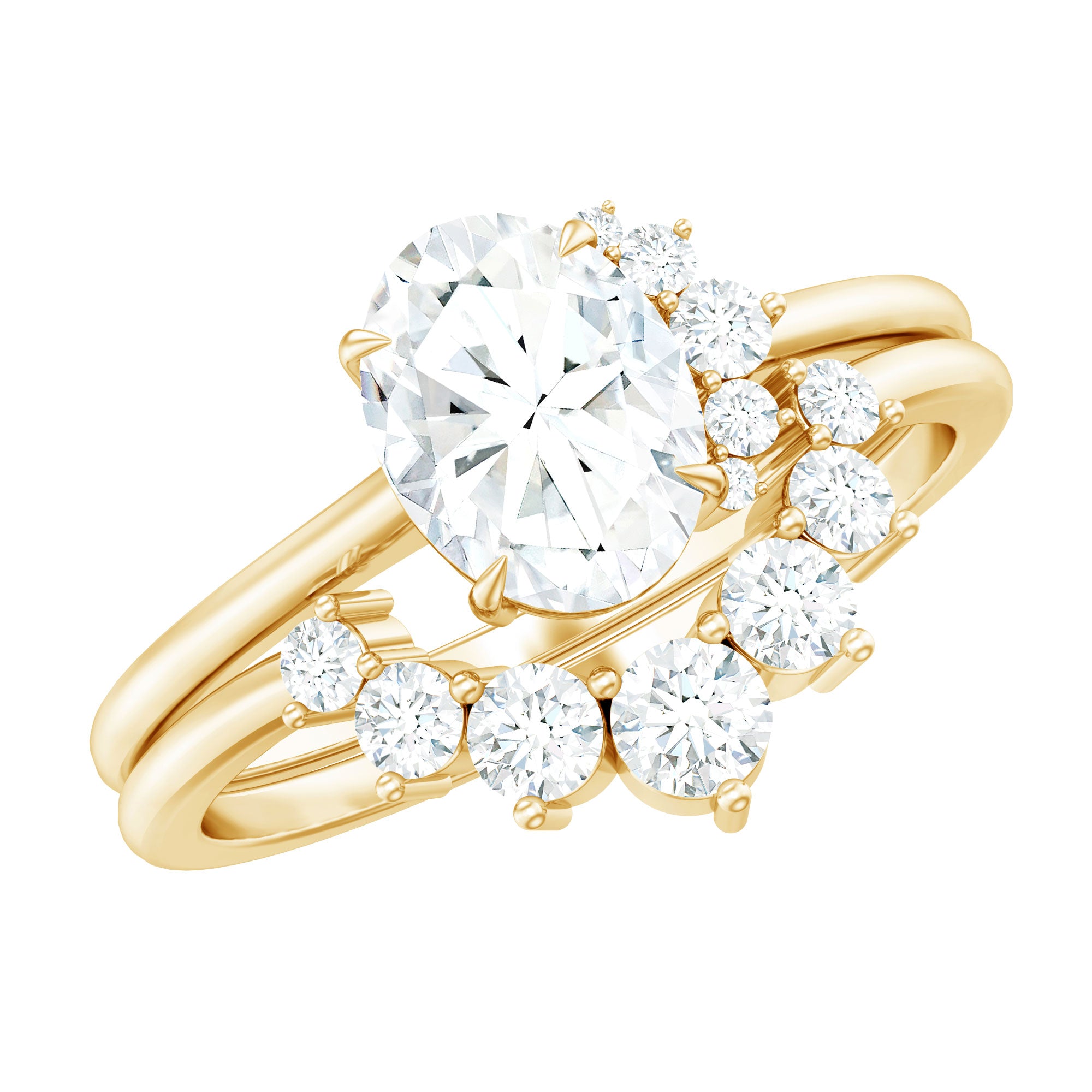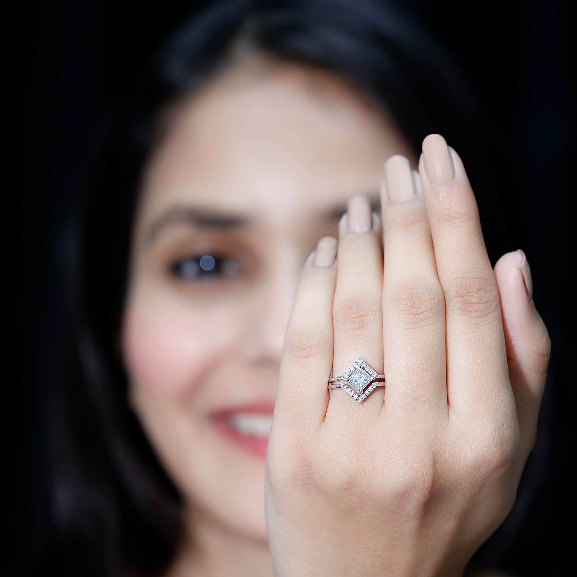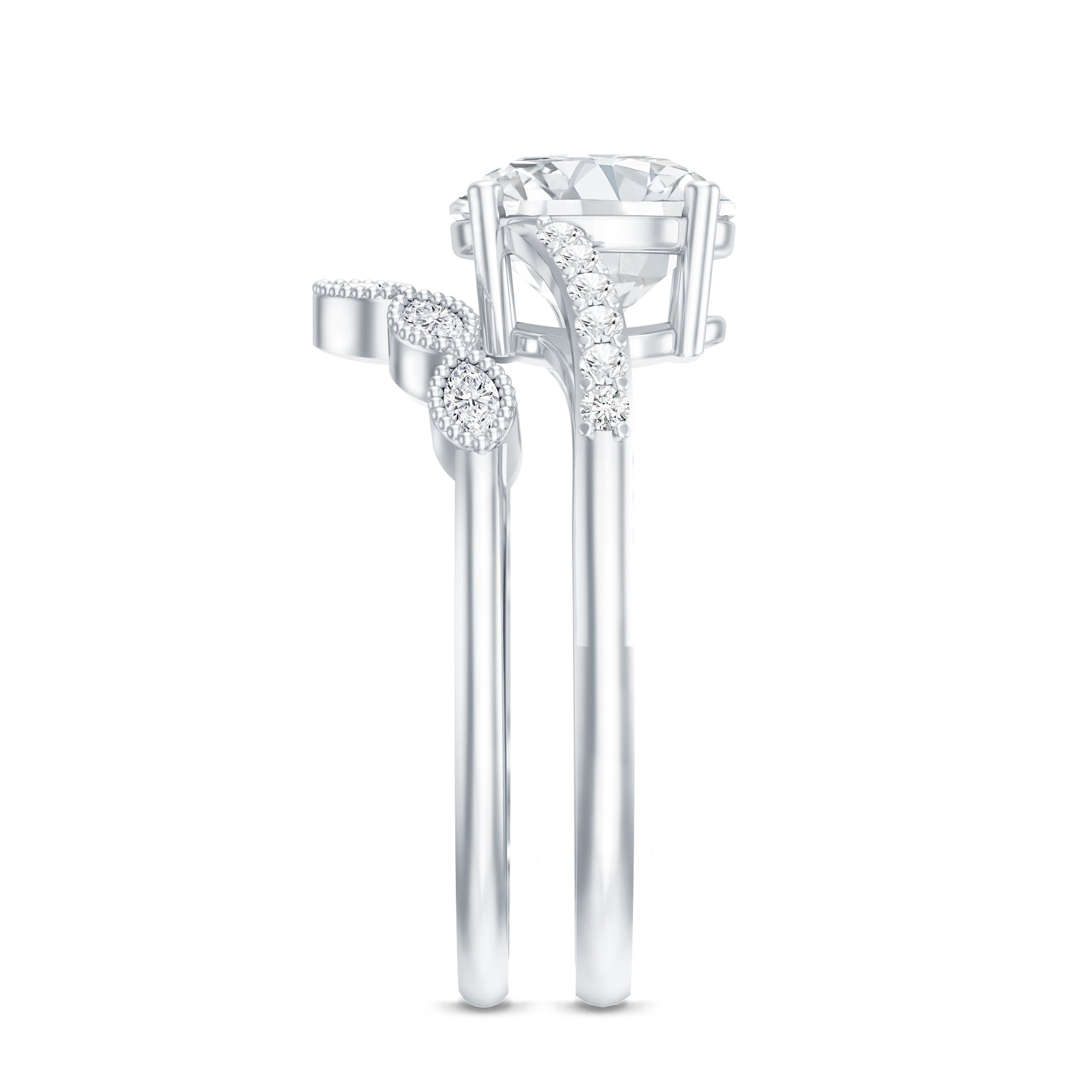 - Ring enhancer / guard: wraps around the engagement ring to create a “framed” look.