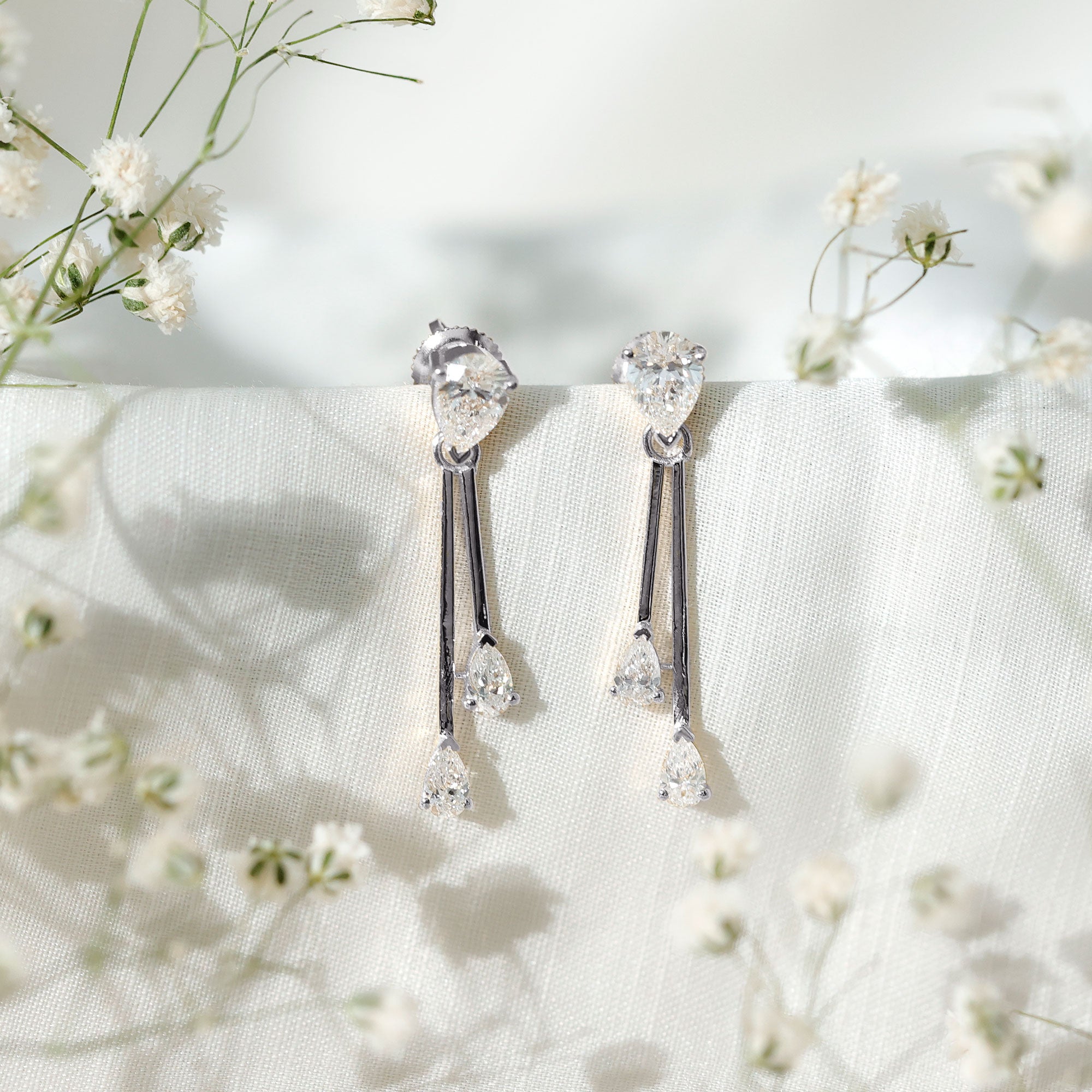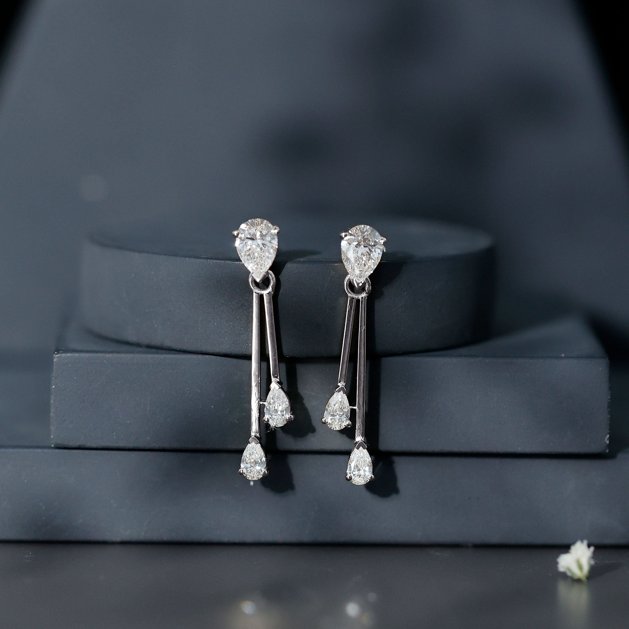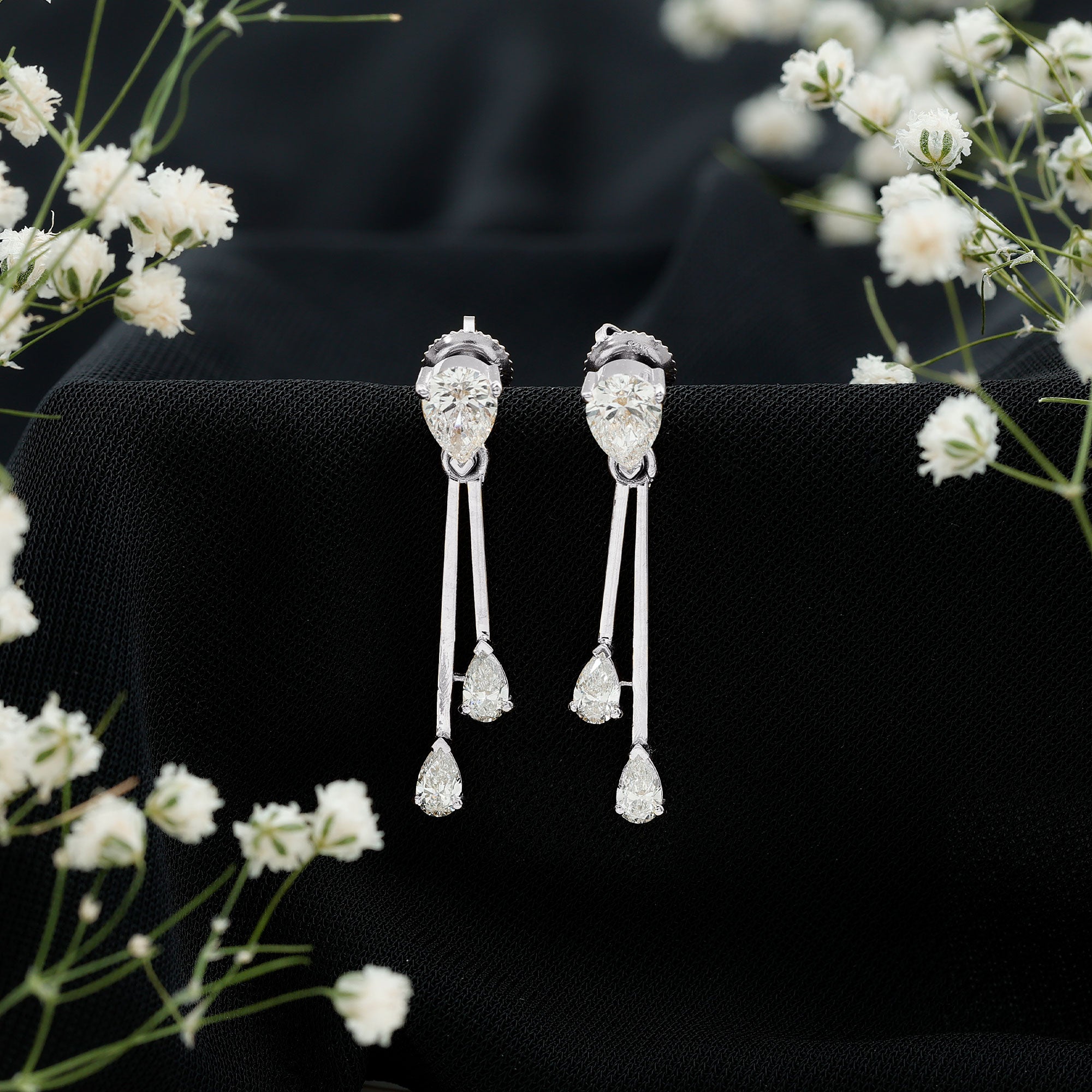 Drop earrings usually hang under an inch to a few inches in length, below the earlobe. The shorter lab grown diamond drops are usually preferred for casual occasions, while longer styles make a striking statement for formal events.