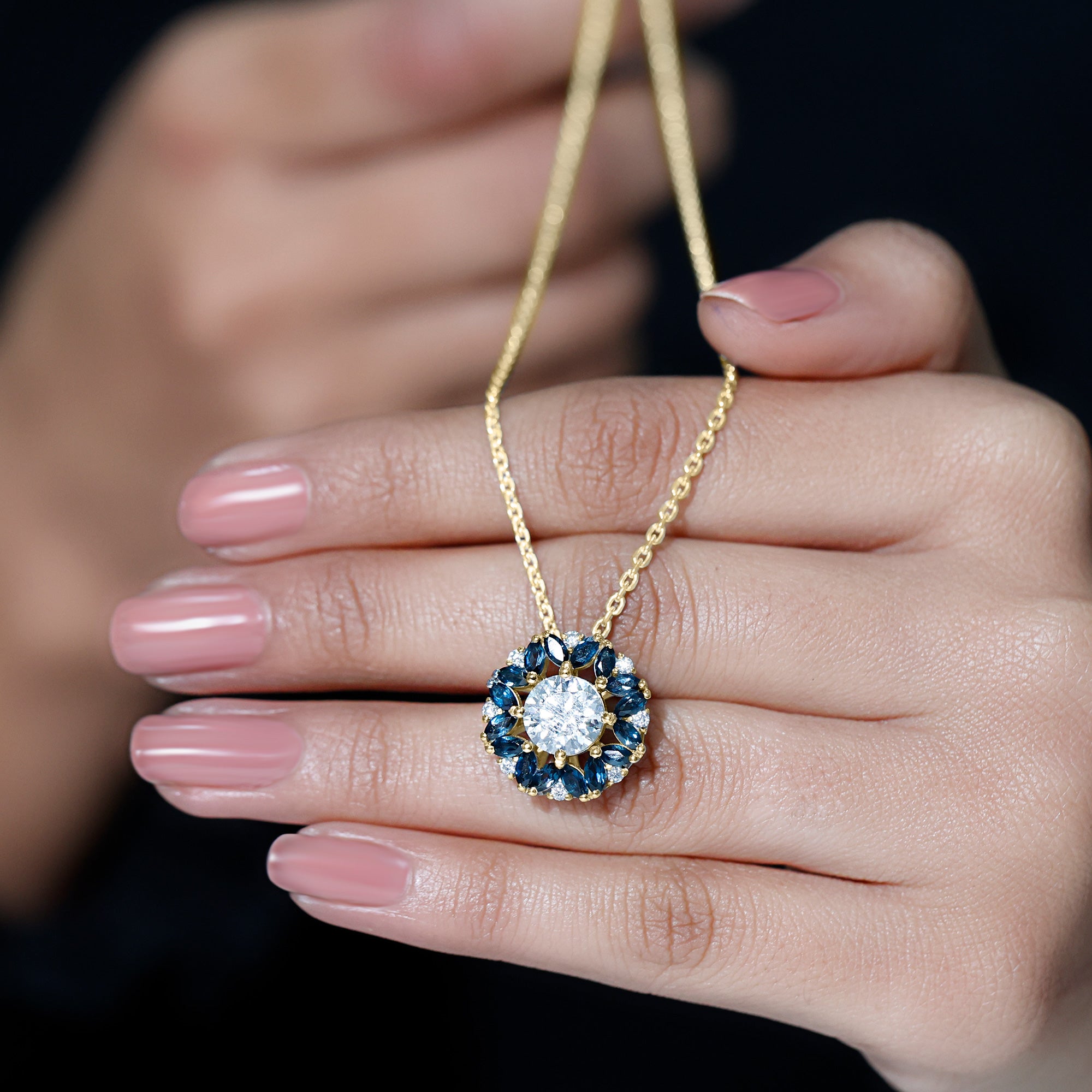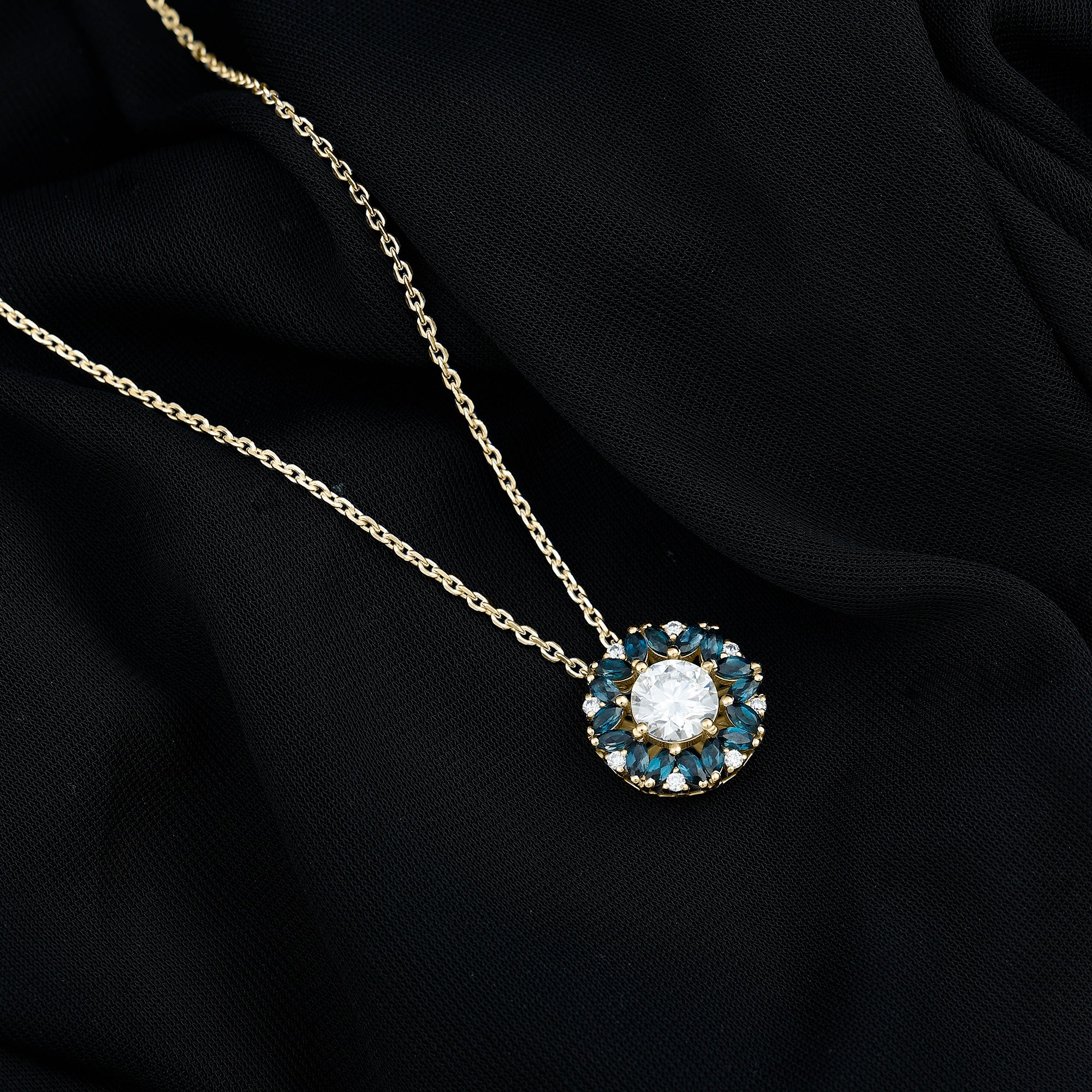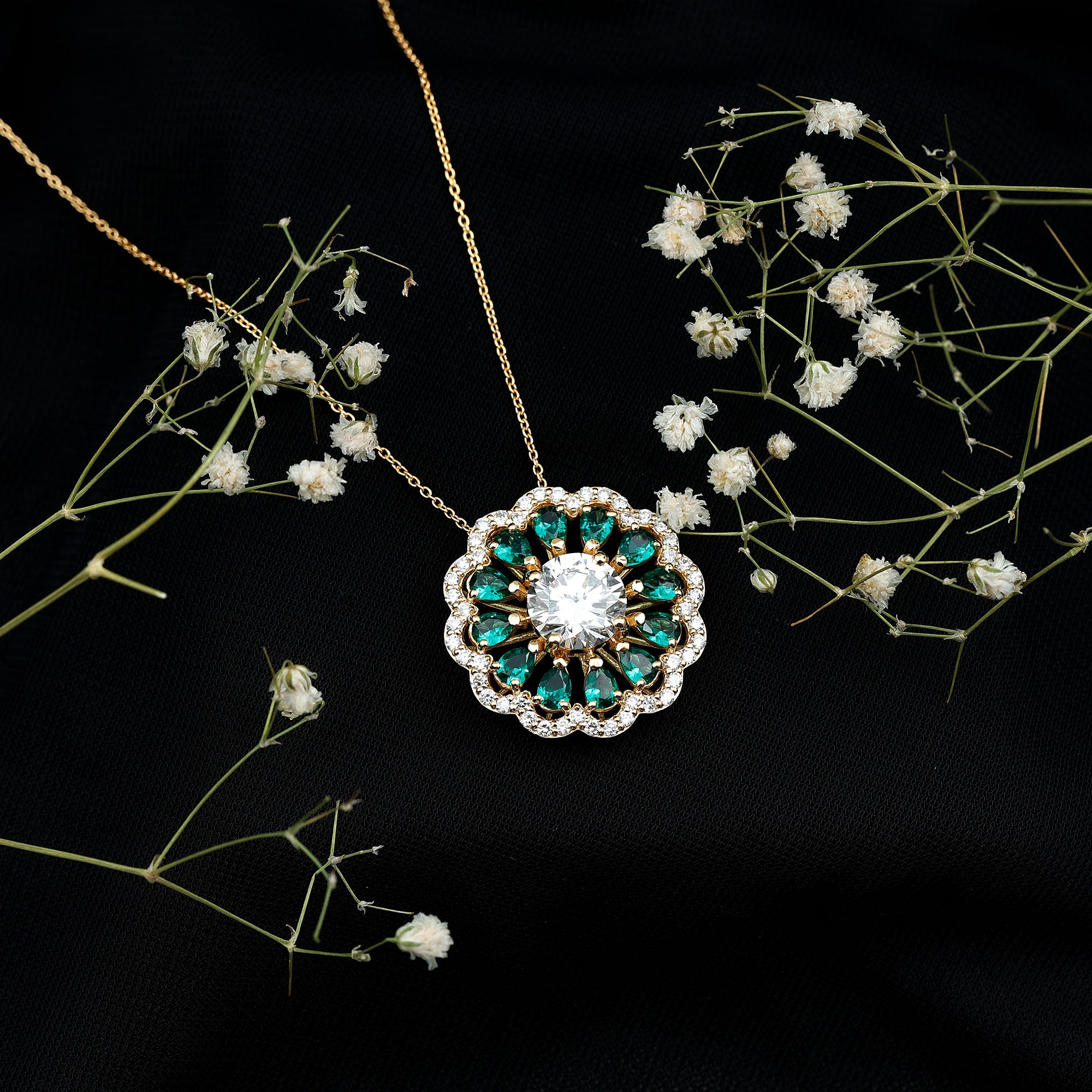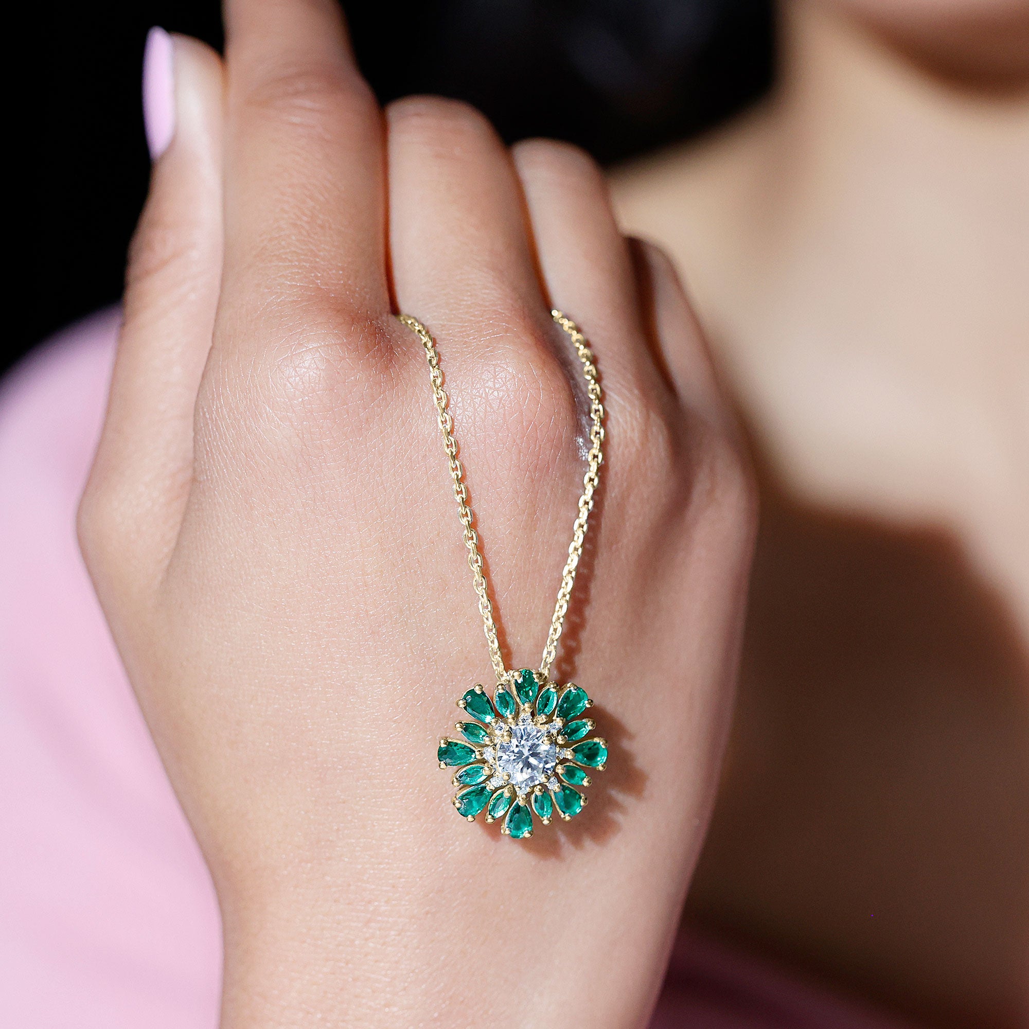 Halo: It features a central lab grown diamond surrounded by a sparkling halo of smaller diamonds or other colored gemstones. The halo pattern adds extra spark to the piece.