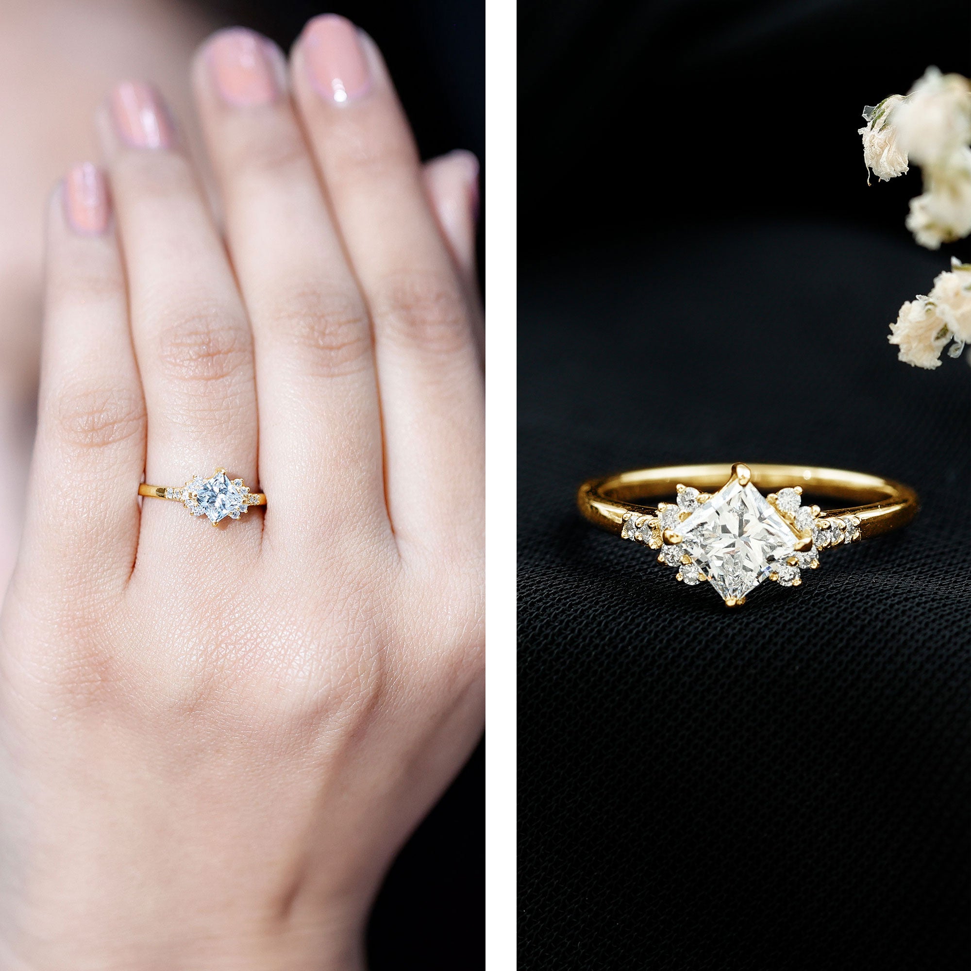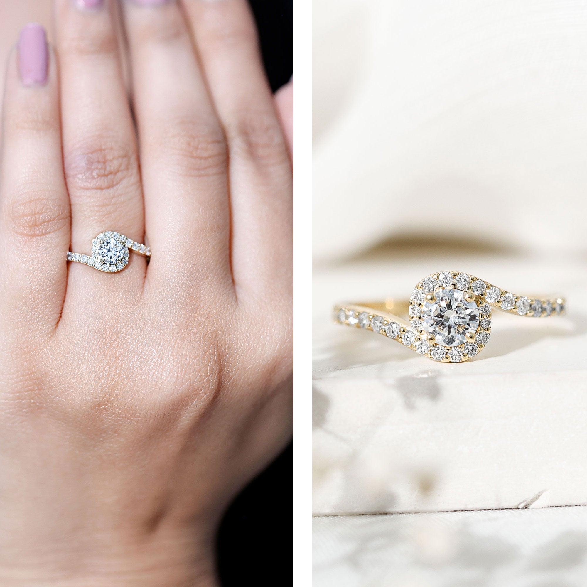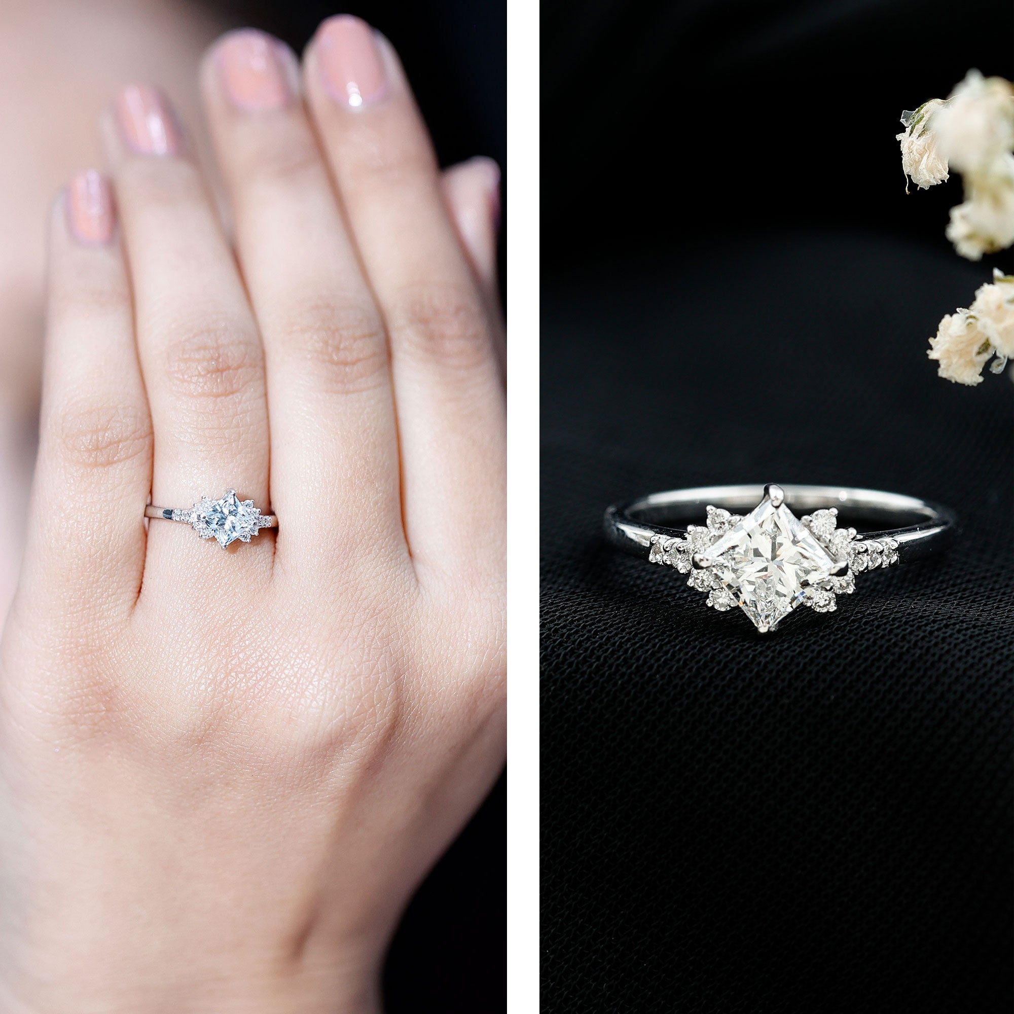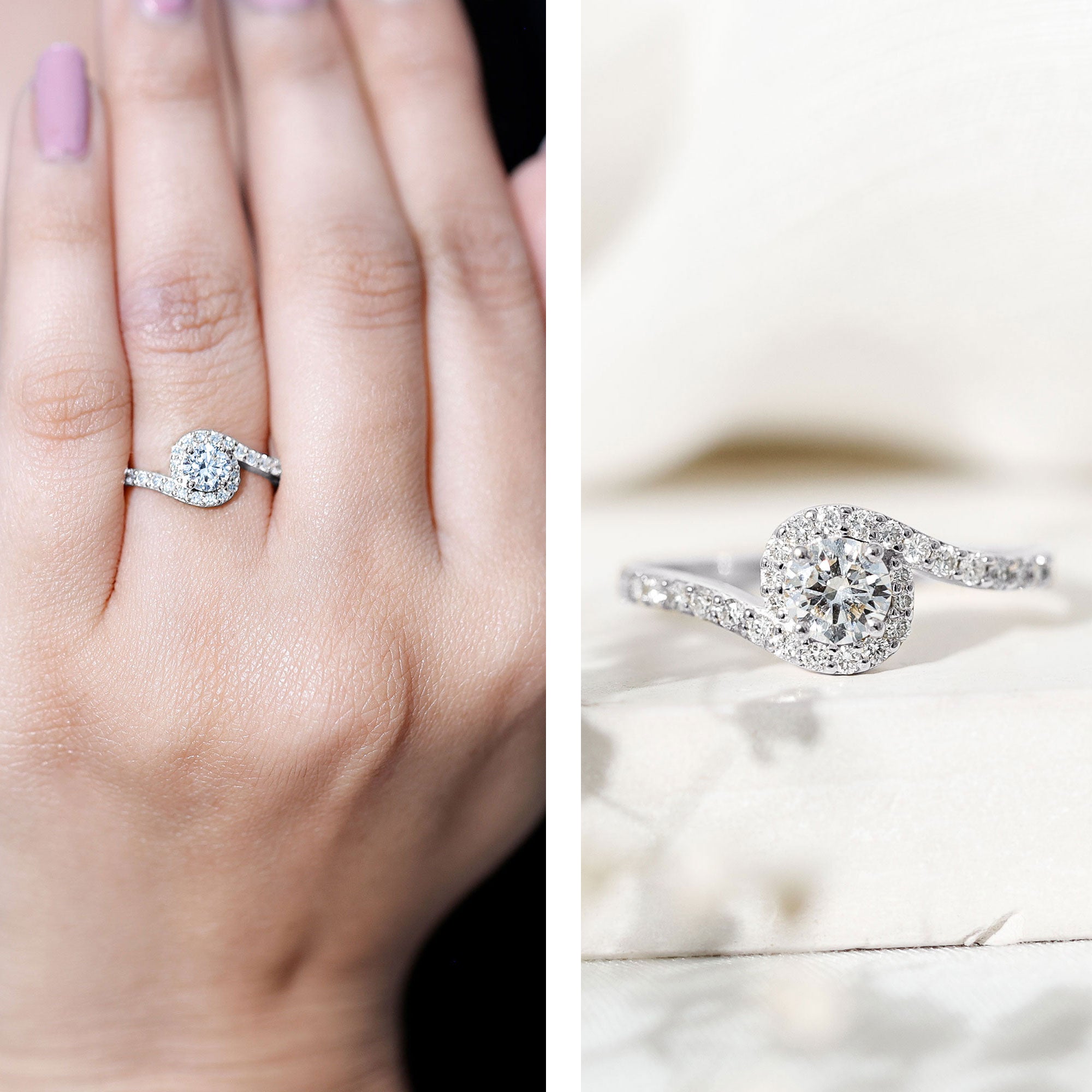 Halo Rings: Lab created diamond promise rings in halo style feature a central lab-grown diamond gemstone encircled by smaller similar or different gems, offering a perfect blend of simplicity and elegance.