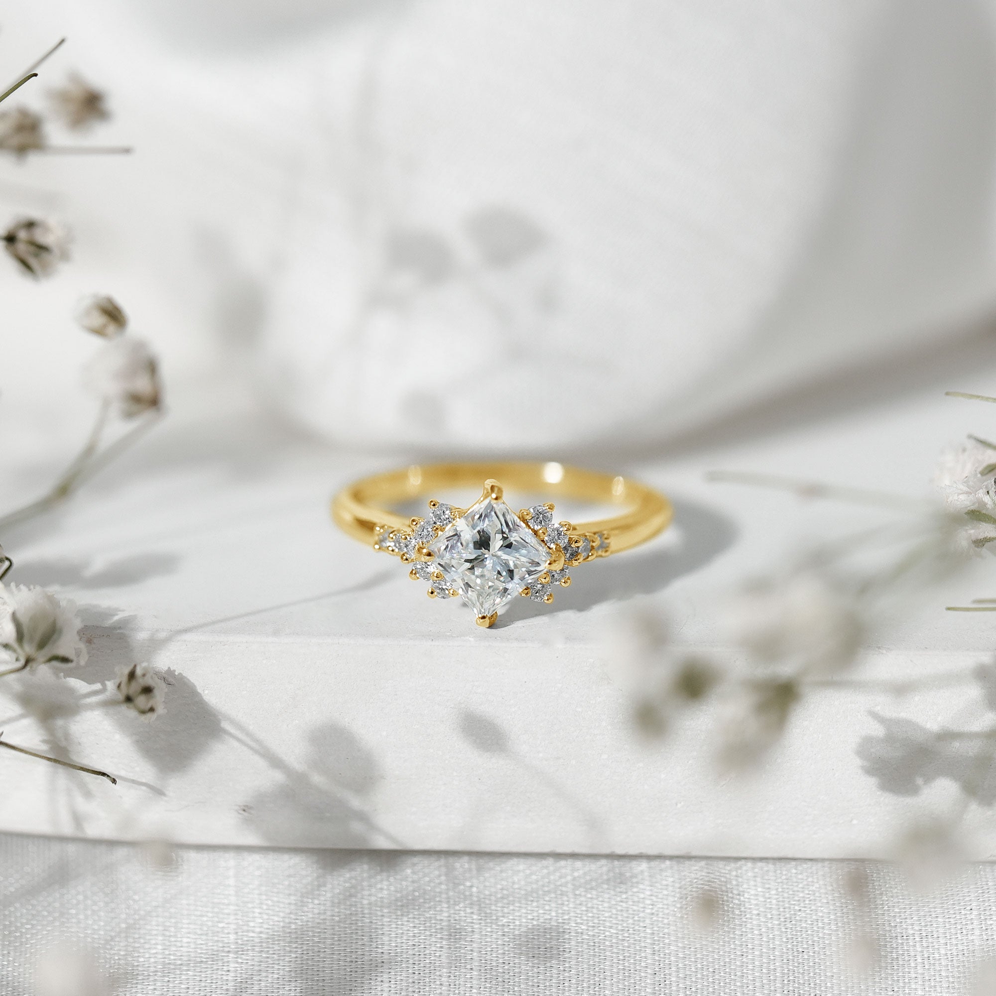 Emerald Cut Promise Rings: Lab-grown diamond gemstones in a rectangular shape with step-like facets, offering a sleek and classic look make the heart of the ring. Whether as a solitaire or surrounded by gemstones, this cut shines beautifully.
