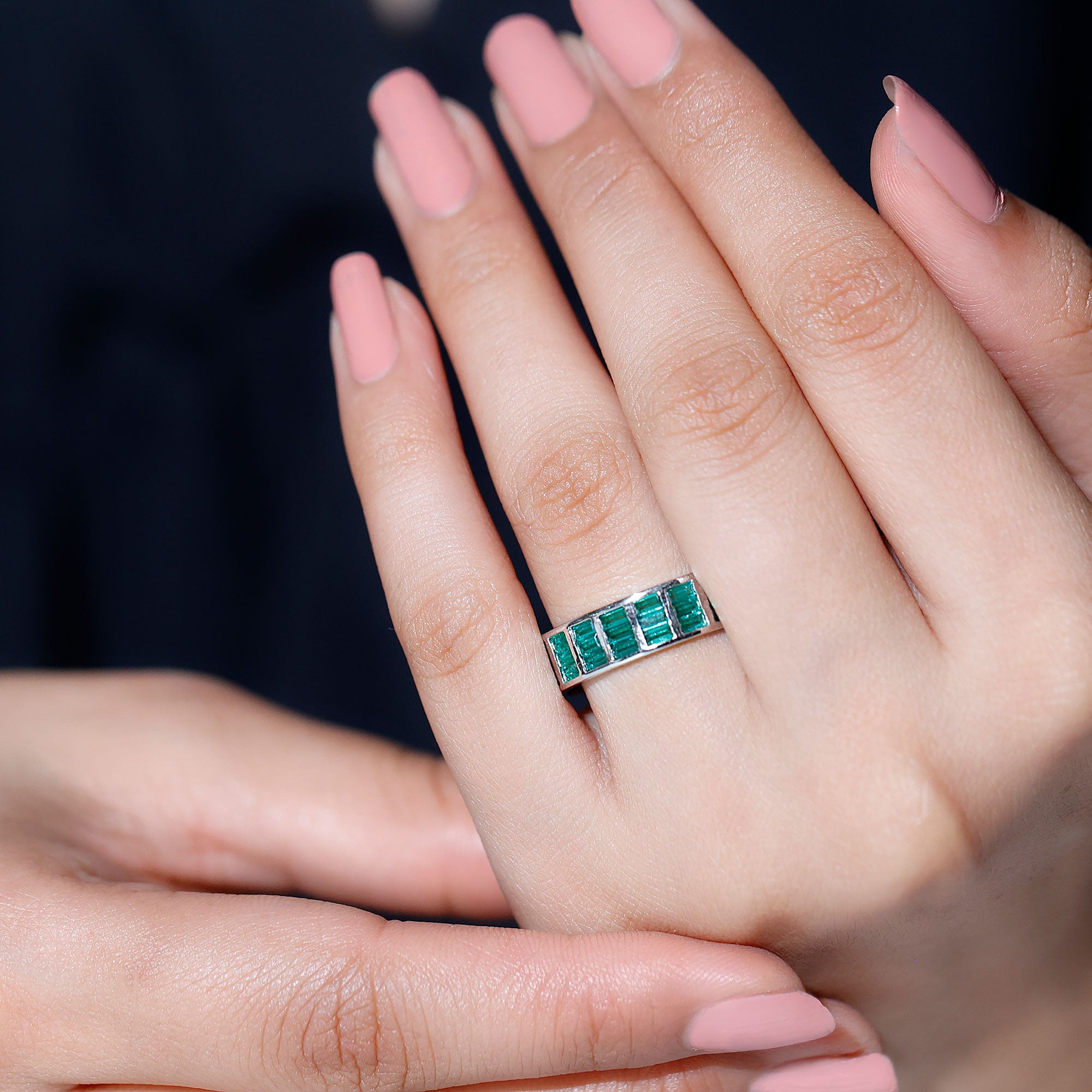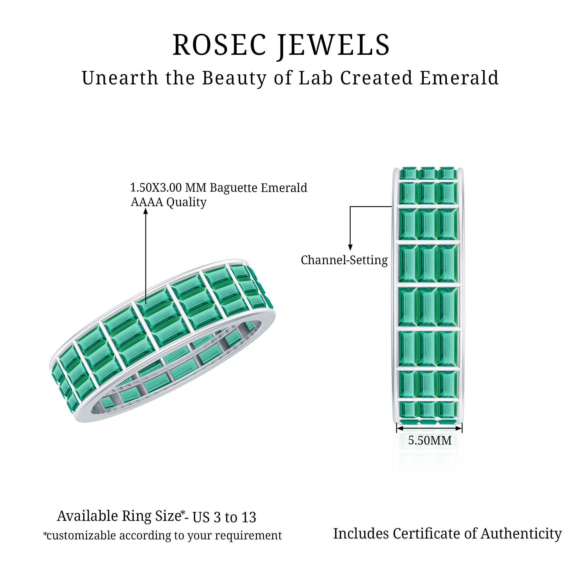 Half Eternity Rings: Entire top of the band adorned with laboratory created gemstones for a graceful sparkle.