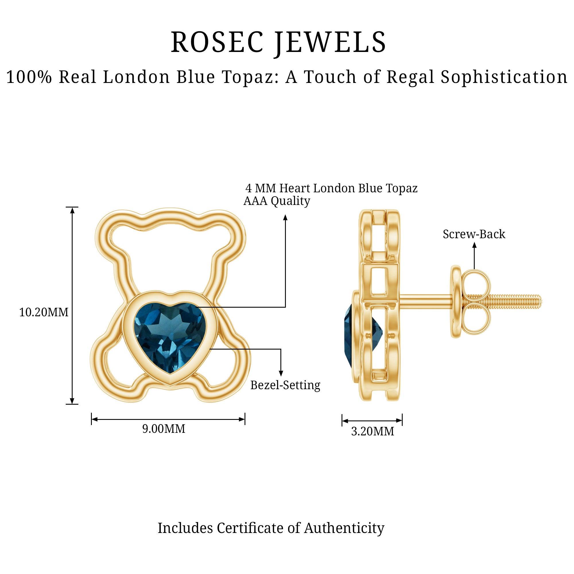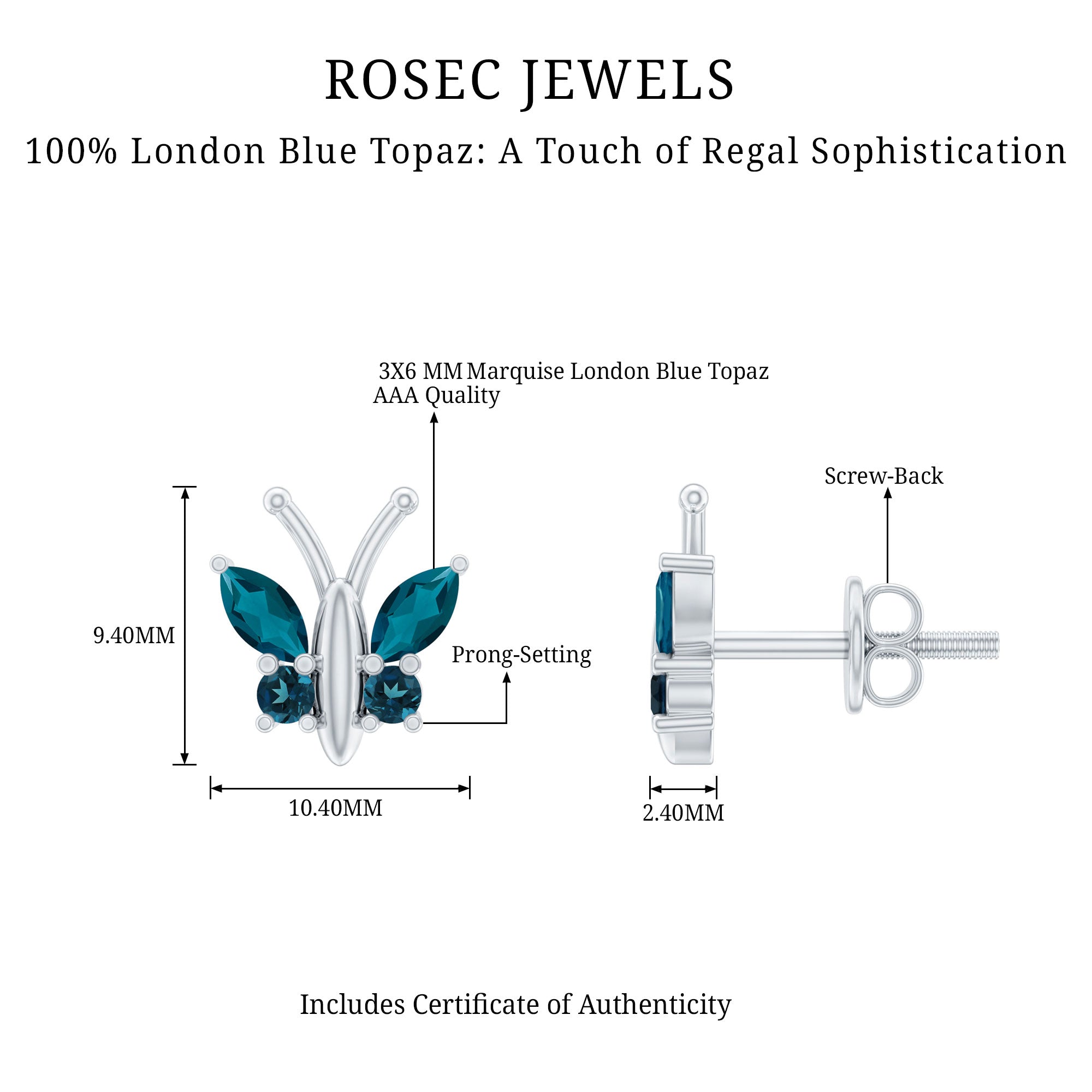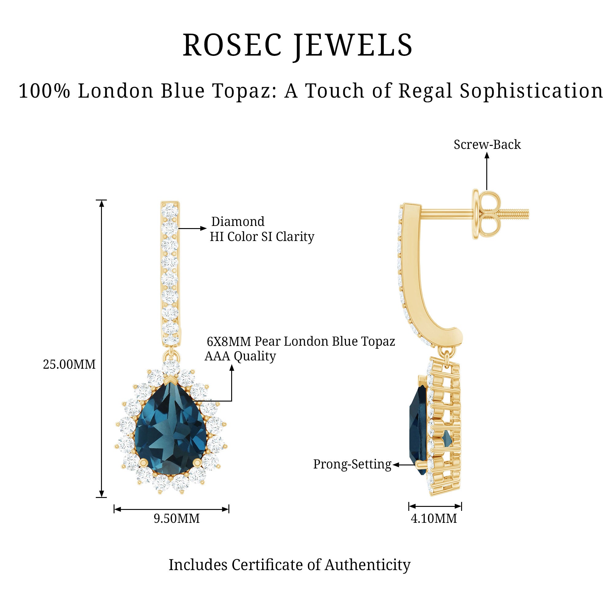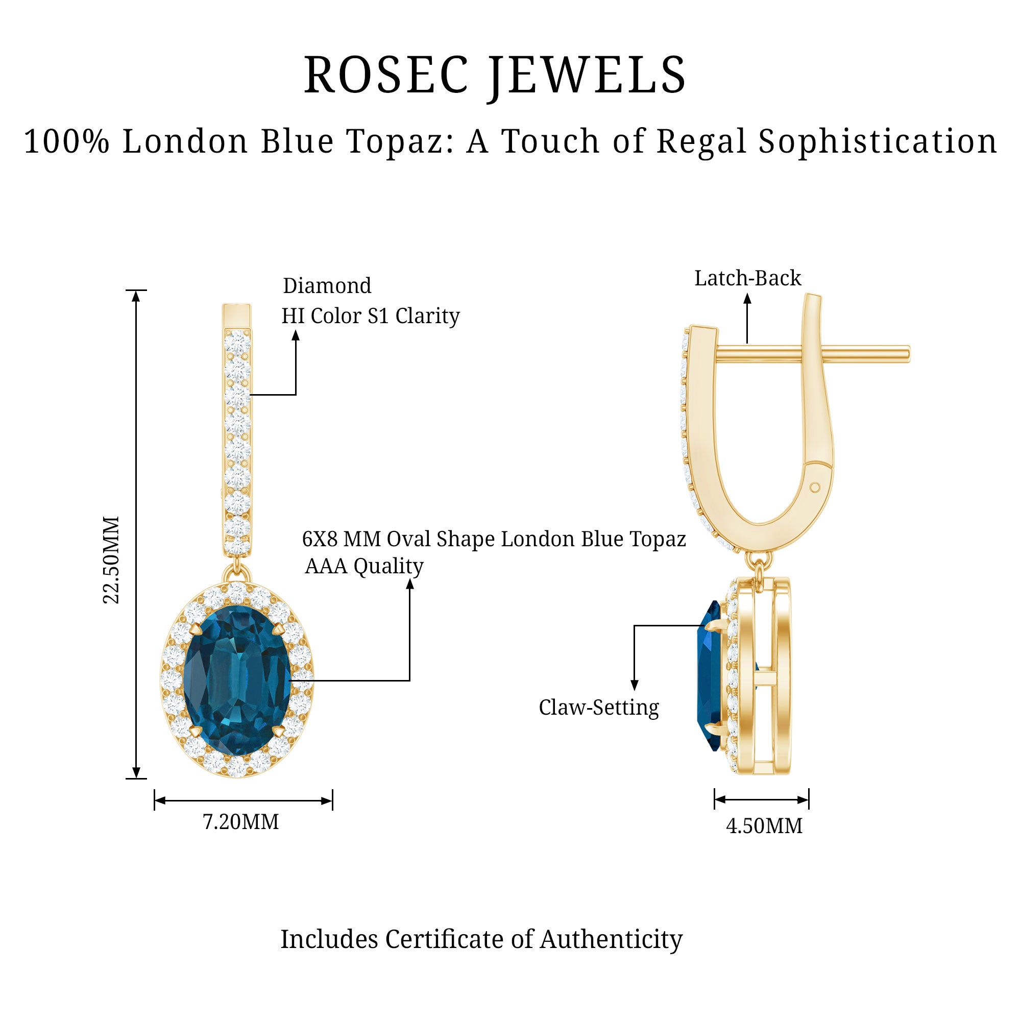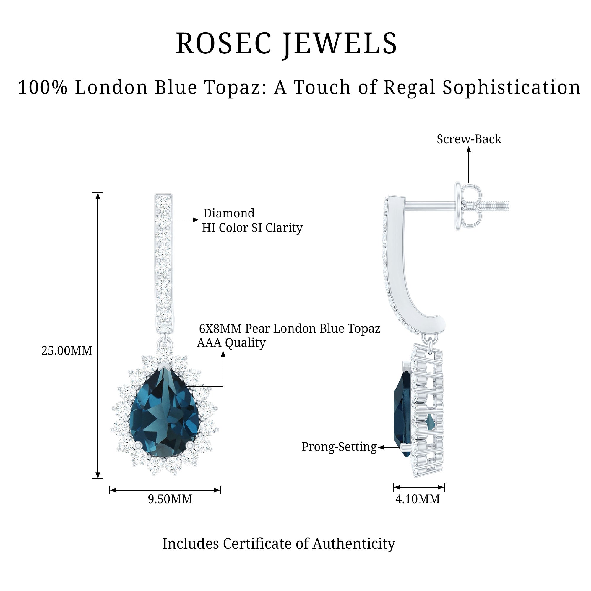 White Gold:- A popular pick for gemstone jewelry. White Gold metal complement any design and cool color tones of London blue topaz earrings, creating a mesmerizing charm to your personality.