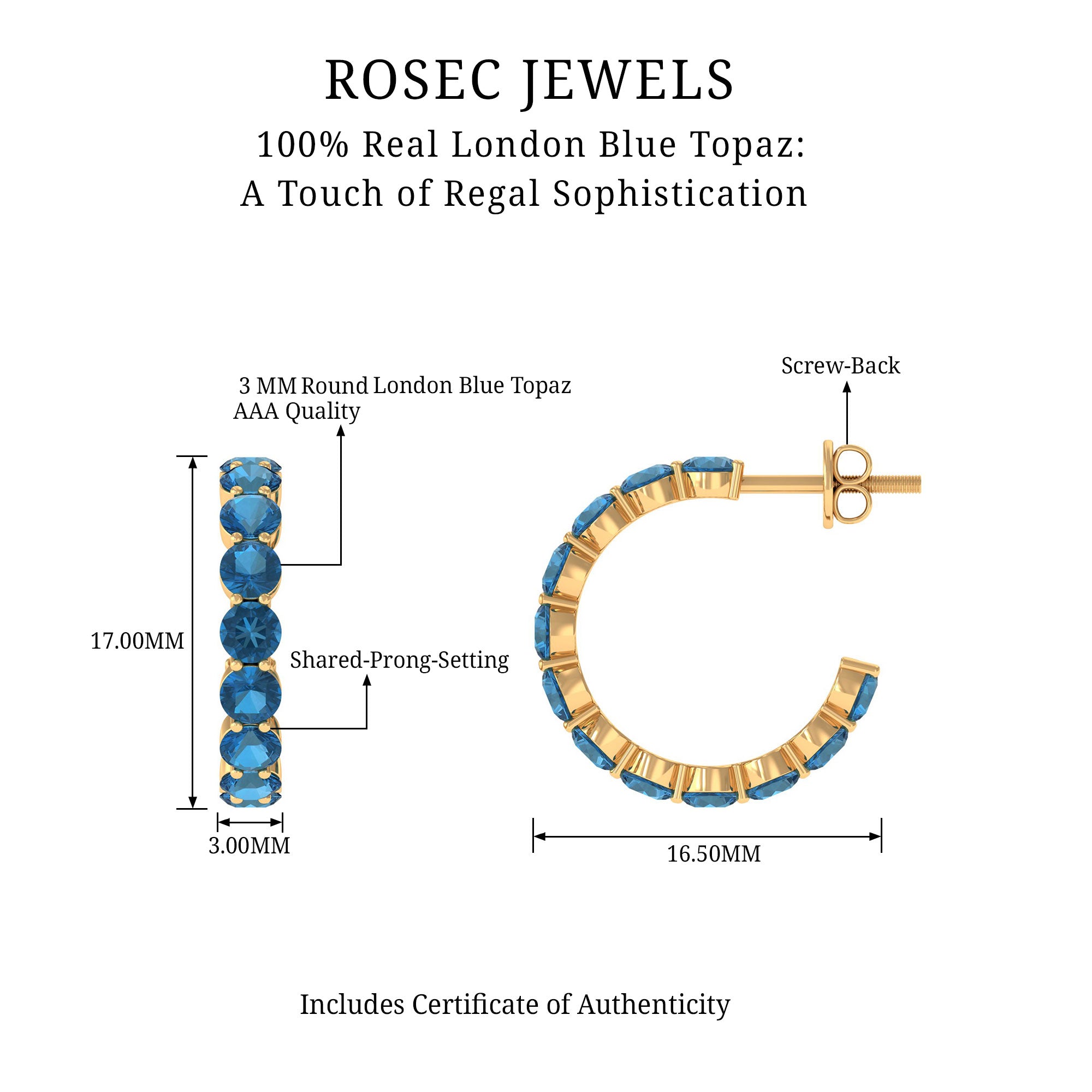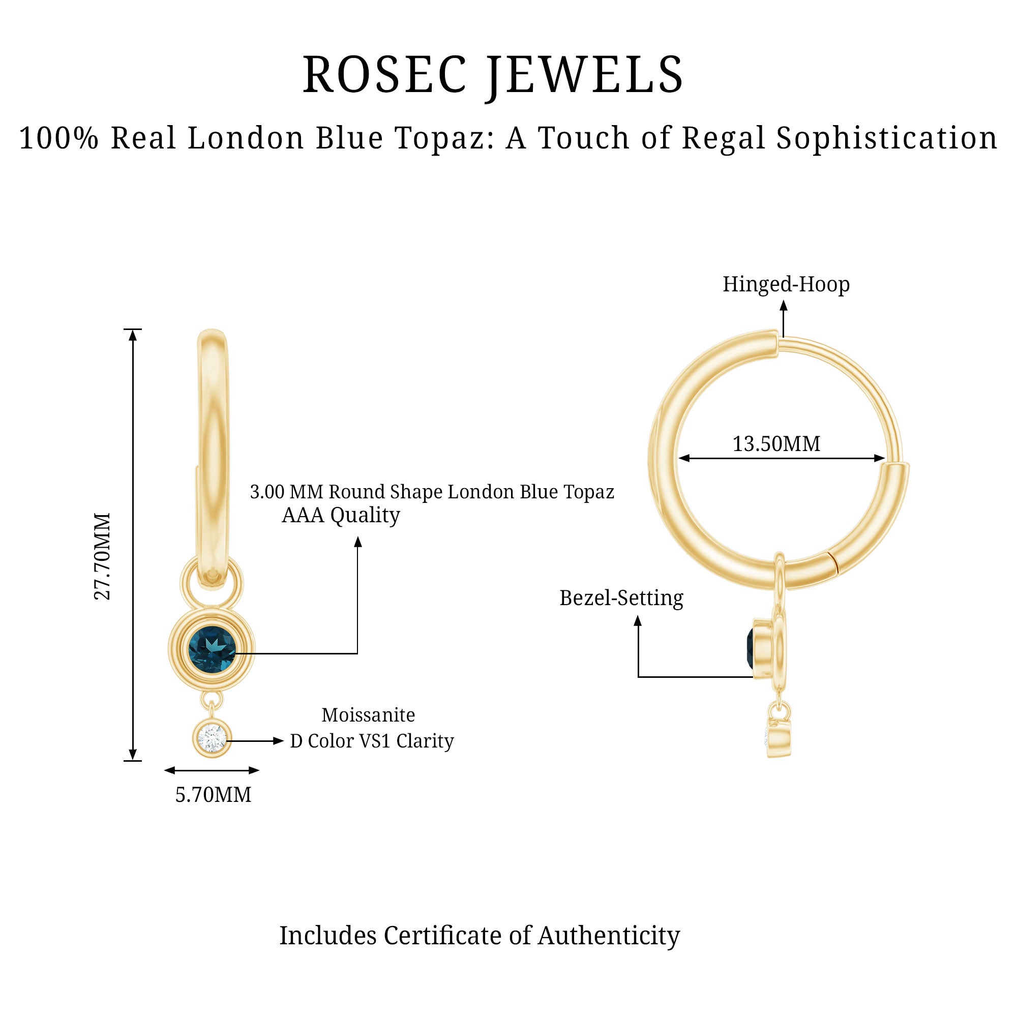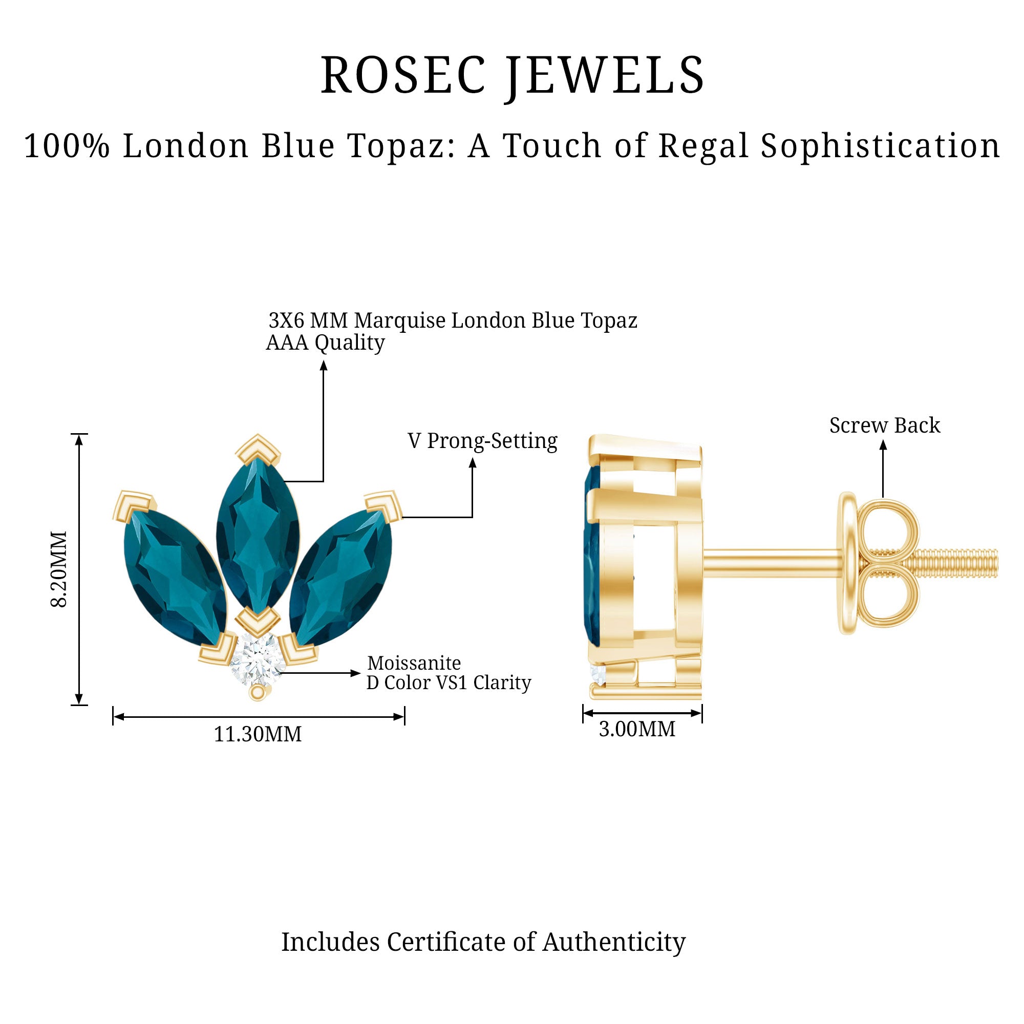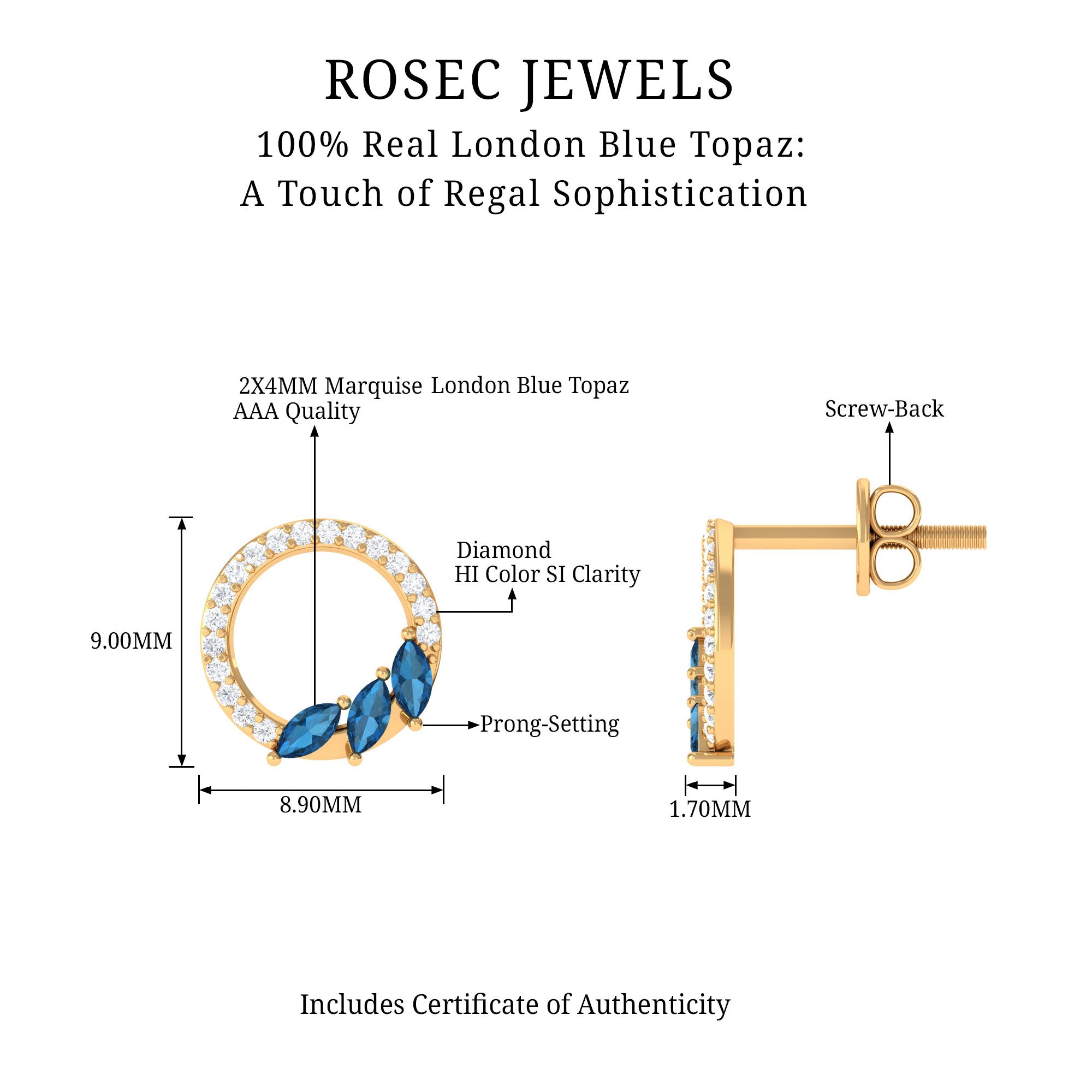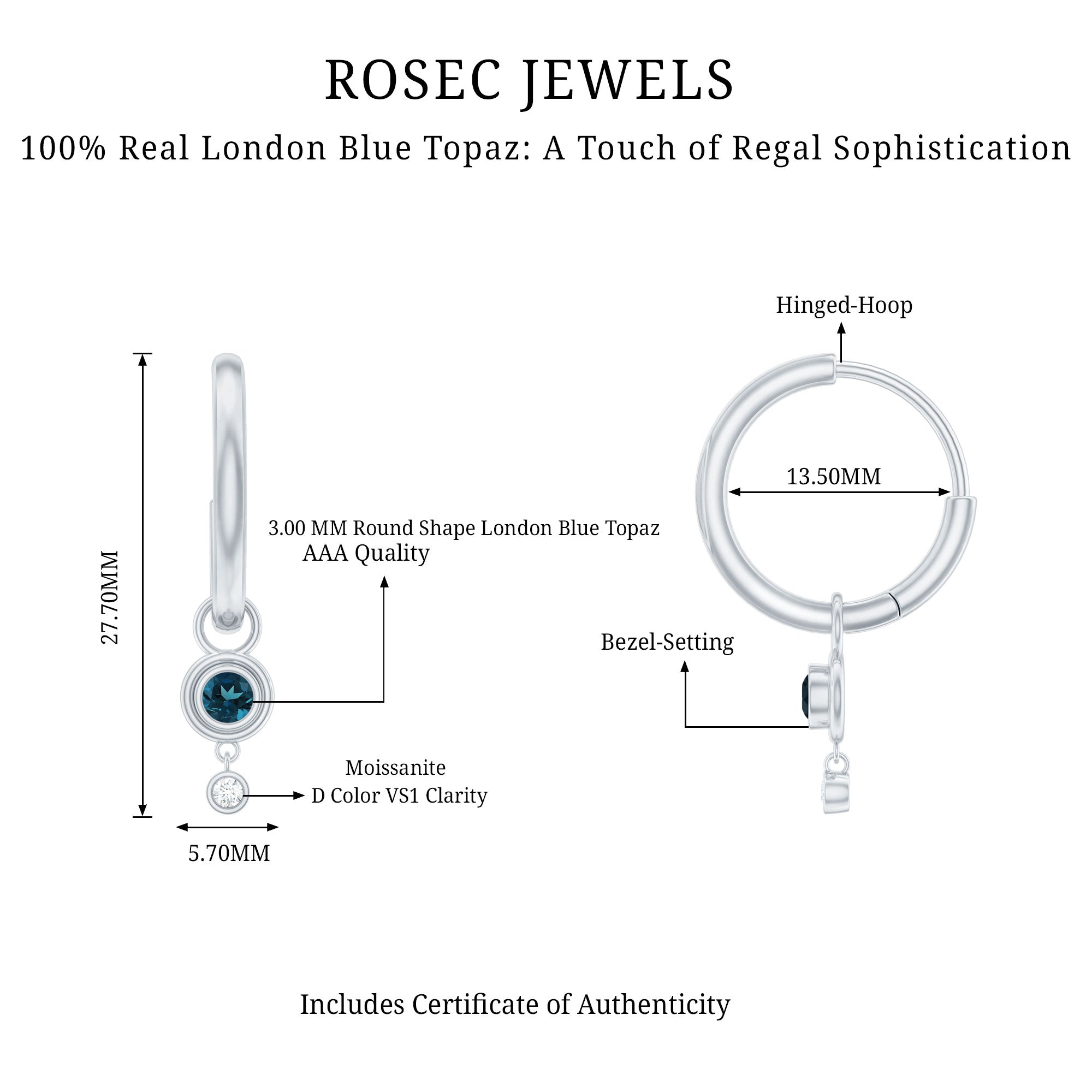White Gold:- A popular pick for gemstone jewelry. White Gold metal complement any design and cool color tones of London blue topaz earrings, creating a mesmerizing charm to your personality.