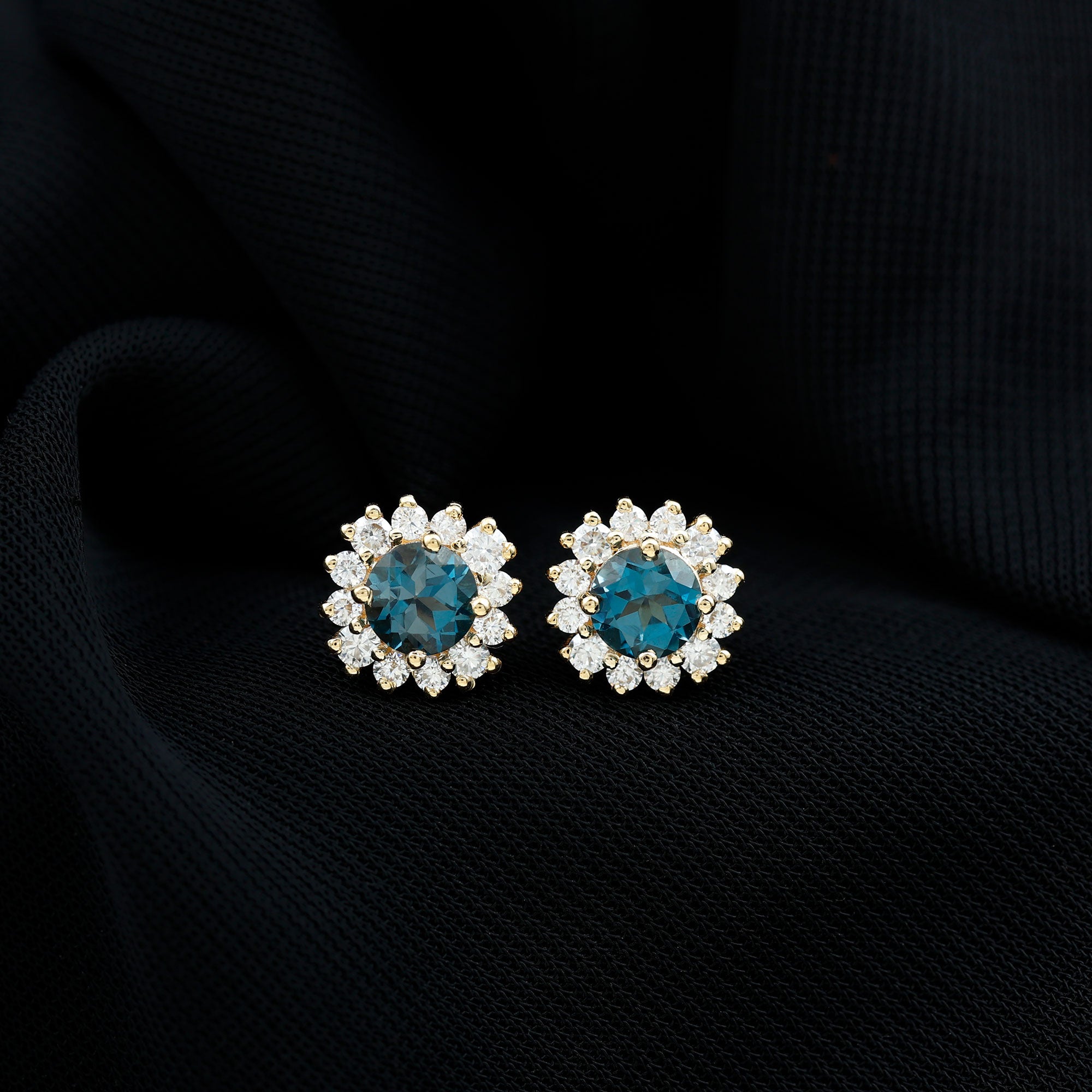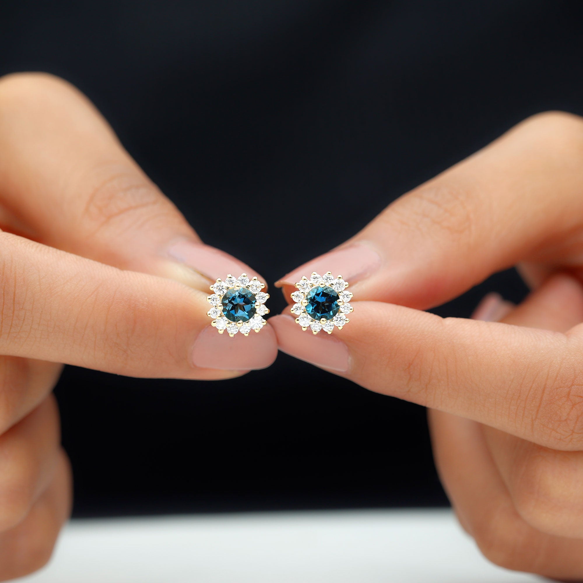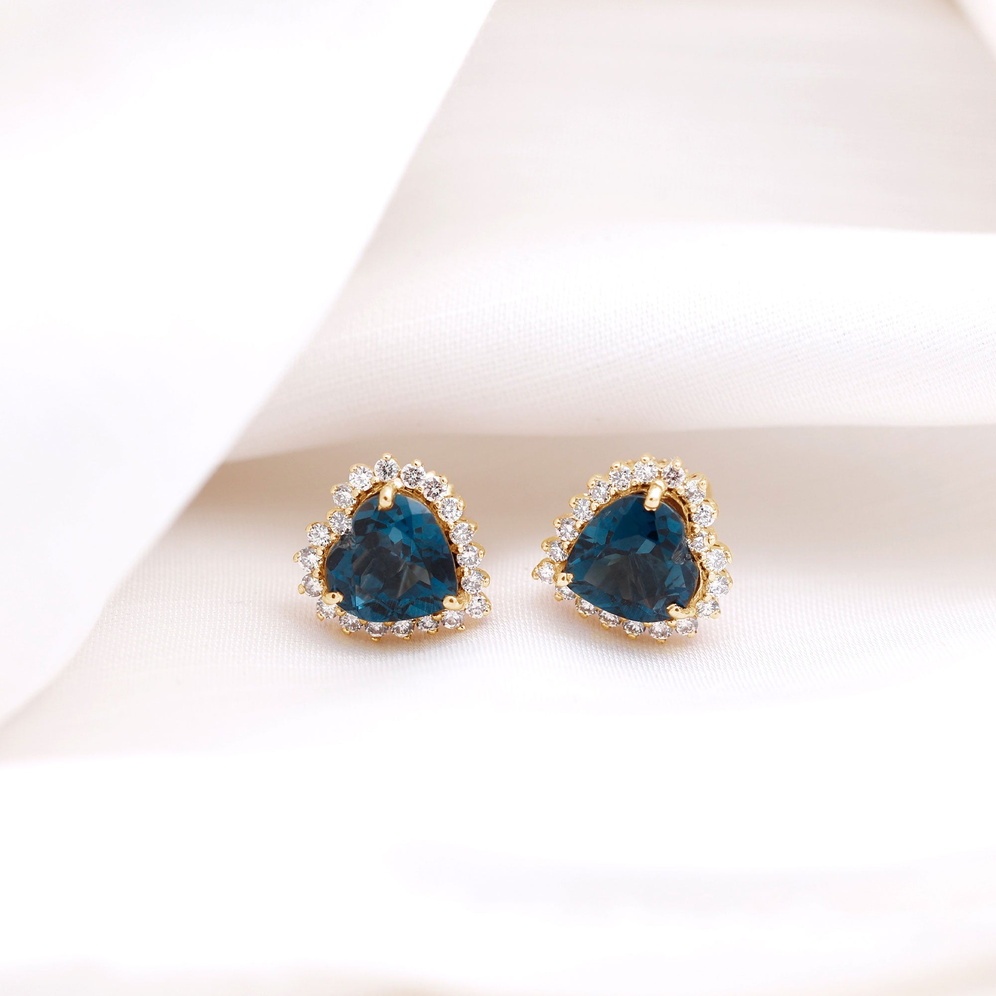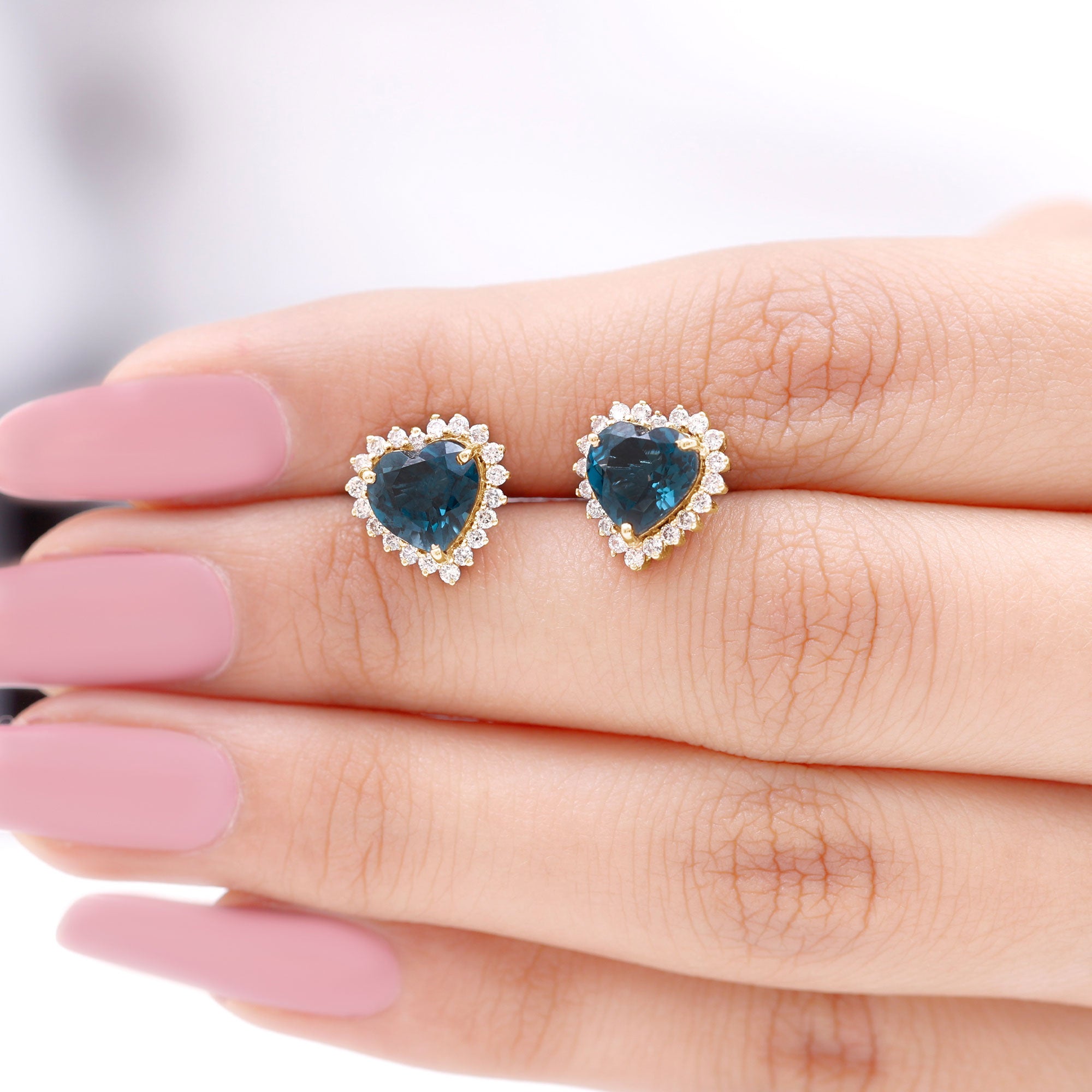 London Blue Topaz Halo Earrings: - The center gems of the blue Topaz halo earrings are embellished with distinct cuts like oval cut, heart cut, pear cut, and brilliant cut that is crafted in solid gold. The brilliant cuts of London blue topaz create a centerpiece attraction that stole everyone's attention.