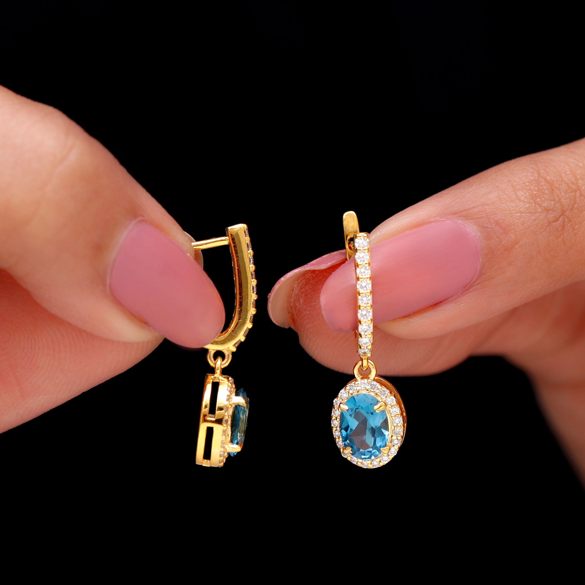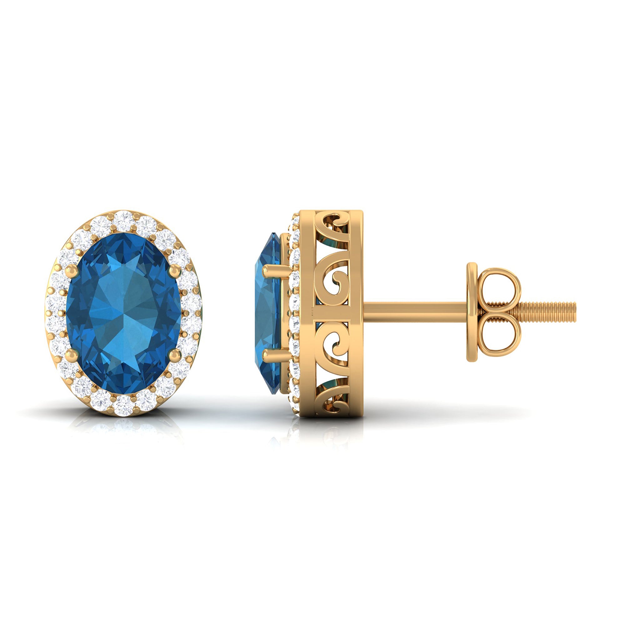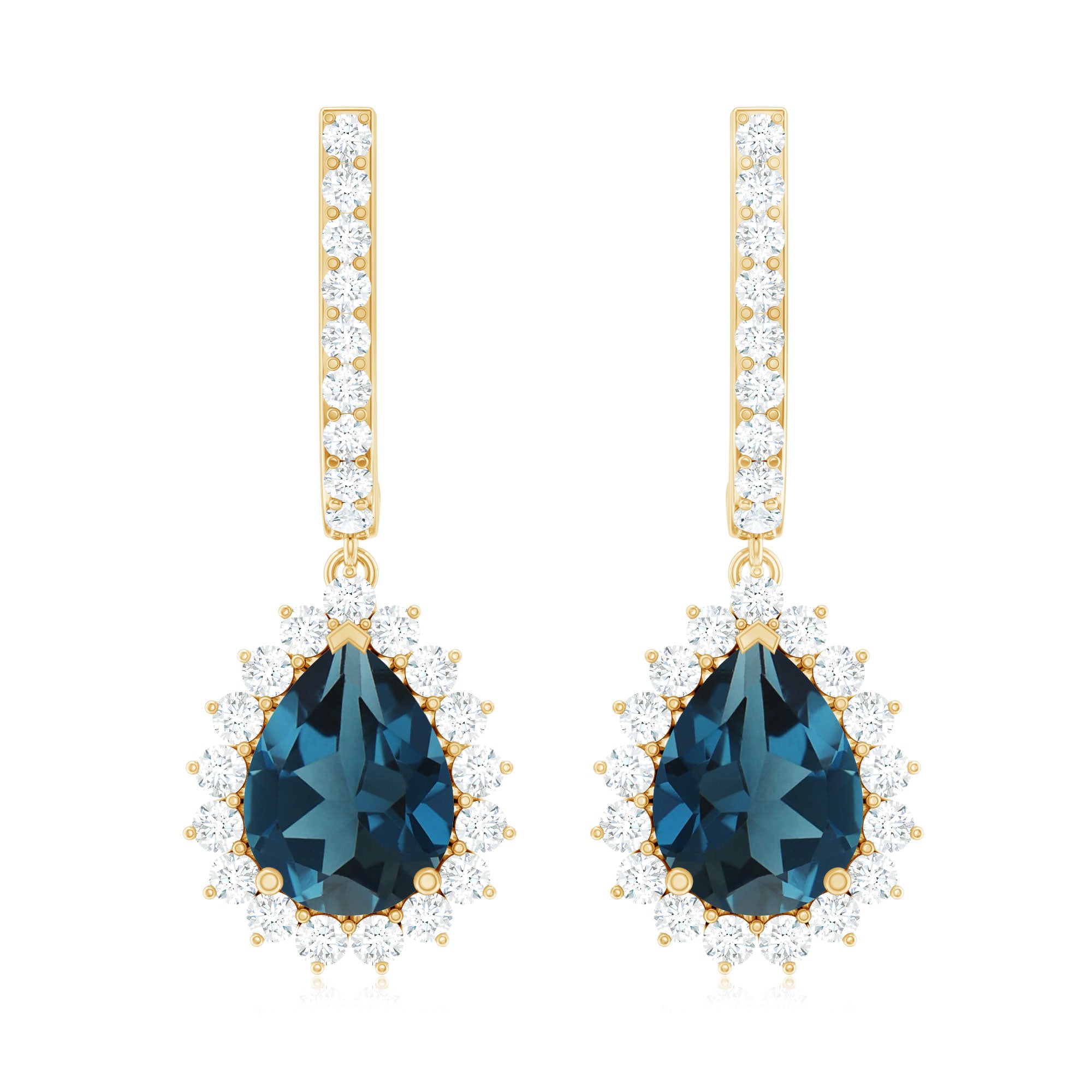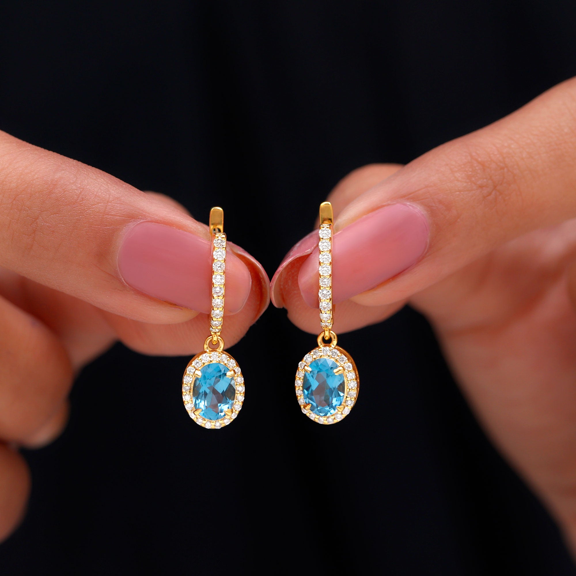 London Blue Topaz Halo Earrings: - The center gems of the blue Topaz halo earrings are embellished with distinct cuts like oval cut, heart cut, pear cut, and brilliant cut that is crafted in solid gold. The brilliant cuts of London blue topaz create a centerpiece attraction that stole everyone's attention.