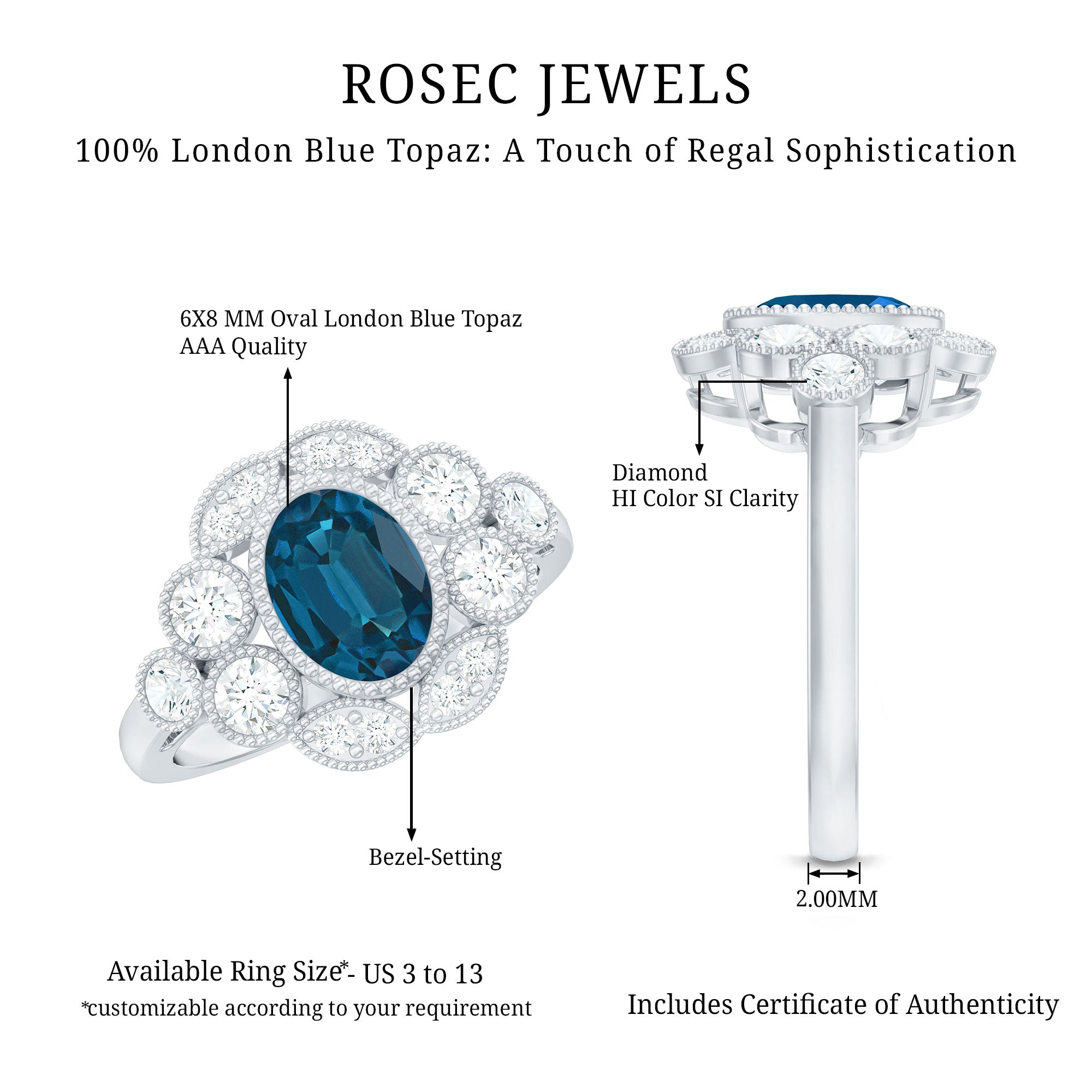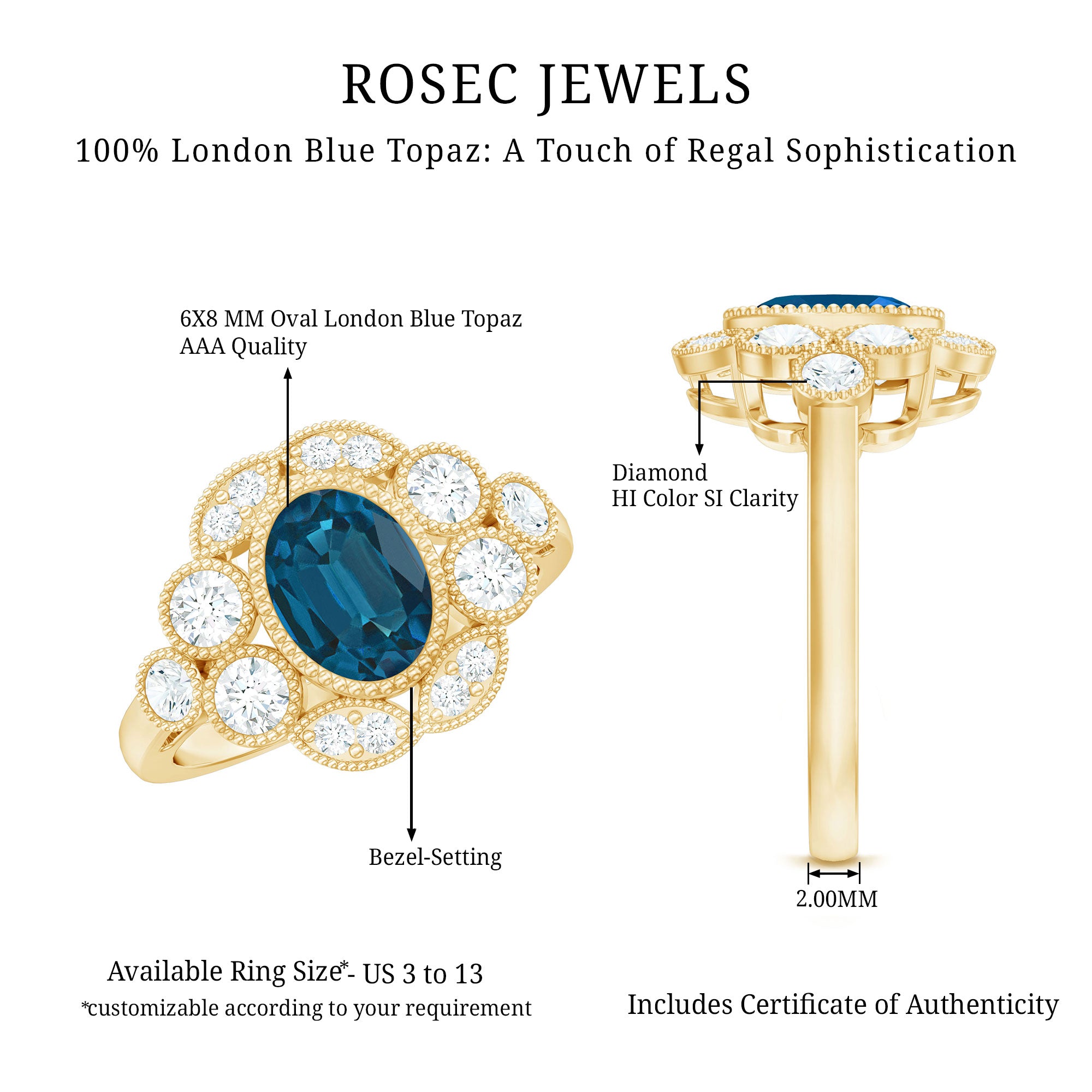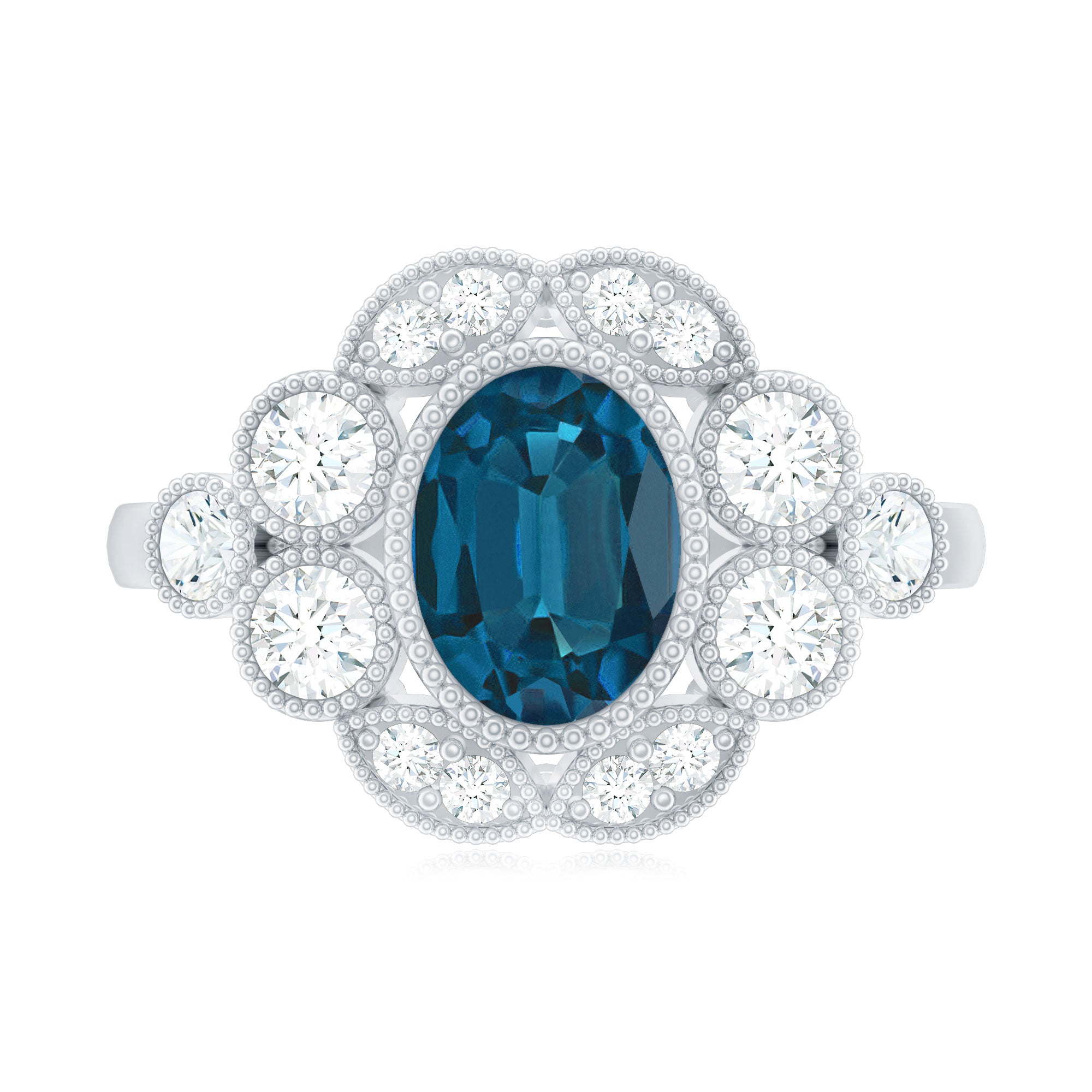 This style of engagement ring stands out unique due to its artistic elegance and nostalgic vibe, drawing inspiration from the classic Art Deco Victorian Eras and Edwardian eras. Our London blue topaz vintage-inspired rings highlight intricate details such as milgran and filigree along with abstract geometric patterns and historic engravings, making the best timeless charming accessory that offers an antique feel. The London Blue Topaz is graced by vintage design, making it a perfect ring for those couples who are inspired by old-school romance.