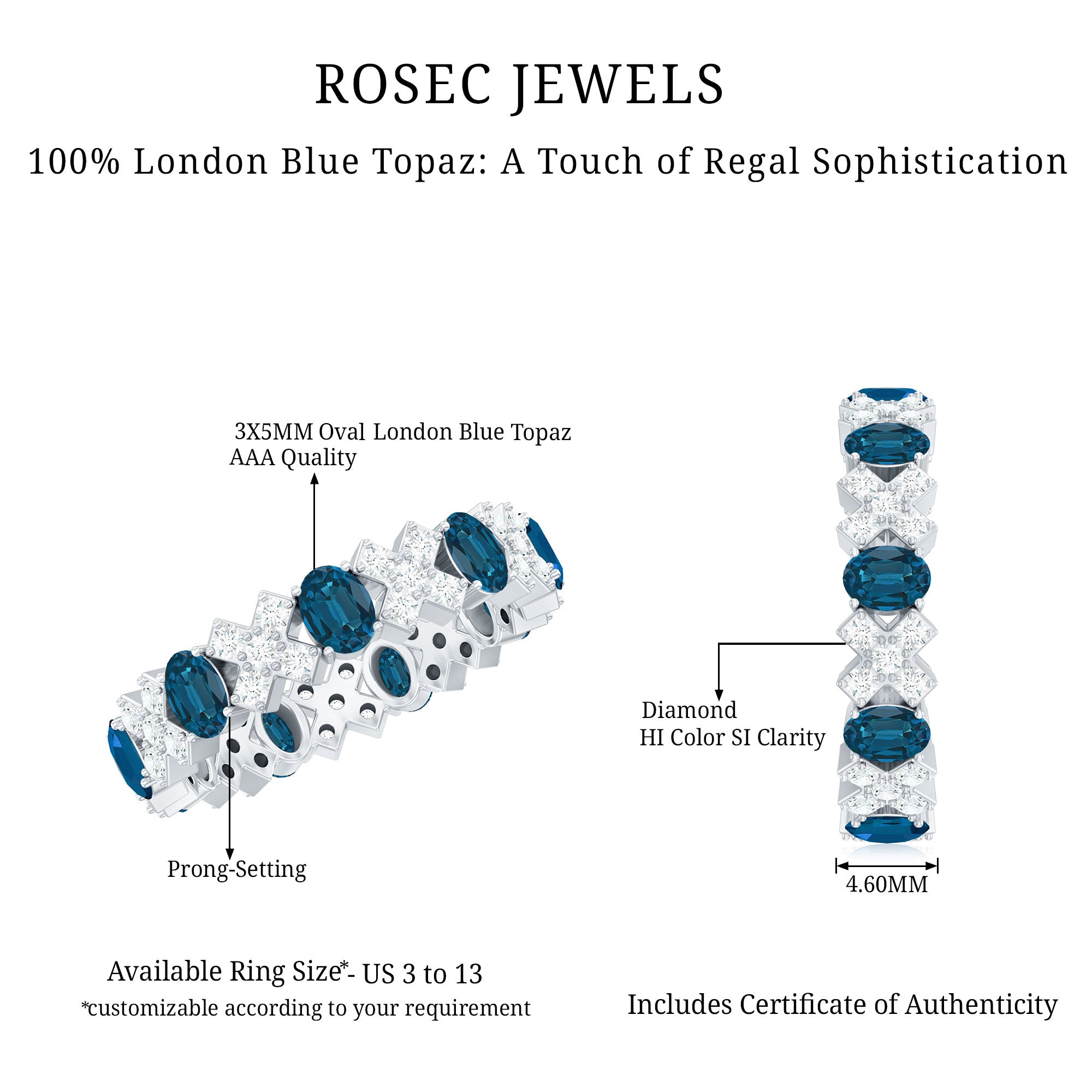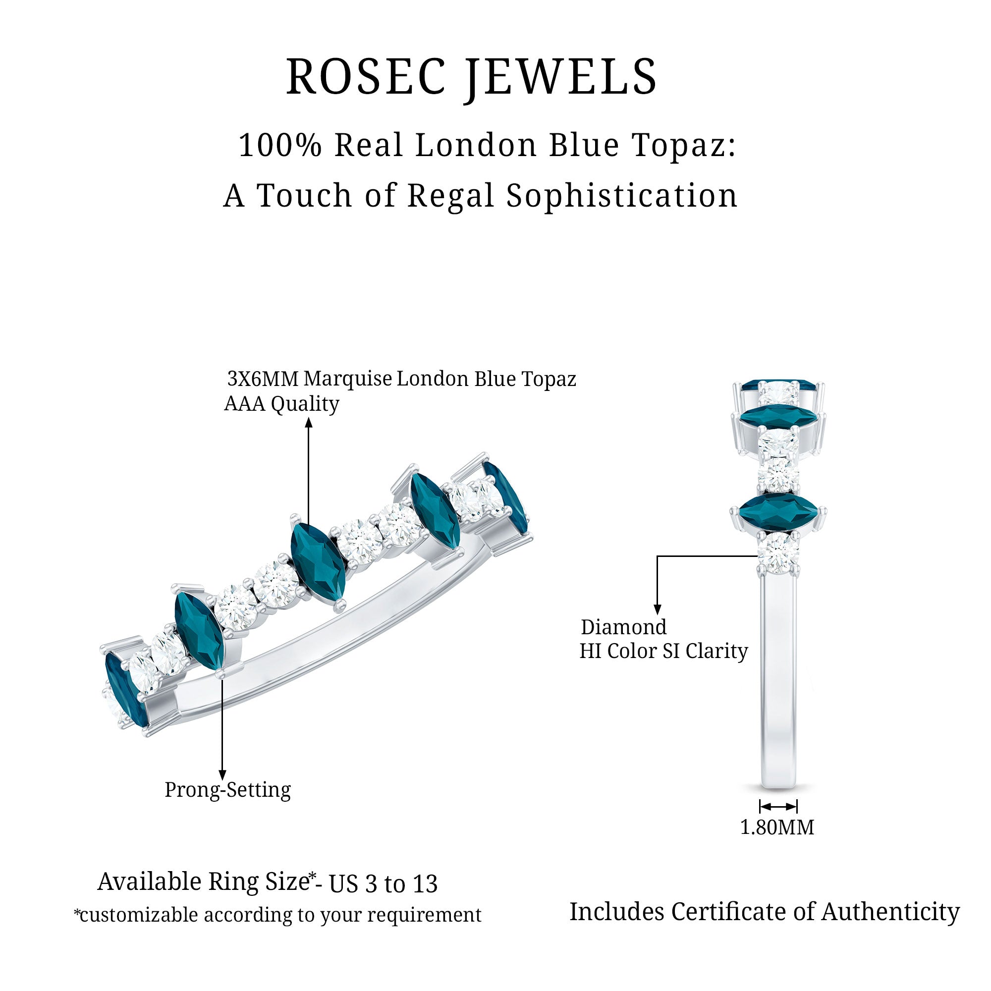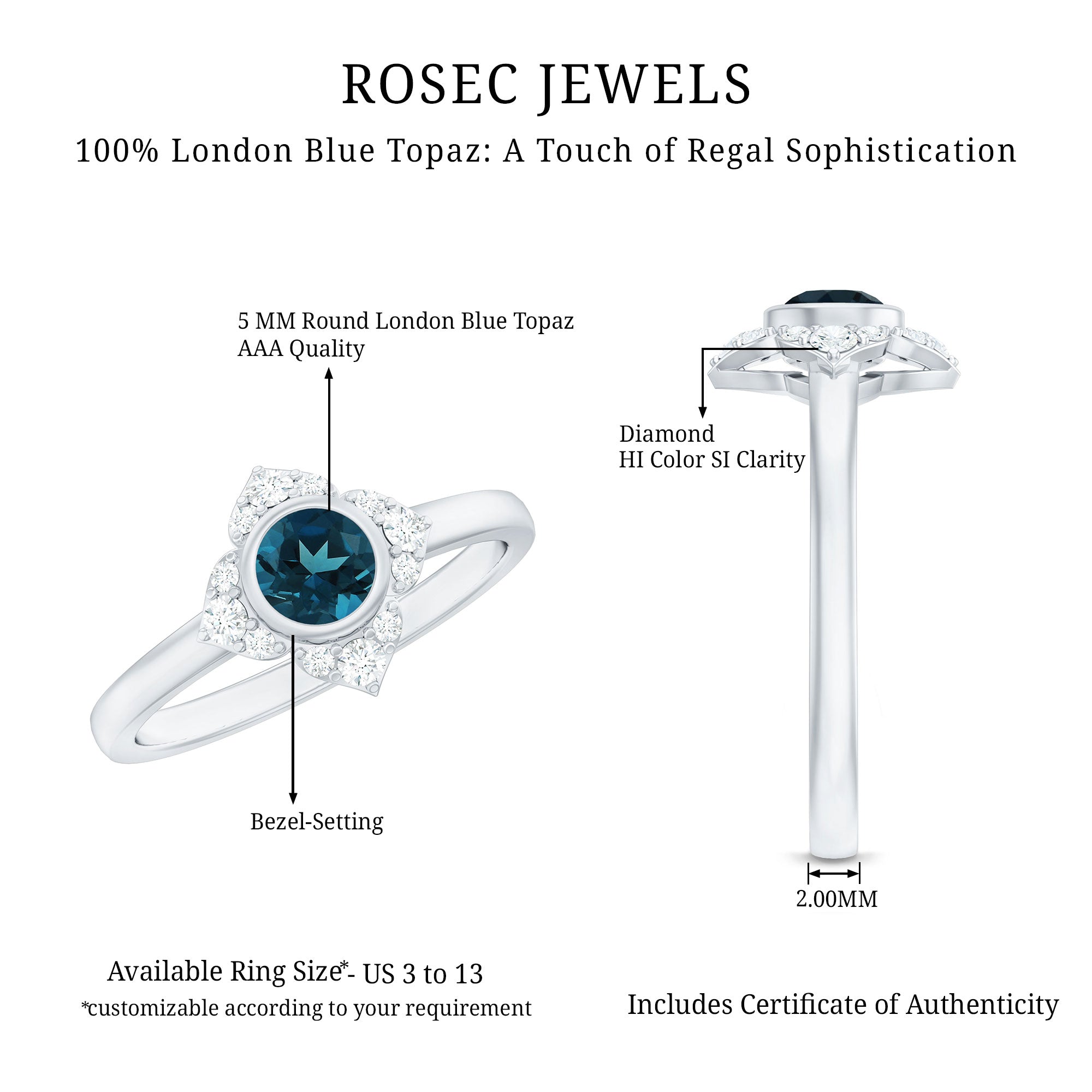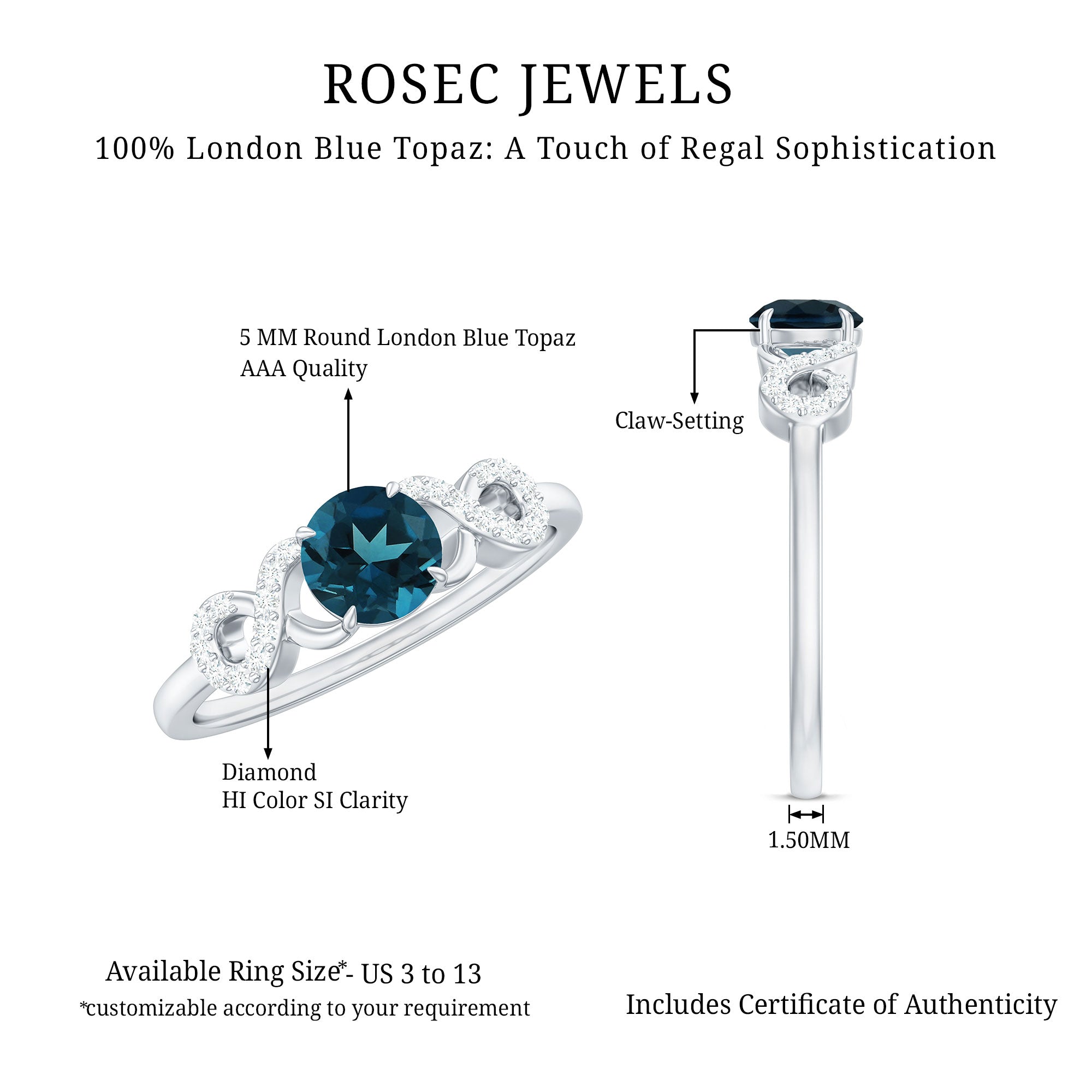 Color: The most desirable London Blue Topaz is hued in a dark, inky blue color with medium to deep color saturation. So, that works as the bar to judge the color quality of your ring.