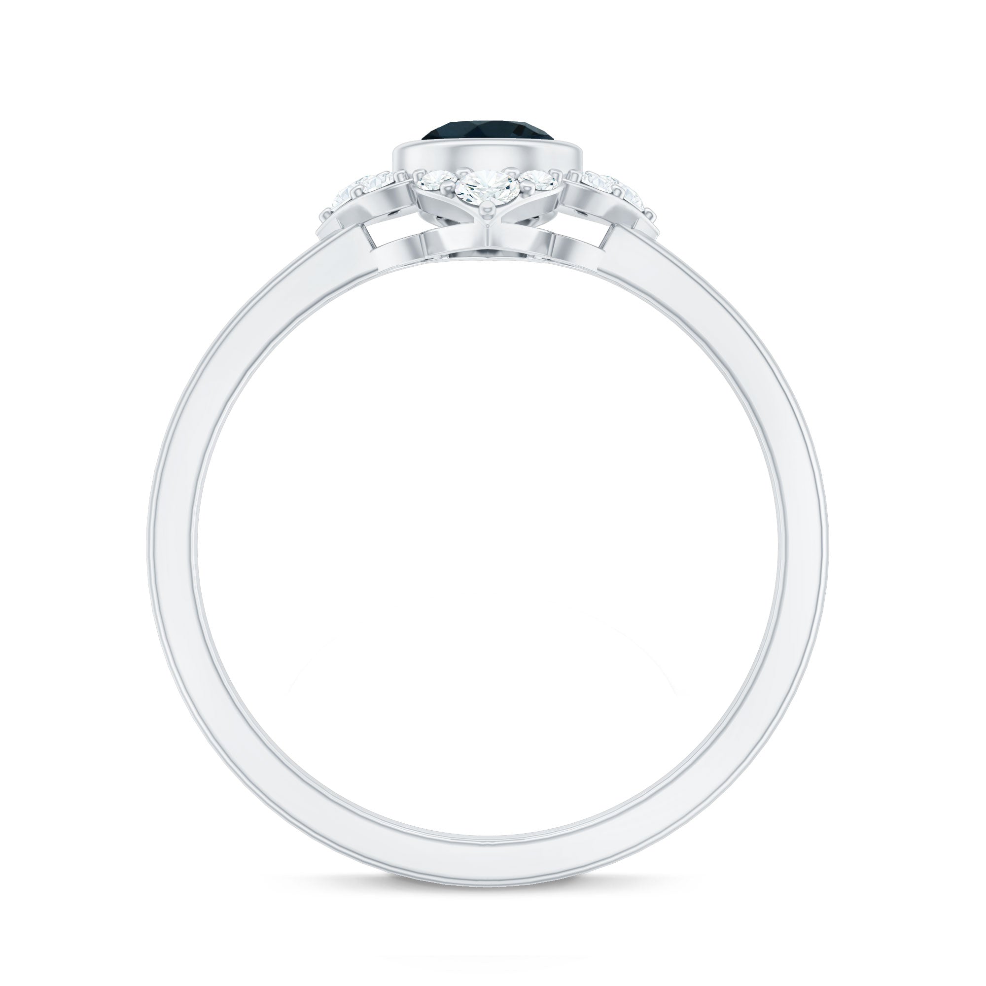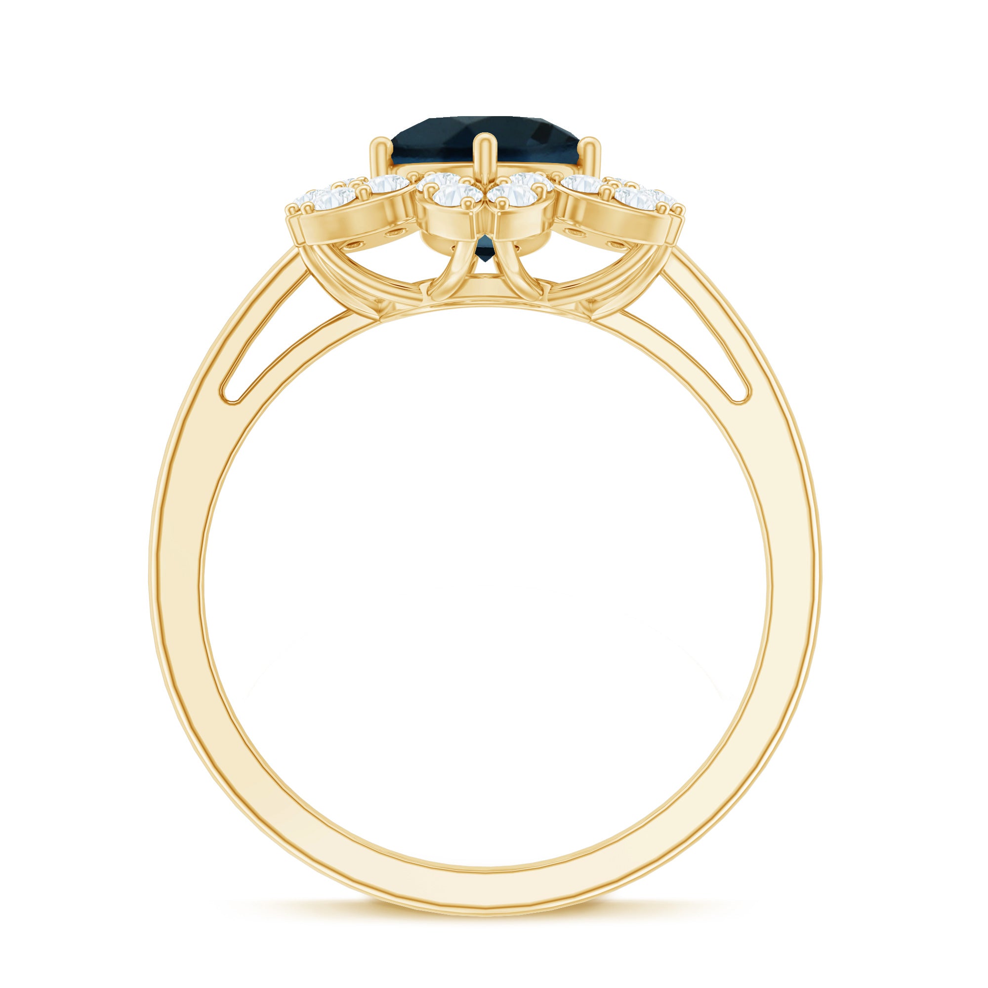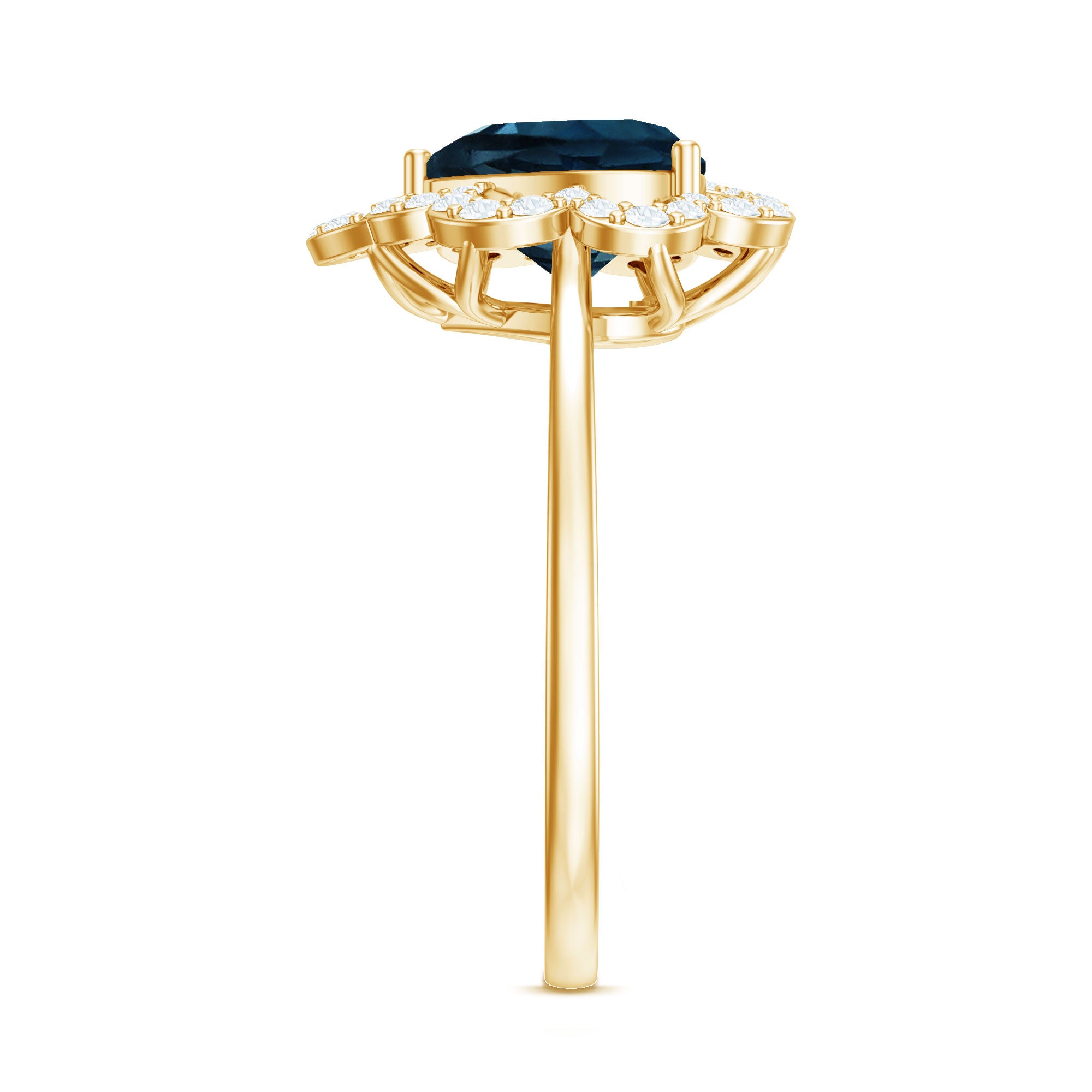 A unique and edgy take to the classic Solitaire style, the Center Stone of London Blue Topaz here is adorned by a shimmering row of Diamond/Moissanite all around. The Halo doesn’t just lend more character to the Blue Topaz Ring, but also deceives your eyes by making your Topaz appear slightly bigger in size. It is the go-to style for those who fancy a London Blue Topaz and Diamond Ring.