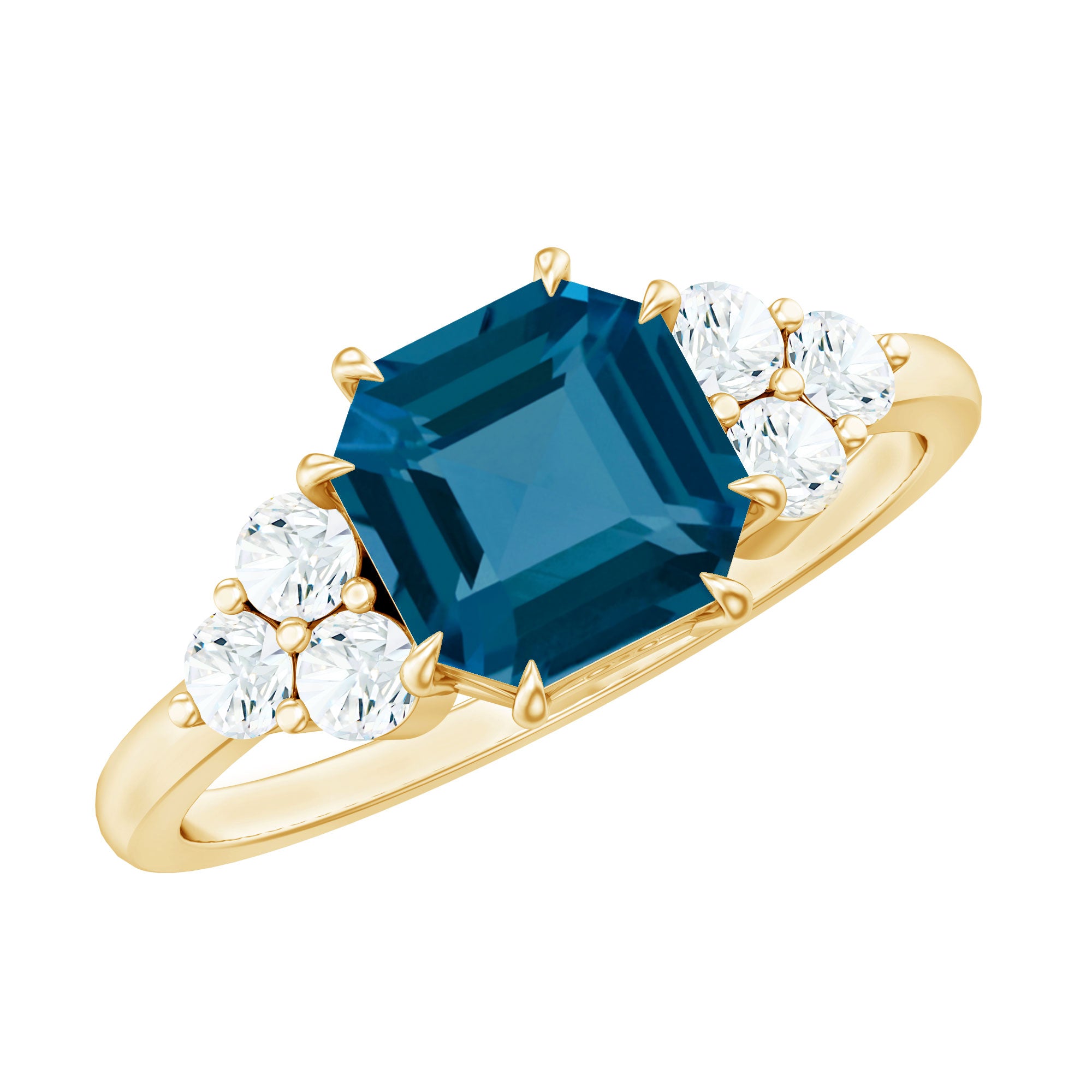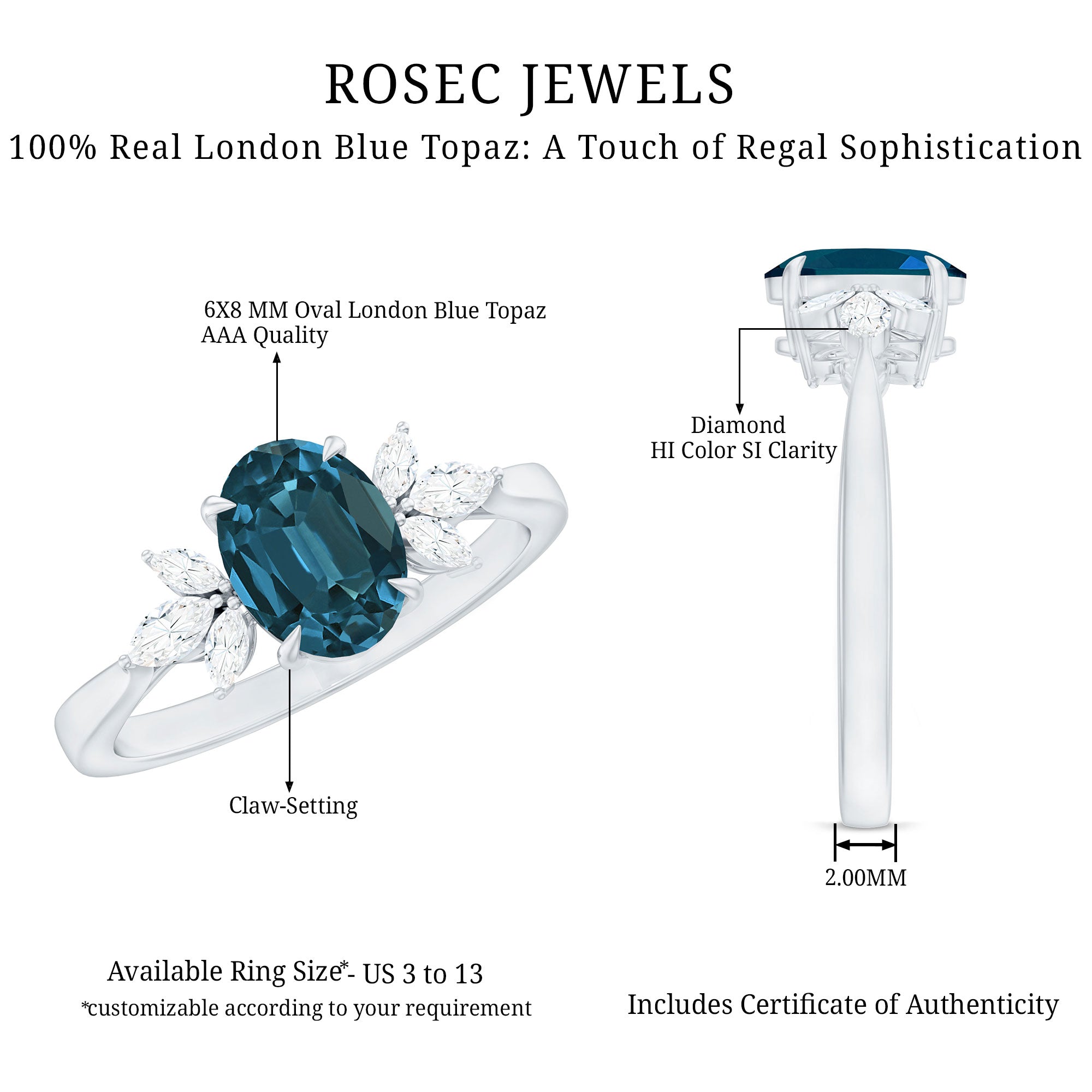 Popularized as the most flashy, flamboyant, and bold ring out there, this Cocktail Ring is adorned with an enormous Center-Stone of London Blue Topaz. It is further accentuated with eye-striking patterns of diamond/moissanite around or as side stones. A London Blue Topaz Cocktail Ring is meant to make a statement with floral and other attention-catching motifs.