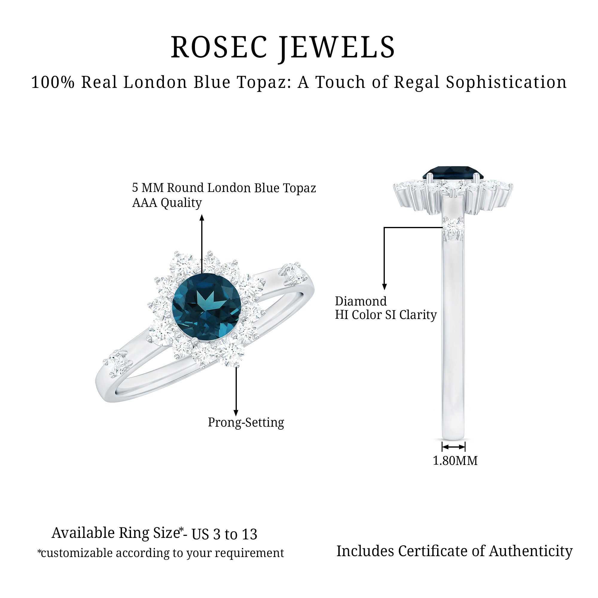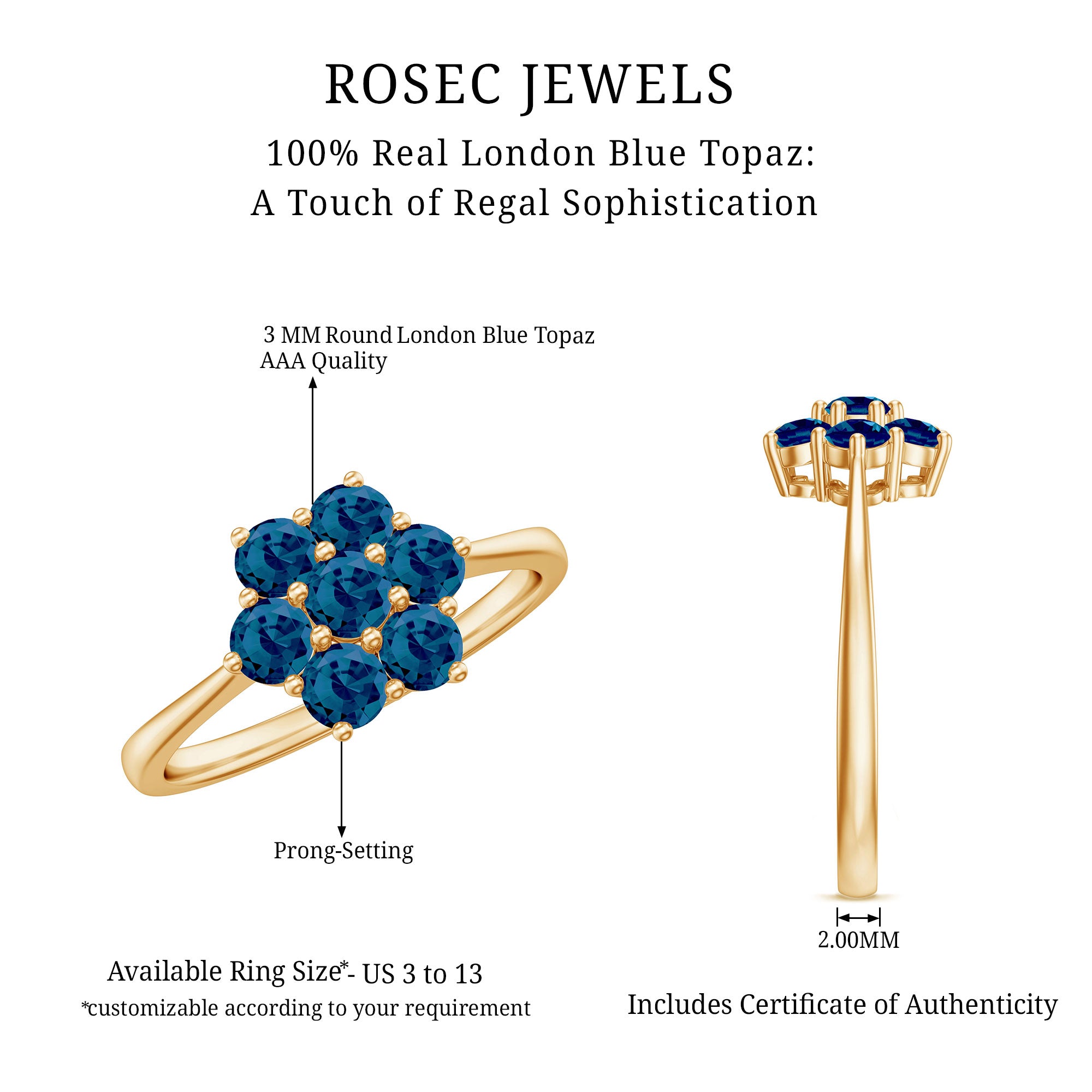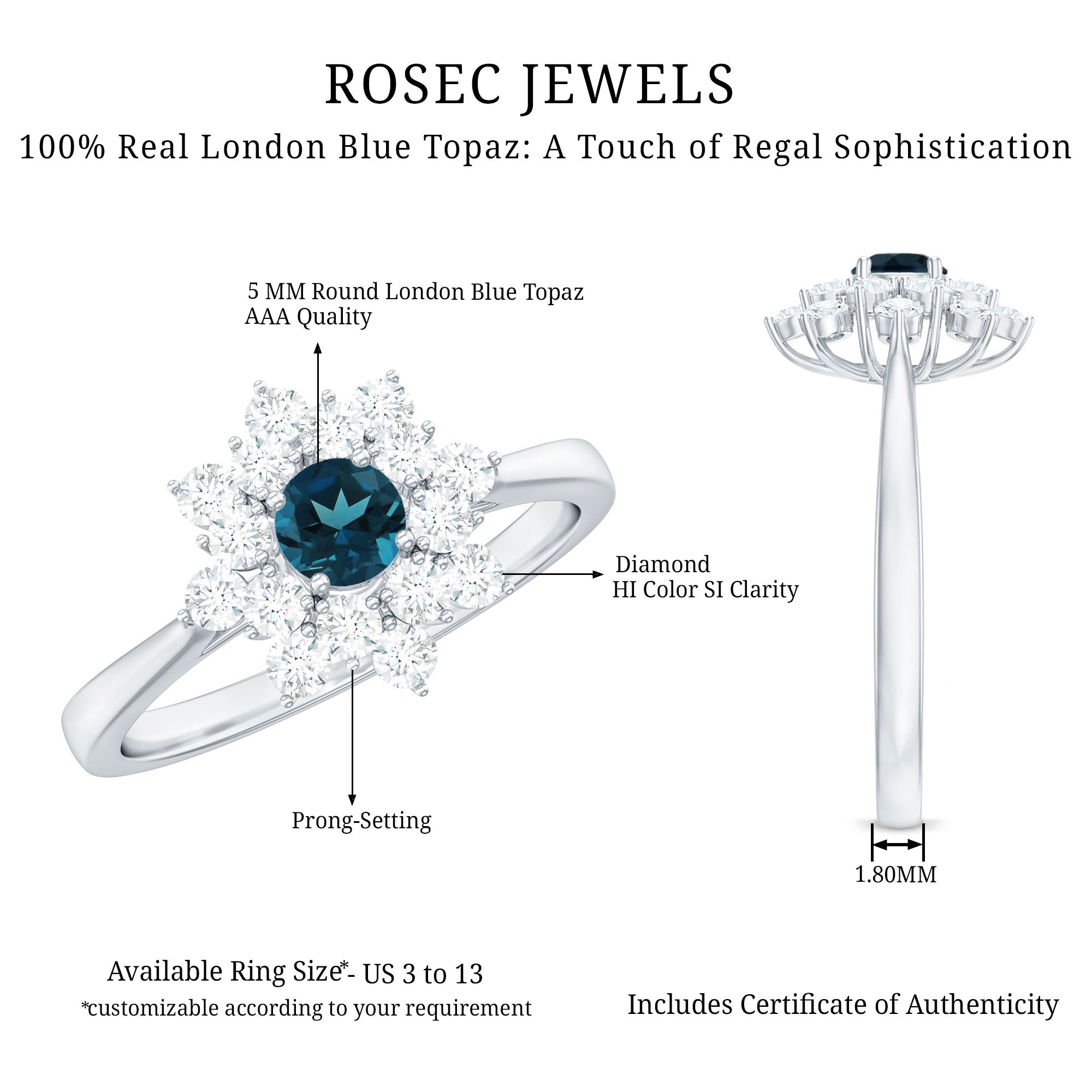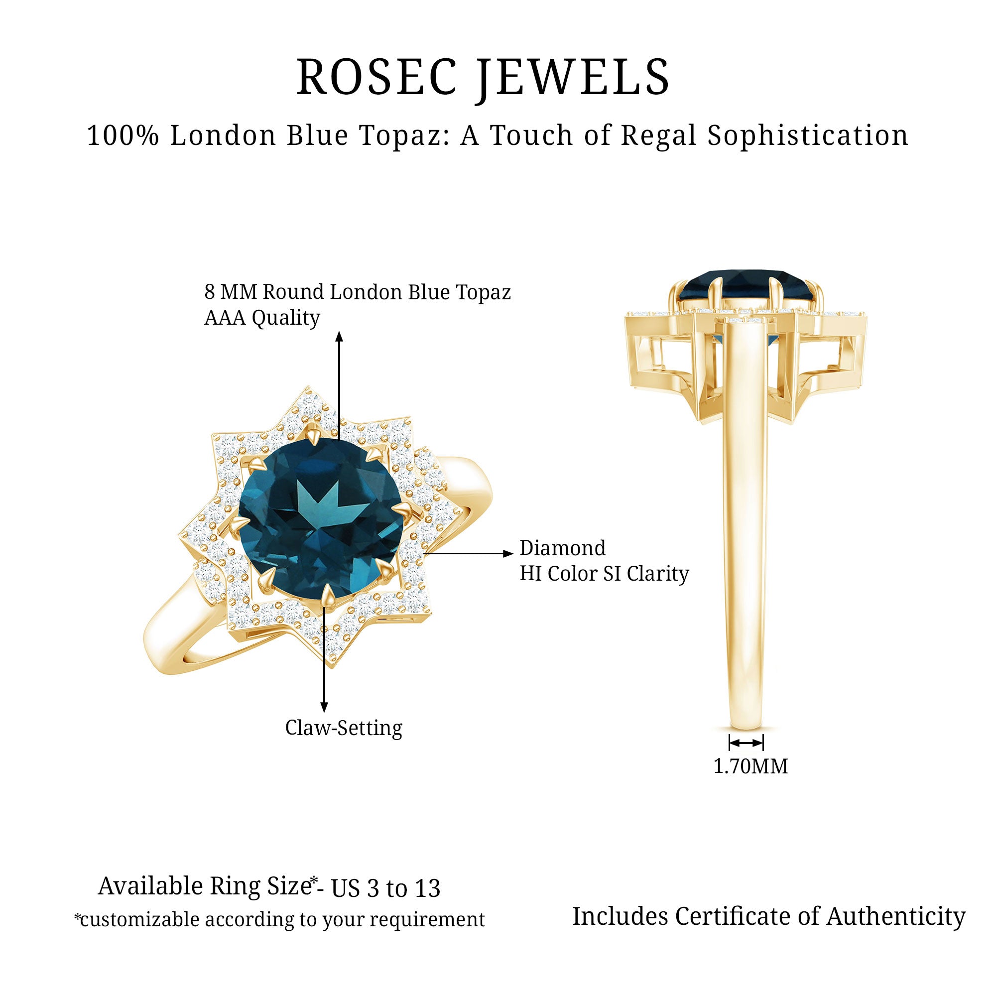 Popularized as the most flashy, flamboyant, and bold ring out there, this Cocktail Ring is adorned with an enormous Center-Stone of London Blue Topaz. It is further accentuated with eye-striking patterns of diamond/moissanite around or as side stones. A London Blue Topaz Cocktail Ring is meant to make a statement with floral and other attention-catching motifs.