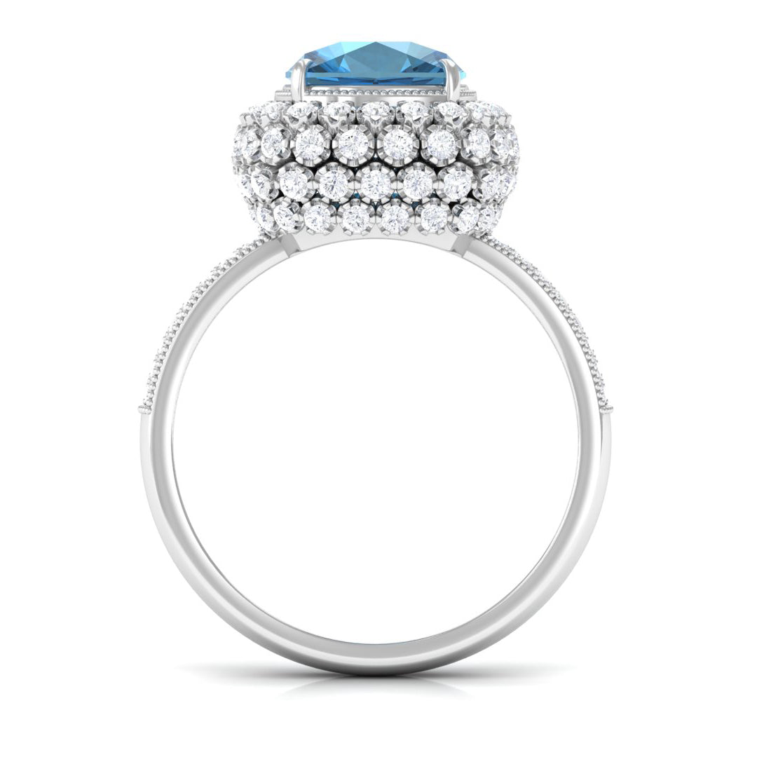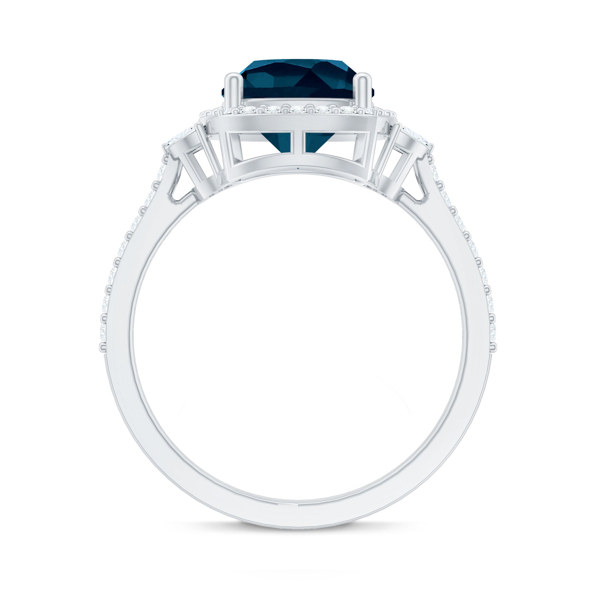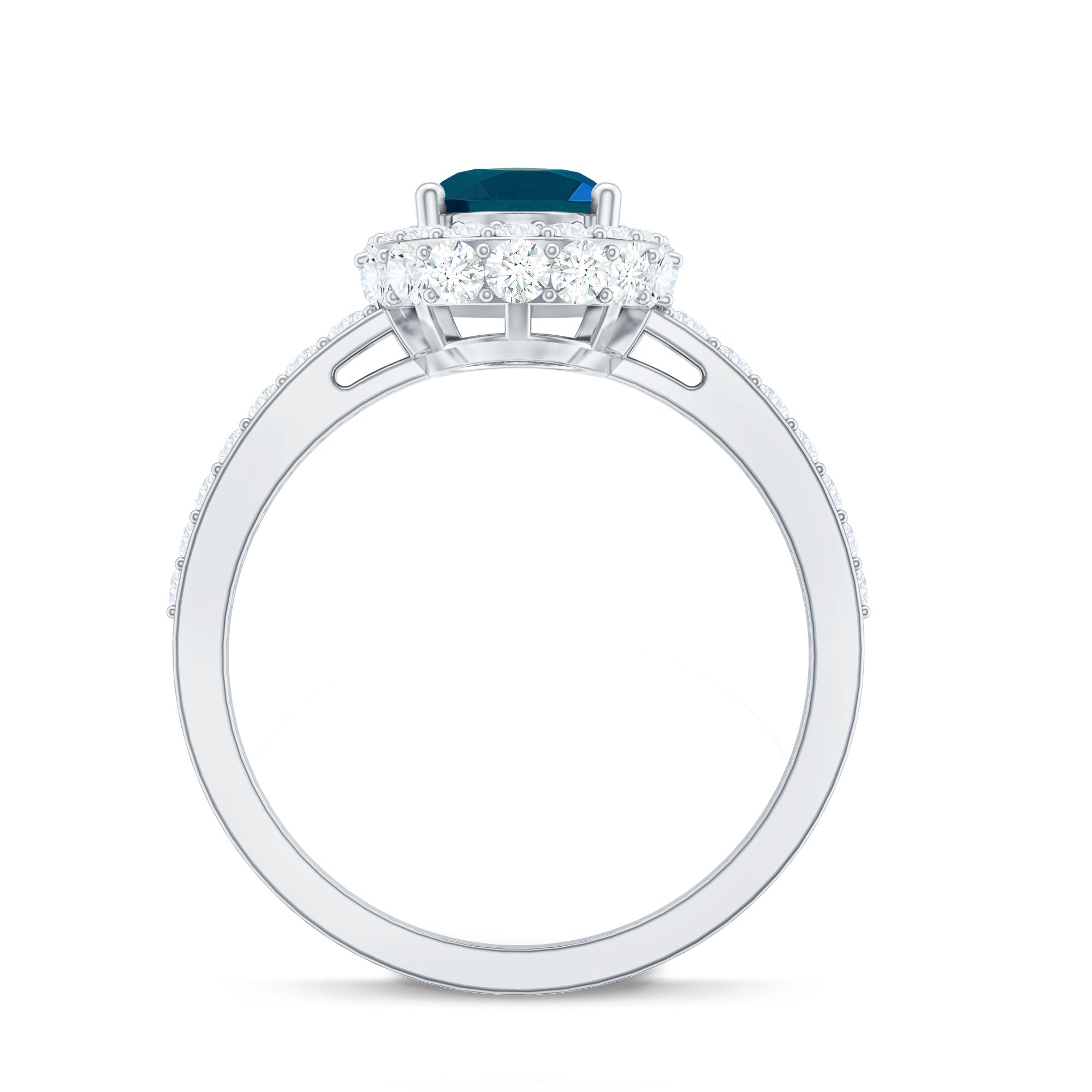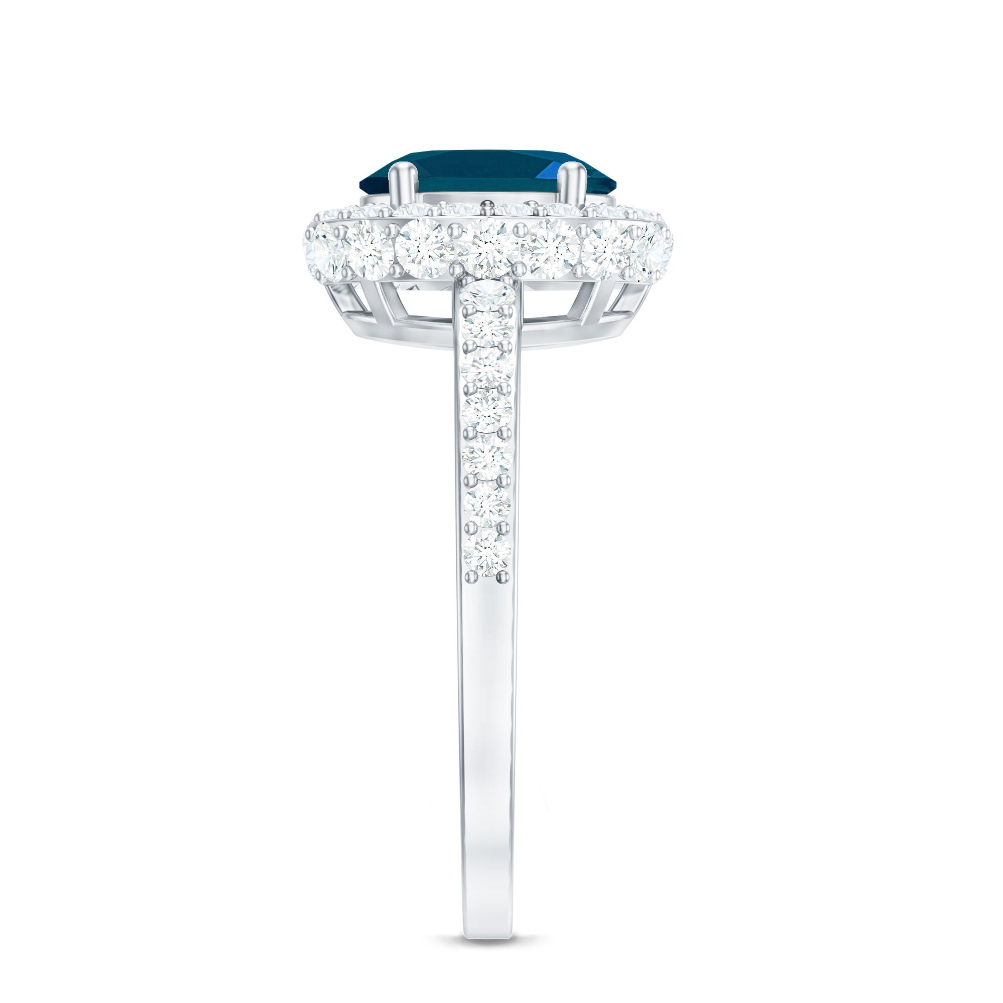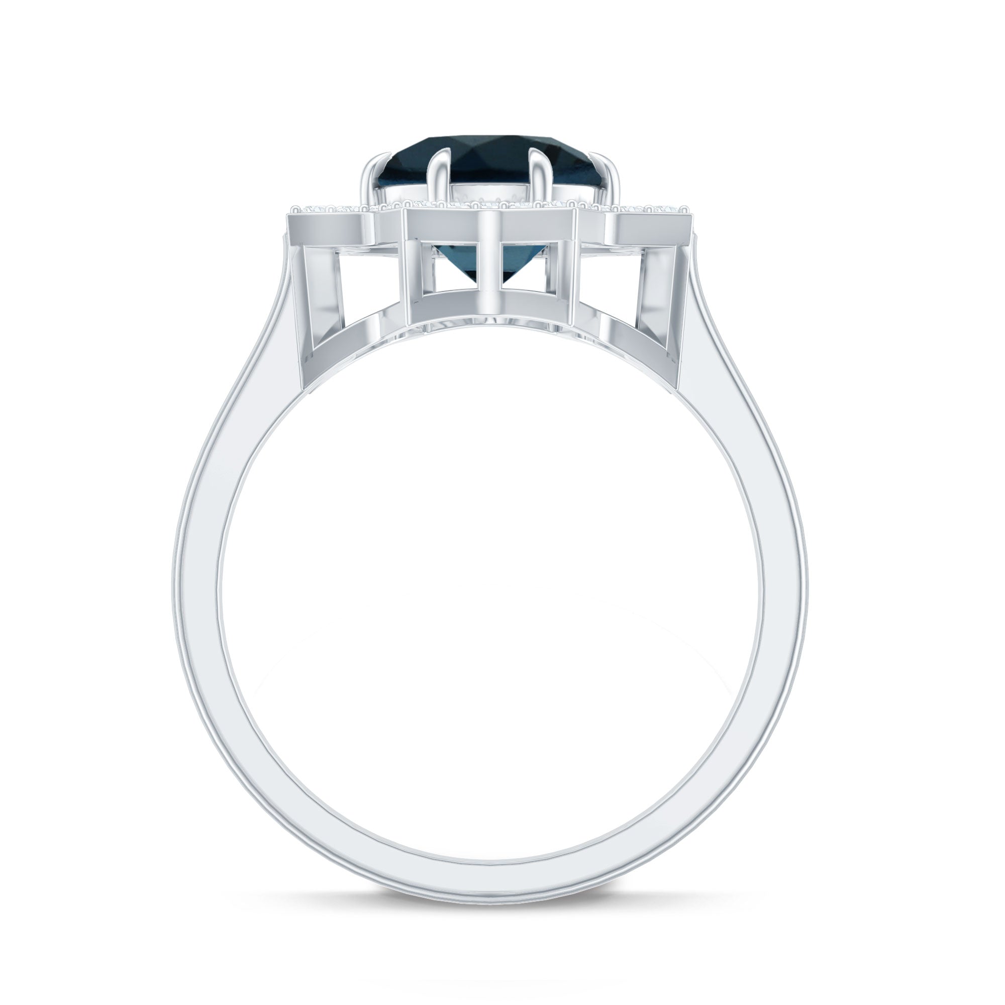 A unique and edgy take to the classic Solitaire style, the Center Stone of London Blue Topaz here is adorned by a shimmering row of Diamond/Moissanite all around. The Halo doesn’t just lend more character to the Blue Topaz Ring, but also deceives your eyes by making your Topaz appear slightly bigger in size. It is the go-to style for those who fancy a London Blue Topaz and Diamond Ring.