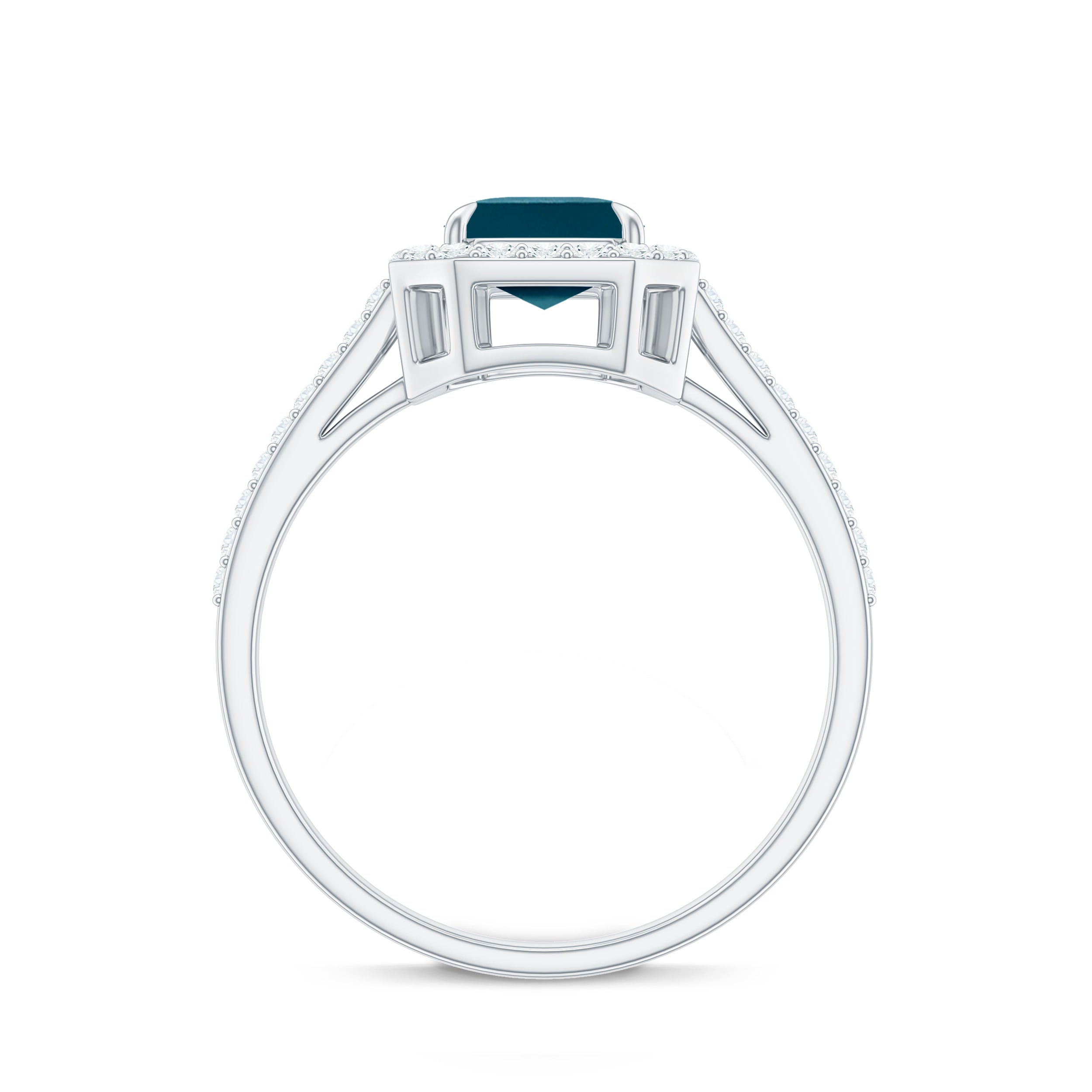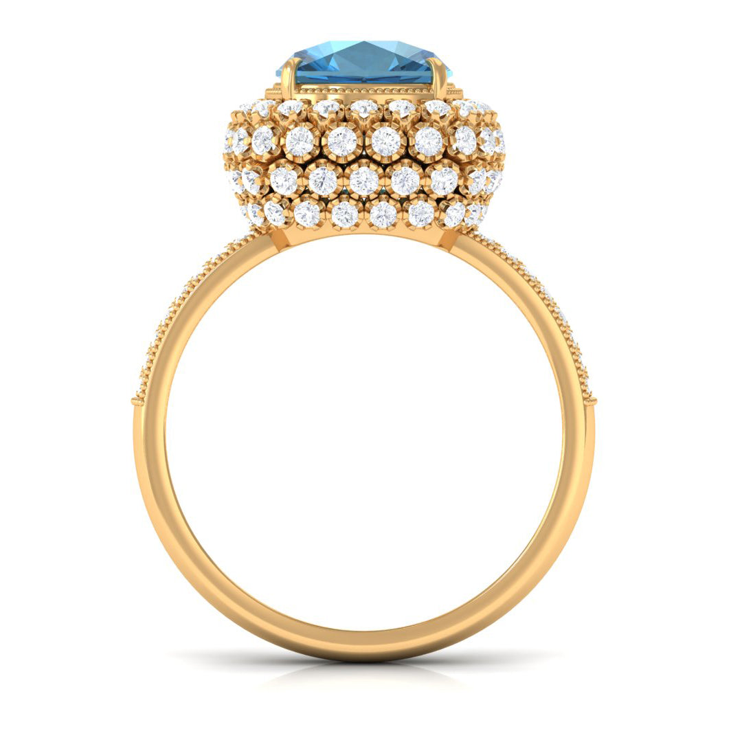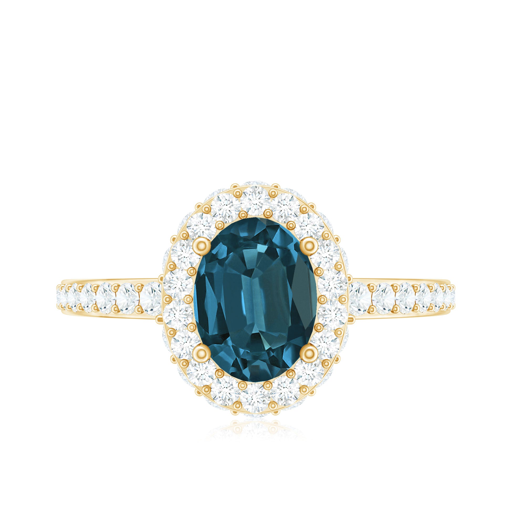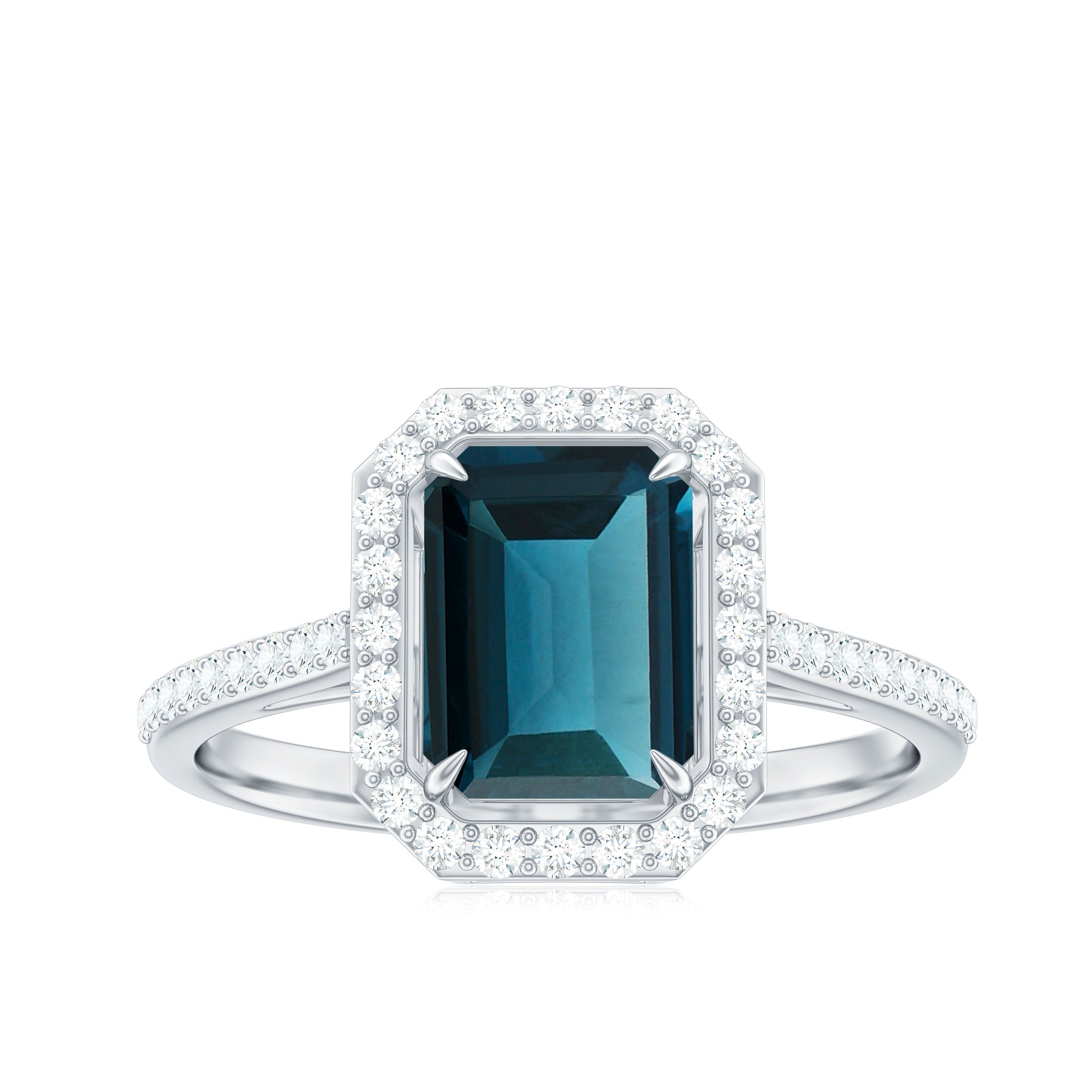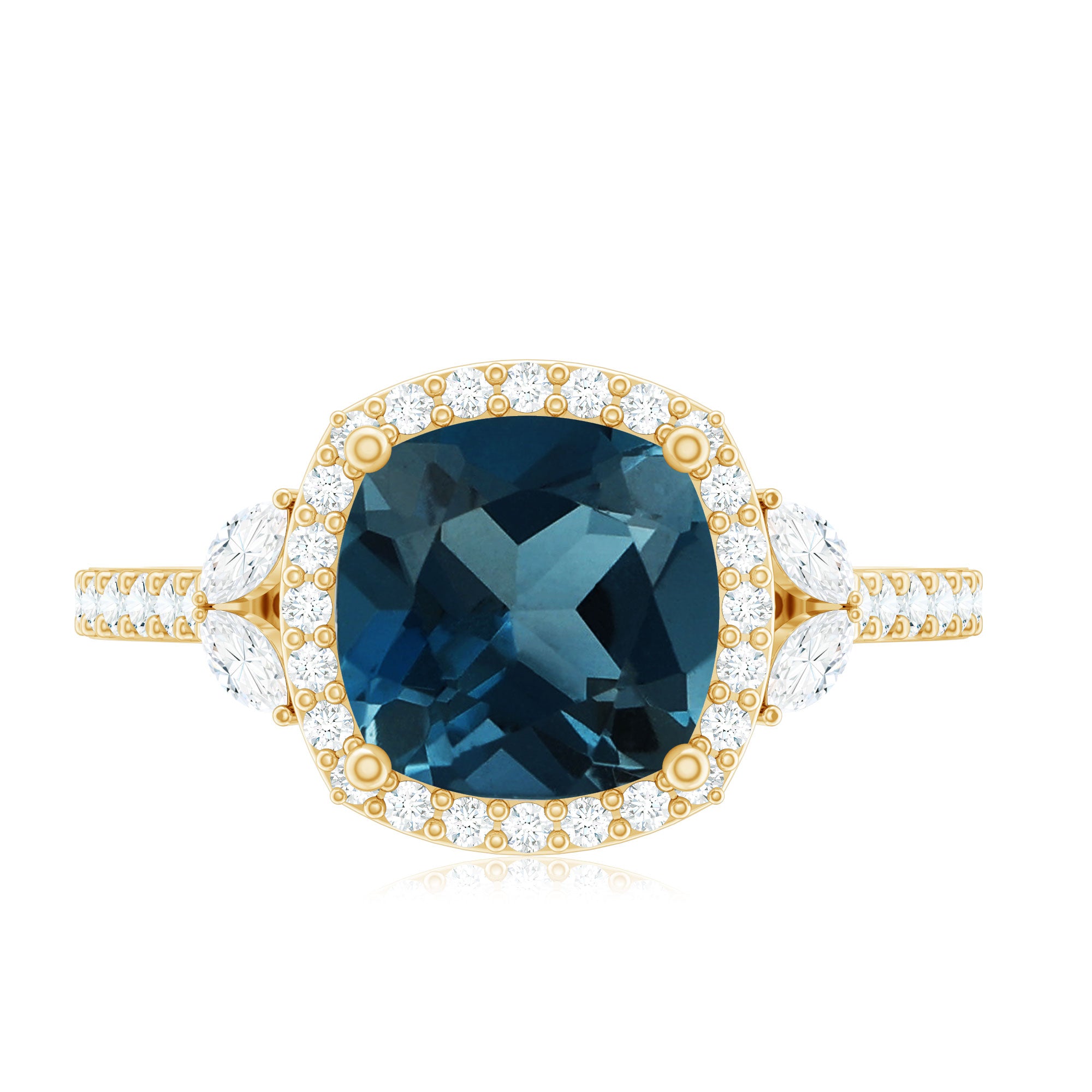 A unique and edgy take to the classic Solitaire style, the Center Stone of London Blue Topaz here is adorned by a shimmering row of Diamond/Moissanite all around. The Halo doesn’t just lend more character to the Blue Topaz Ring, but also deceives your eyes by making your Topaz appear slightly bigger in size. It is the go-to style for those who fancy a London Blue Topaz and Diamond Ring.