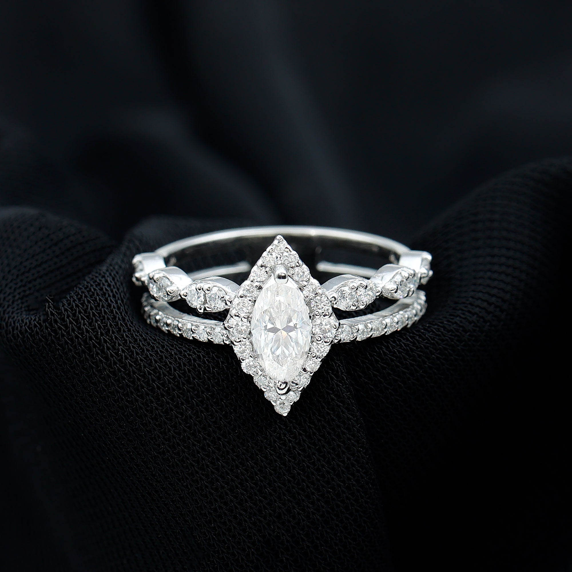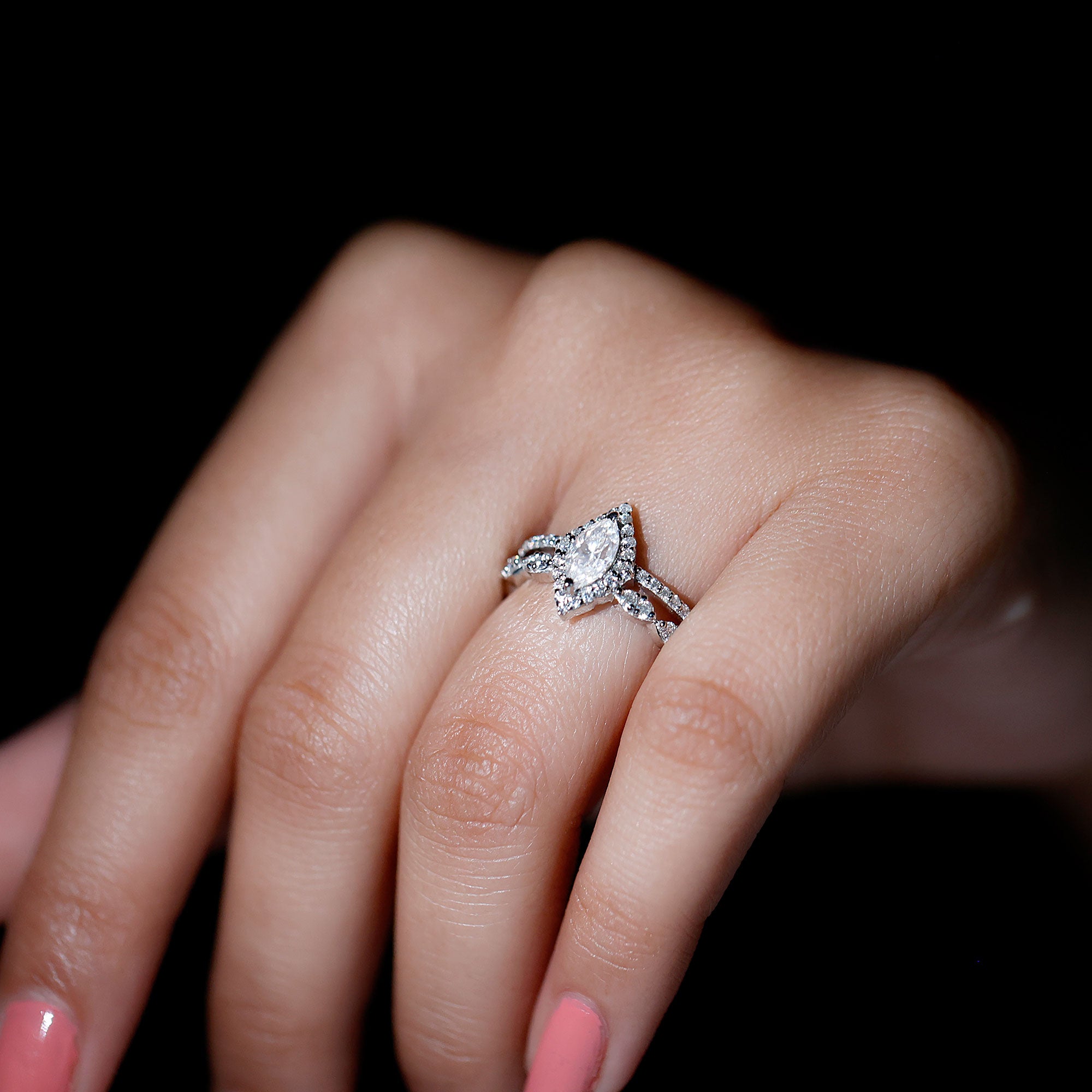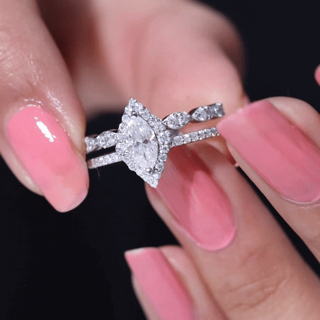 The fragile tips of marquise rings make it vulnerable to damages. So it's important to choose a setting wisely. Bezel, bar, pave and channel settings can be considered for marquise wedding rings, if you are choosing them for day to day wear. Prong or halo settings are preferred for good sparkle and brilliance.