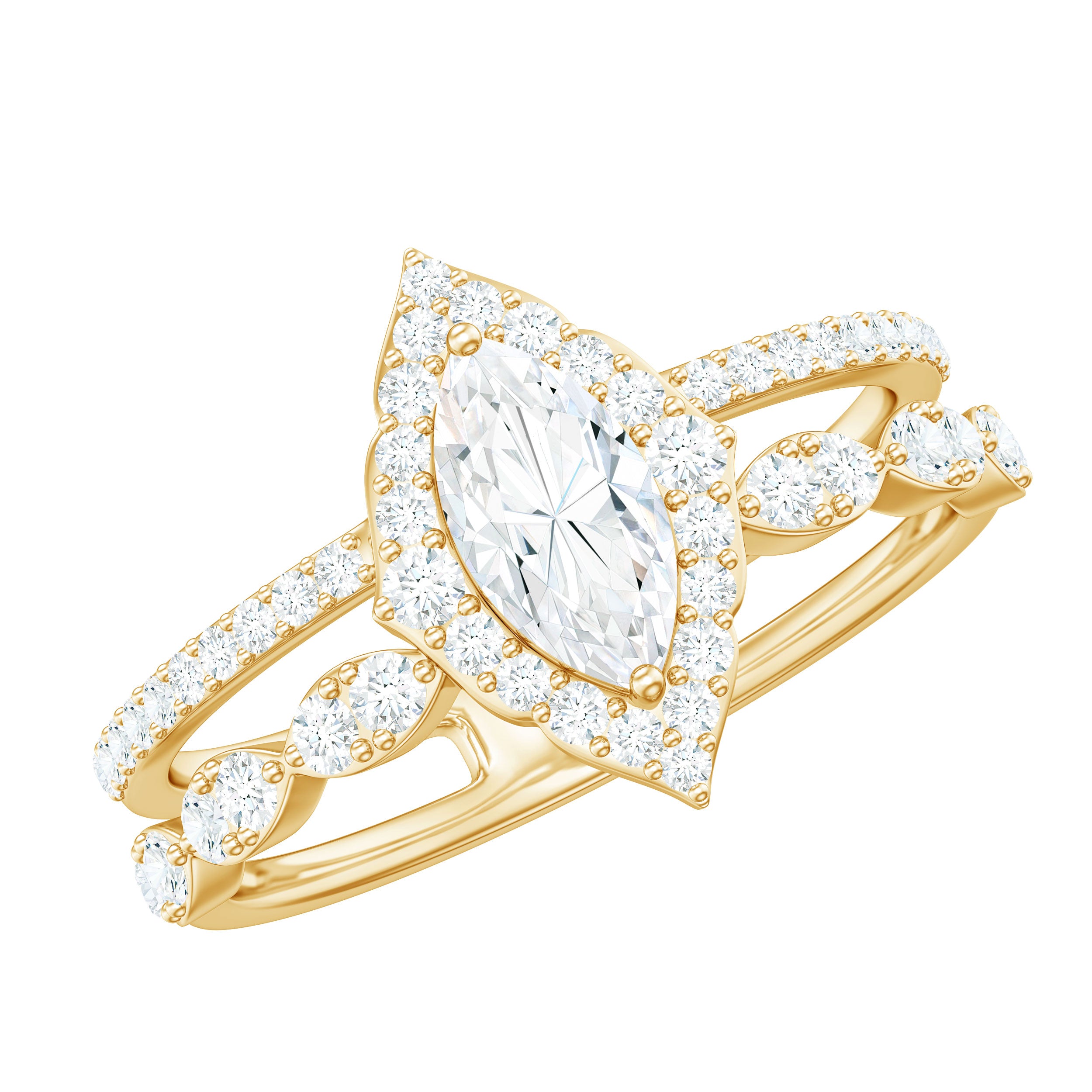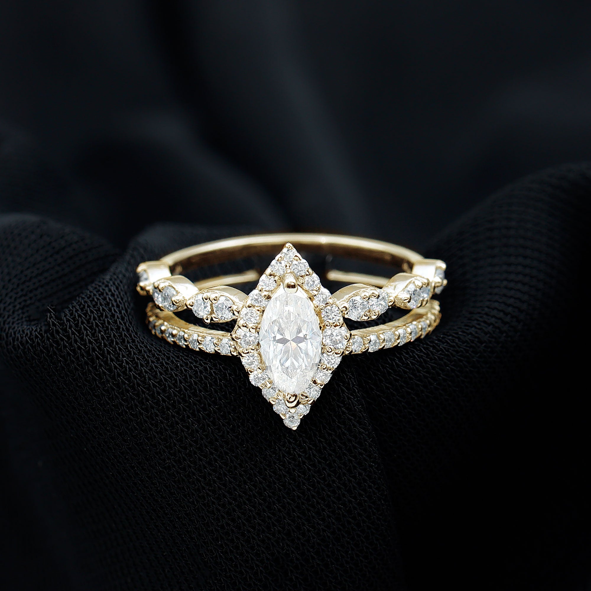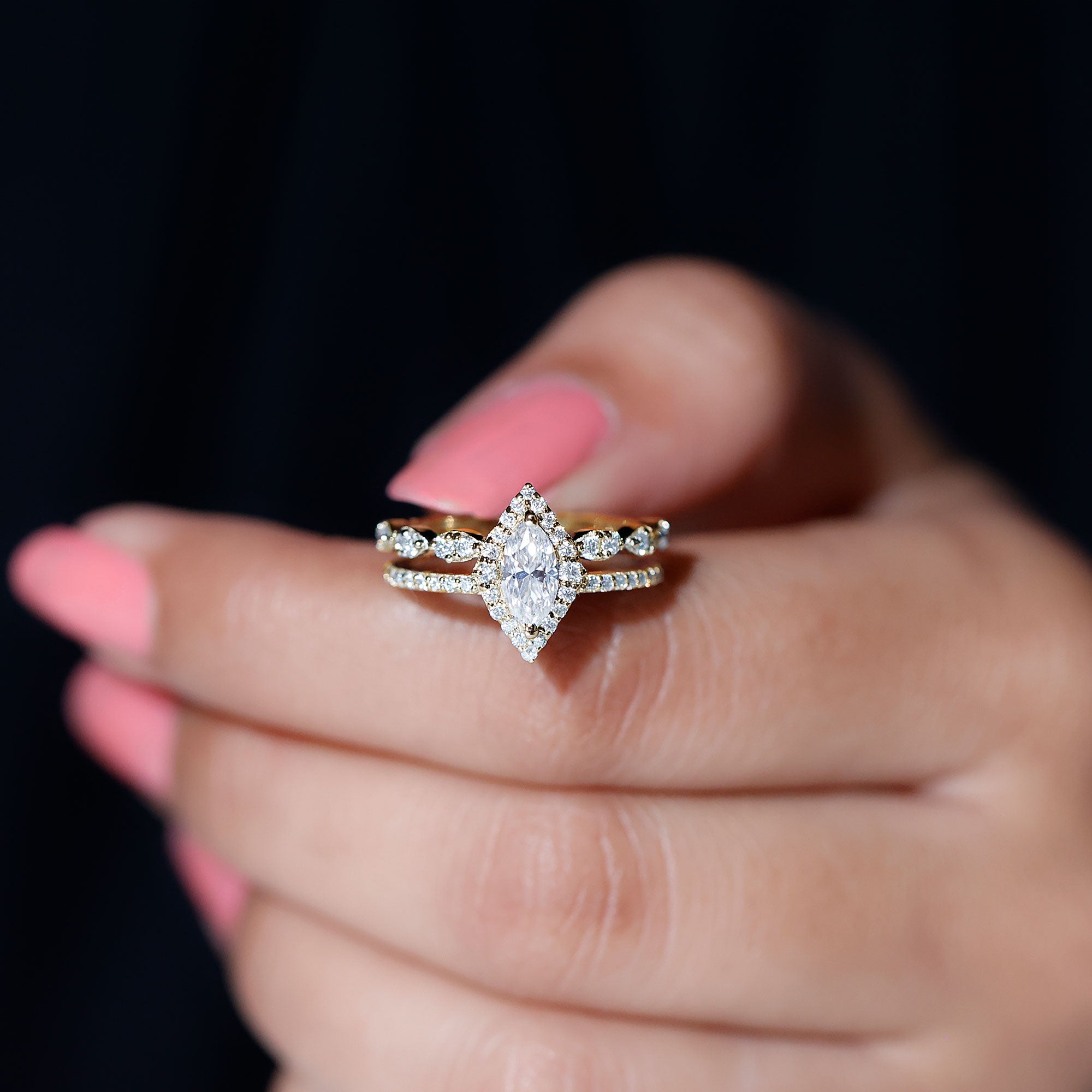 The fragile tips of marquise rings make it vulnerable to damages. So it's important to choose a setting wisely. Bezel, bar, pave and channel settings can be considered for marquise wedding rings, if you are choosing them for day to day wear. Prong or halo settings are preferred for good sparkle and brilliance.