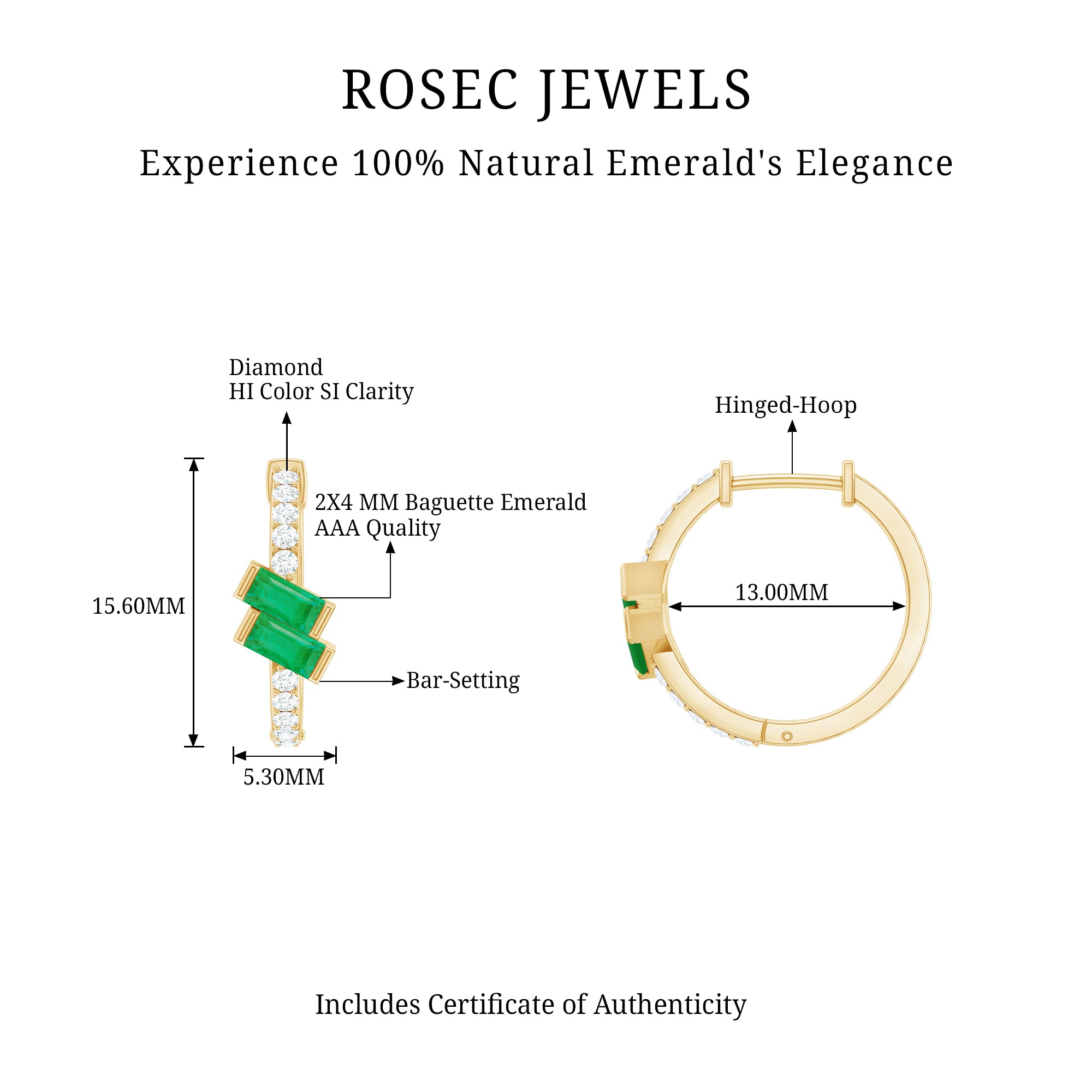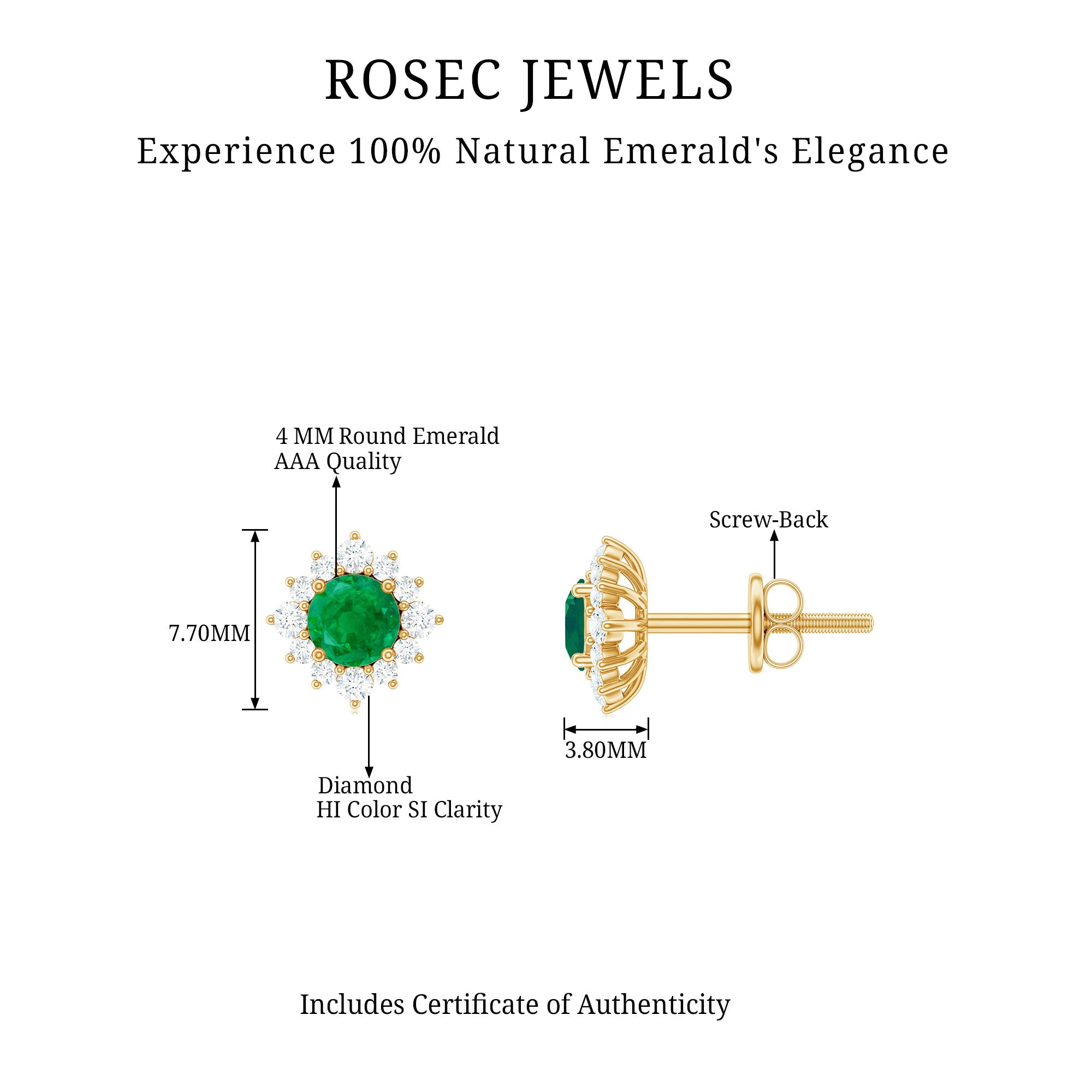 Our exclusive collection of emerald jewelry is crafted from various precious metals such as white gold, yellow gold, and silver. Pick the jewelry with the preferable metal choice that not only suits your budget but also complements your skin tones and outfits. Each metal has its own durability and holds a distinct price. Apart from durability, one of the essential factors of choosing the metal color that elegantly matches your emerald. Different meanings are linked to these metals; thus you'll get different metal choices at Rosec Jewels. Mostly, women prefer white gold metal that accentuates the green tone of emerald elegantly.