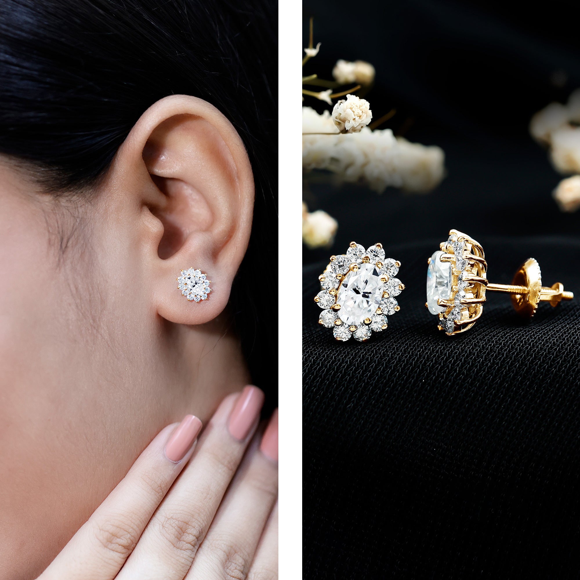 These dazzling earrings match the beauty of diamonds, yet they are an affordable piece of jewelry for those who seek budget-friendly options. Our wide collection of women's moissanite stud or hoop earrings is preciously handcrafted in a wide variety of designs that often bring out who you are with their unmatched beauty. From classic stuff to nature-inspired beauty, simple solitaire, and shimmery halo, you'll surely find something unique, catering to your budget and personality.