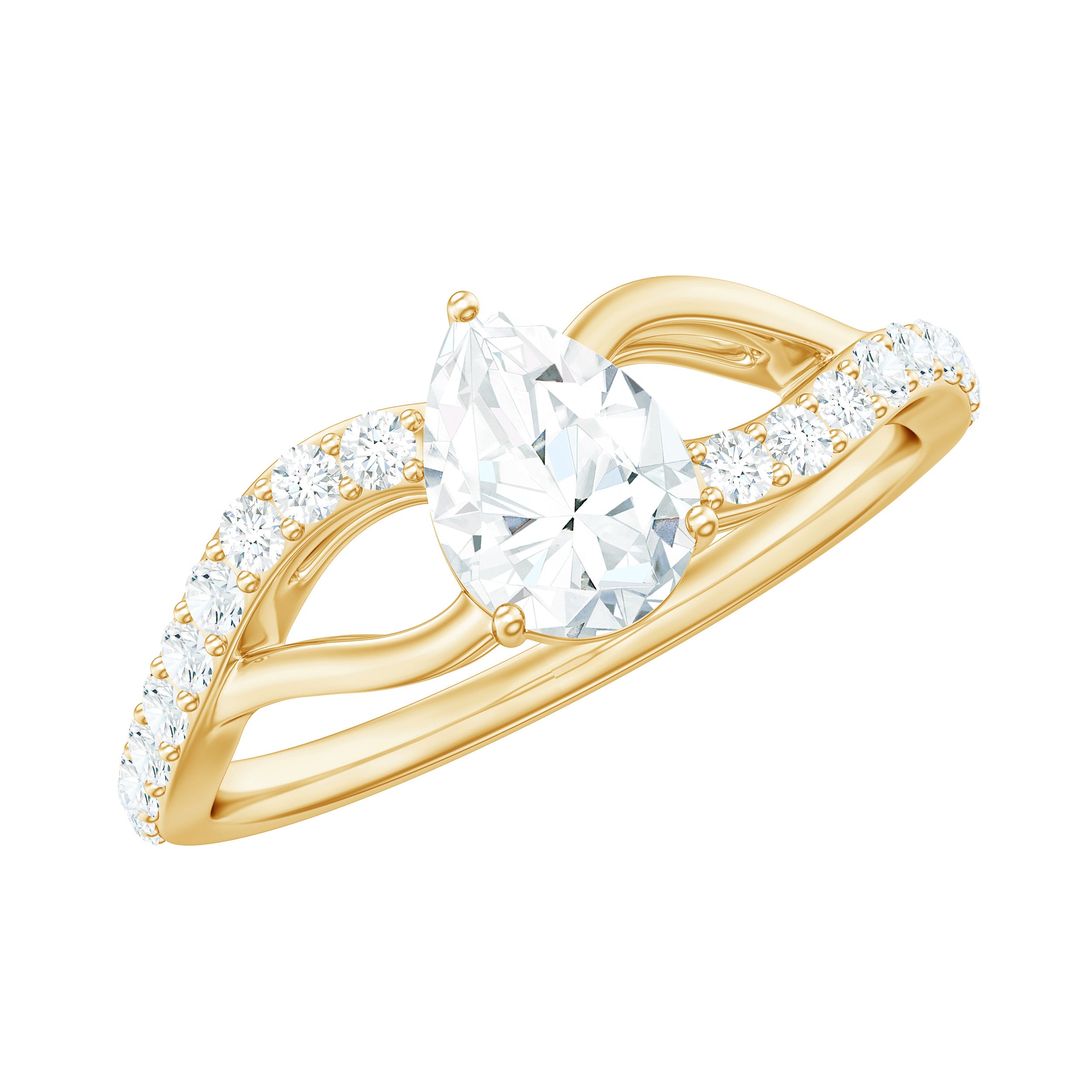Resembling drops of water or tears in shape, a Pear Cut Moissanite boasts a pointy top and a curved bottom. Not only does a Pear Shaped Moissanite Engagement Ring drive great appeal for its feminine aesthetic, but it also offers a distinctive sparkle (by being home to 56 facets that imitate the arrangement found in a Round Cut)