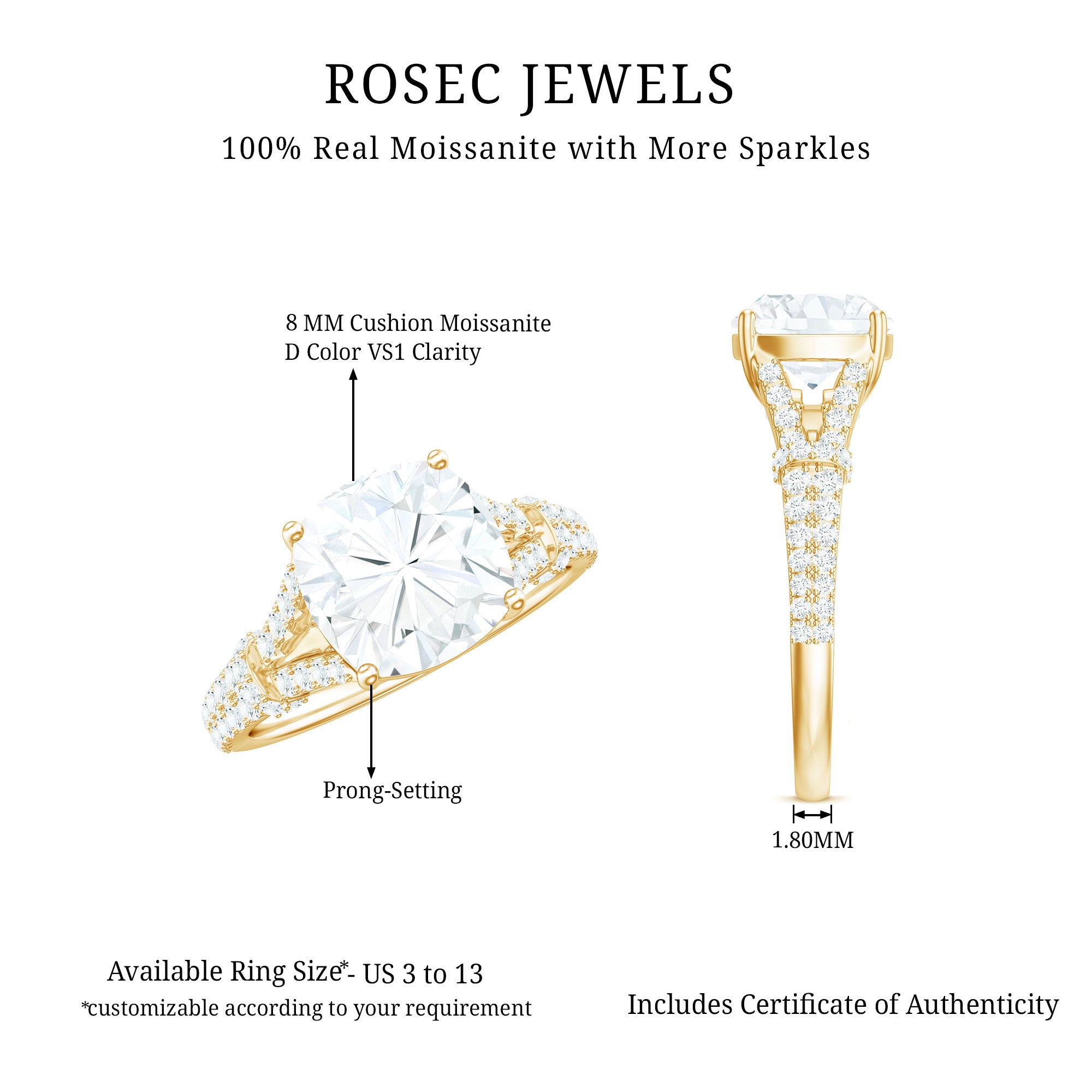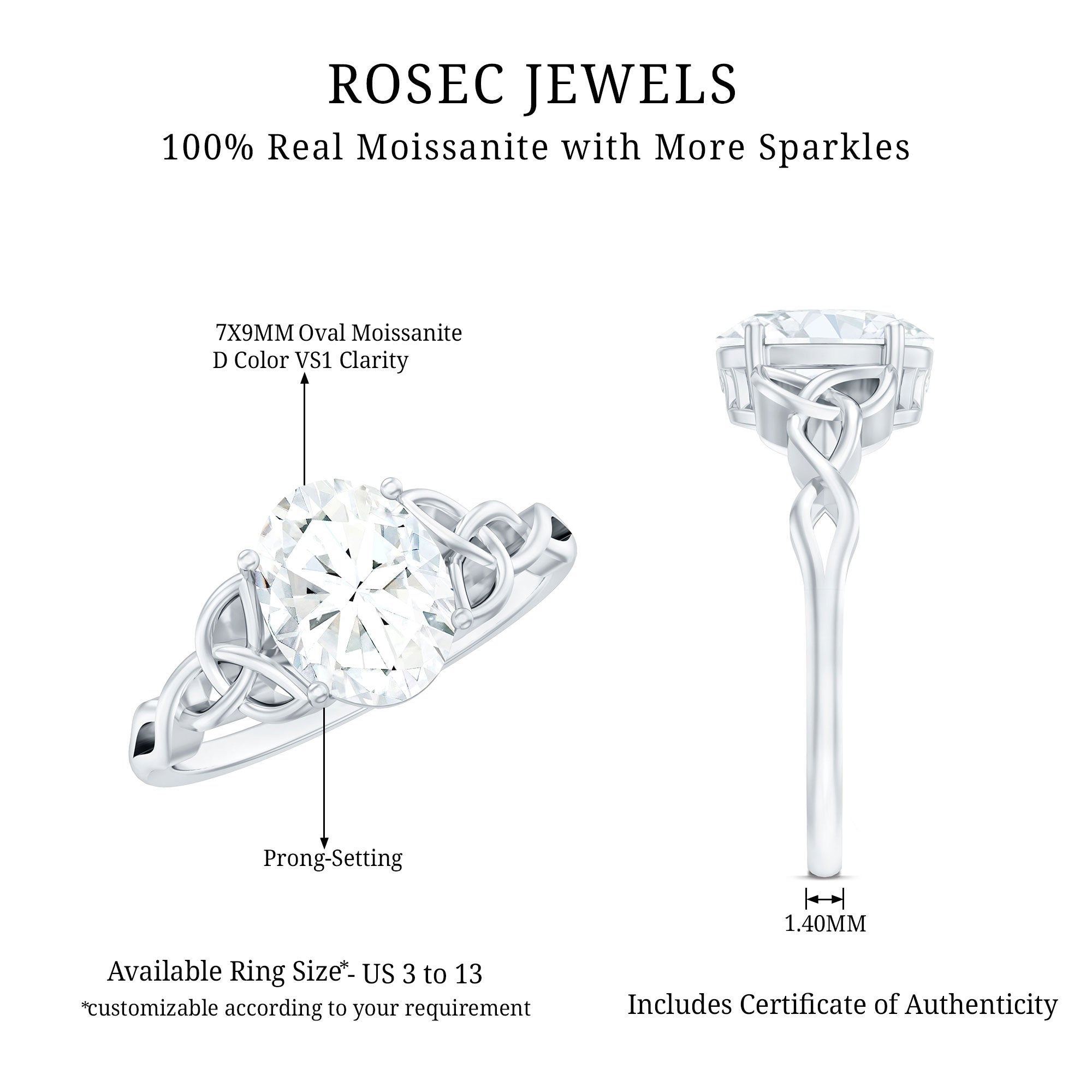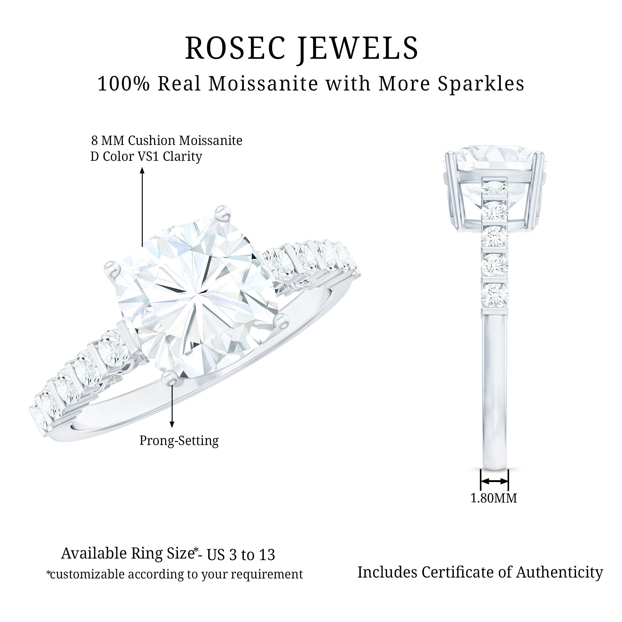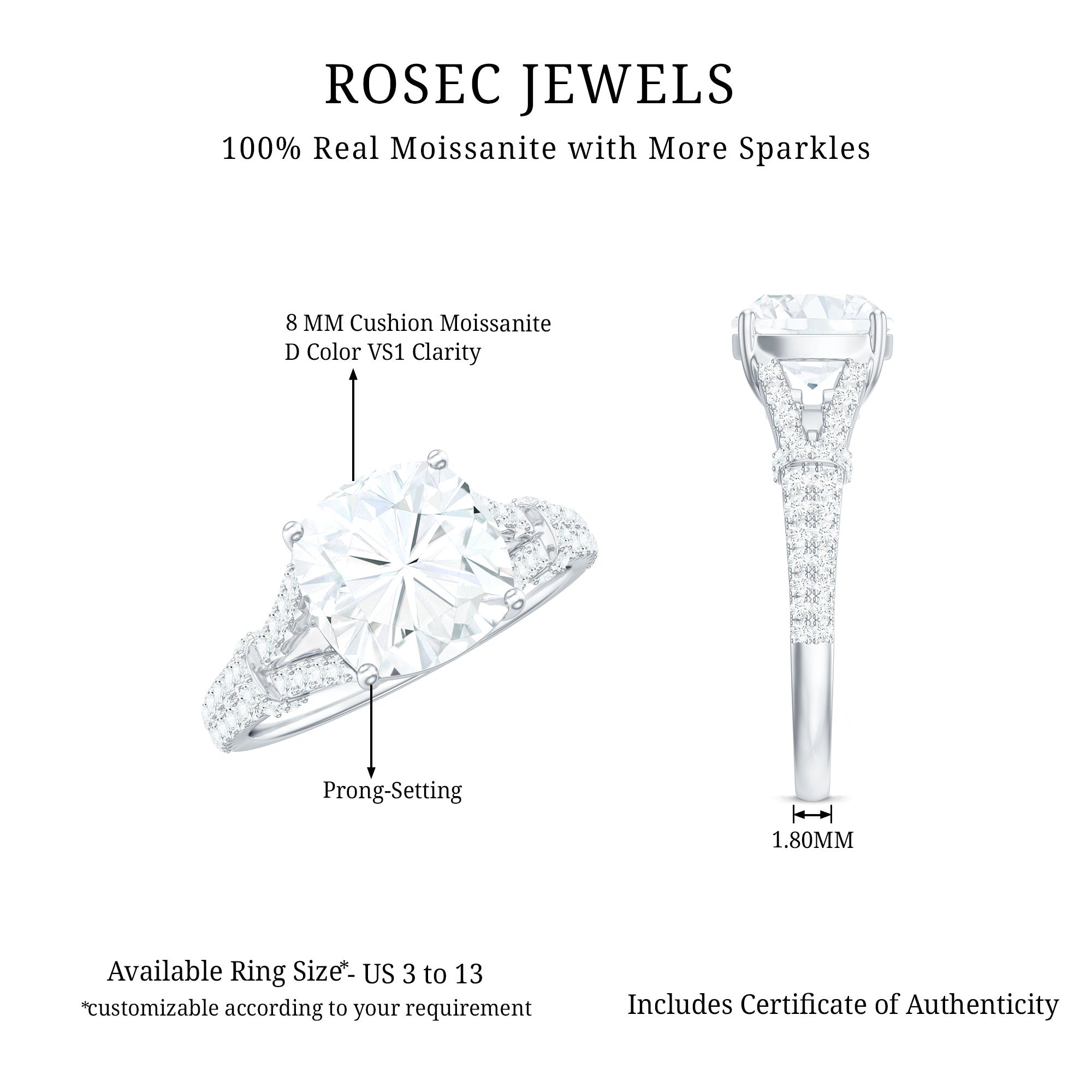 - Durable for everyday wear: With a hardness of 9.25 on the Mohs scale, moissanite is well suited for engagement rings.