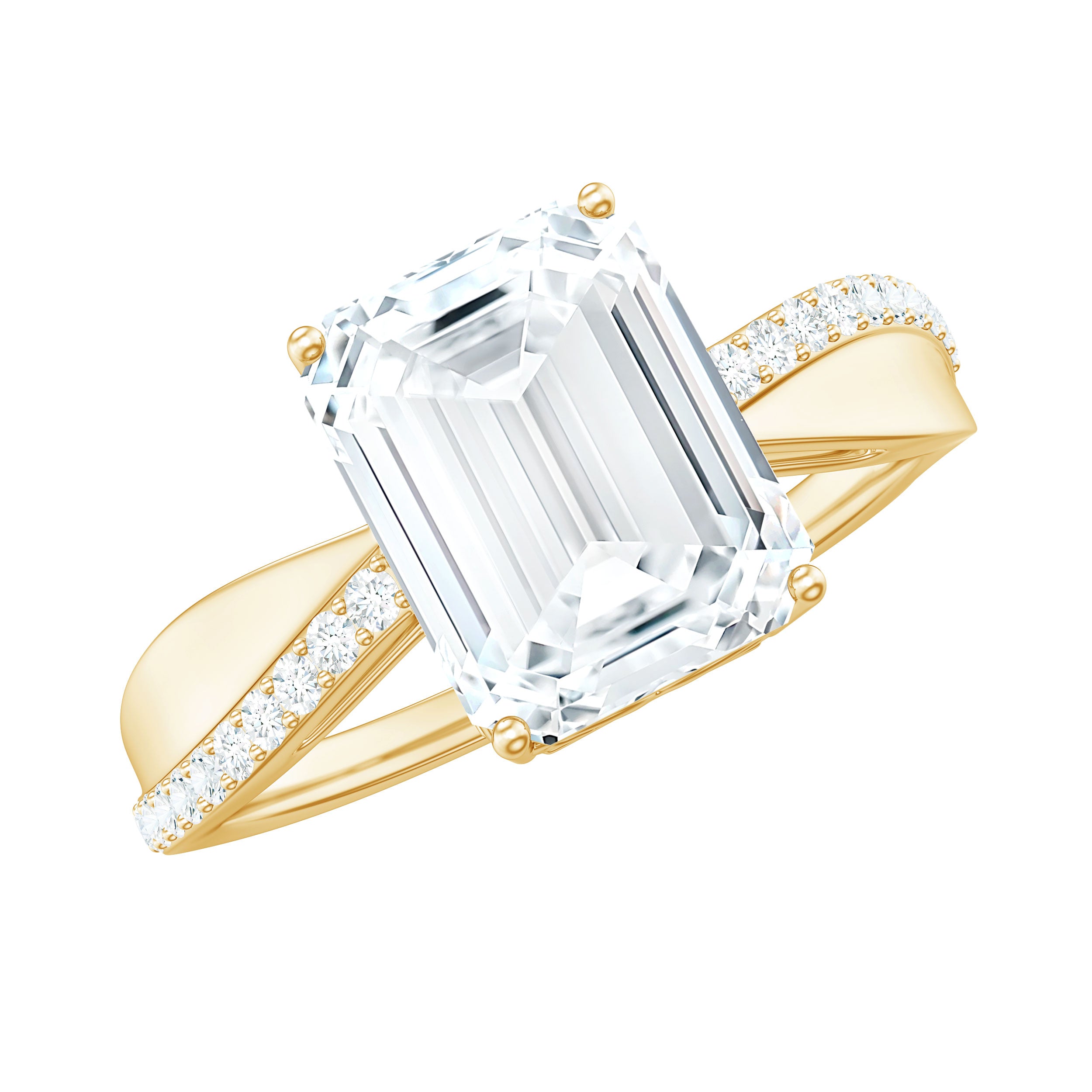 In the simplest terms, an Emerald Cut is characterized by a rectangular shape that stands out with cut-off beveled corners, thus exuding a vintage yet sophisticated aesthetic. On a more technical note, Moissanite Emerald Cut Engagement Rings are home to 57 step-like horizontal facets, a flat table, and long lines that (similar to the Asscher Cut) give off a hall of mirrors effect.