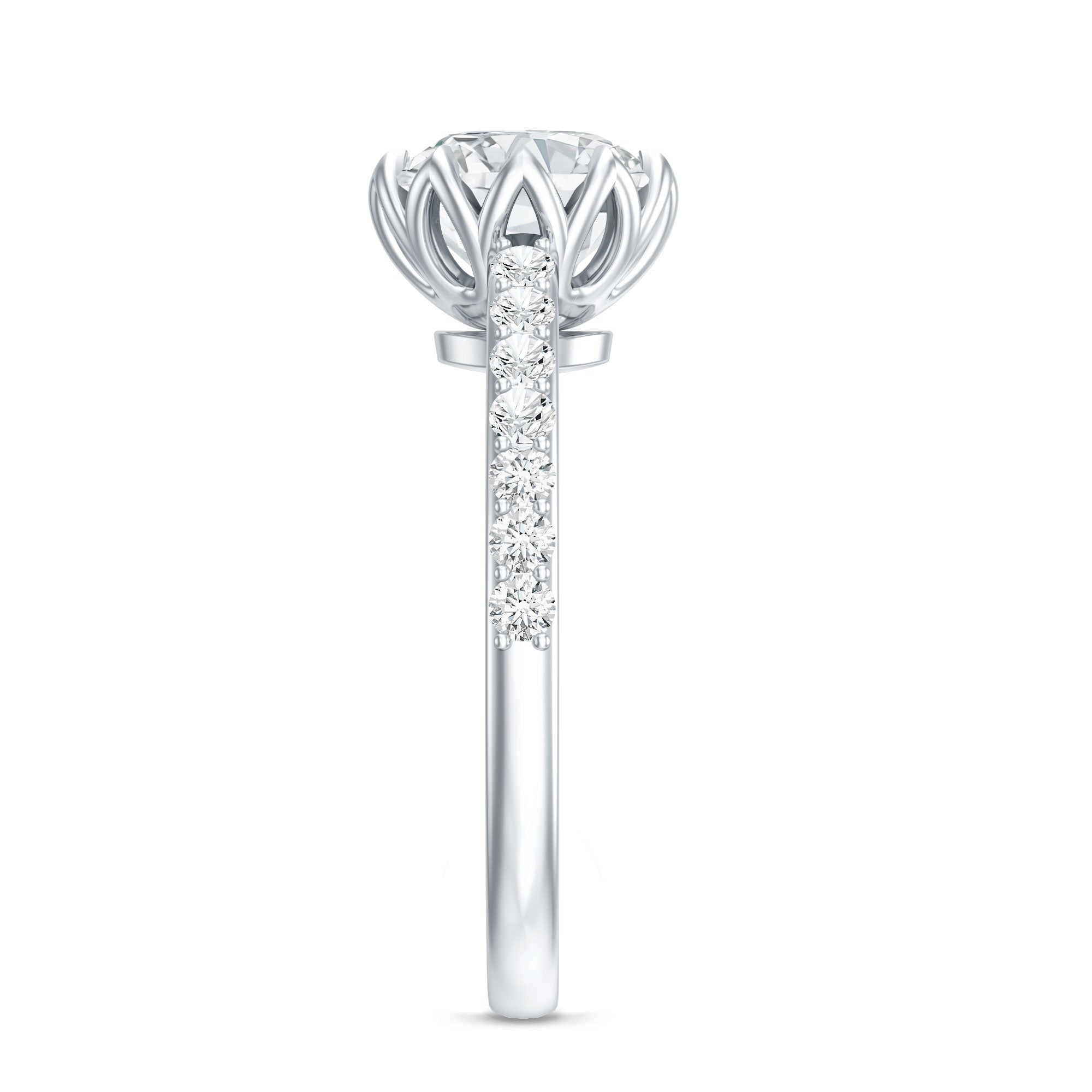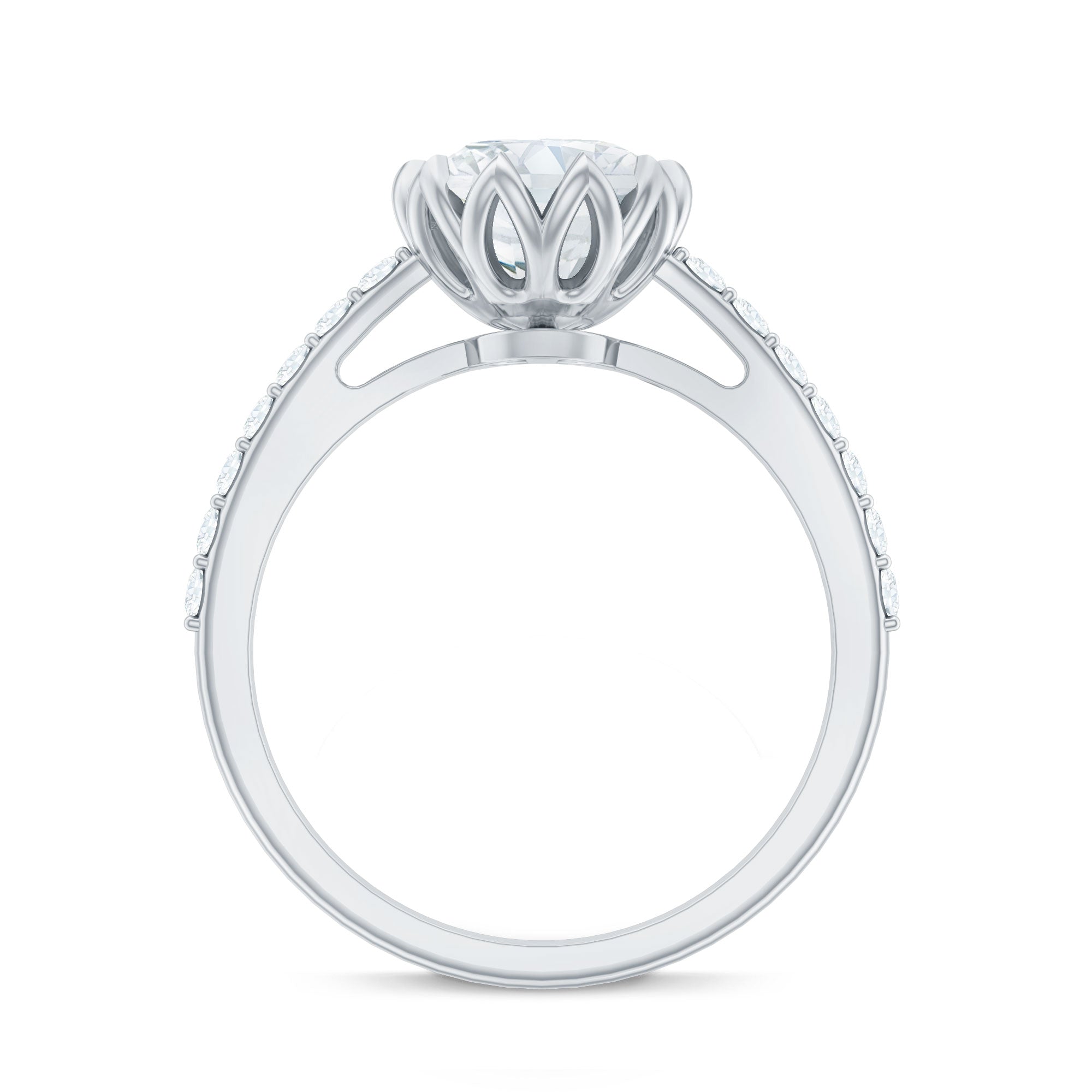 Prized as the boldest, most trendy, and flamboyant Moissanite Engagement Ring for Women, this Cocktail Style puts the spotlight on an enormous centerpiece of Moissanite set in an elaborate design. To add to its extravagant appeal, the Center Stone is often complemented with Moissanite in eye-striking patterns (as side-stones, Halo, or visually appealing clusters). While you’re most likely to come across flashy Moissanite Flower Engagement Rings in this category, those fashioned with nature-inspired detailing as well as vintage engravings also appear quite statement-making.