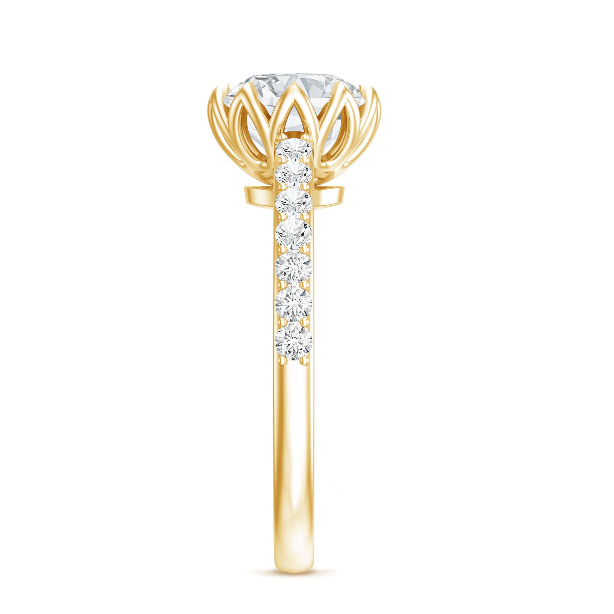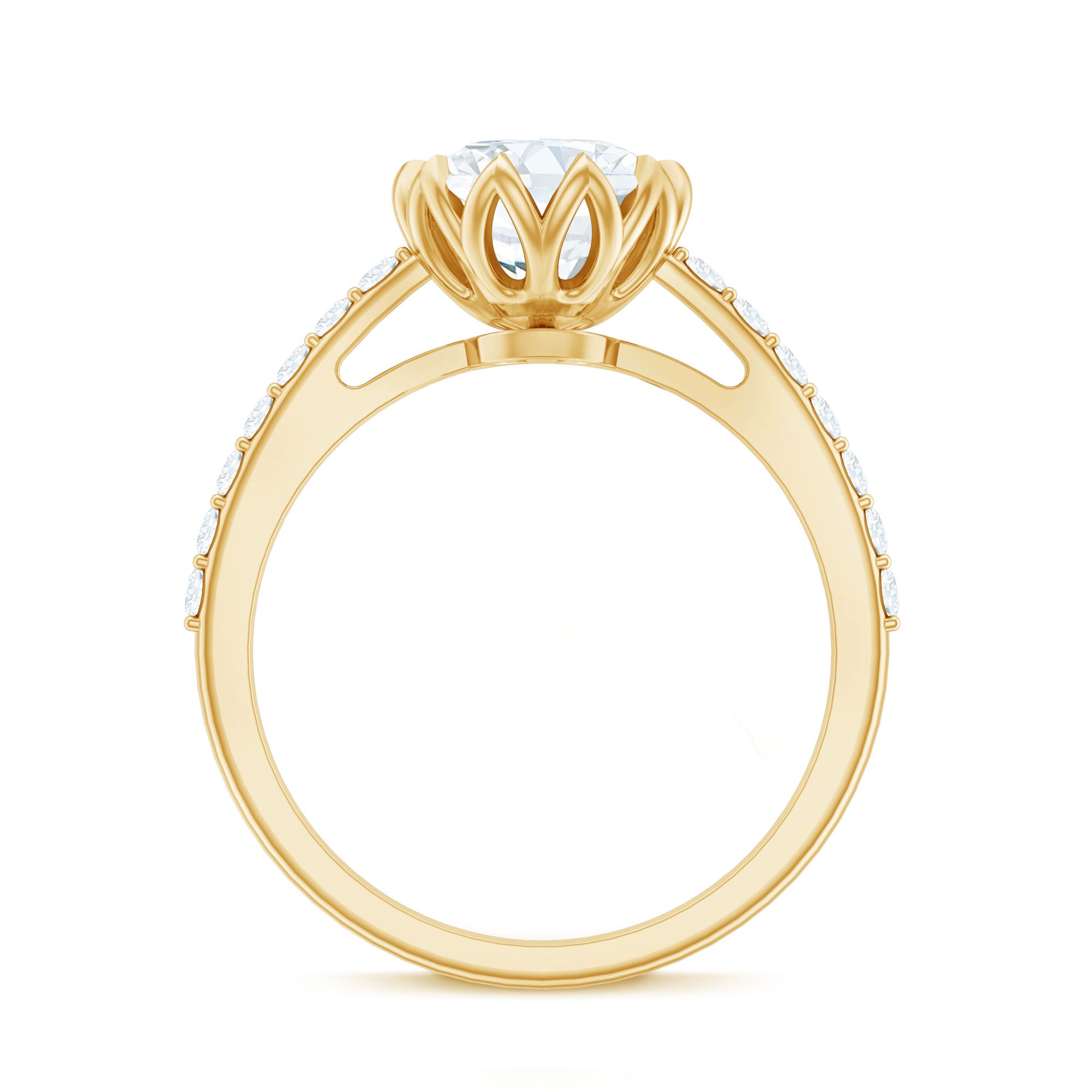 A Moissanite Solitaire Engagement Ring is defined by a Sparkling Centerpiece of Moissanite that is meant to stand out all solo (with an enormous size of 6 MM or more). While it may be the most classic and timeless token of love for any bride-to-be, it also speaks to many senses of style. A Round or Oval Moissanite Engagement Ring resonates with an understated and conventional aesthetic, while one fashioned with a Pear, Marquise, or Princess Cut Moissanite is more on the fancier side of the spectrum. On the other hand, if you wish for a grand yet old-school emblem of love, there is nothing better than an Asscher, Emerald, or Cushion Cut Moissanite.
