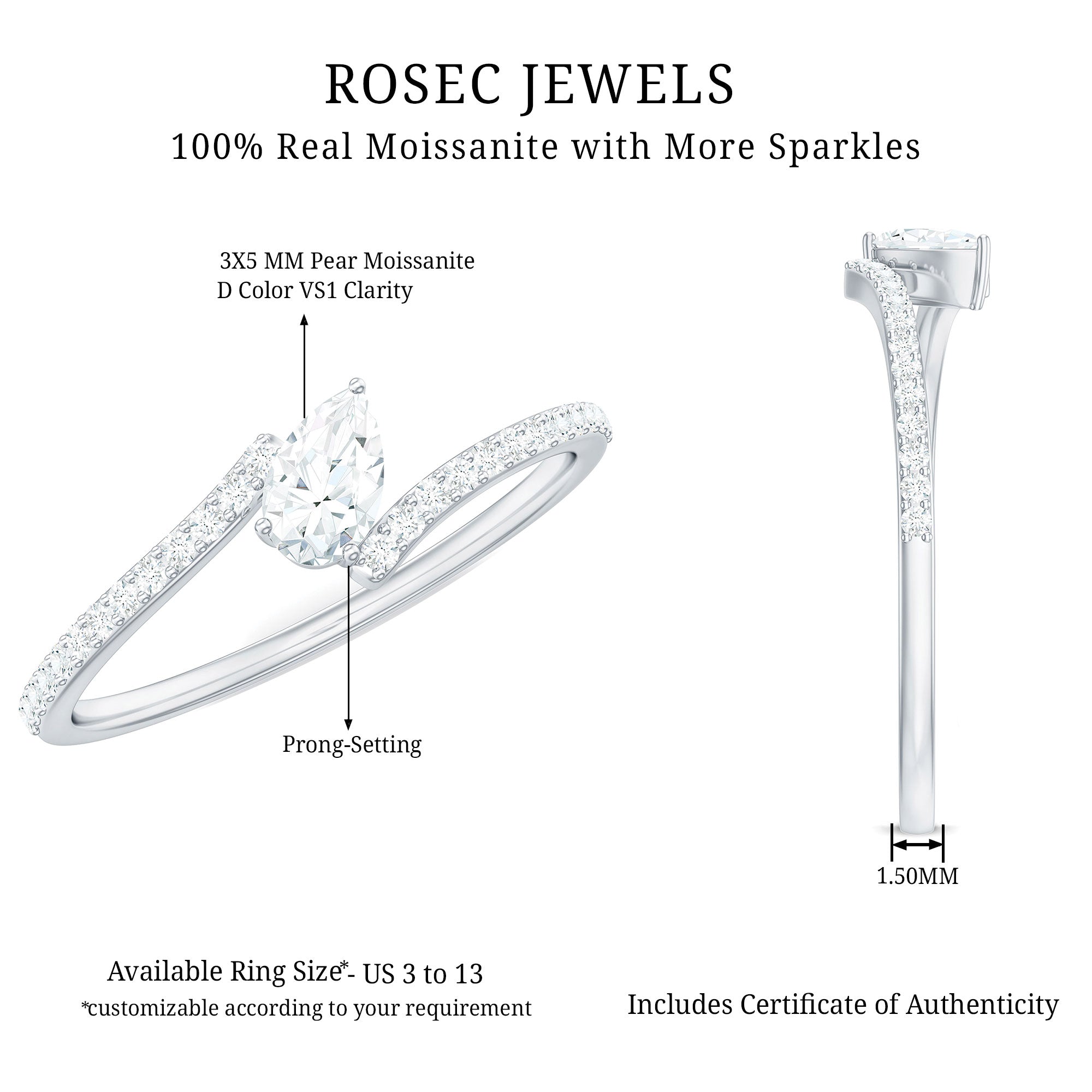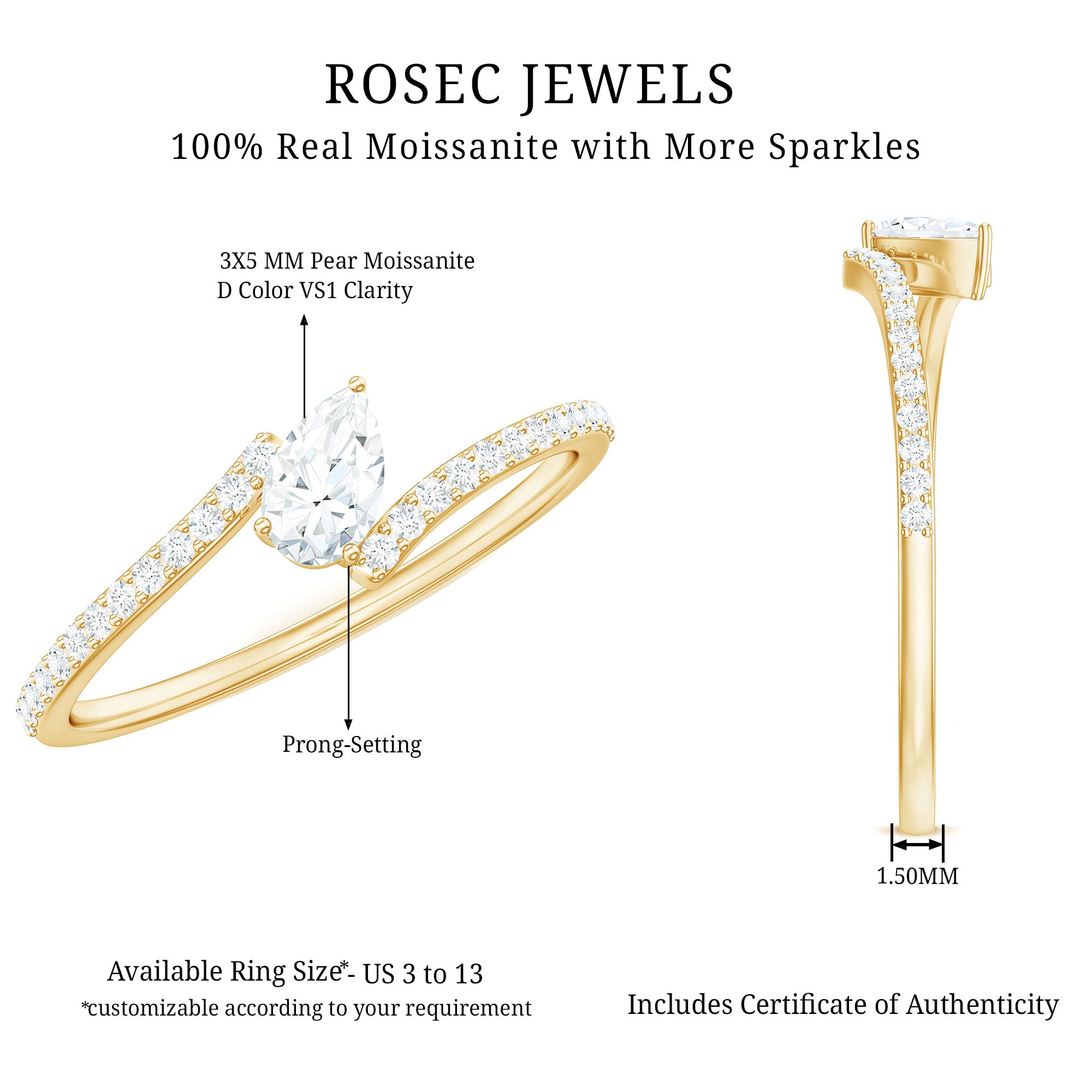 Resembling drops of water or tears in shape, a Pear Cut Moissanite boasts a pointy top and a curved bottom. Not only does a Pear Shaped Moissanite Engagement Ring drive great appeal for its feminine aesthetic, but it also offers a distinctive sparkle (by being home to 56 facets that imitate the arrangement found in a Round Cut)