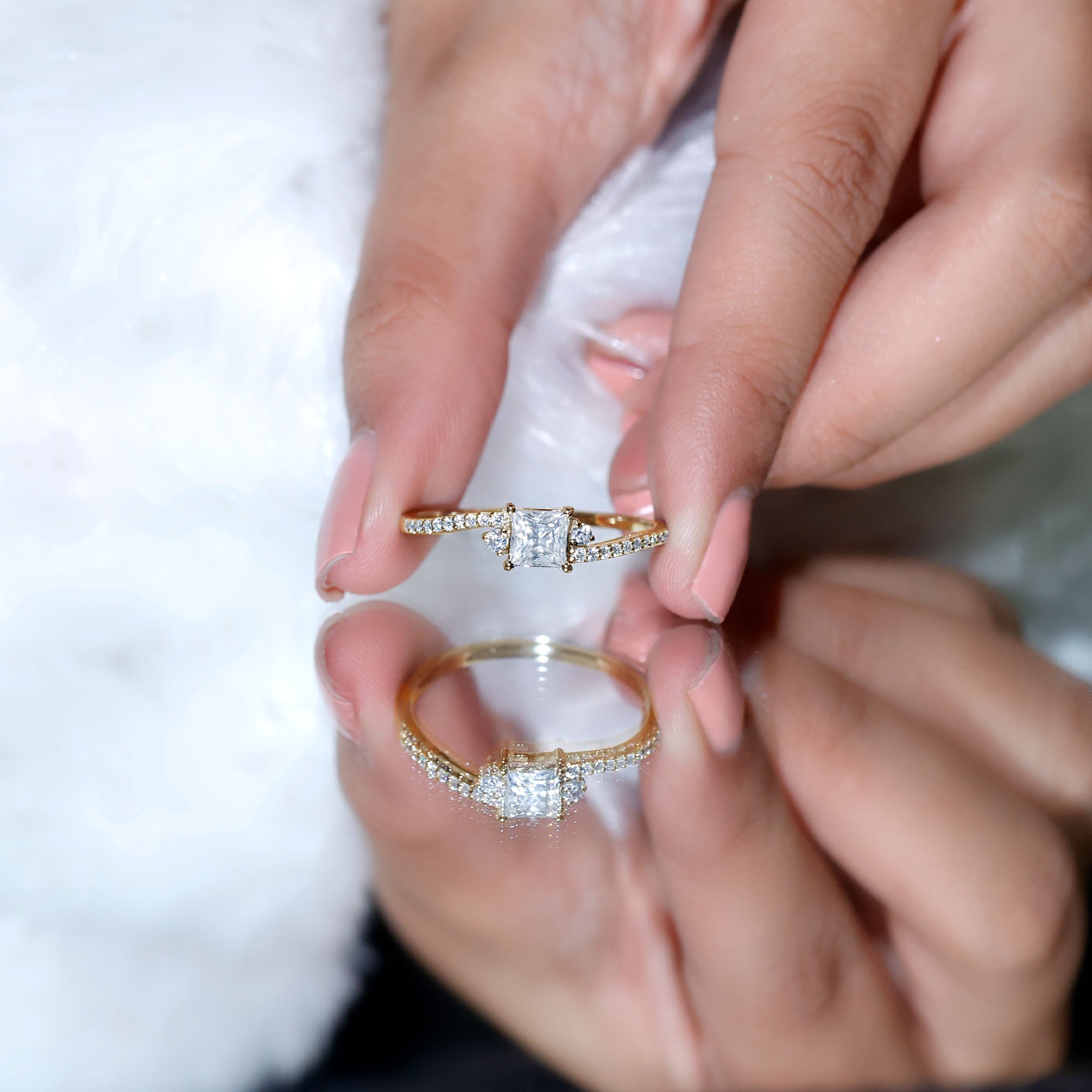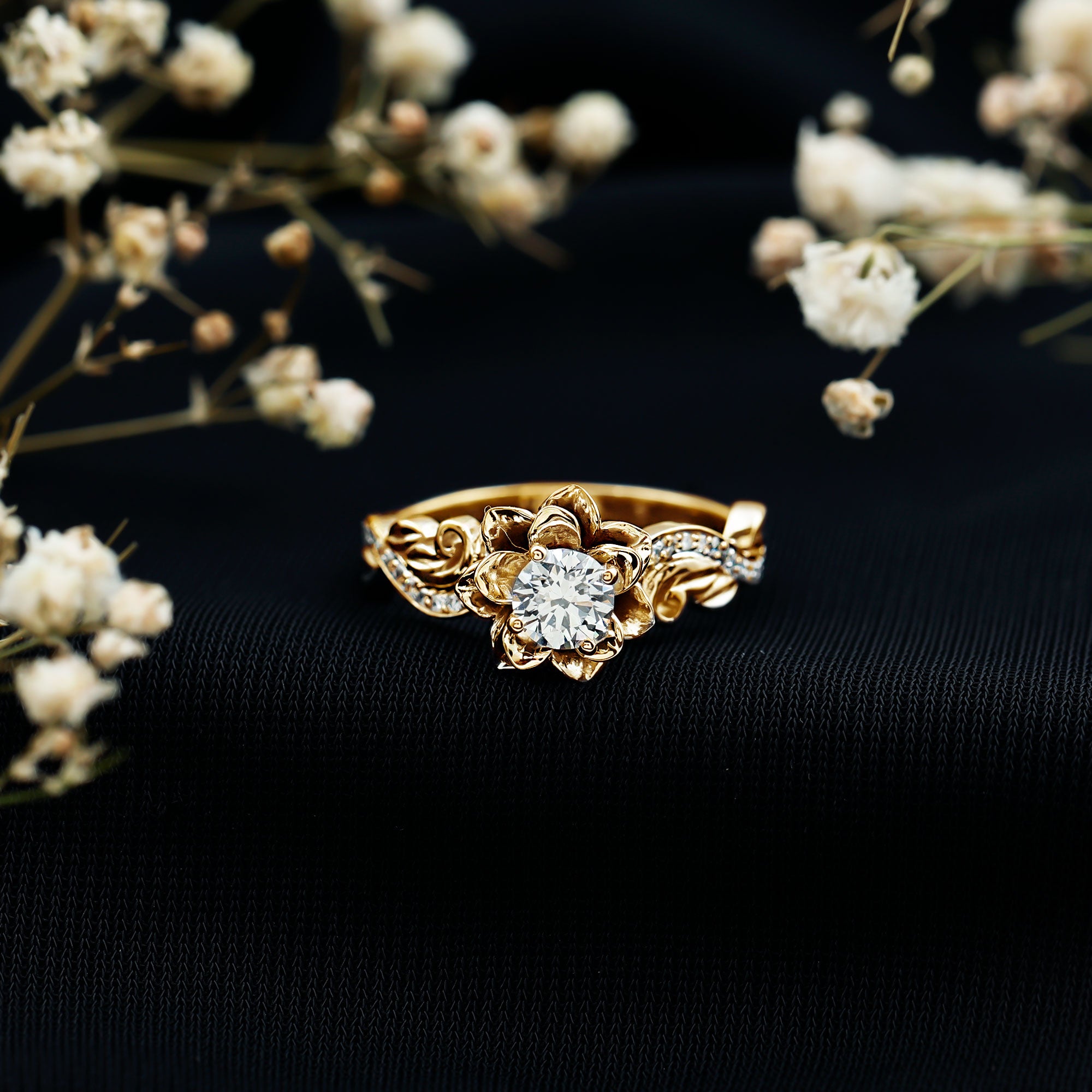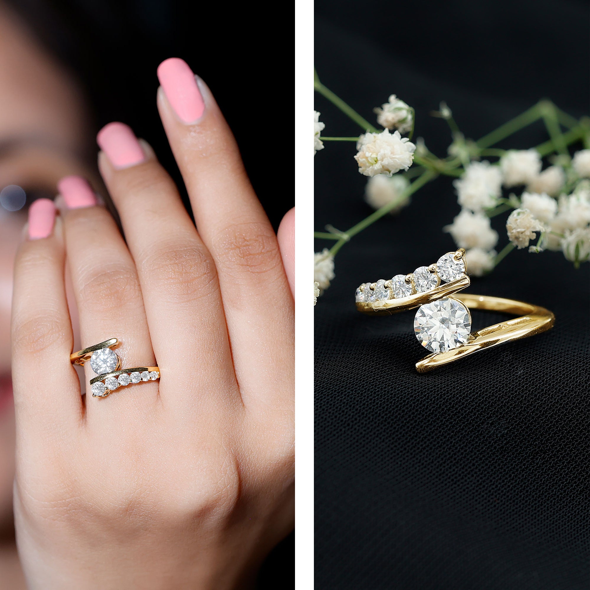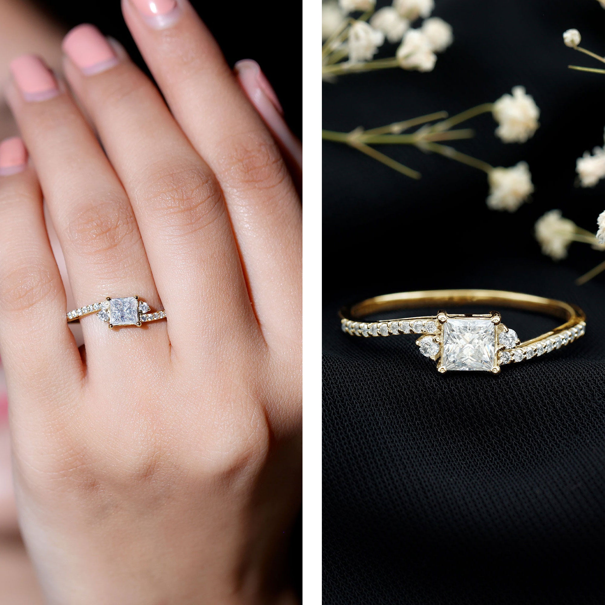 Moissanite and diamond engagement rings share a similar luxurious appearance, but moissanite is known for producing even more fire and colorful sparkle in certain lighting conditions. Many couples choose moissanite because it offers exceptional brilliance while remaining significantly more affordable than traditional diamonds.