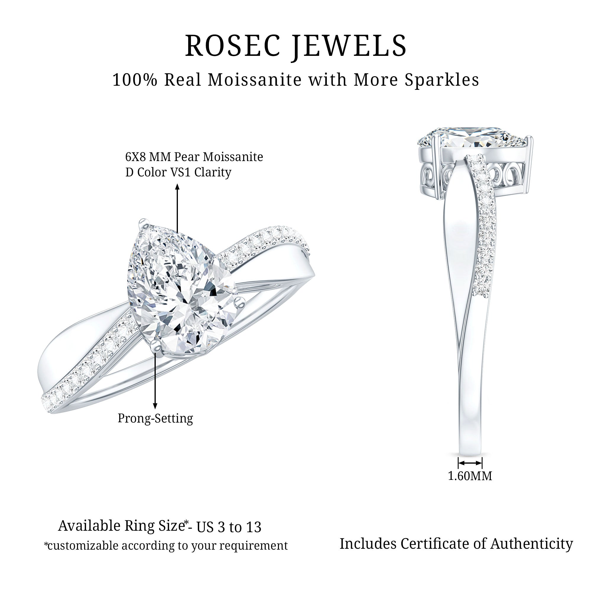 A Moissanite Solitaire Engagement Ring is defined by a Sparkling Centerpiece of Moissanite that is meant to stand out all solo (with an enormous size of 6 MM or more). While it may be the most classic and timeless token of love for any bride-to-be, it also speaks to many senses of style. A Round or Oval Moissanite Engagement Ring resonates with an understated and conventional aesthetic, while one fashioned with a Pear, Marquise, or Princess Cut Moissanite is more on the fancier side of the spectrum. On the other hand, if you wish for a grand yet old-school emblem of love, there is nothing better than an Asscher, Emerald, or Cushion Cut Moissanite.