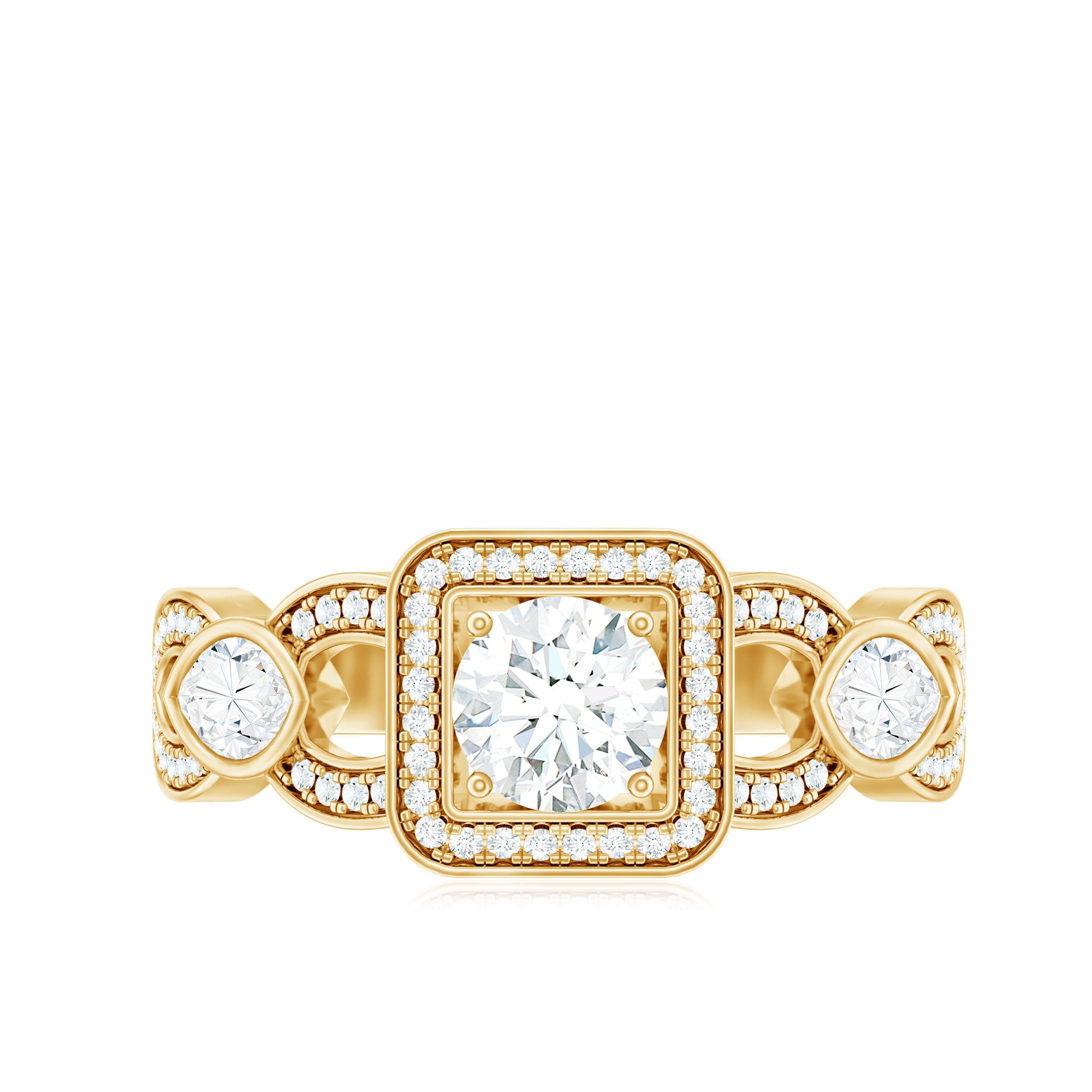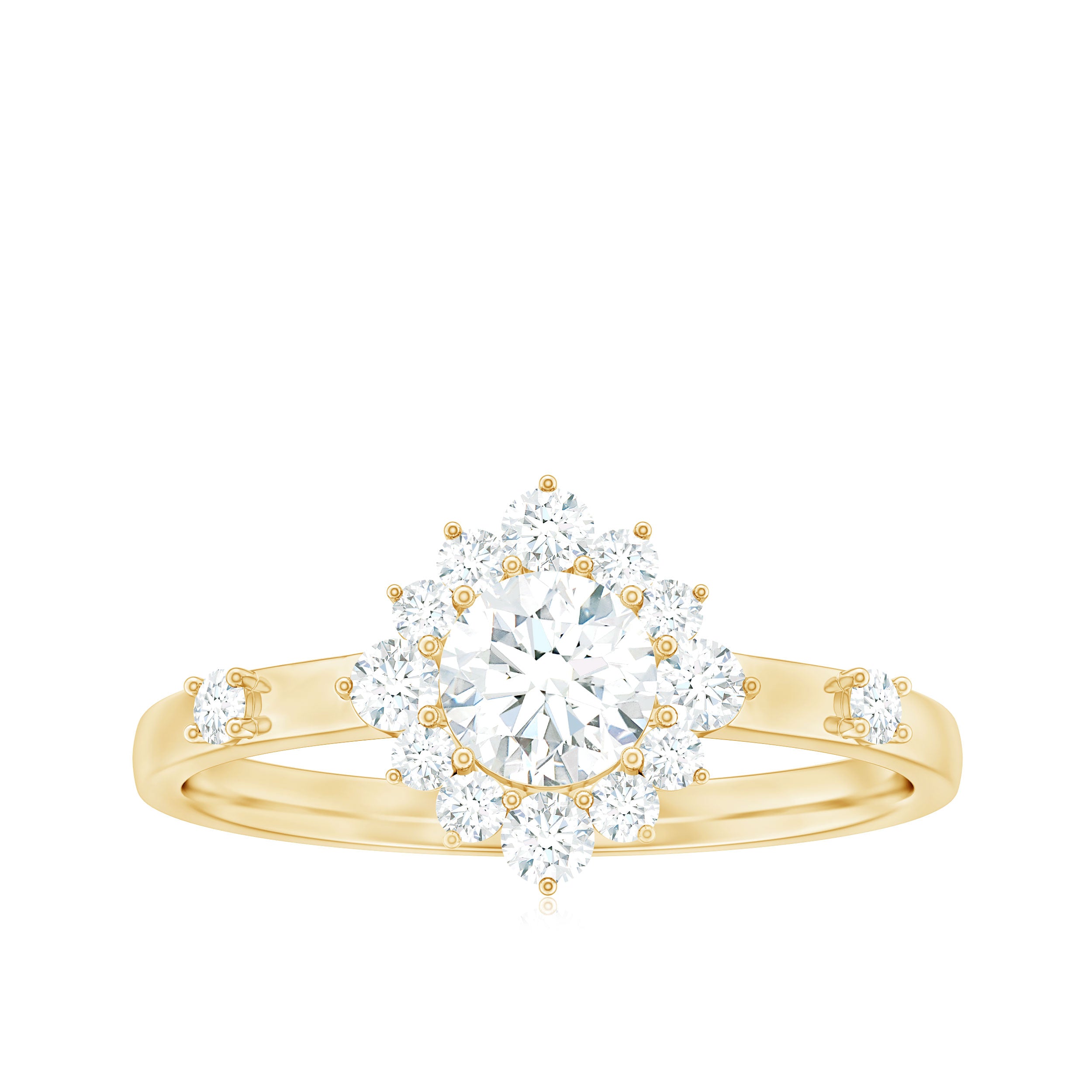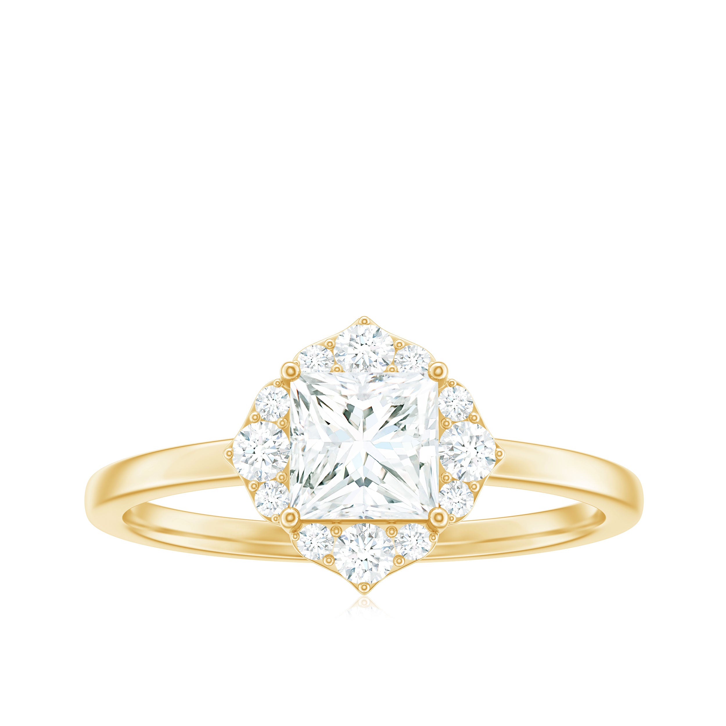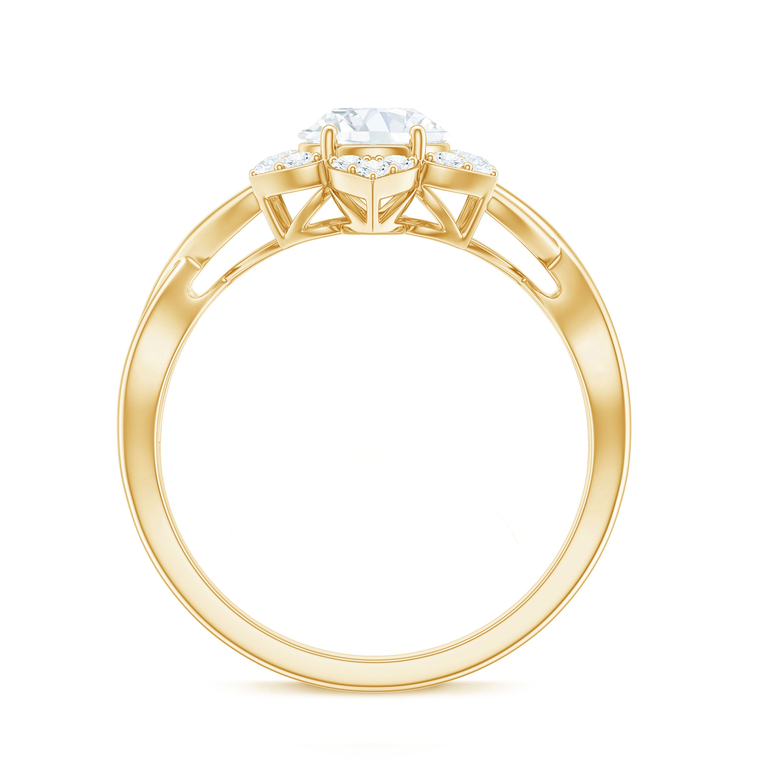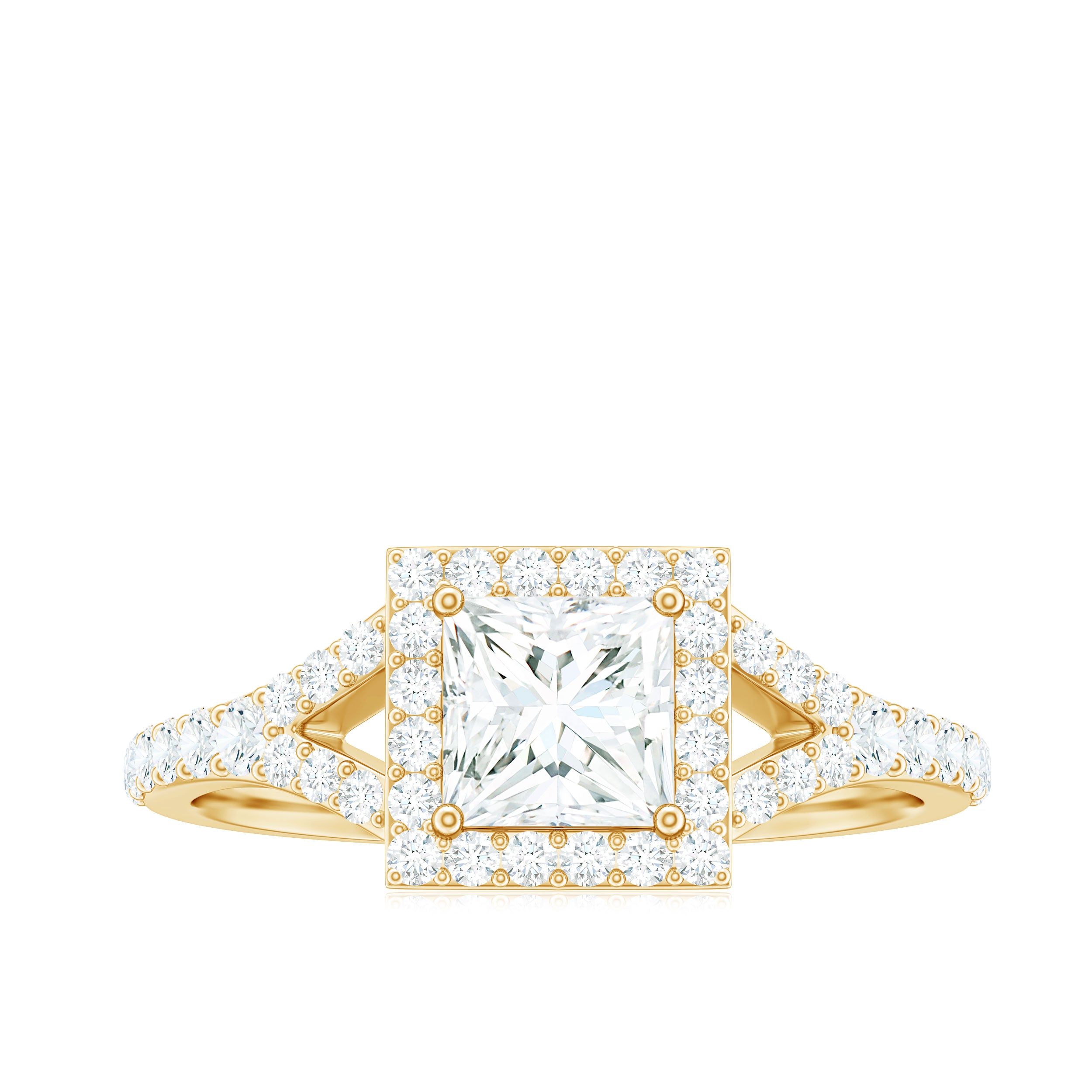 Halo moissanite rings: One center moissanite piece is surrounded by small accent moissanite, which is a halo moissanite setting. Halo gemstone settings are more affordable than gemstone solitaire rings, in case of the same total carat weight, and look similar. the side moissanite in yellow gold moissanite rings creates the illusion of a bigger gemstone.