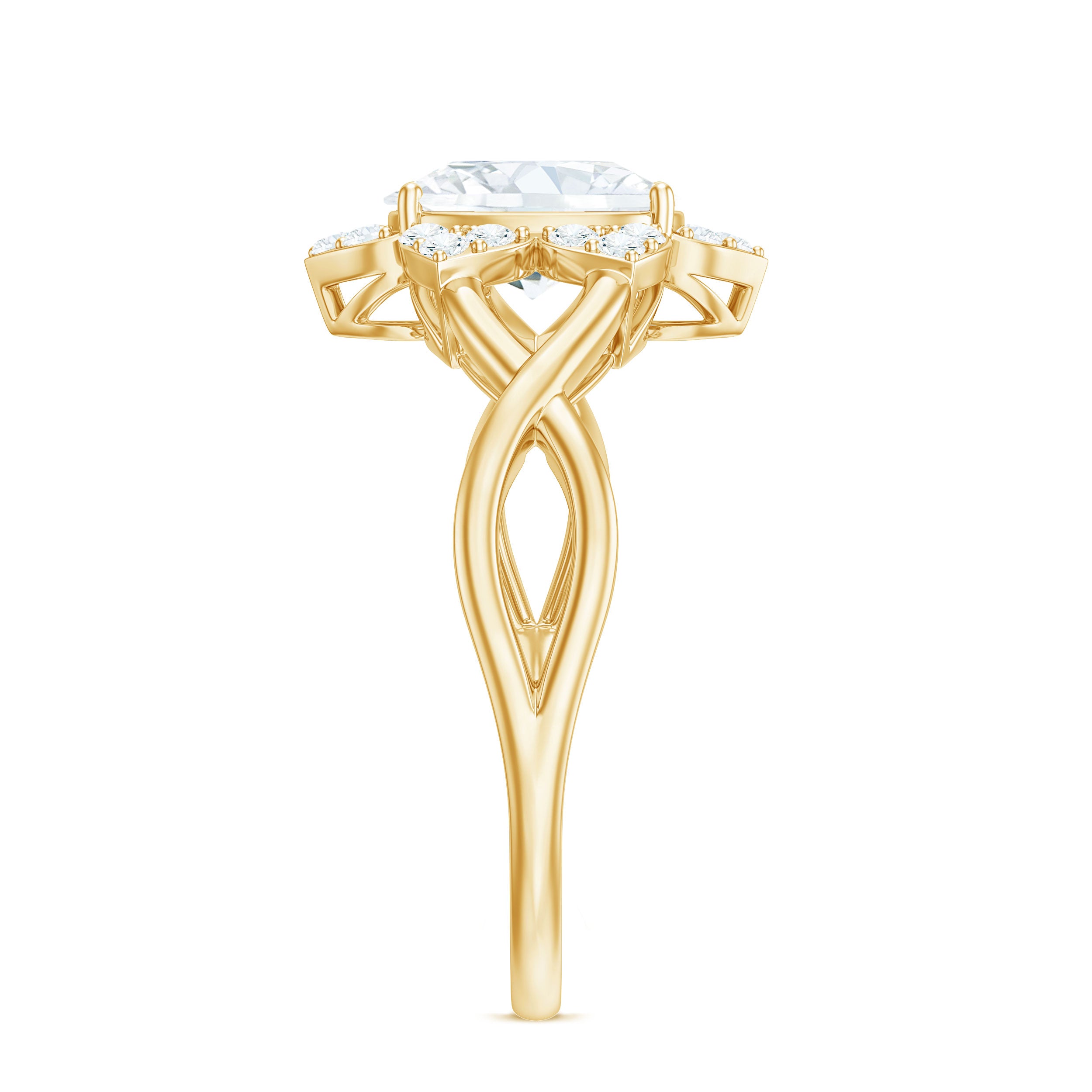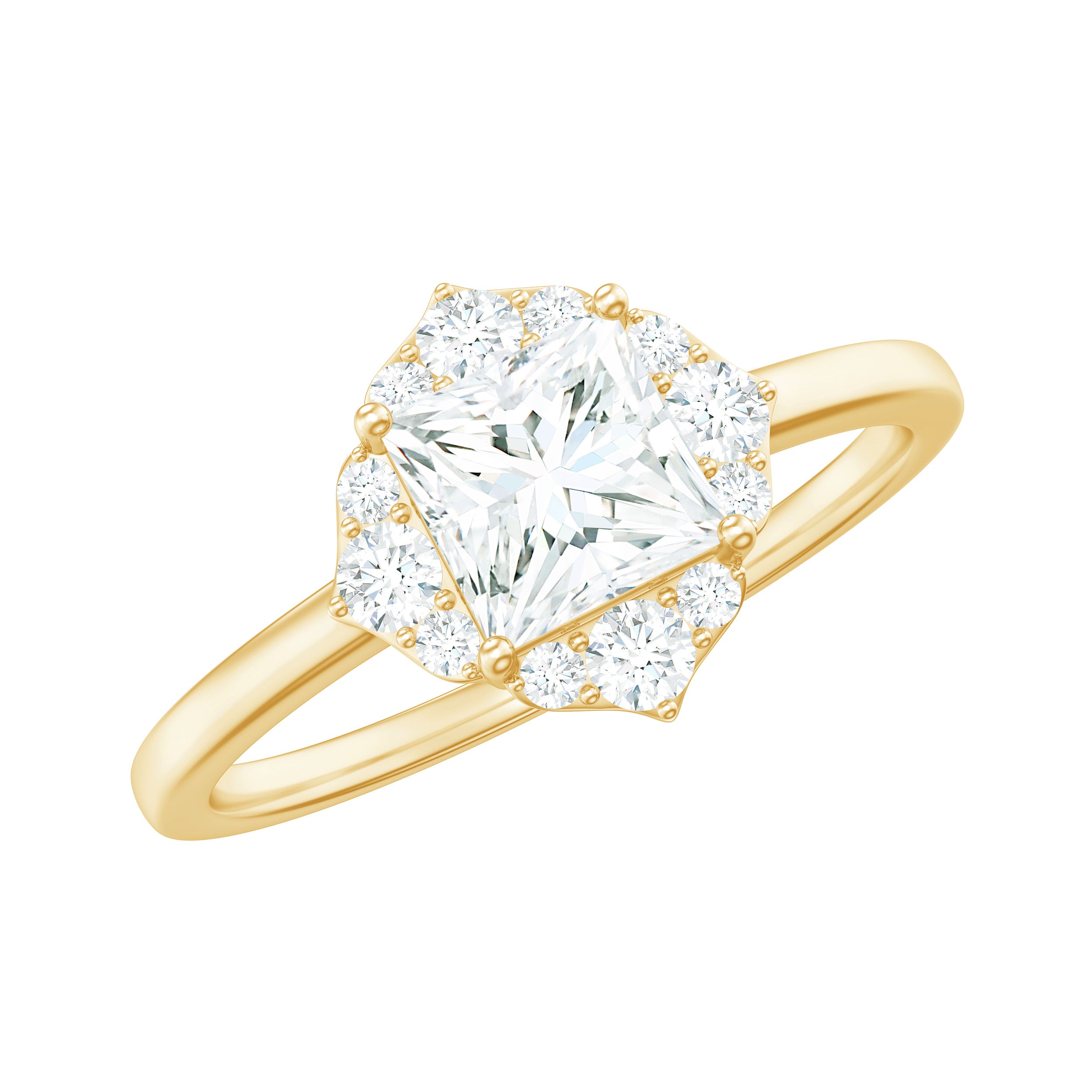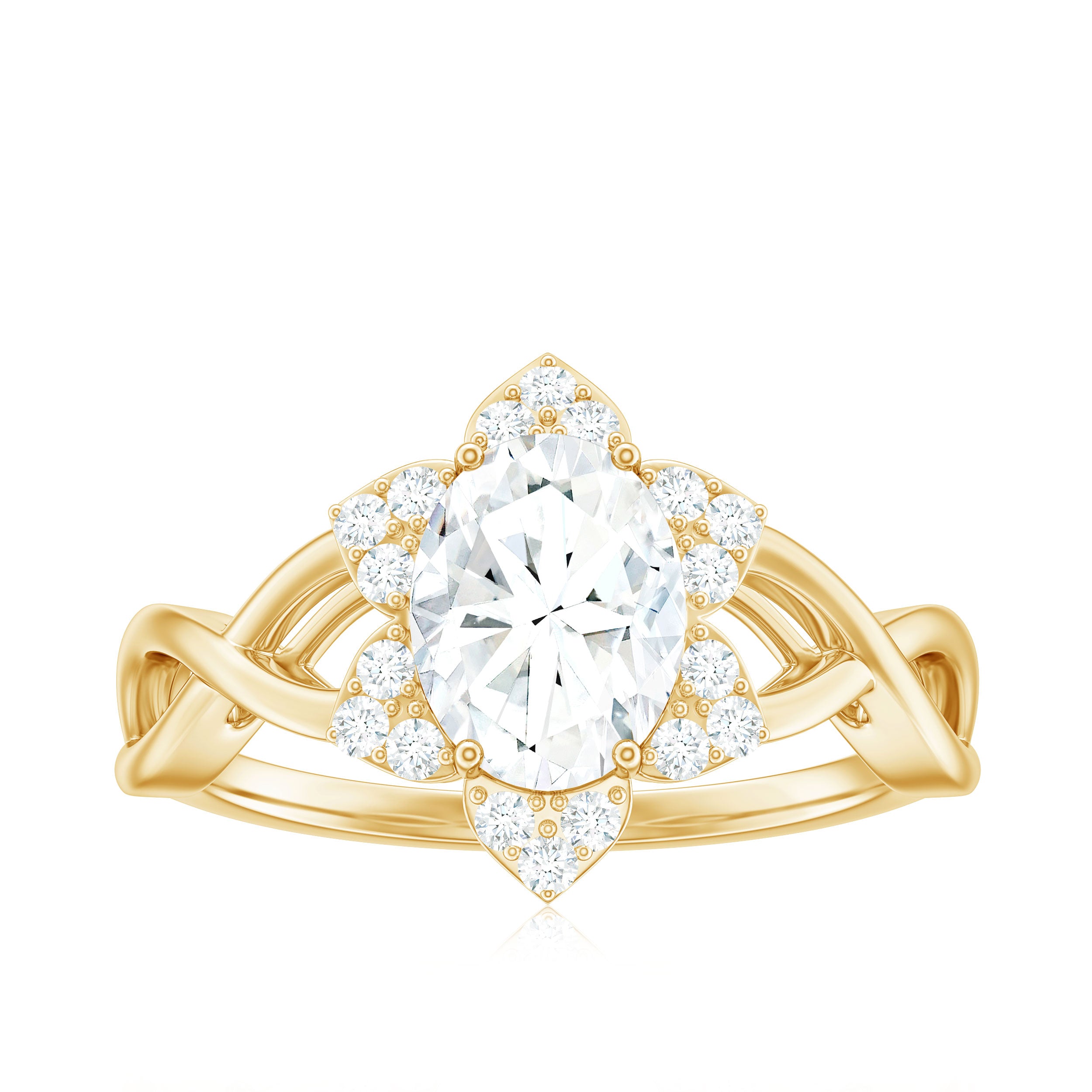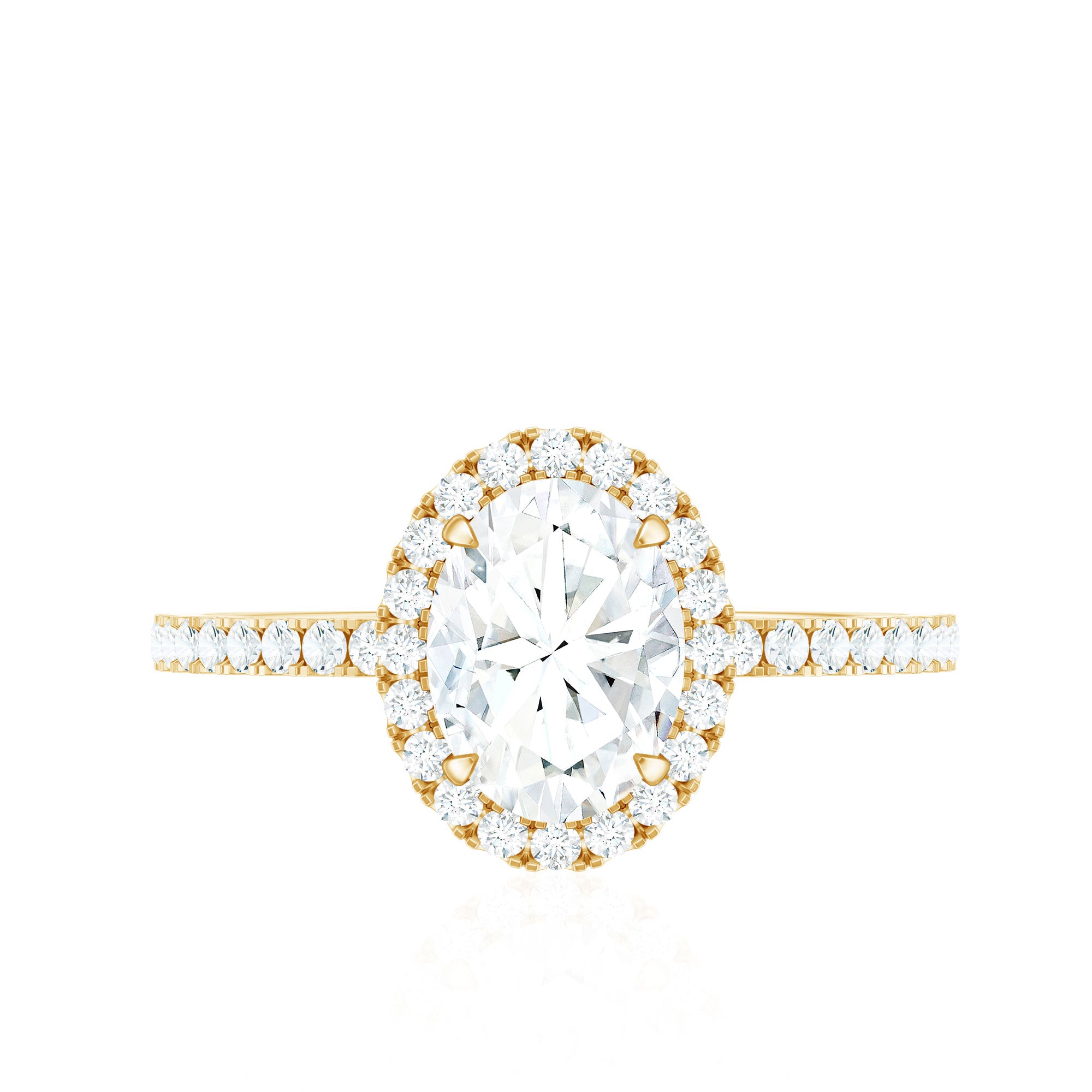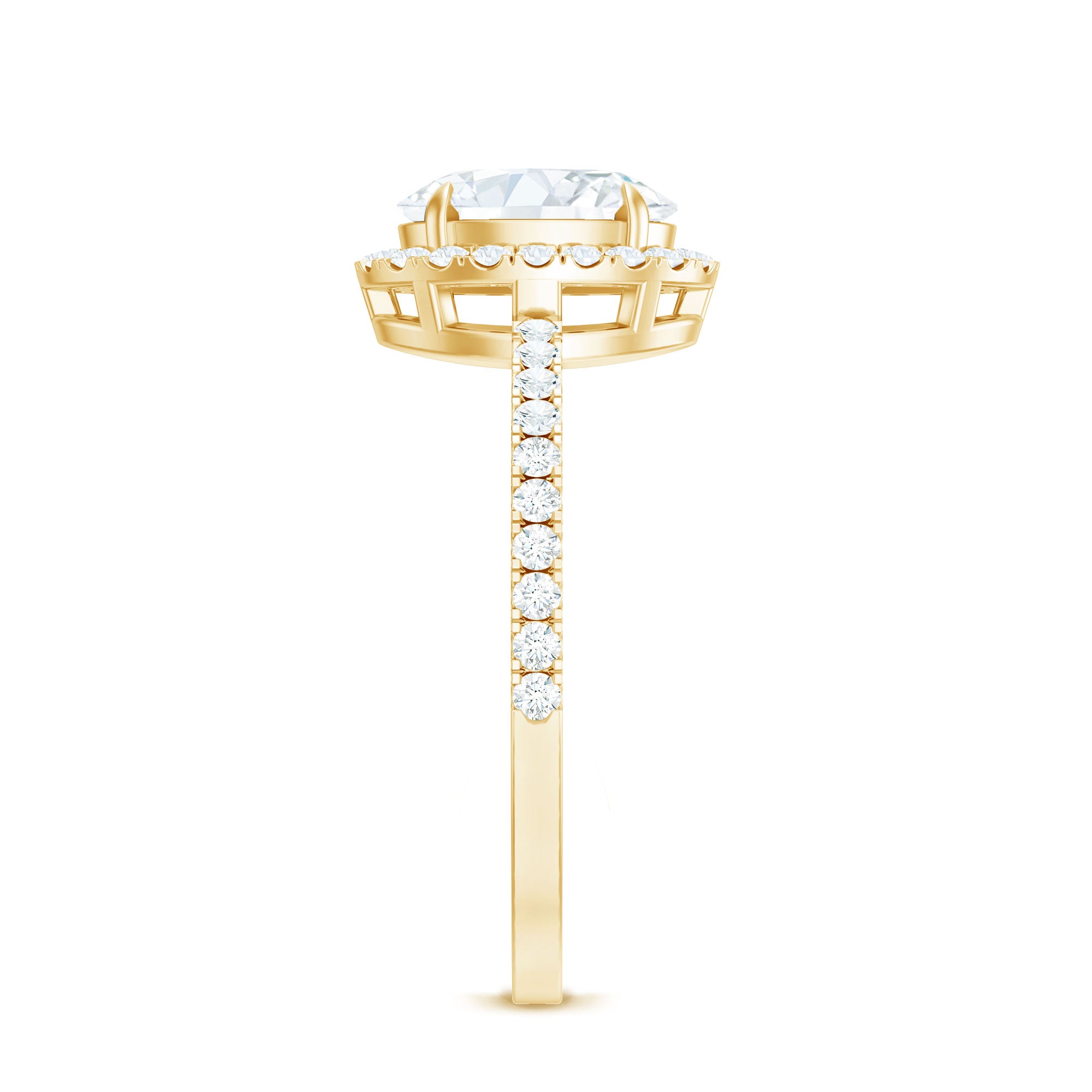 Halo moissanite rings: One center moissanite piece is surrounded by small accent moissanite, which is a halo moissanite setting. Halo gemstone settings are more affordable than gemstone solitaire rings, in case of the same total carat weight, and look similar. the side moissanite in yellow gold moissanite rings creates the illusion of a bigger gemstone.