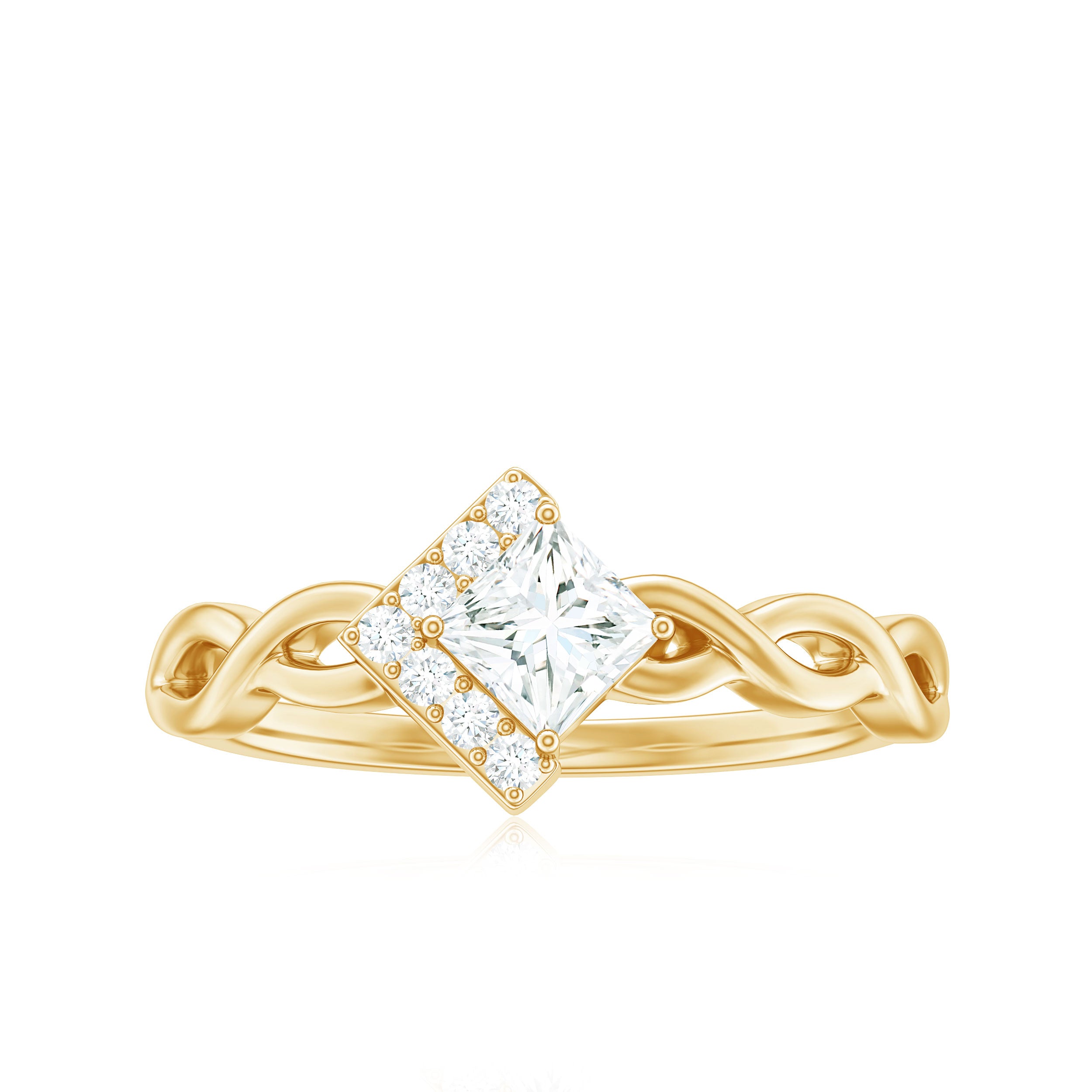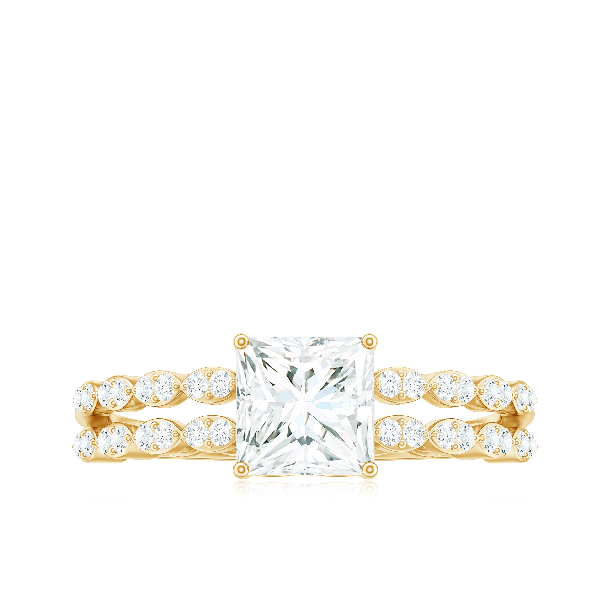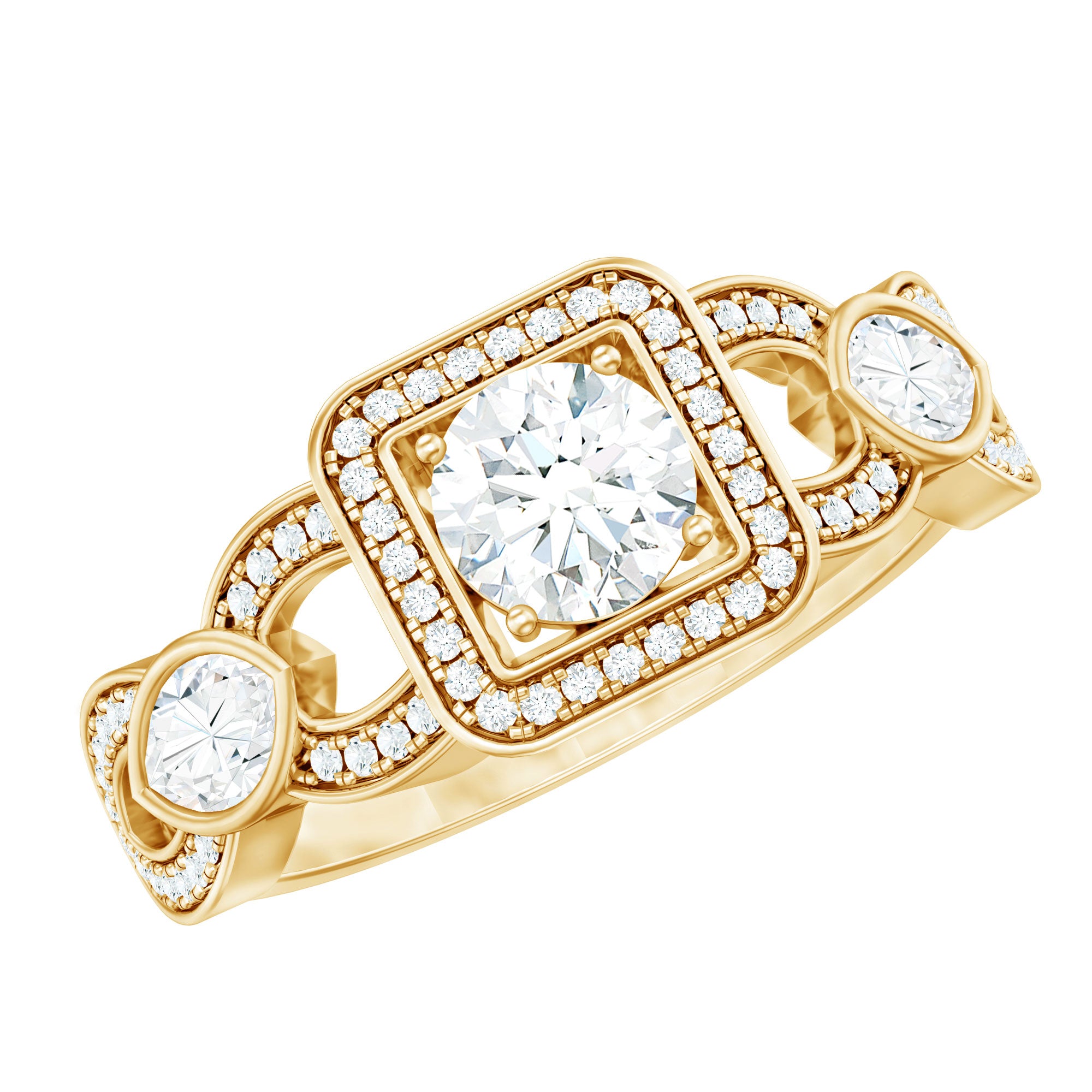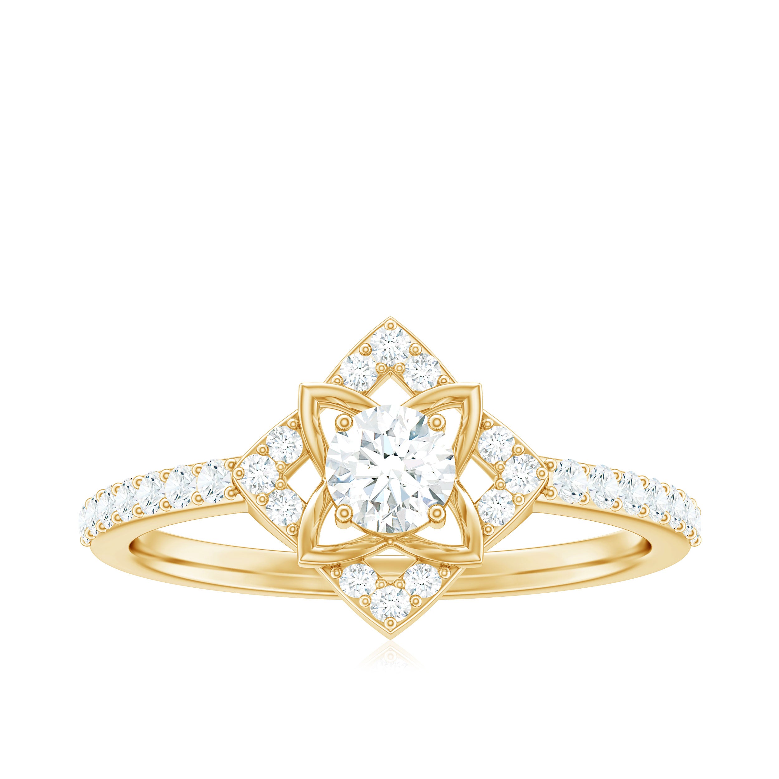 Halo moissanite rings: One center moissanite piece is surrounded by small accent moissanite, which is a halo moissanite setting. Halo gemstone settings are more affordable than gemstone solitaire rings, in case of the same total carat weight, and look similar. the side moissanite in yellow gold moissanite rings creates the illusion of a bigger gemstone.