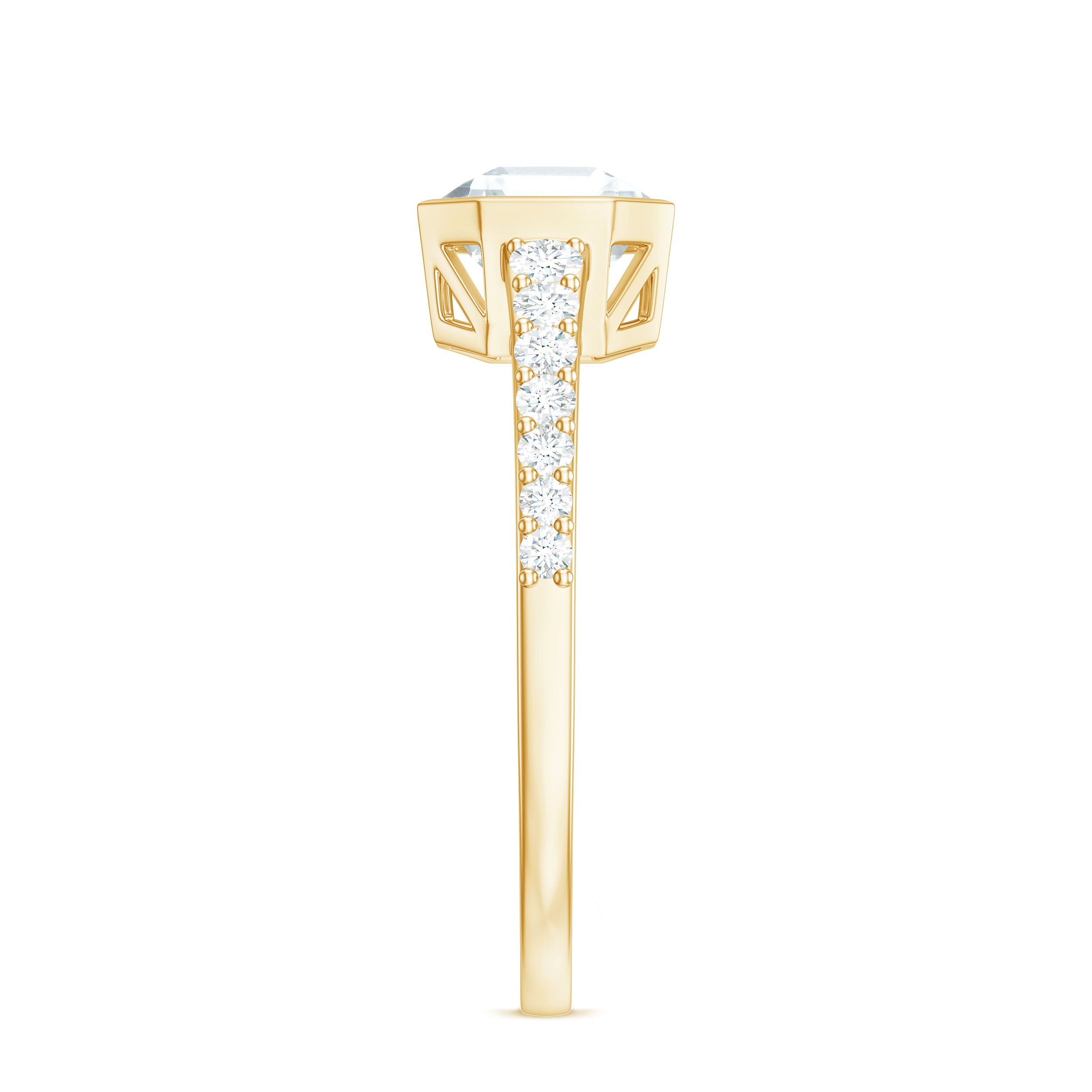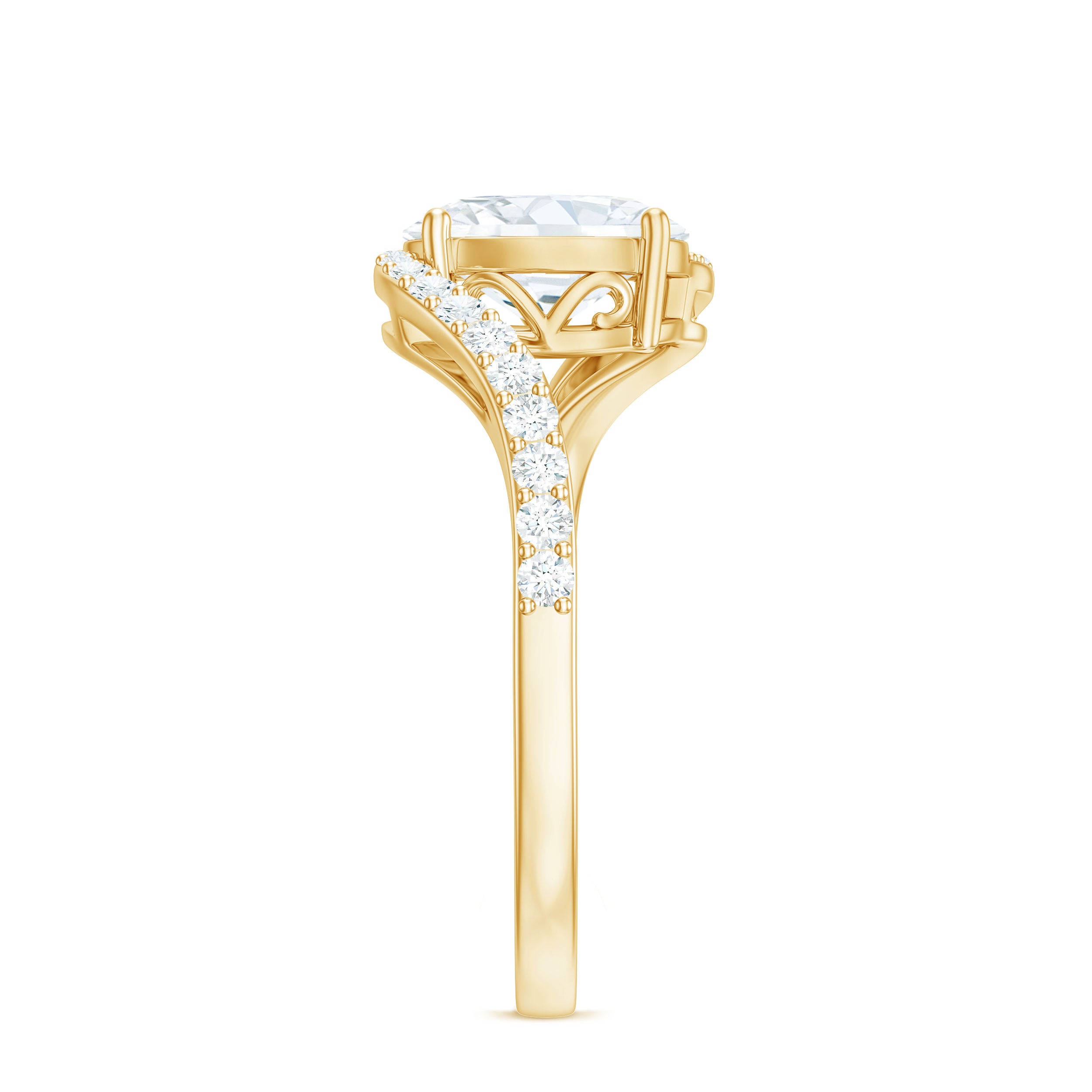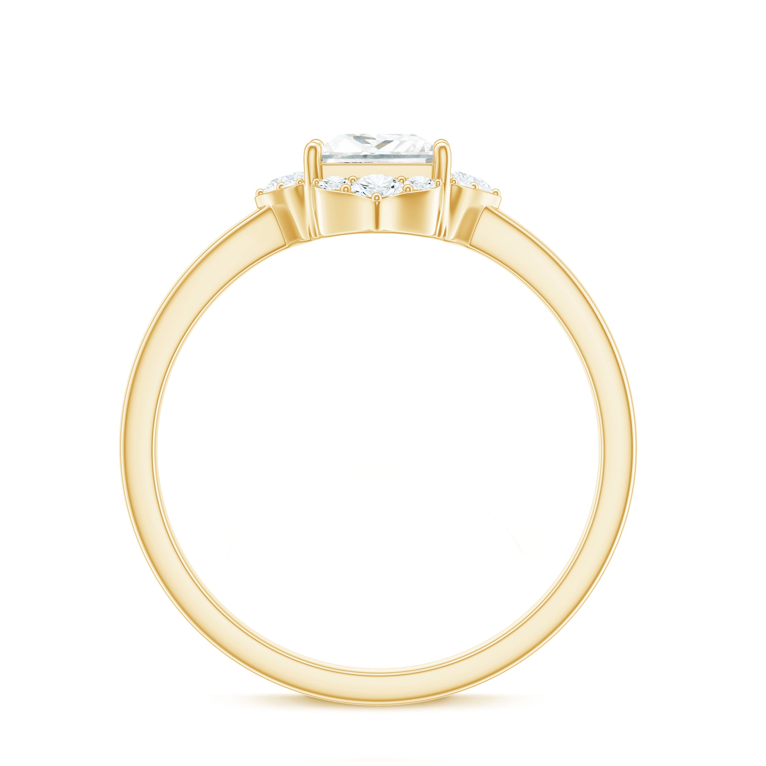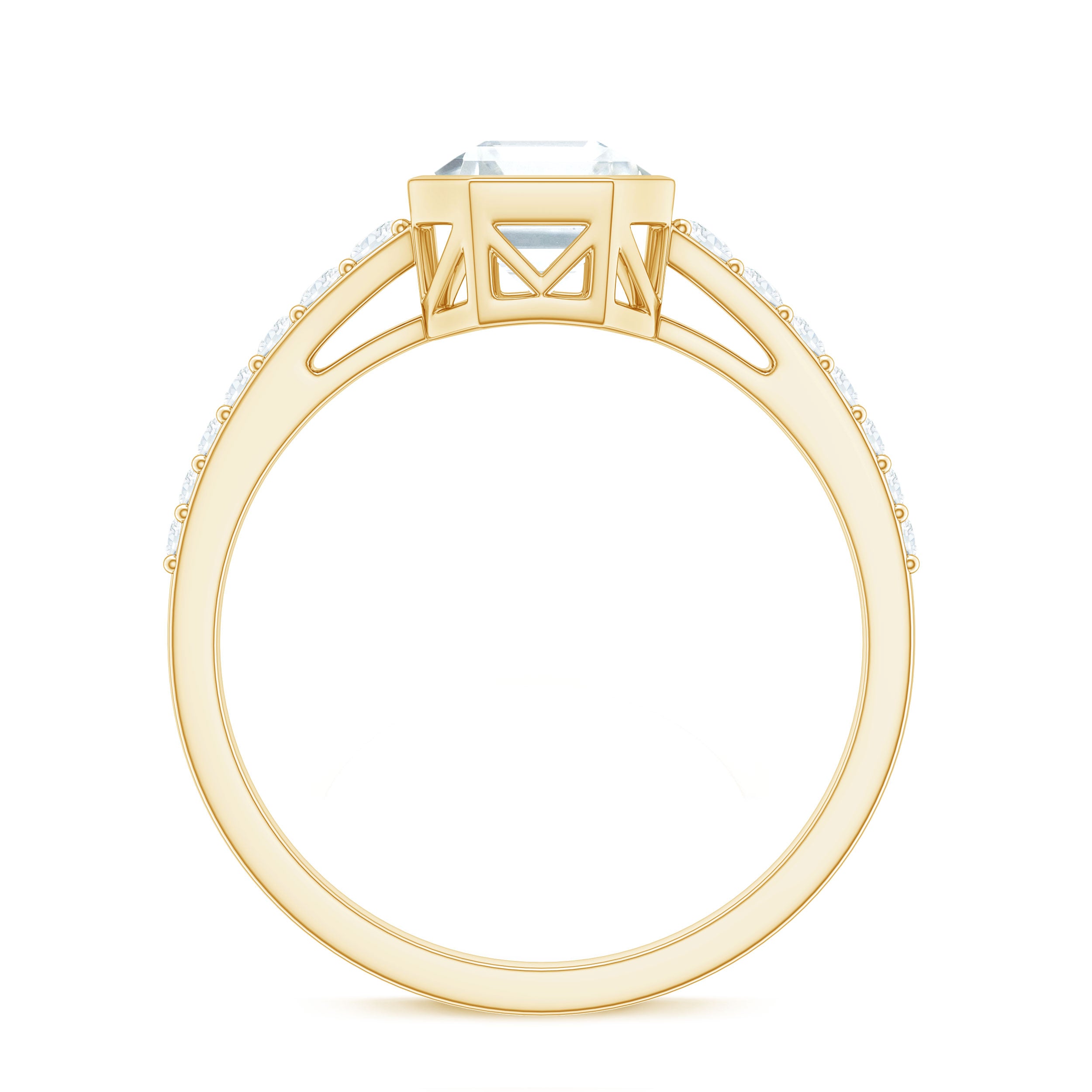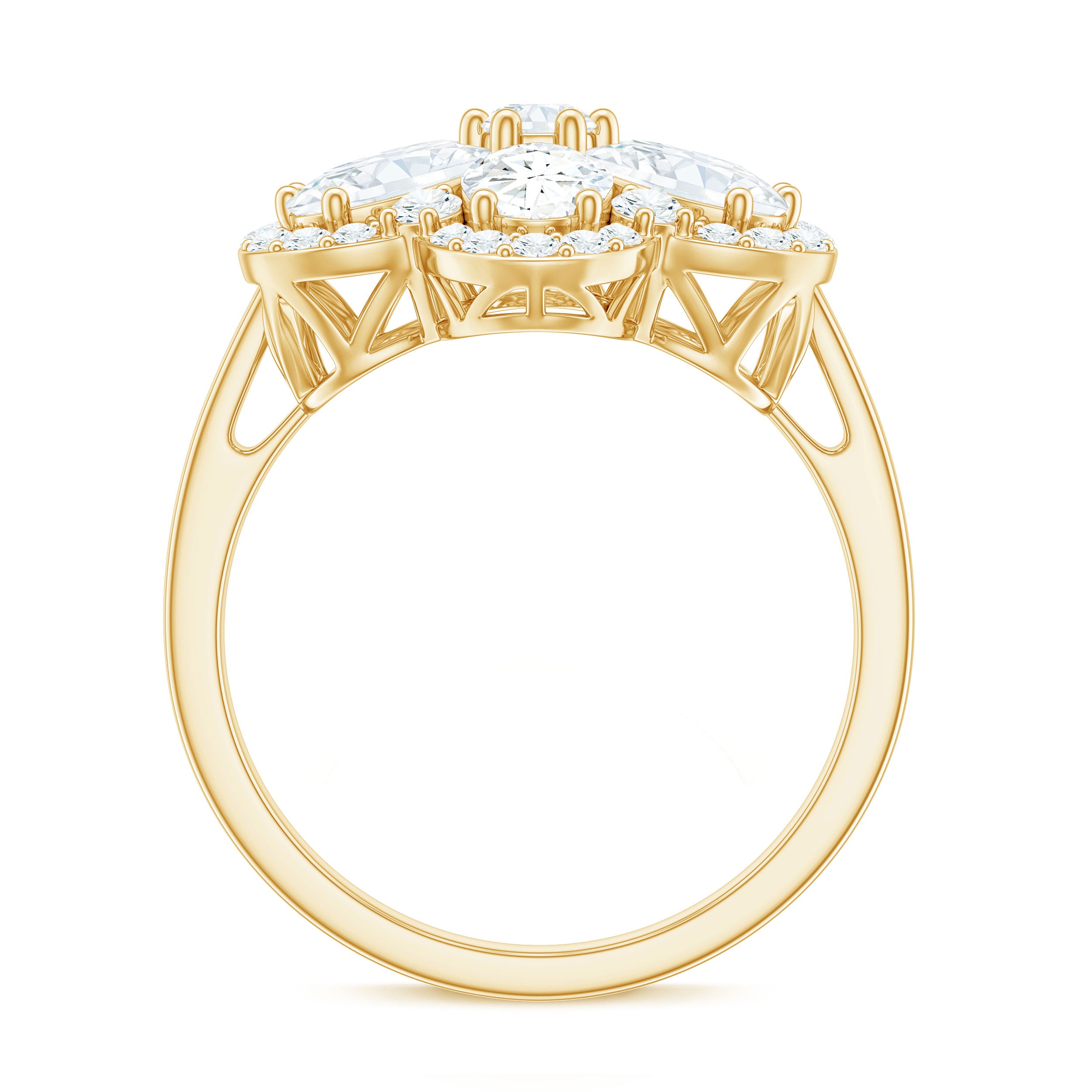 Halo moissanite rings: One center moissanite piece is surrounded by small accent moissanite, which is a halo moissanite setting. Halo gemstone settings are more affordable than gemstone solitaire rings, in case of the same total carat weight, and look similar. the side moissanite in yellow gold moissanite rings creates the illusion of a bigger gemstone.