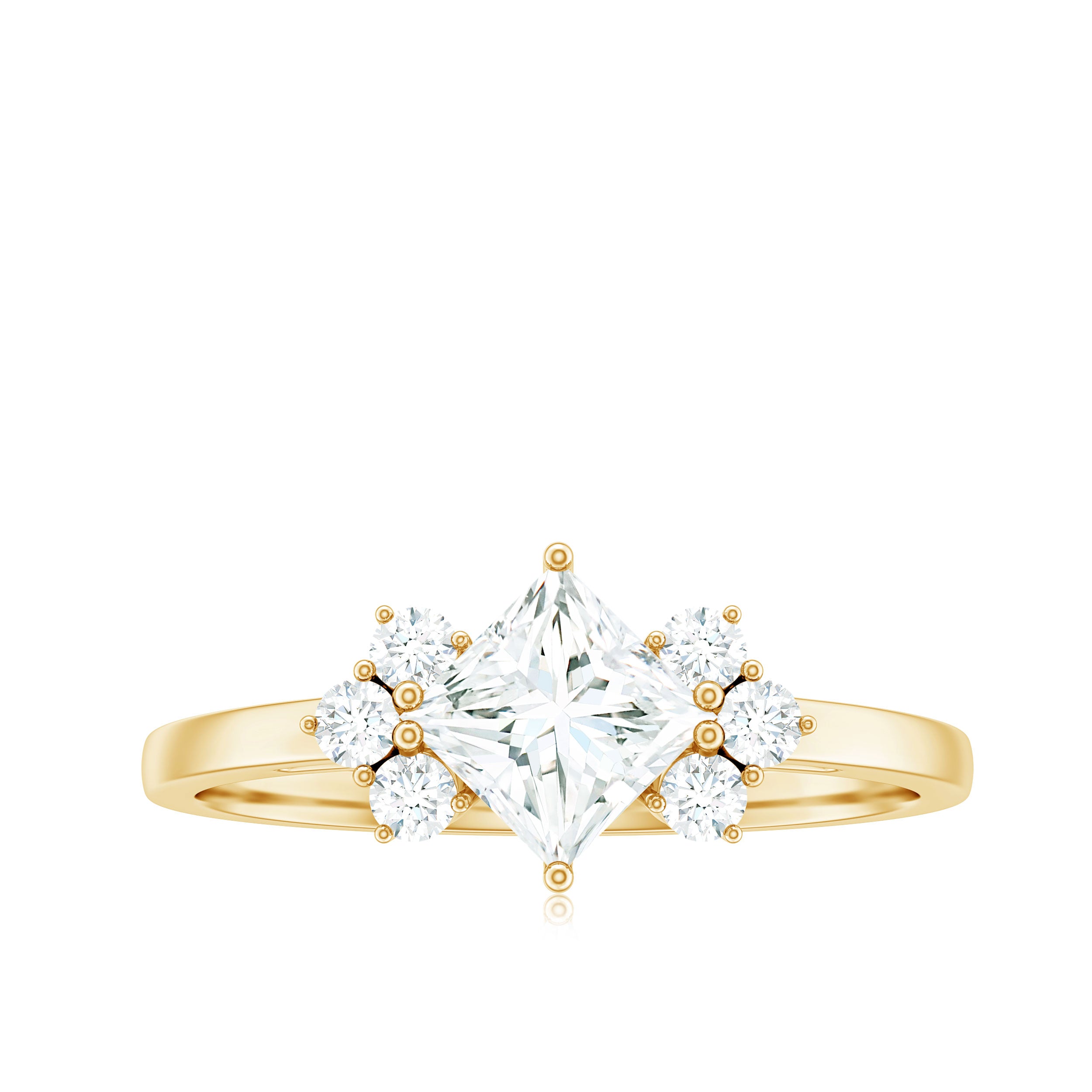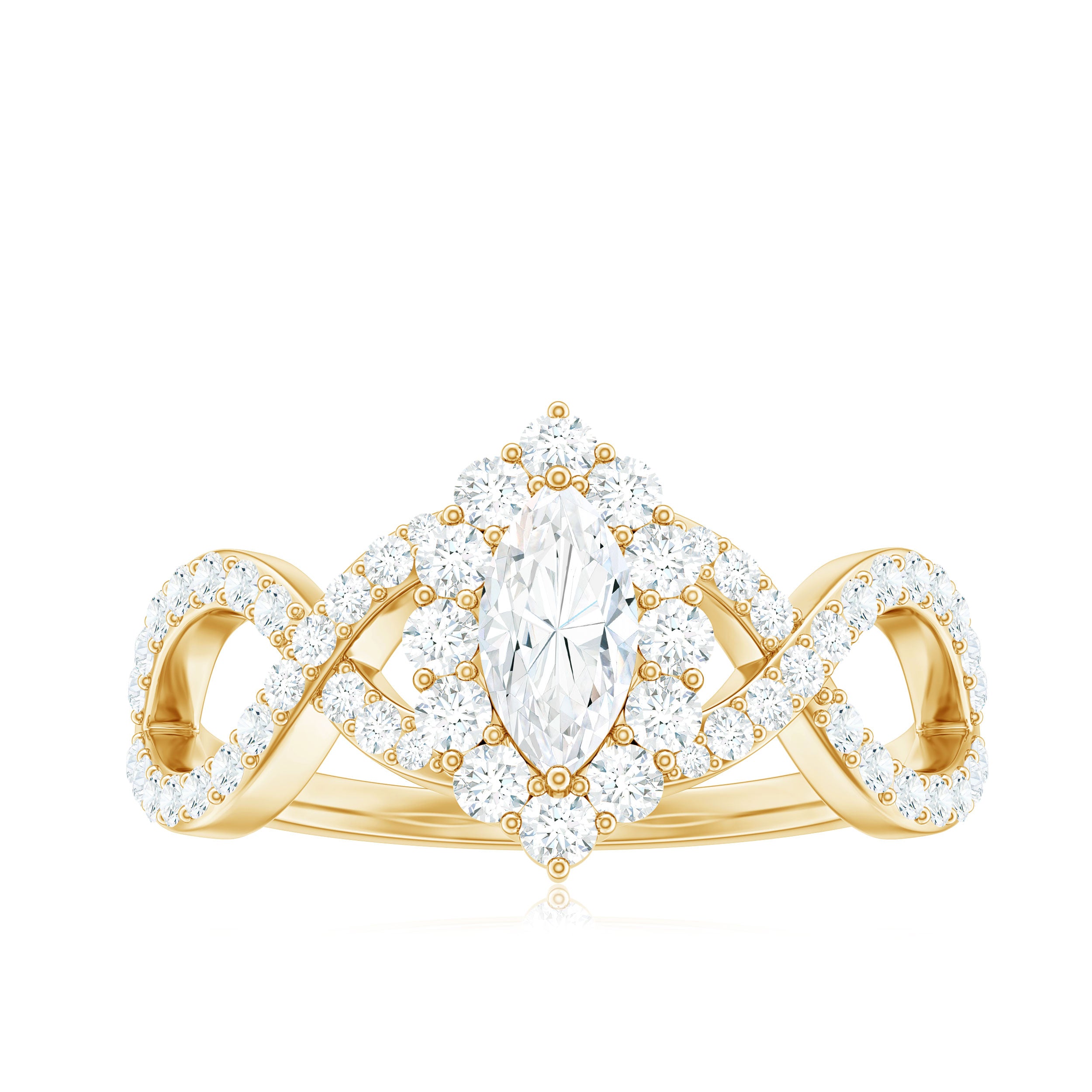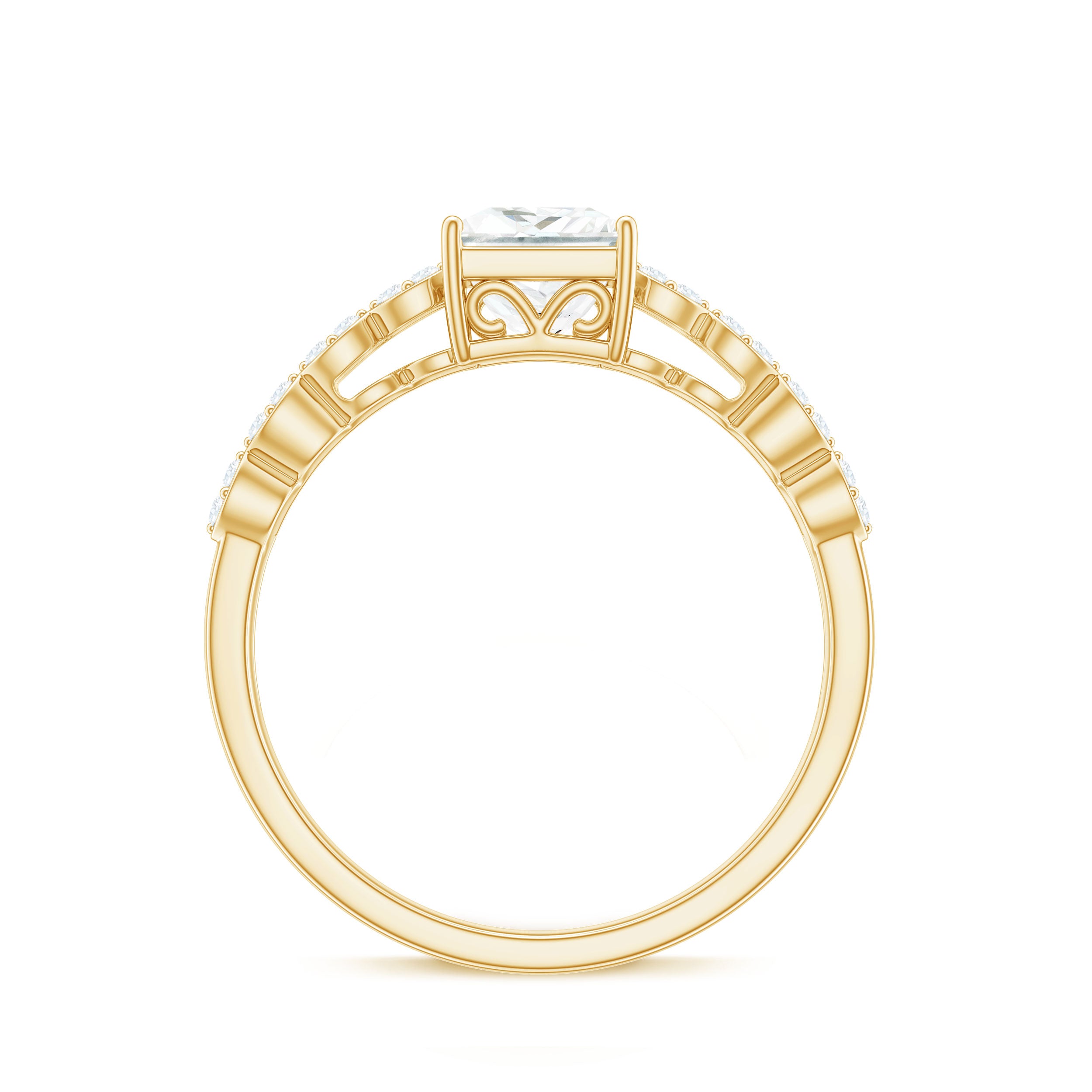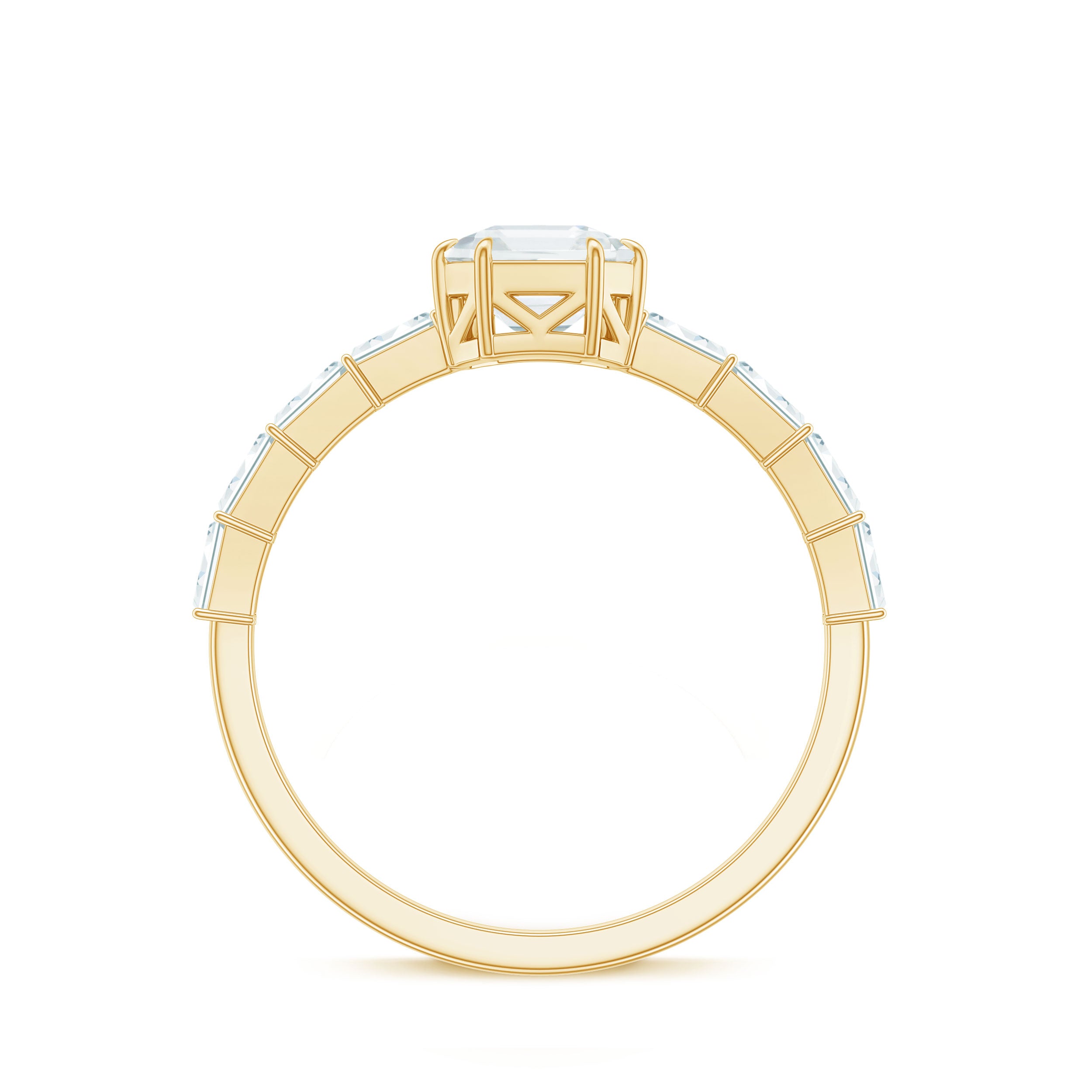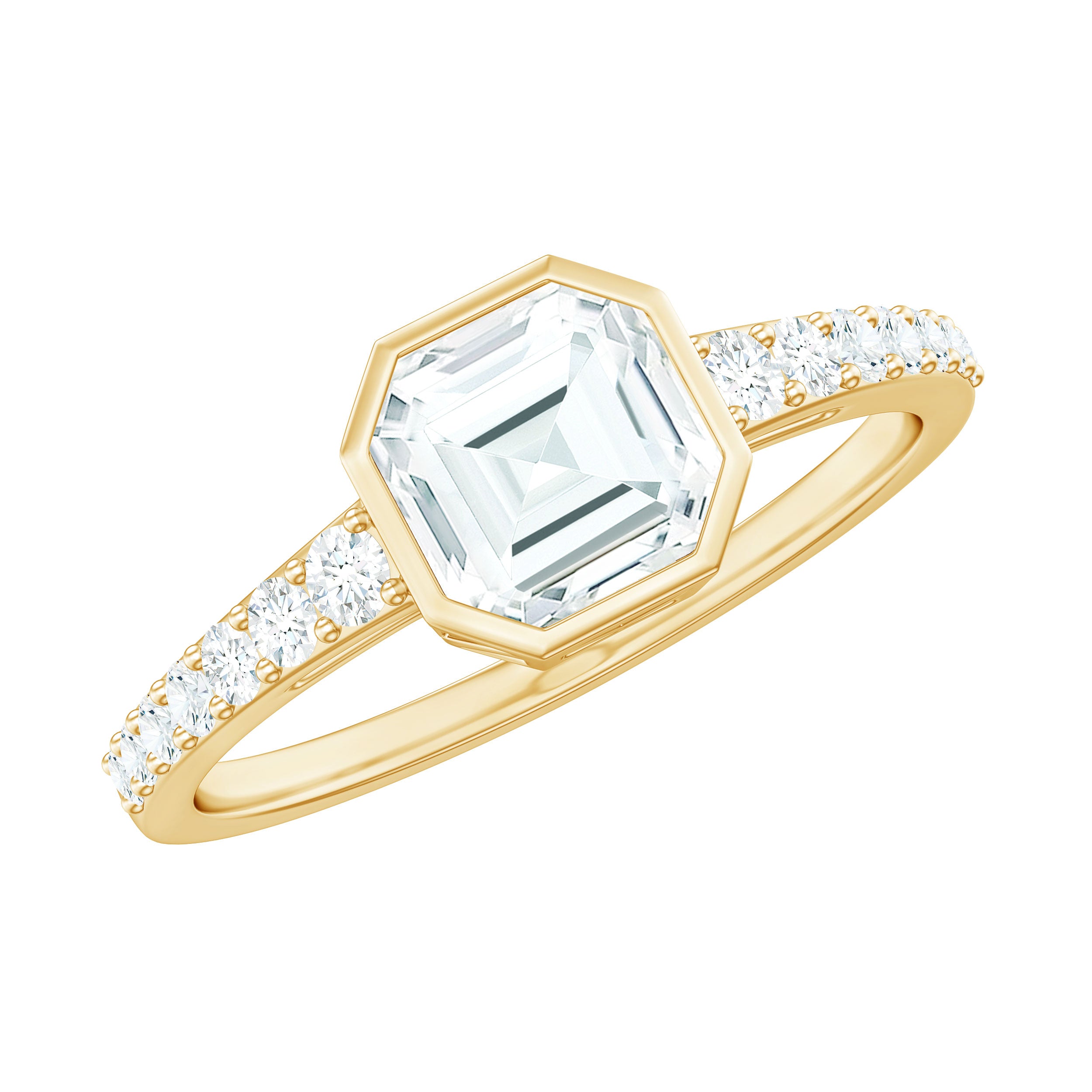 Halo moissanite rings: One center moissanite piece is surrounded by small accent moissanite, which is a halo moissanite setting. Halo gemstone settings are more affordable than gemstone solitaire rings, in case of the same total carat weight, and look similar. the side moissanite in yellow gold moissanite rings creates the illusion of a bigger gemstone.