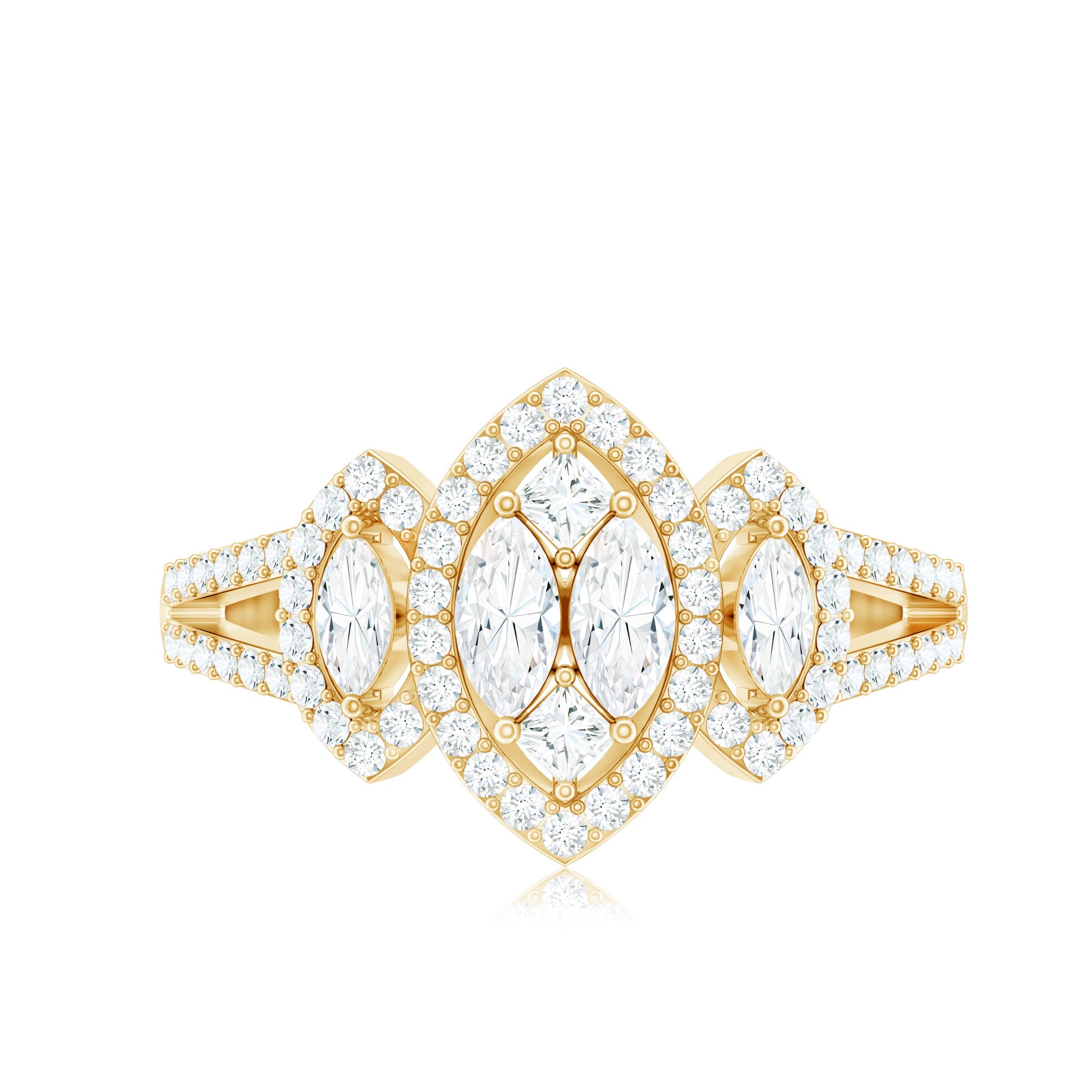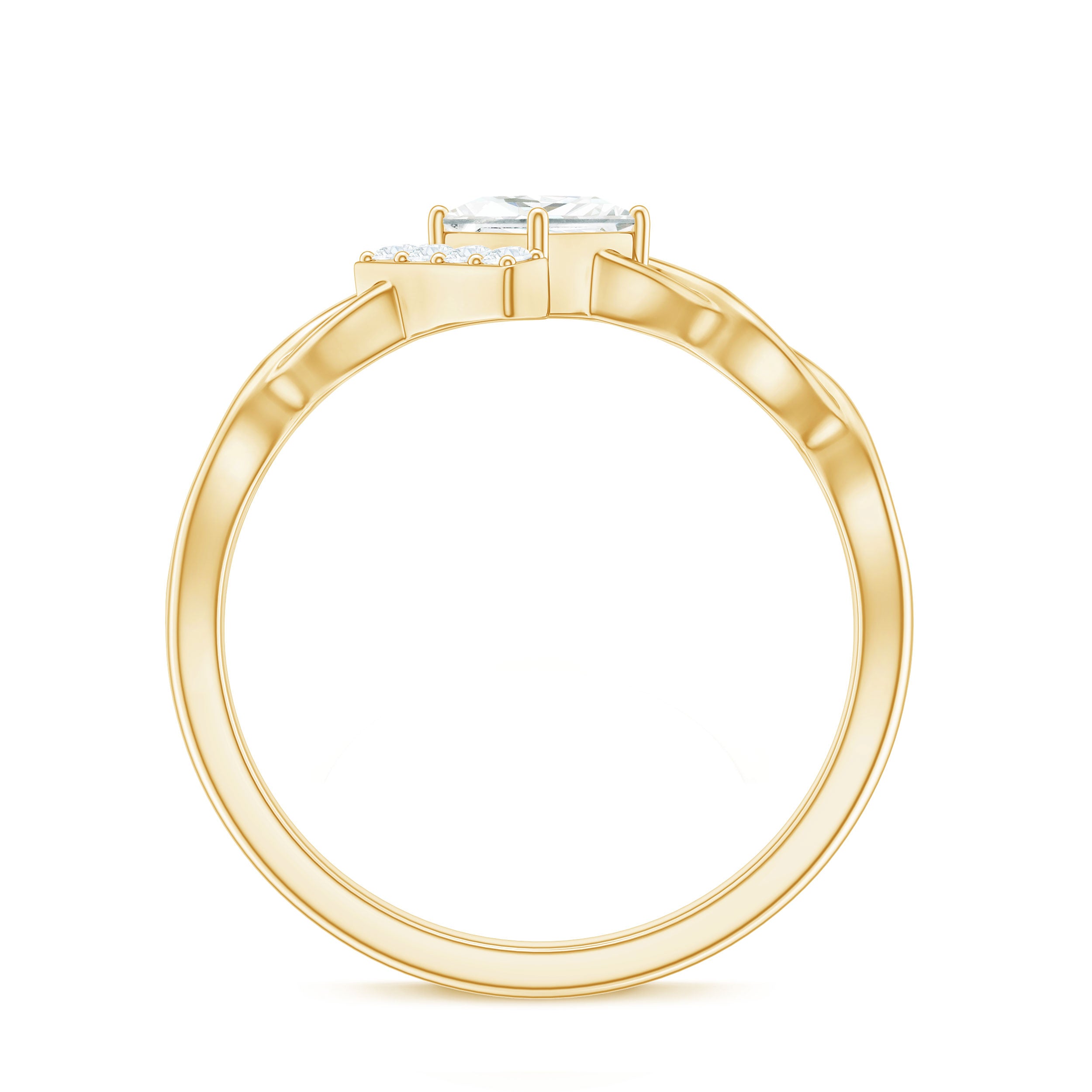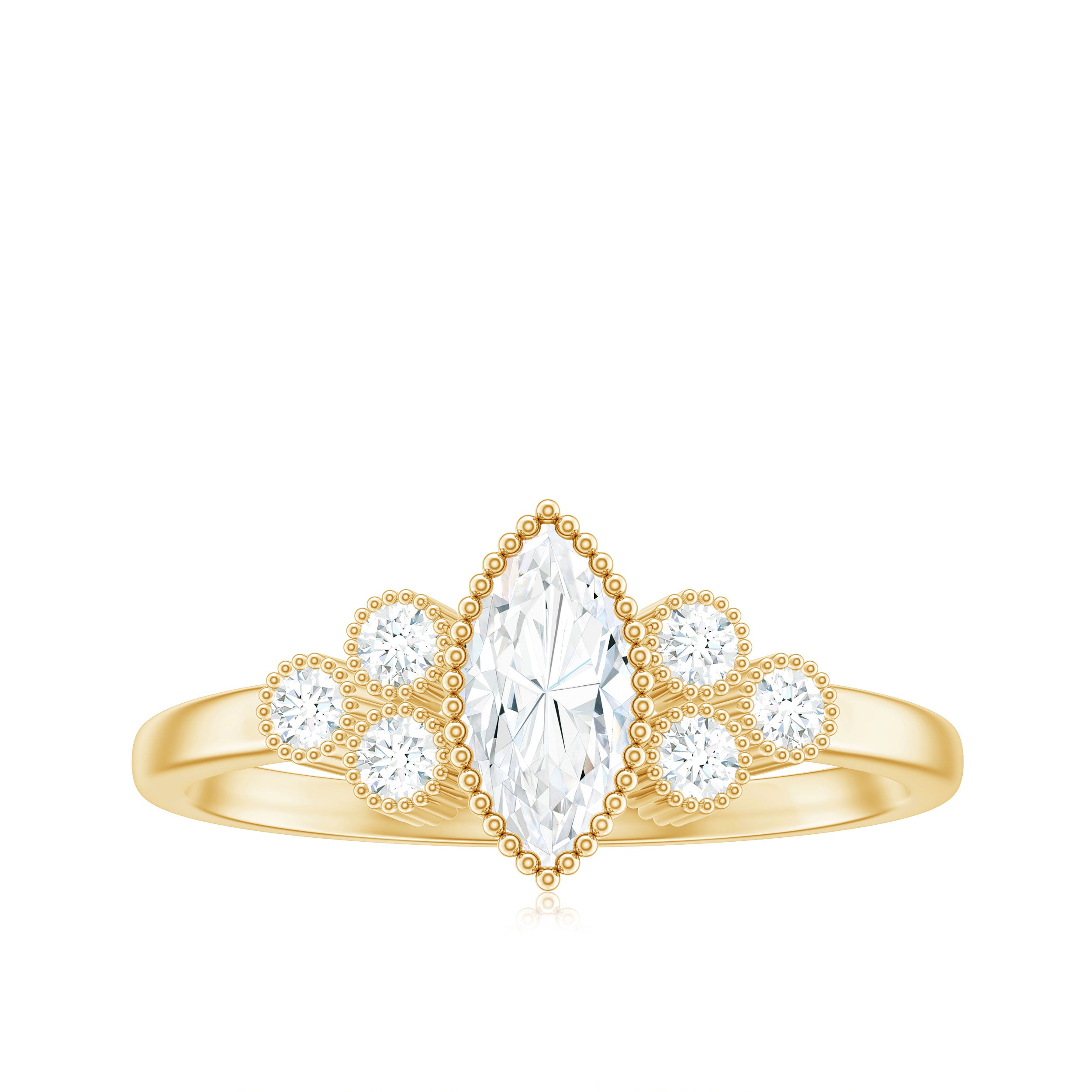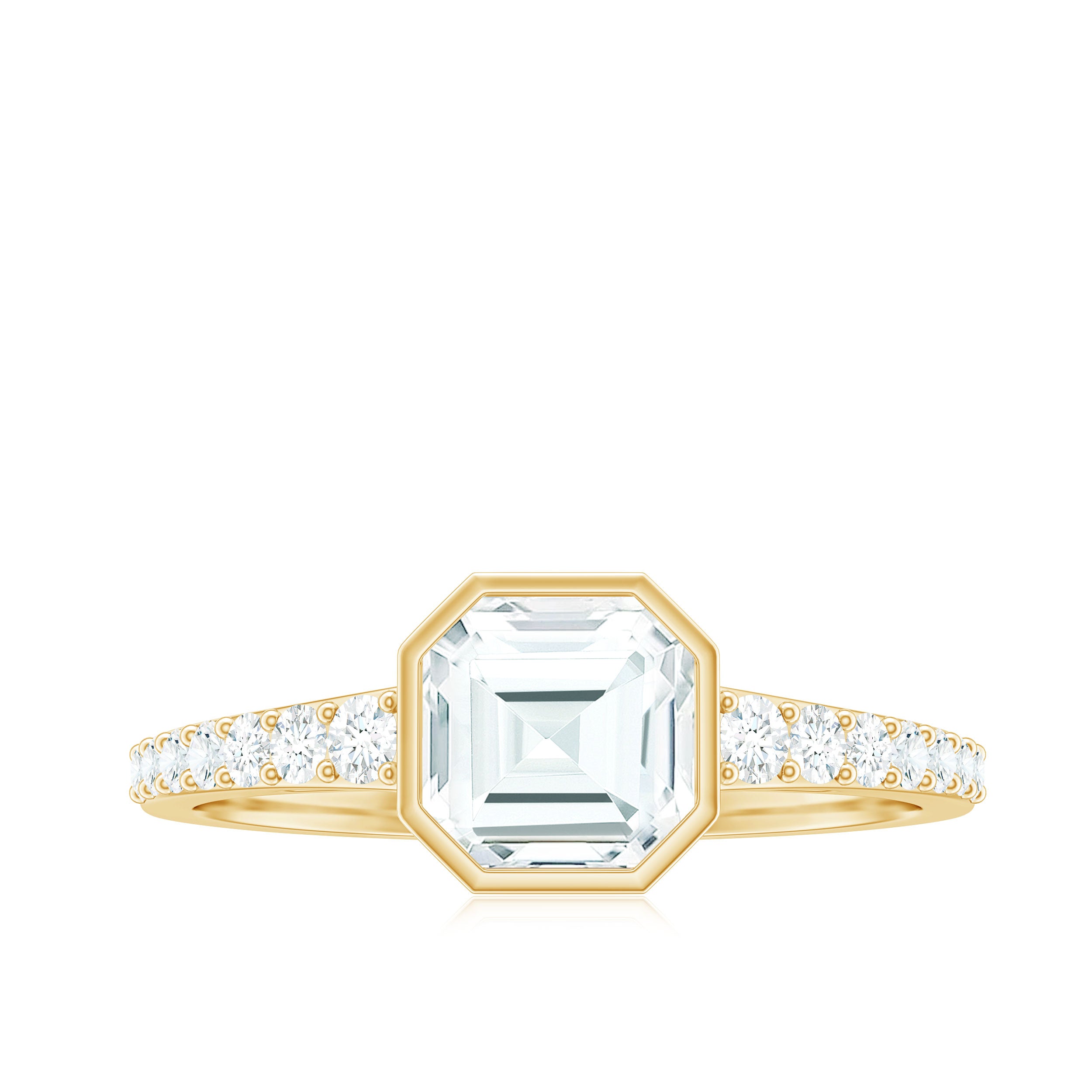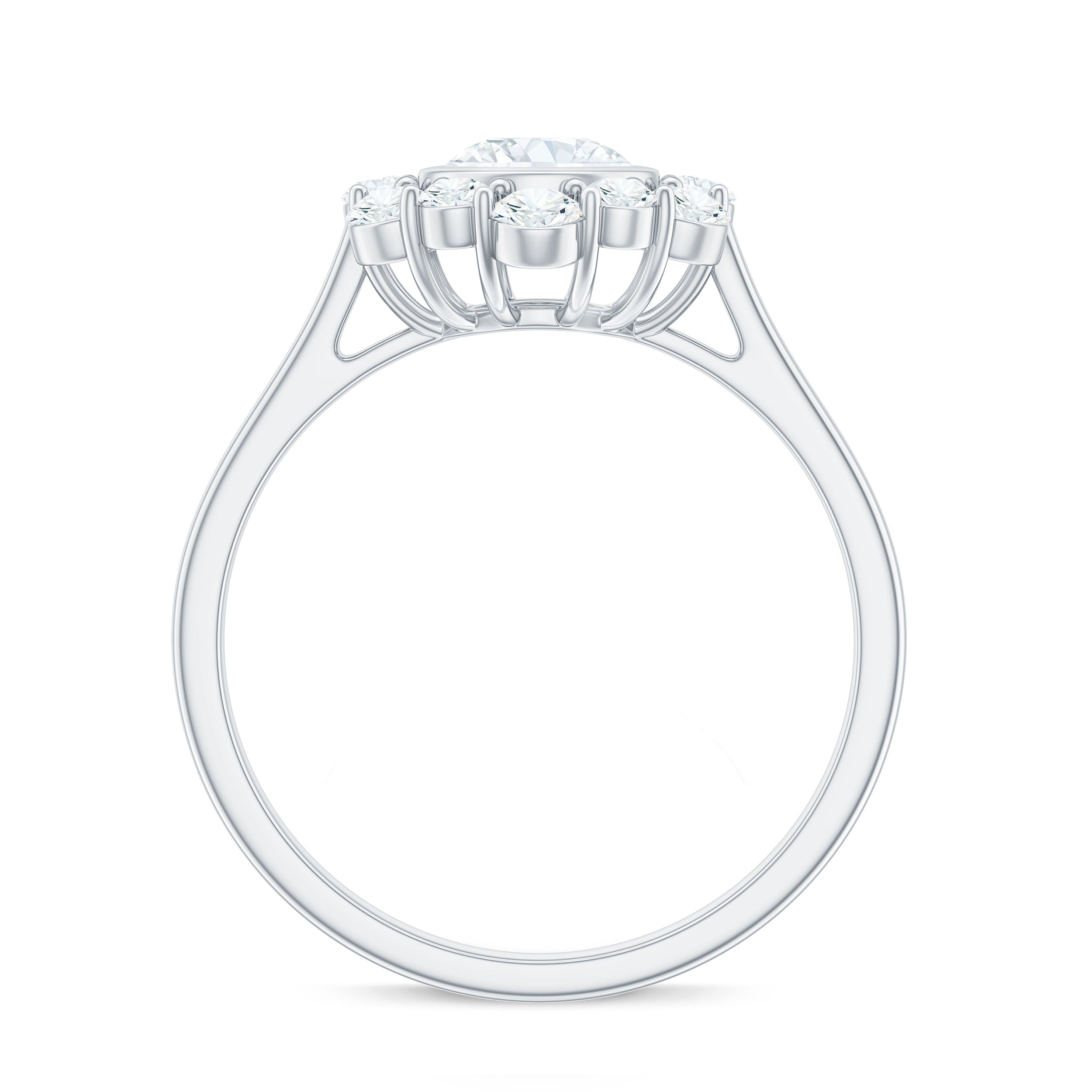 Halo moissanite rings: One center moissanite piece is surrounded by small accent moissanite, which is a halo moissanite setting. Halo gemstone settings are more affordable than gemstone solitaire rings, in case of the same total carat weight, and look similar. the side moissanite in yellow gold moissanite rings creates the illusion of a bigger gemstone.