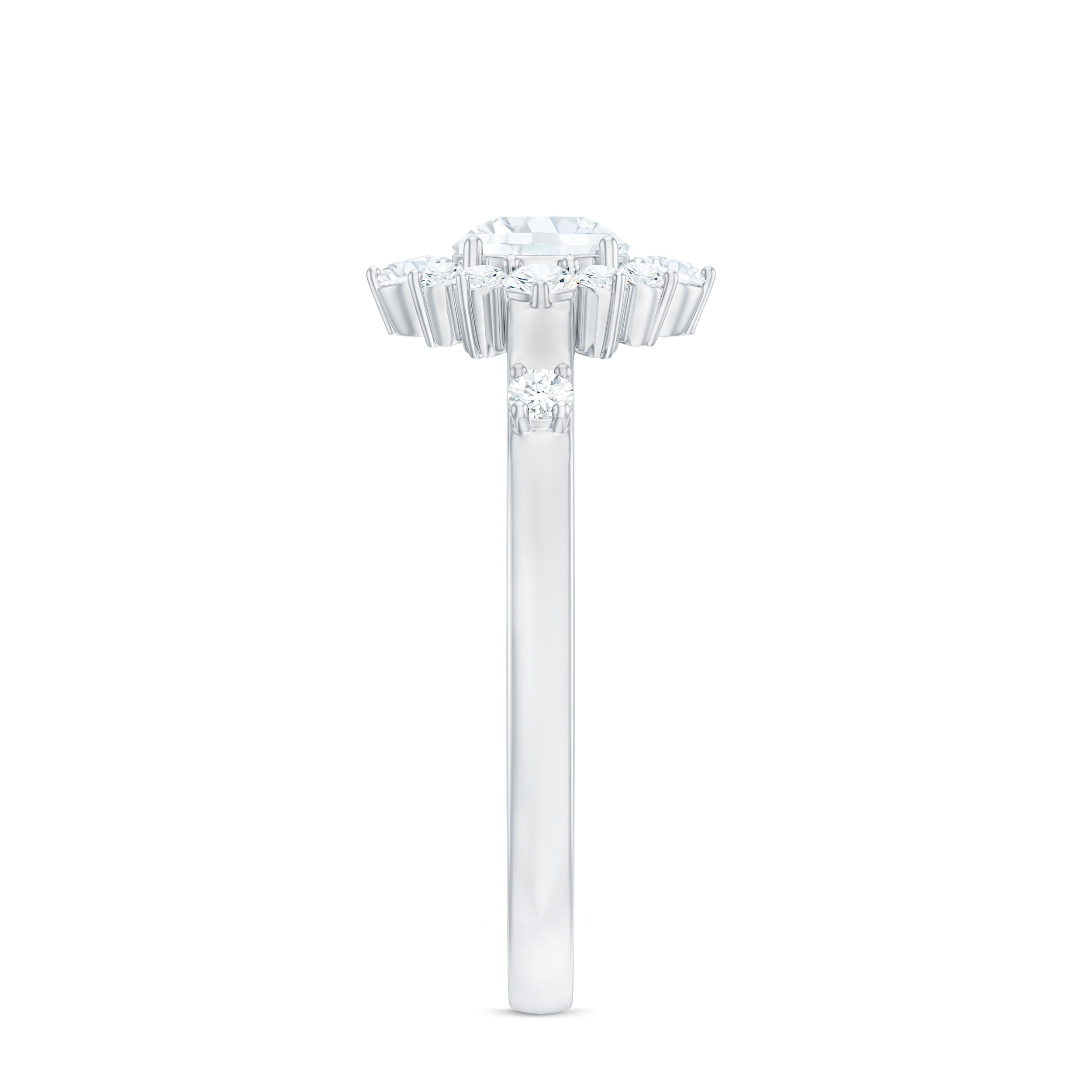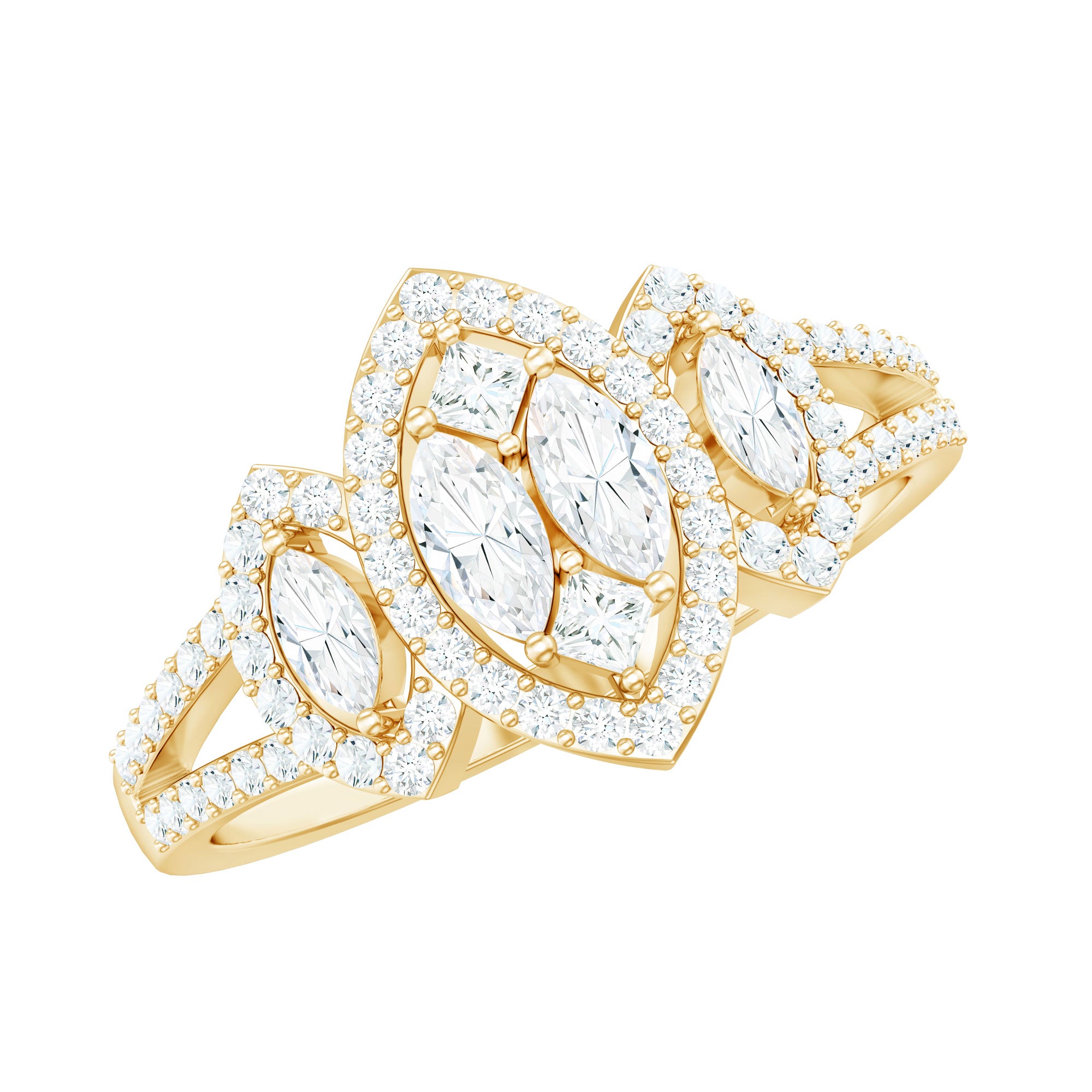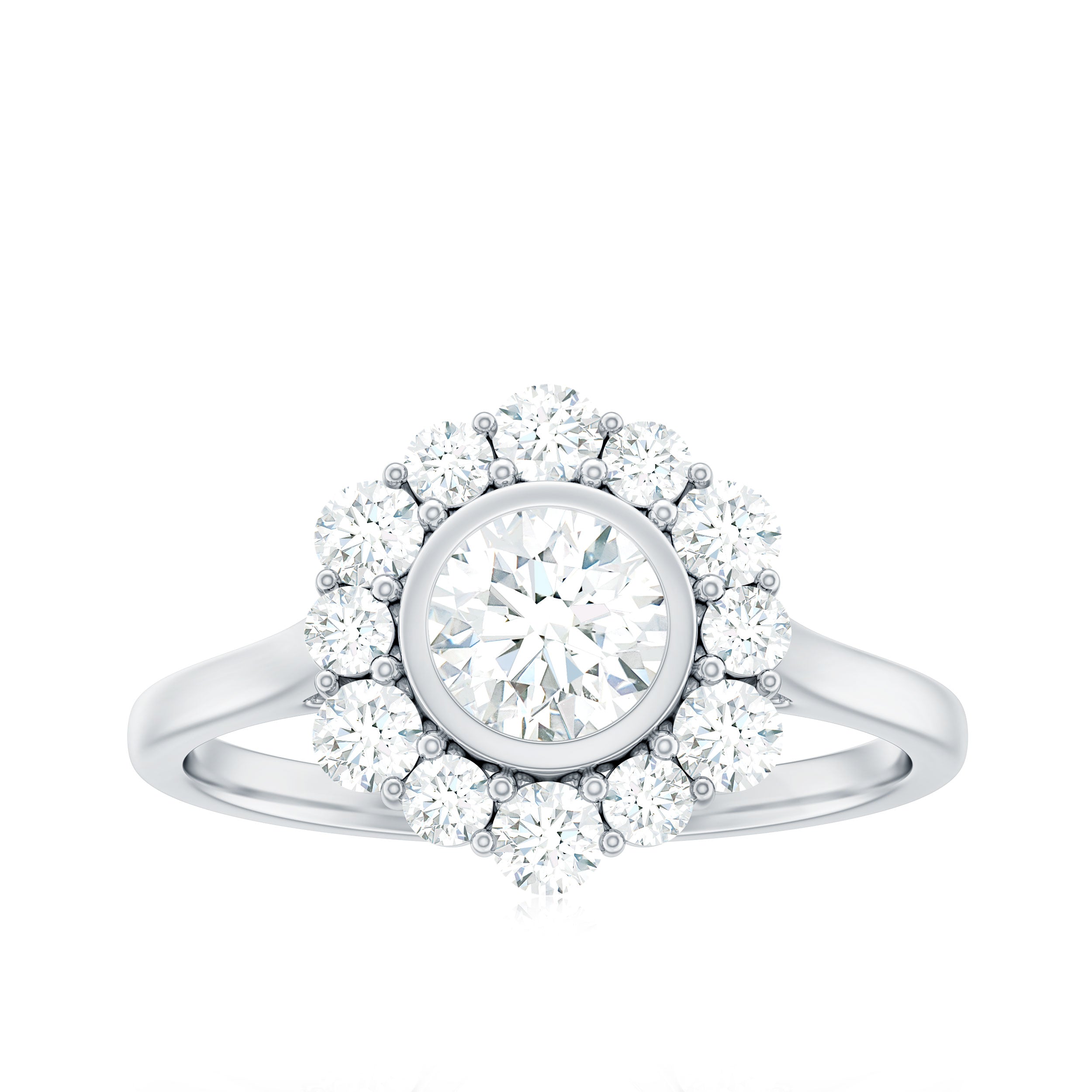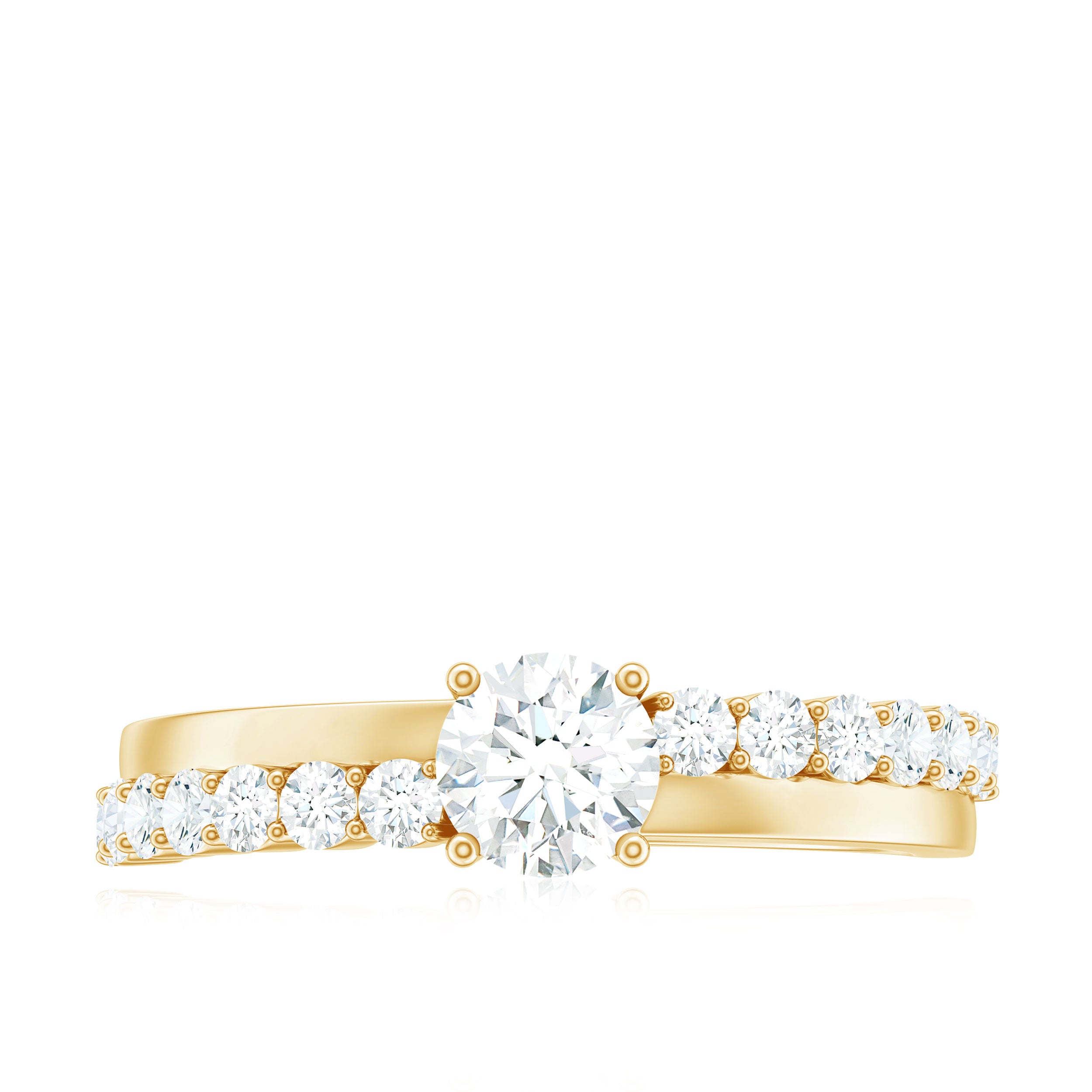 Halo moissanite rings: One center moissanite piece is surrounded by small accent moissanite, which is a halo moissanite setting. Halo gemstone settings are more affordable than gemstone solitaire rings, in case of the same total carat weight, and look similar. the side moissanite in yellow gold moissanite rings creates the illusion of a bigger gemstone.