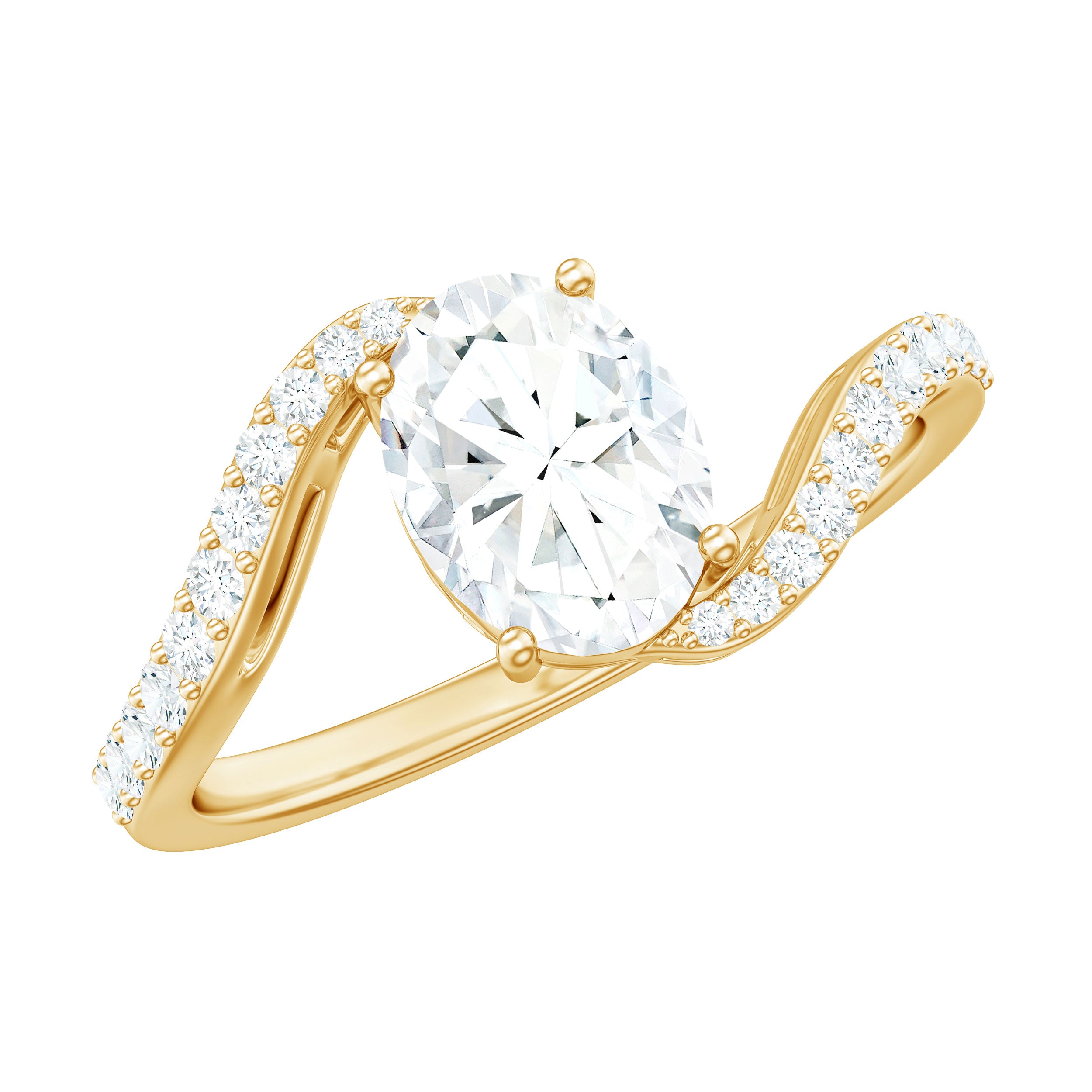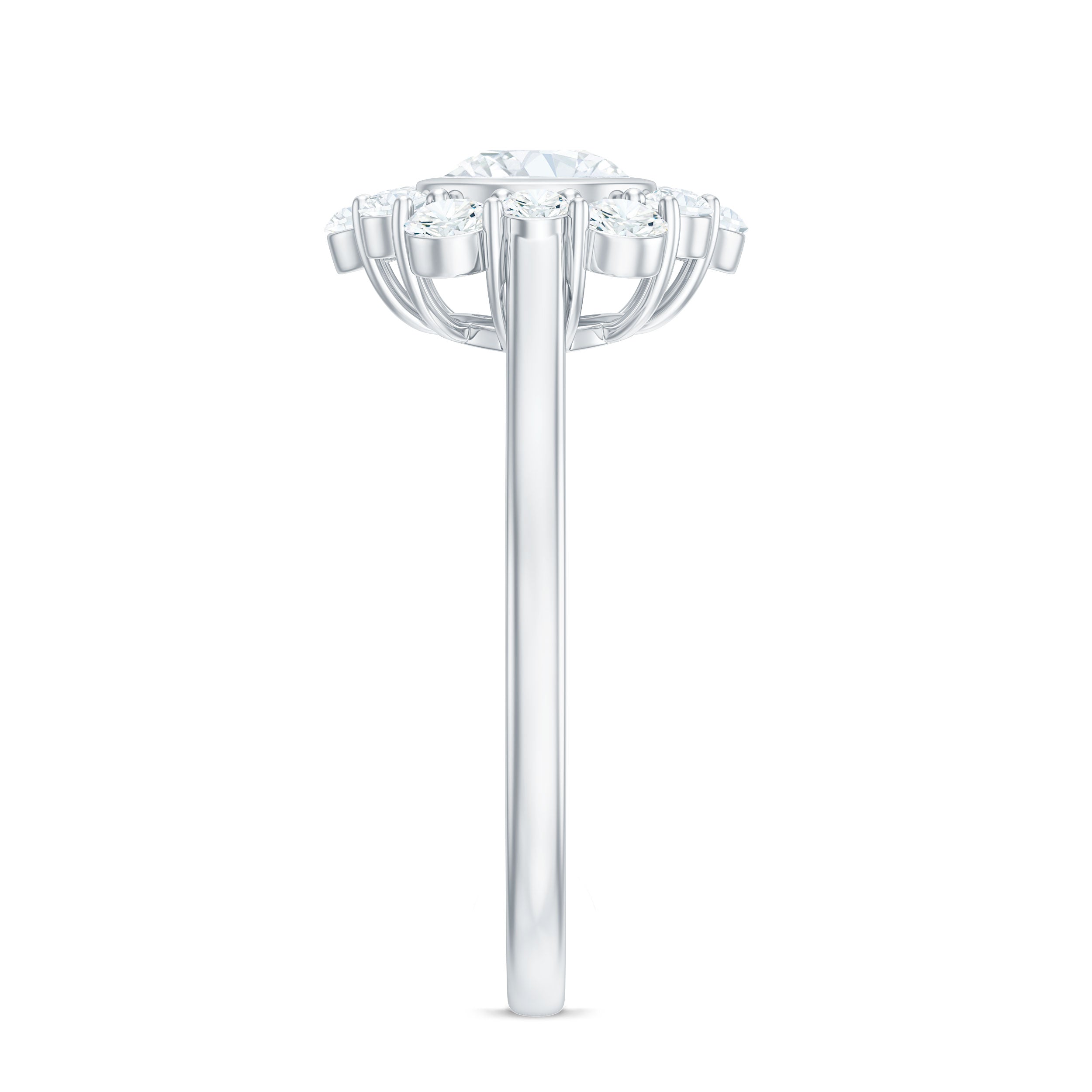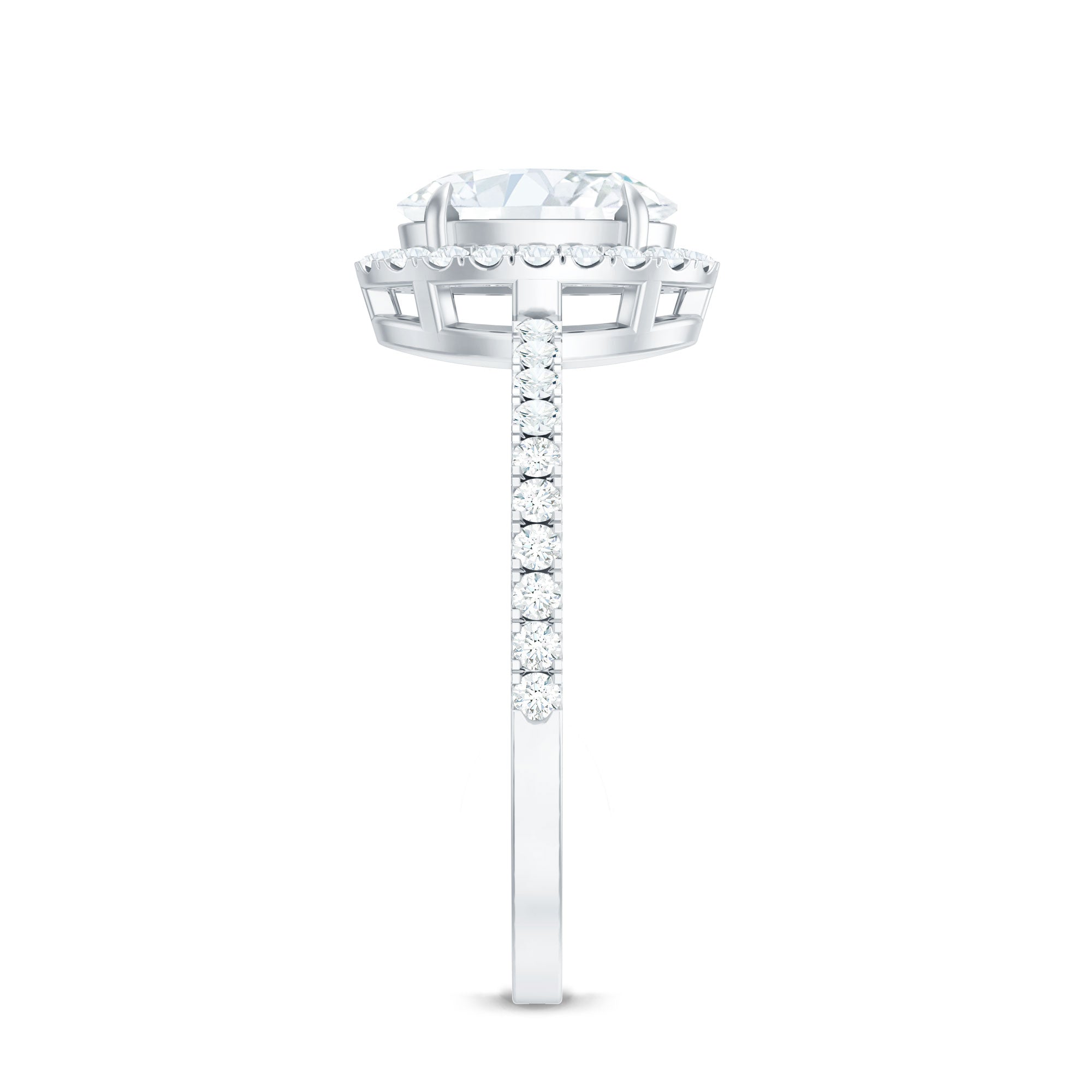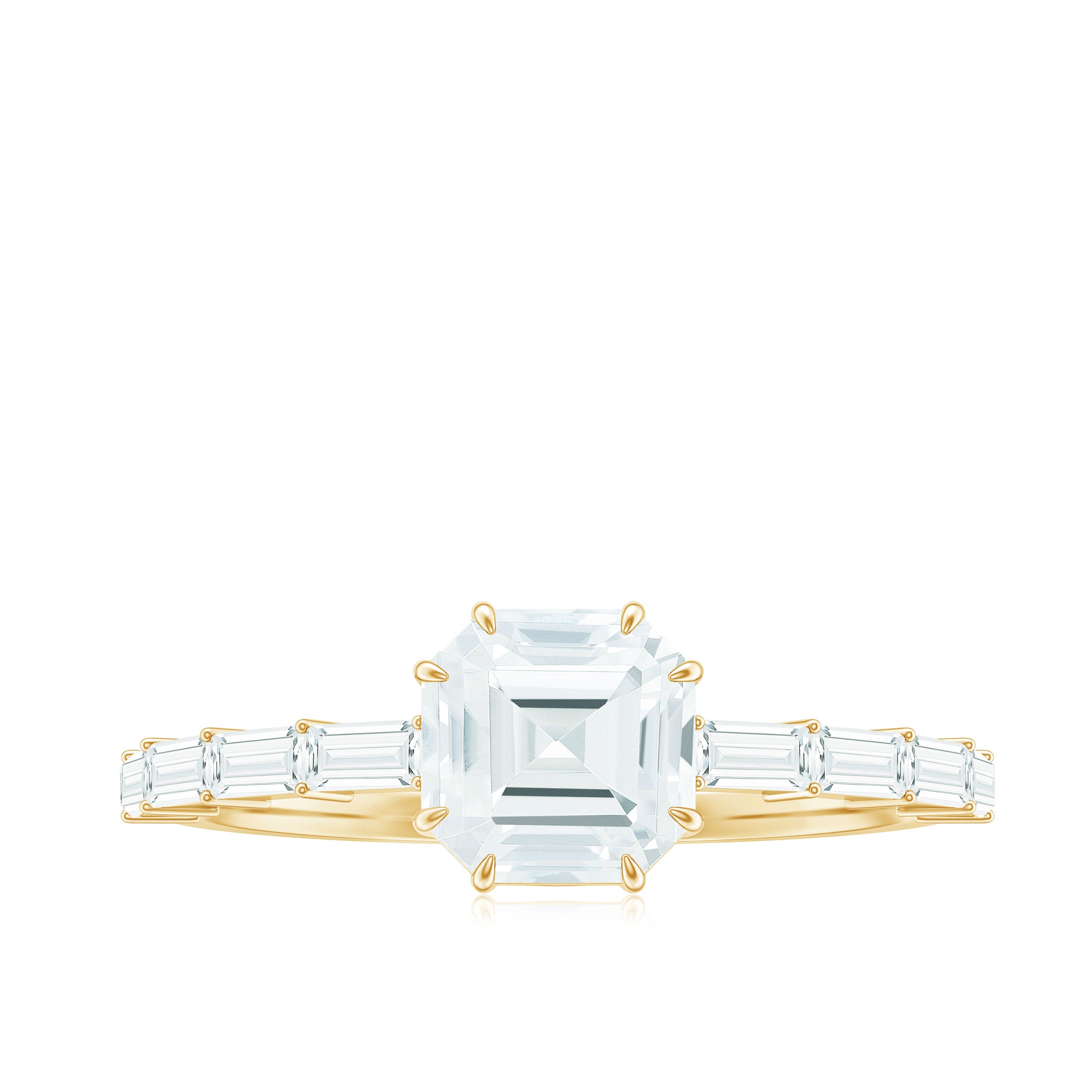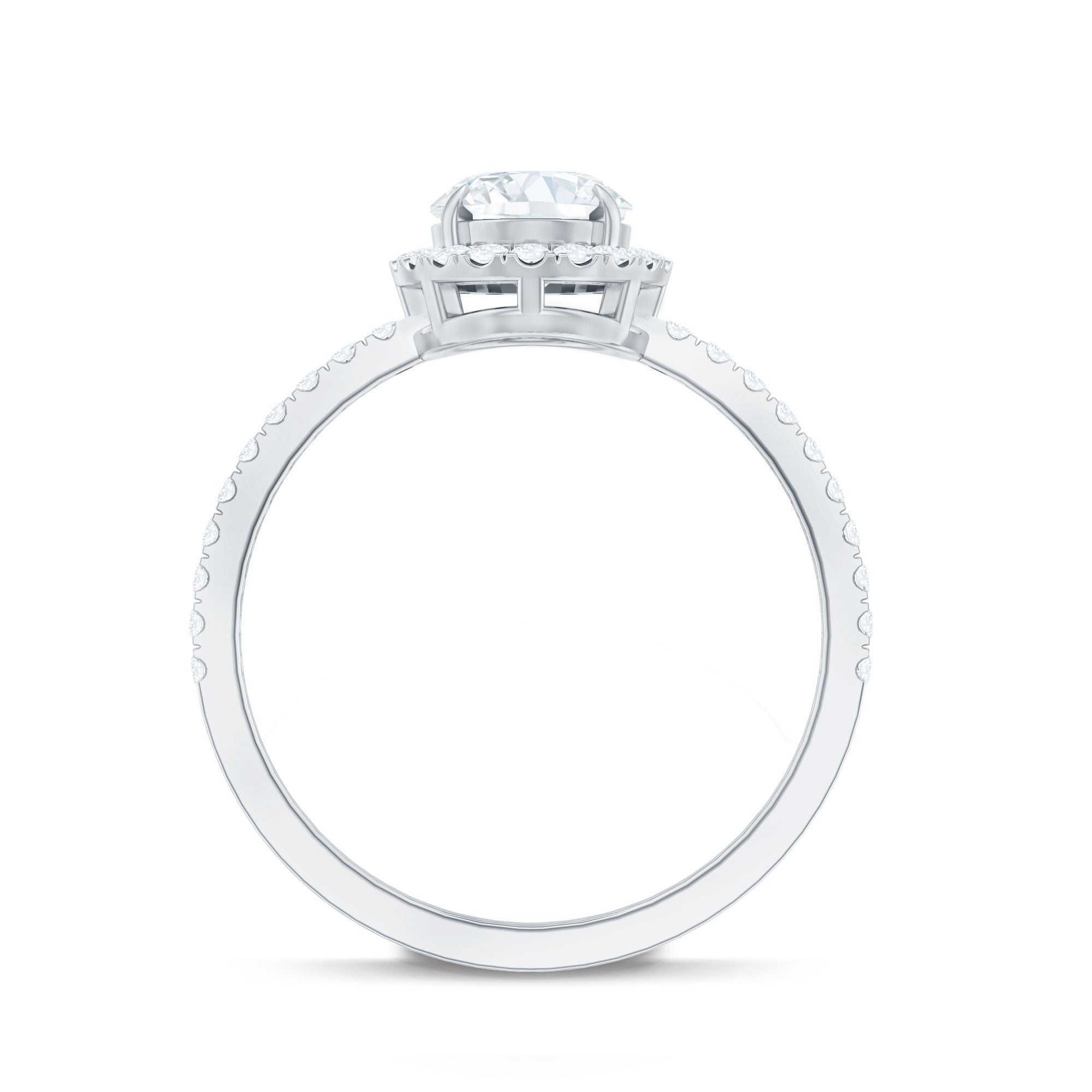 Halo moissanite rings: One center moissanite piece is surrounded by small accent moissanite, which is a halo moissanite setting. Halo gemstone settings are more affordable than gemstone solitaire rings, in case of the same total carat weight, and look similar. the side moissanite in yellow gold moissanite rings creates the illusion of a bigger gemstone.