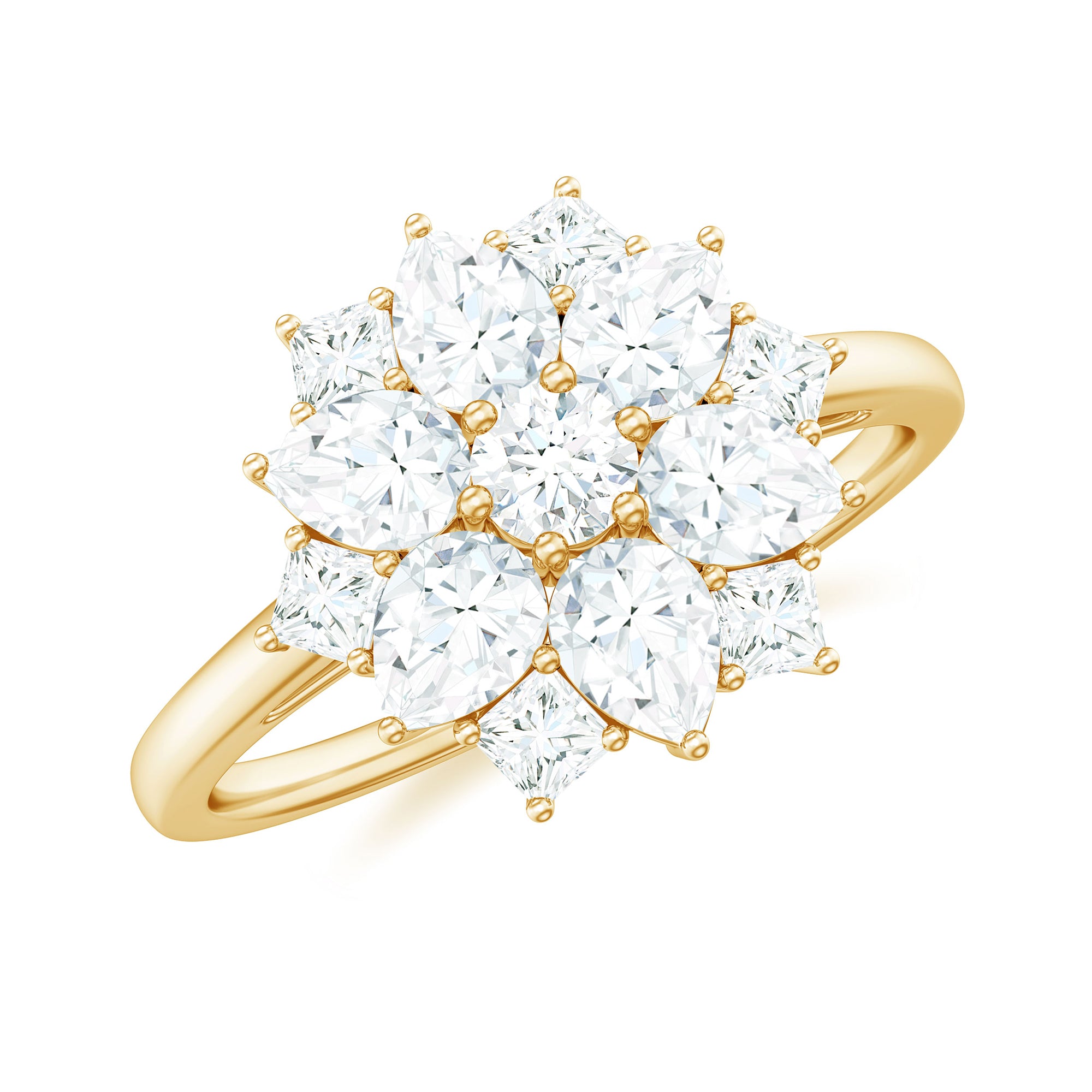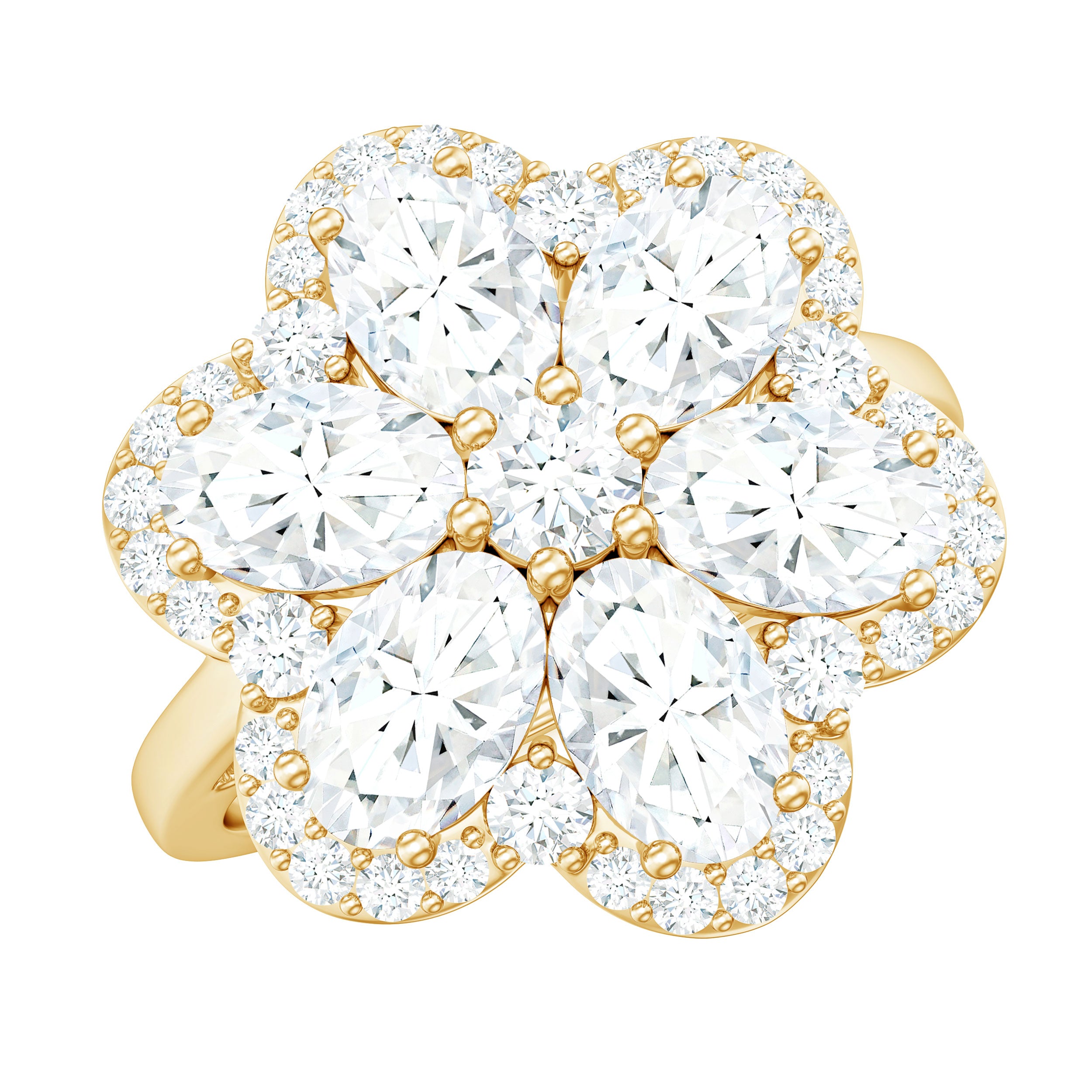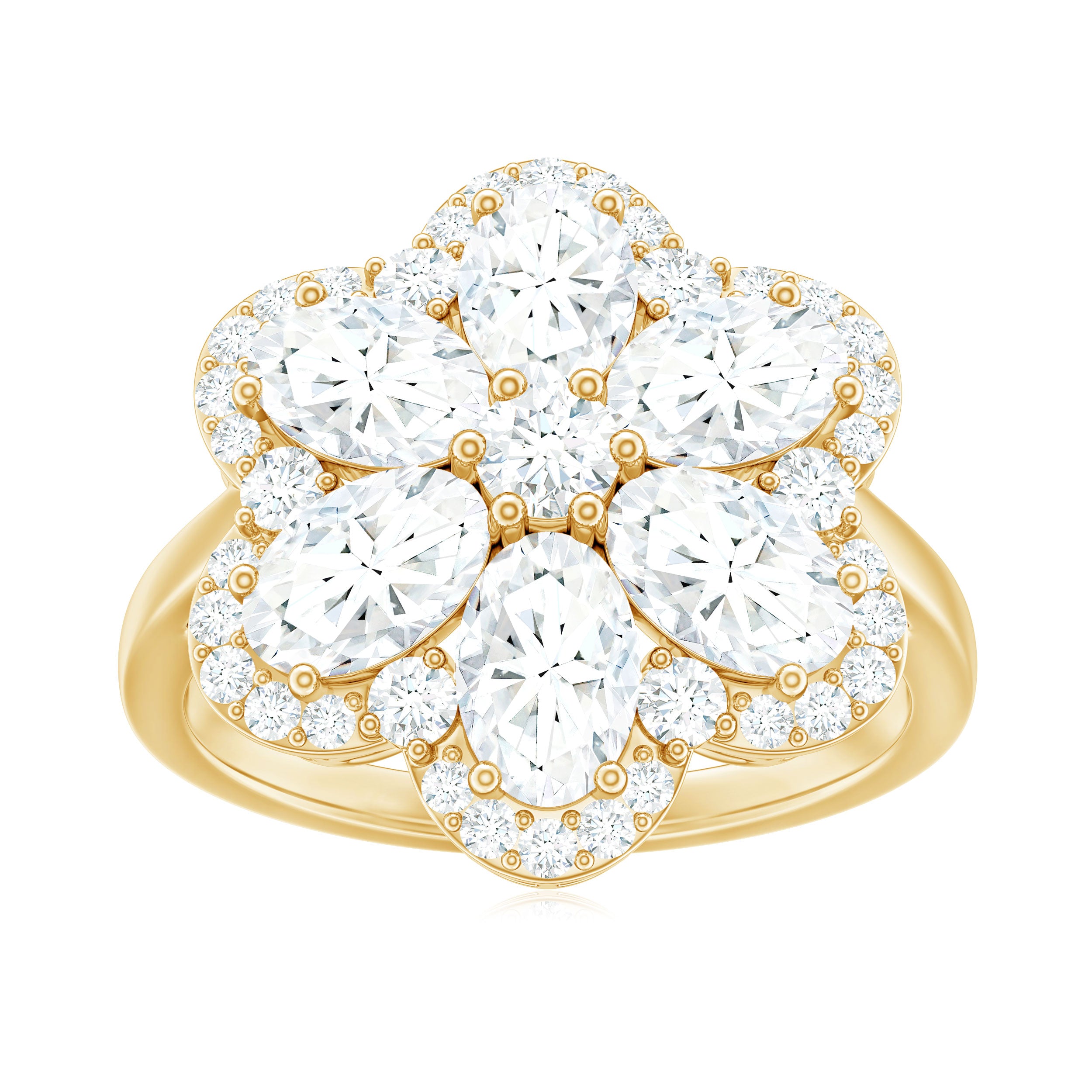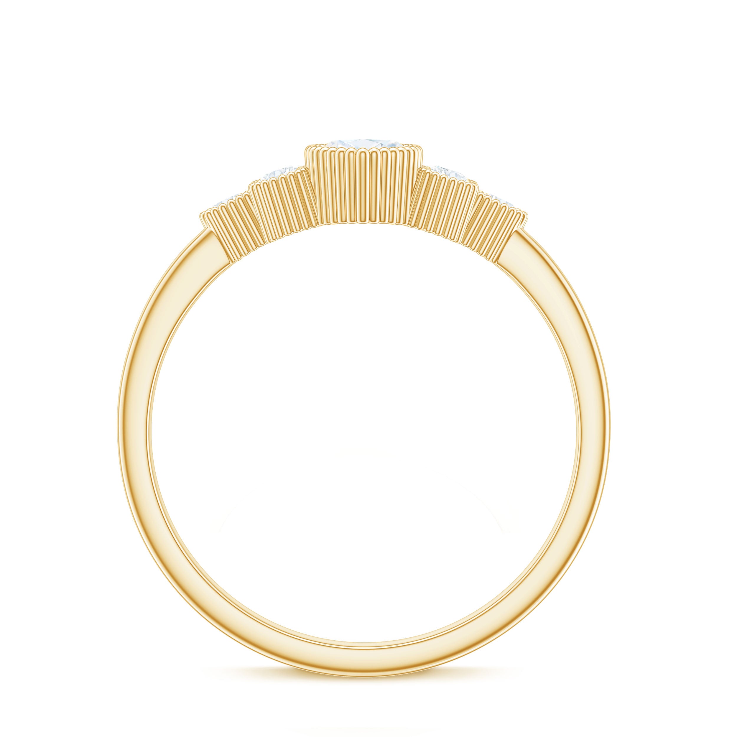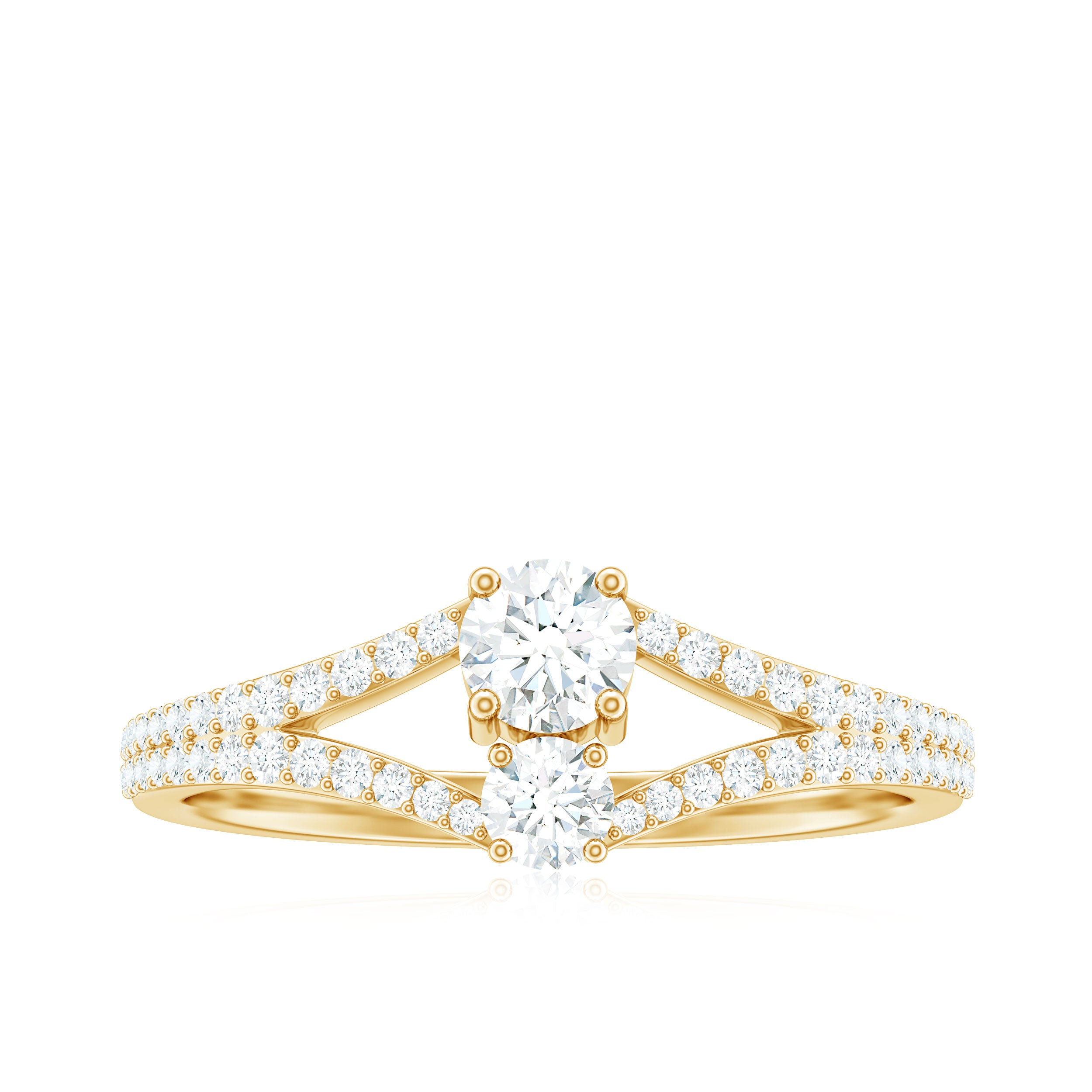 Halo moissanite rings: One center moissanite piece is surrounded by small accent moissanite, which is a halo moissanite setting. Halo gemstone settings are more affordable than gemstone solitaire rings, in case of the same total carat weight, and look similar. the side moissanite in yellow gold moissanite rings creates the illusion of a bigger gemstone.