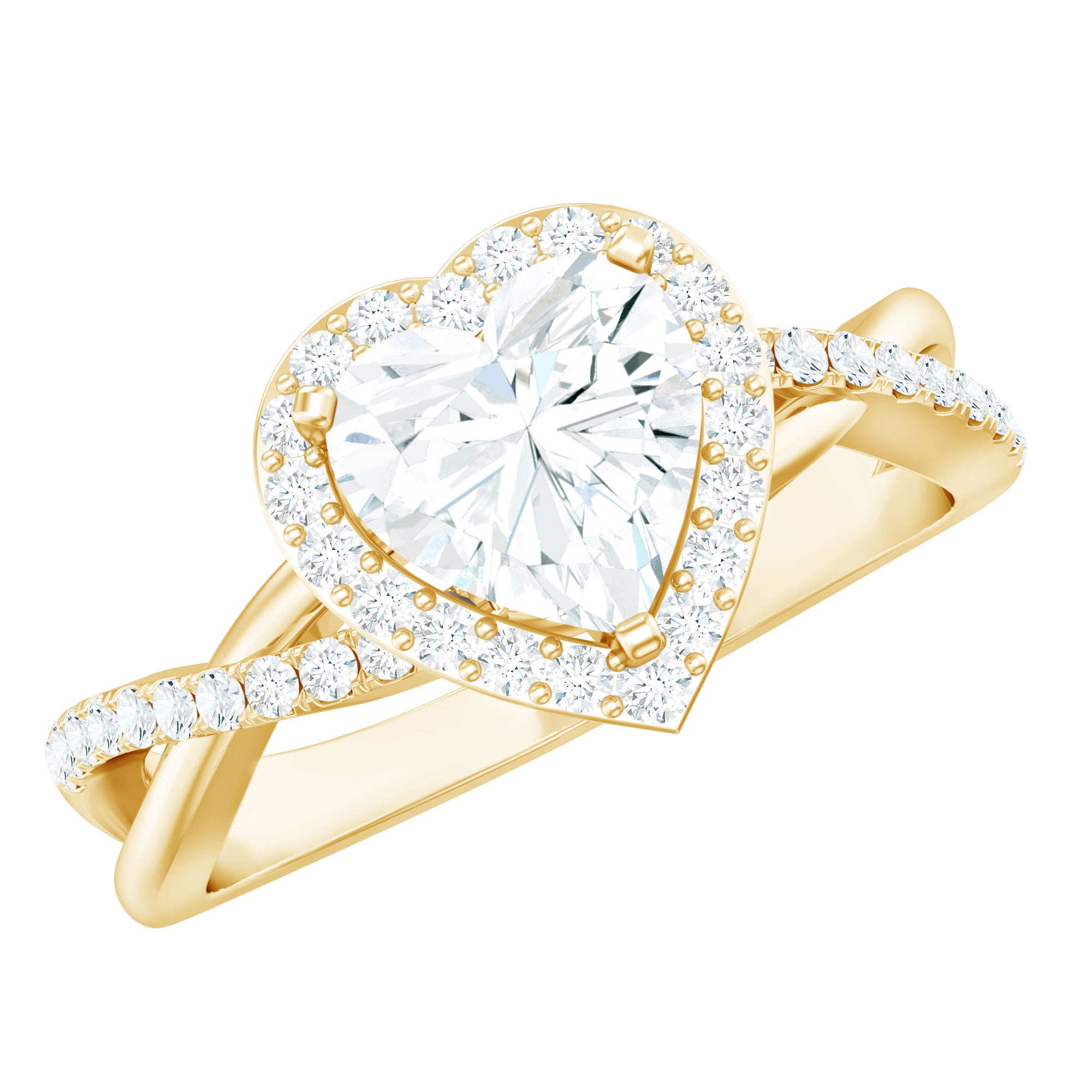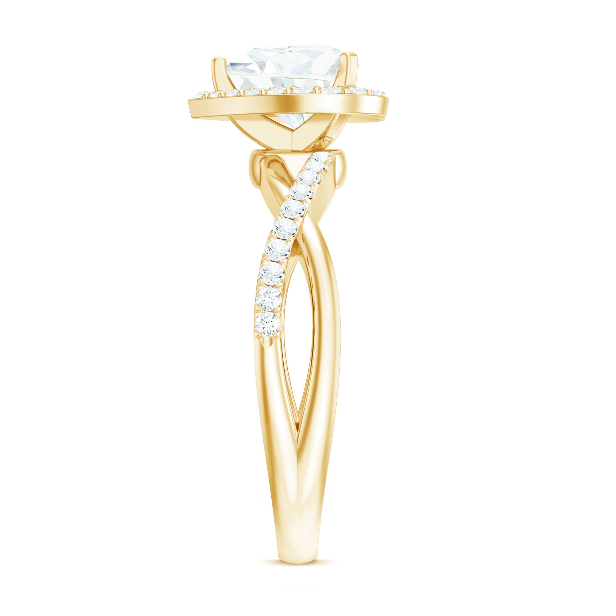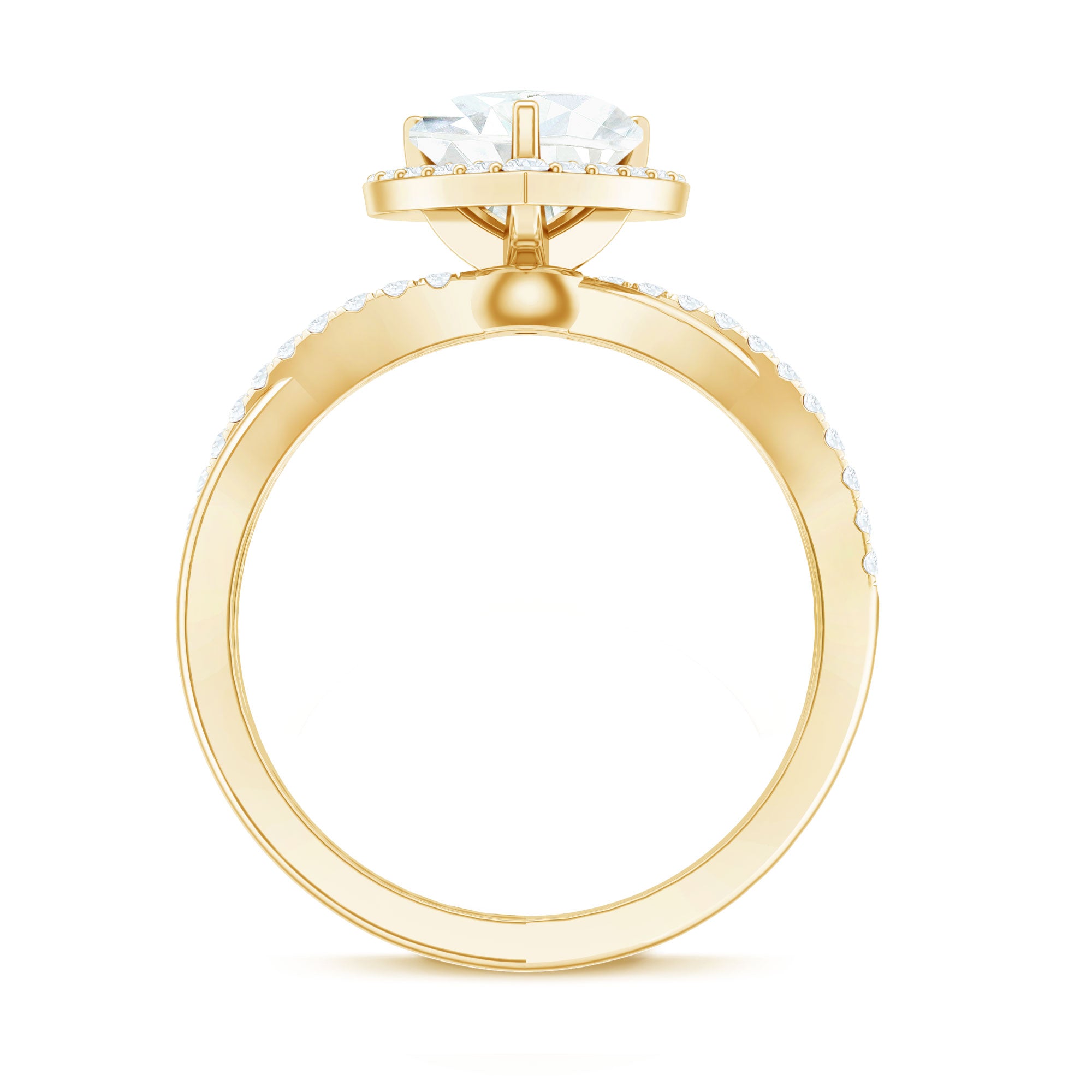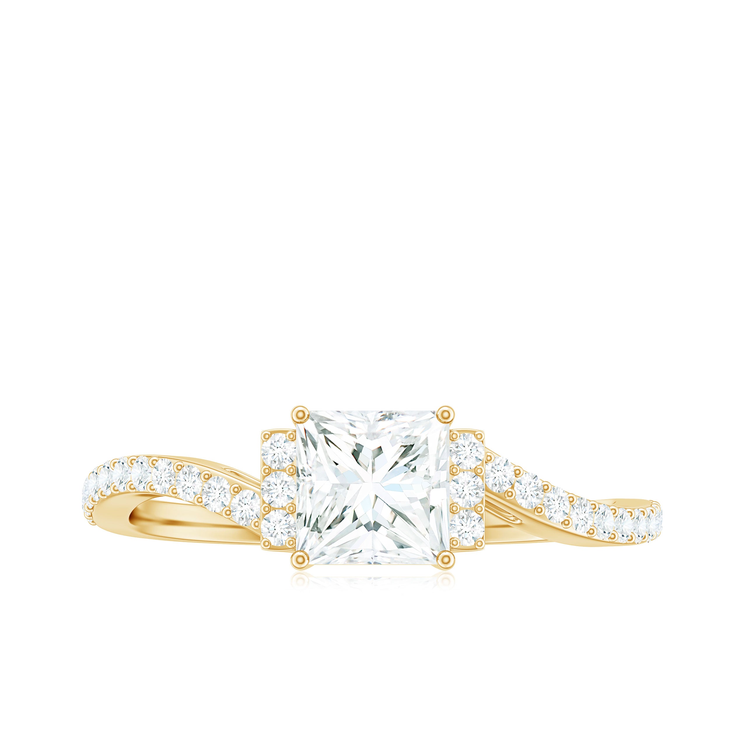 2. Halo moissanite rings: One center moissanite piece is surrounded by small accent moissanite, which is a halo moissanite setting. Halo gemstone settings are more affordable than gemstone solitaire rings, in case of the same total carat weight, and look similar. the side moissanite in yellow gold moissanite rings creates the illusion of a bigger gemstone.