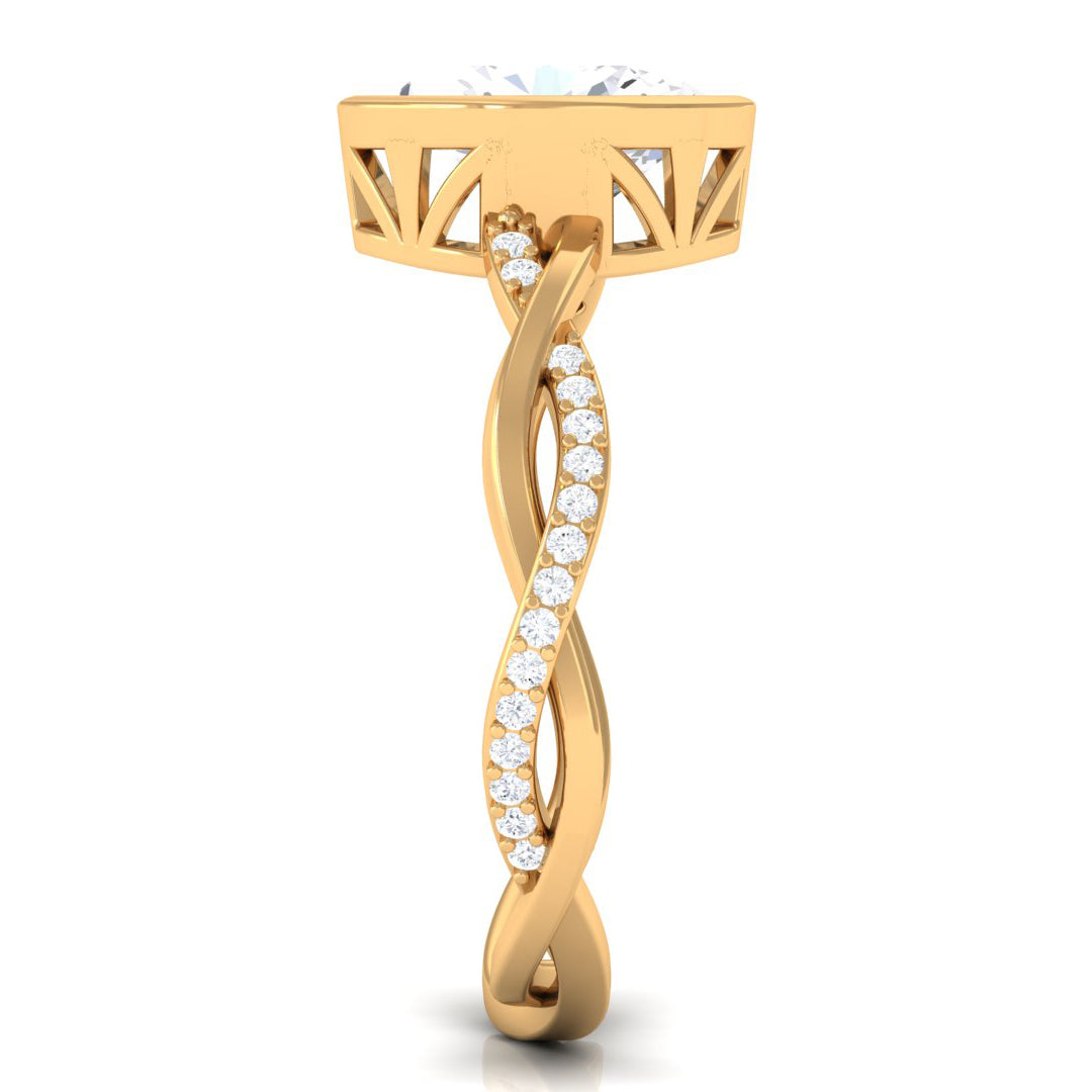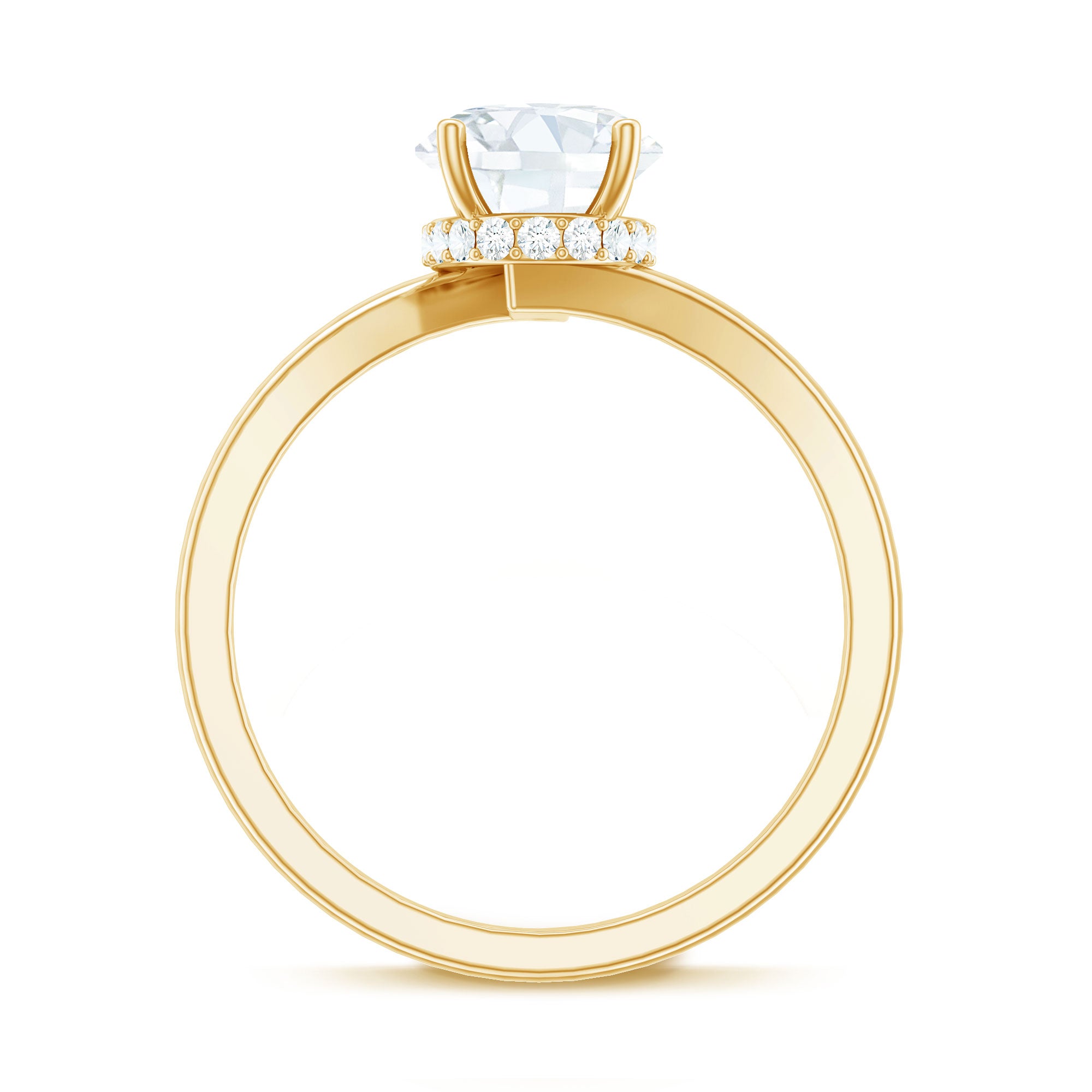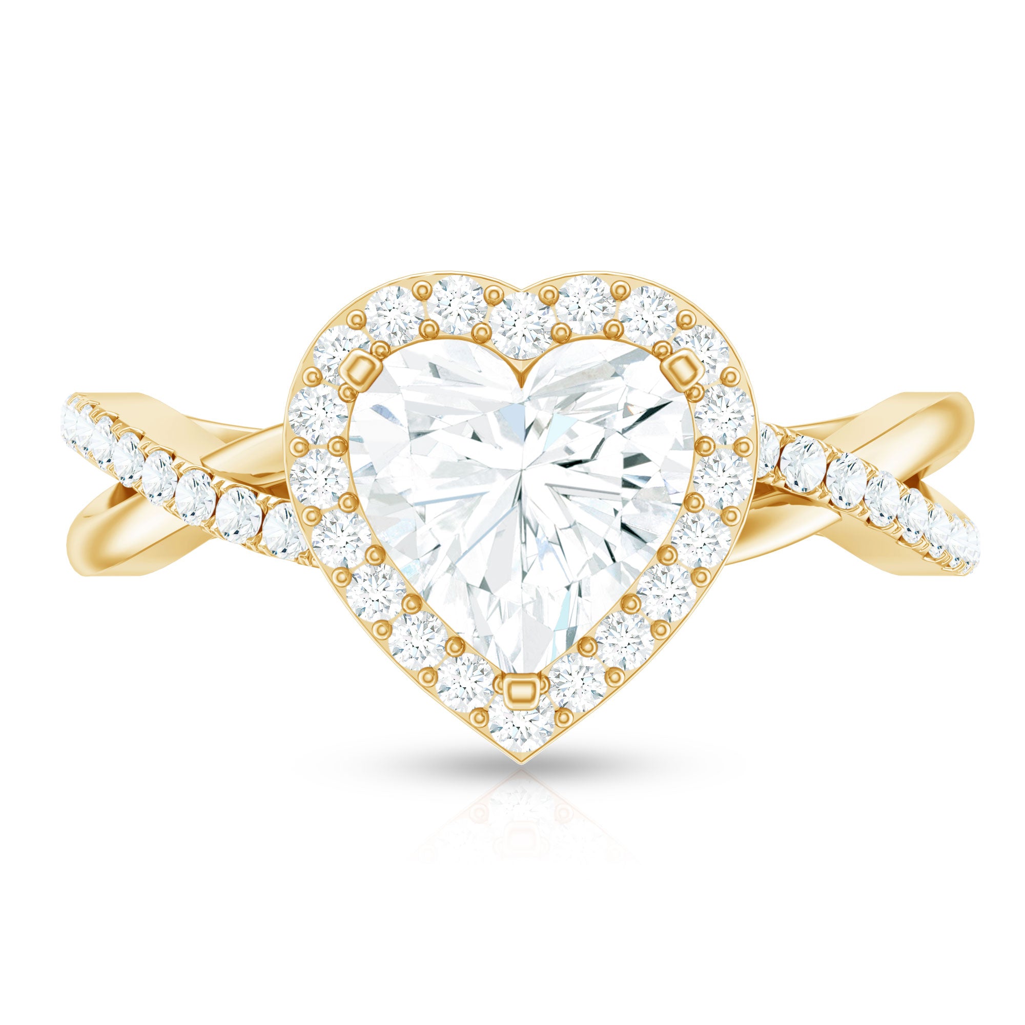 2. Halo moissanite rings: One center moissanite piece is surrounded by small accent moissanite, which is a halo moissanite setting. Halo gemstone settings are more affordable than gemstone solitaire rings, in case of the same total carat weight, and look similar. the side moissanite in yellow gold moissanite rings creates the illusion of a bigger gemstone.