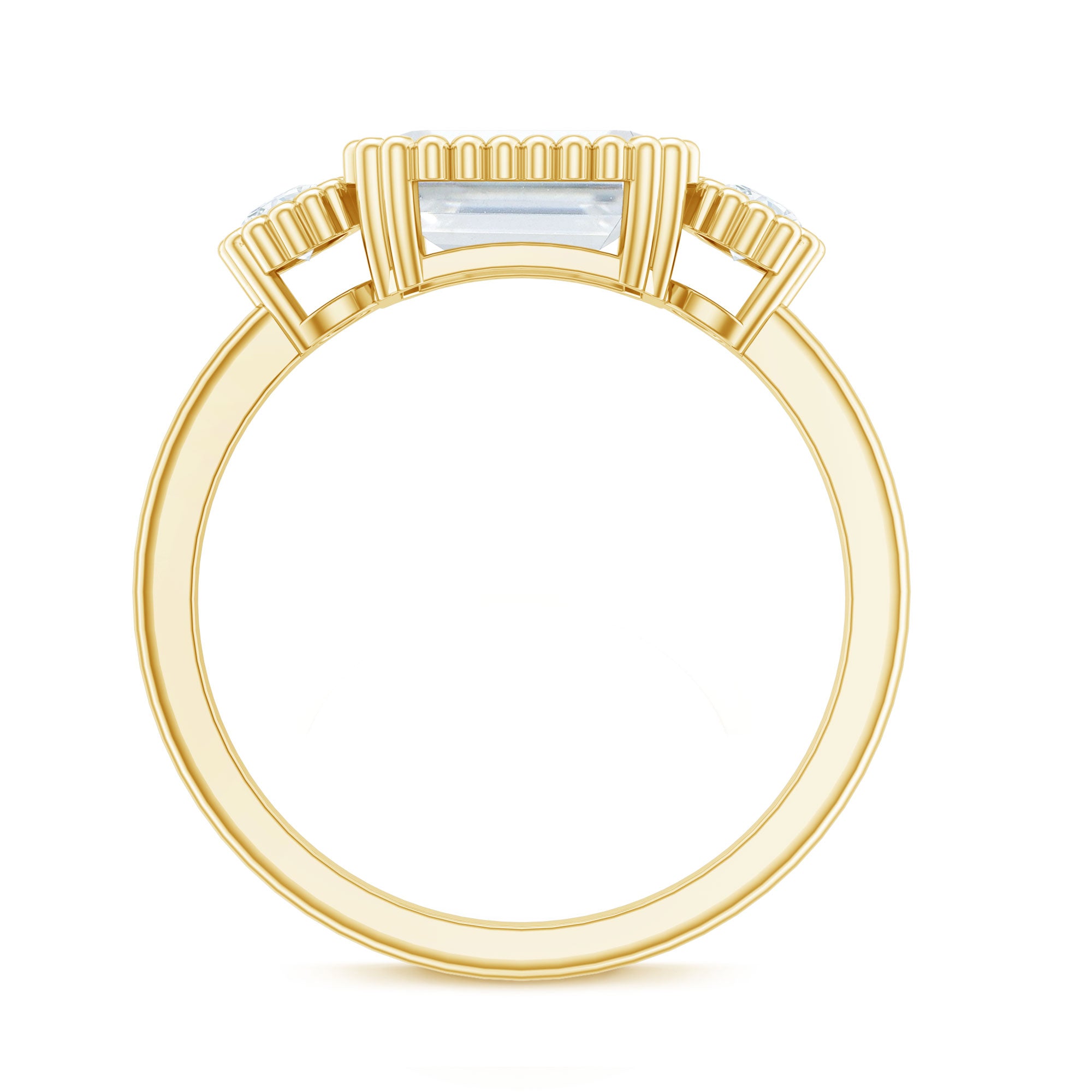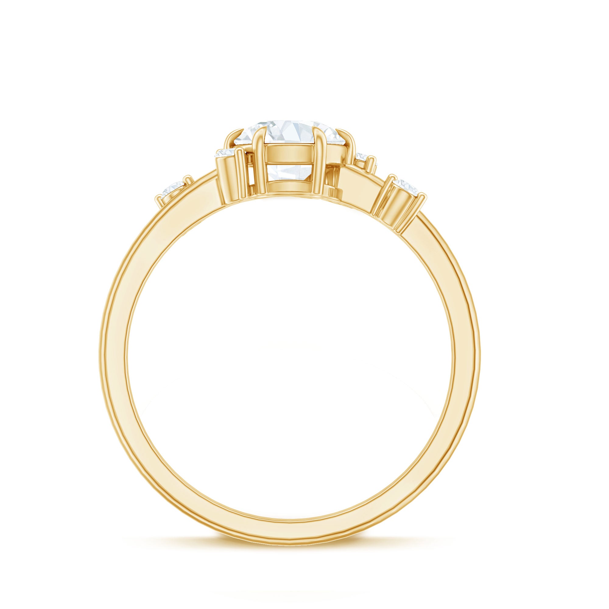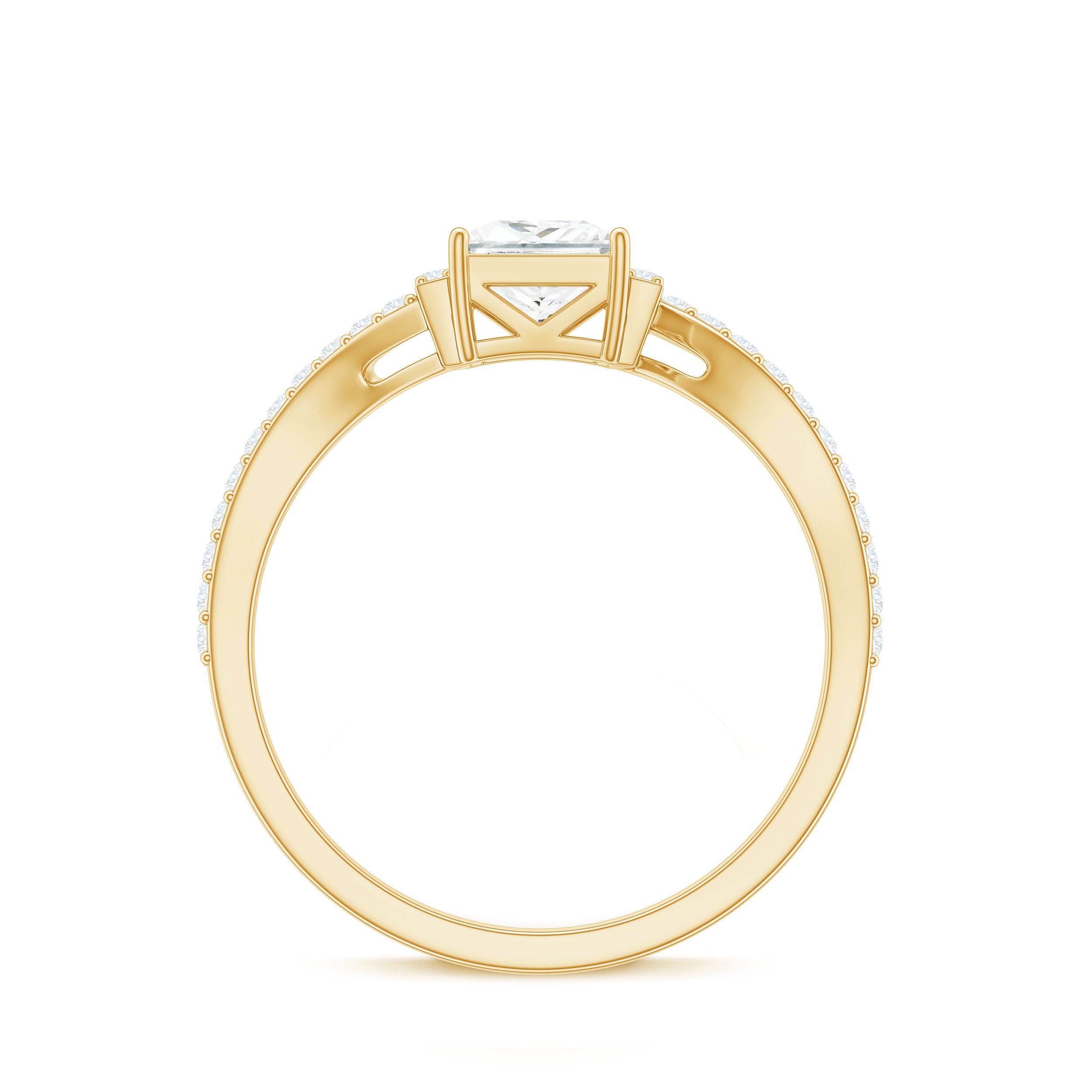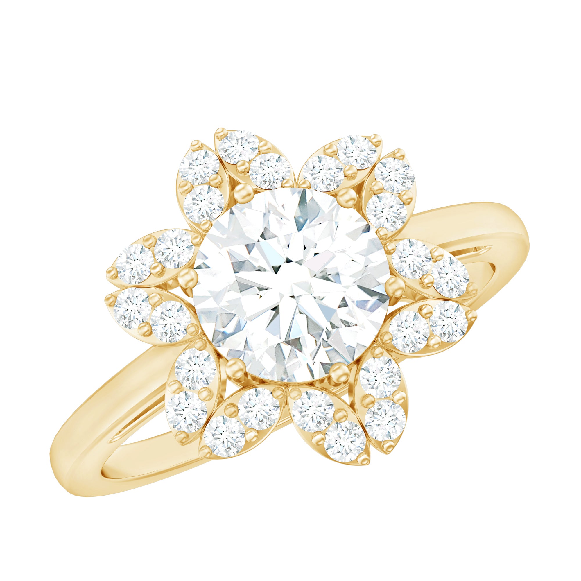 2. Halo moissanite rings: One center moissanite piece is surrounded by small accent moissanite, which is a halo moissanite setting. Halo gemstone settings are more affordable than gemstone solitaire rings, in case of the same total carat weight, and look similar. the side moissanite in yellow gold moissanite rings creates the illusion of a bigger gemstone.