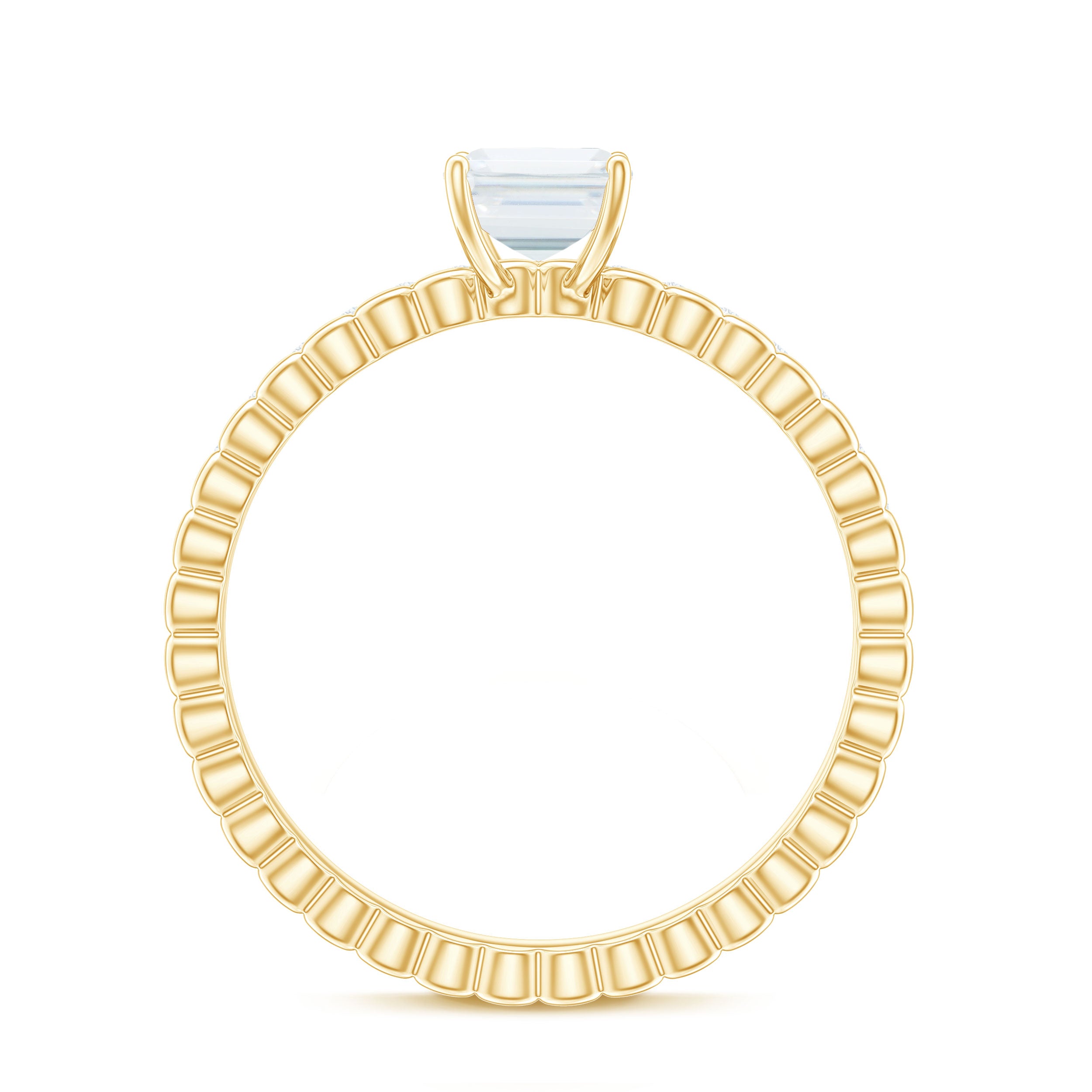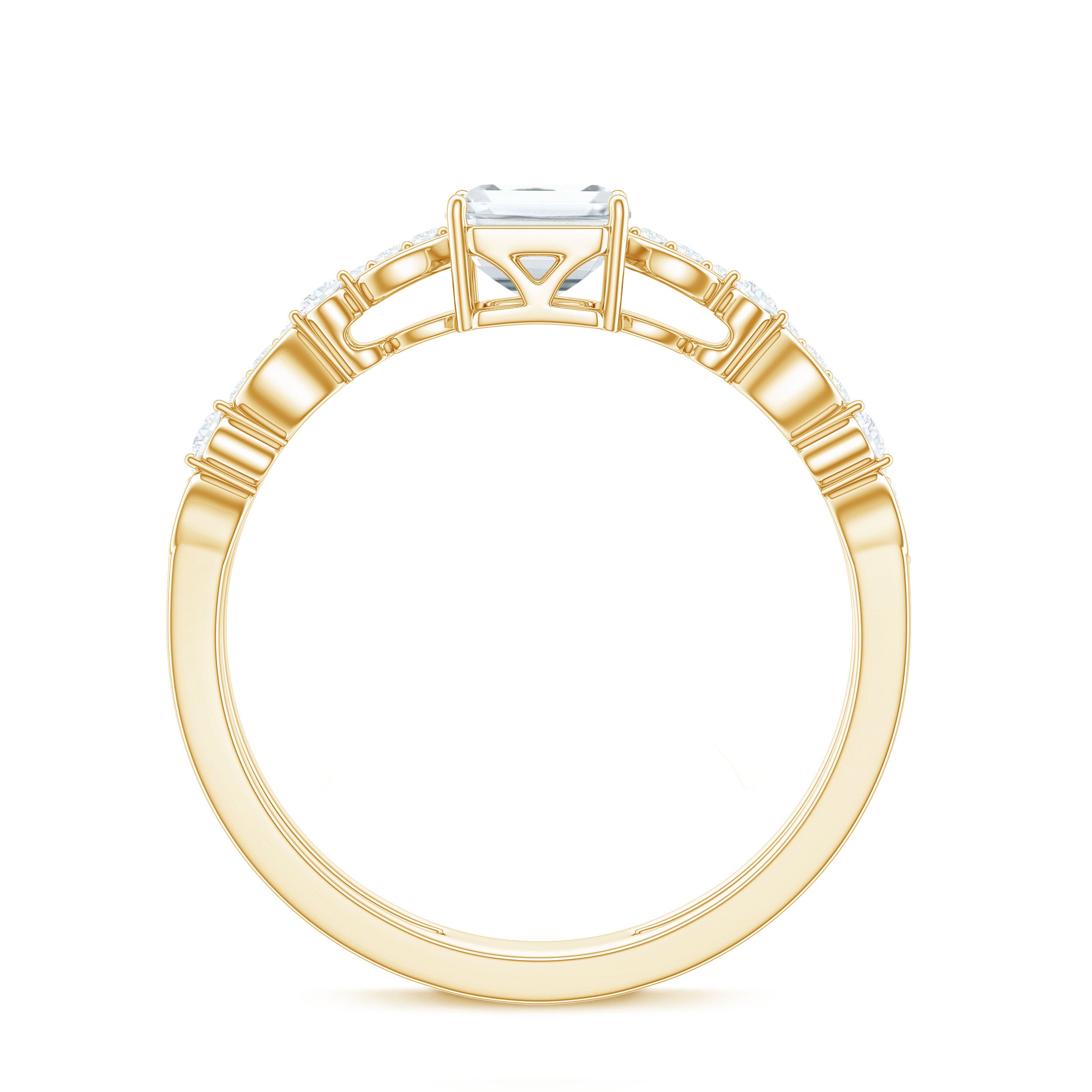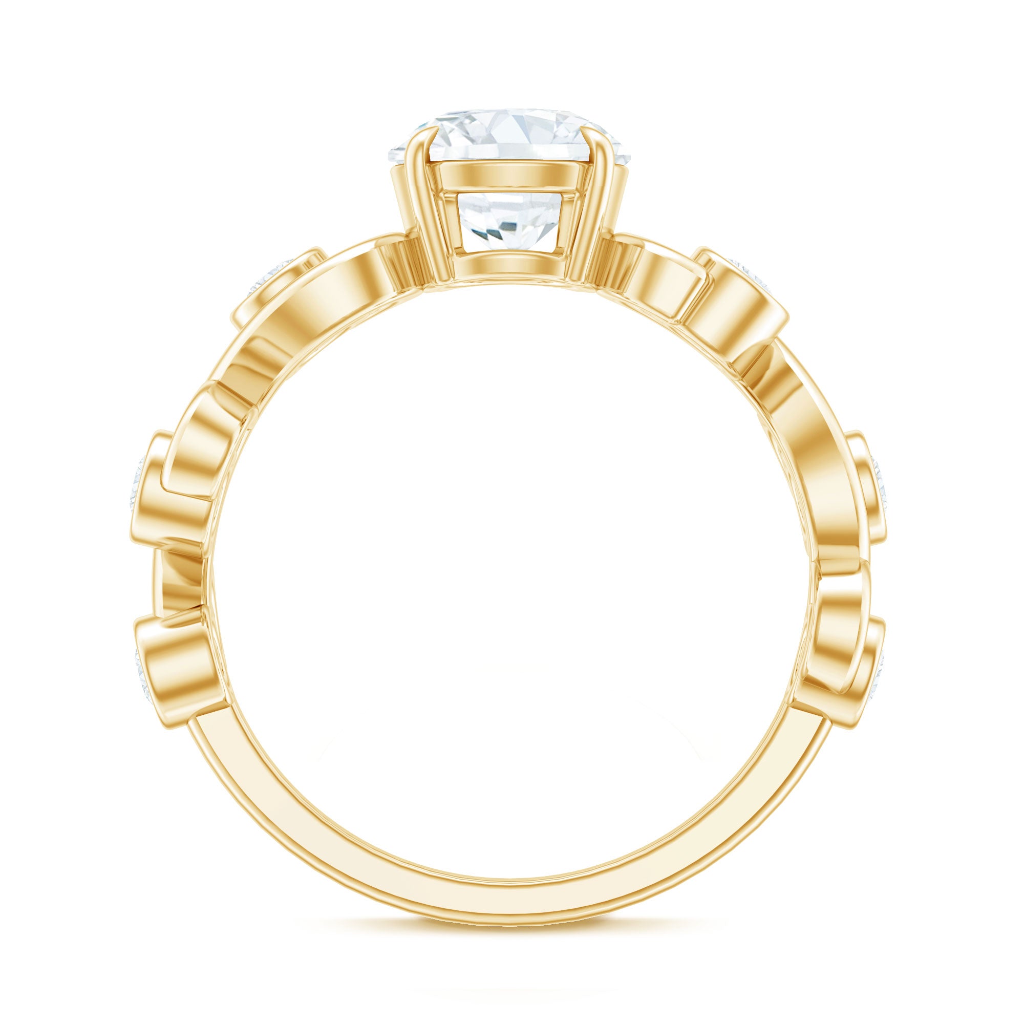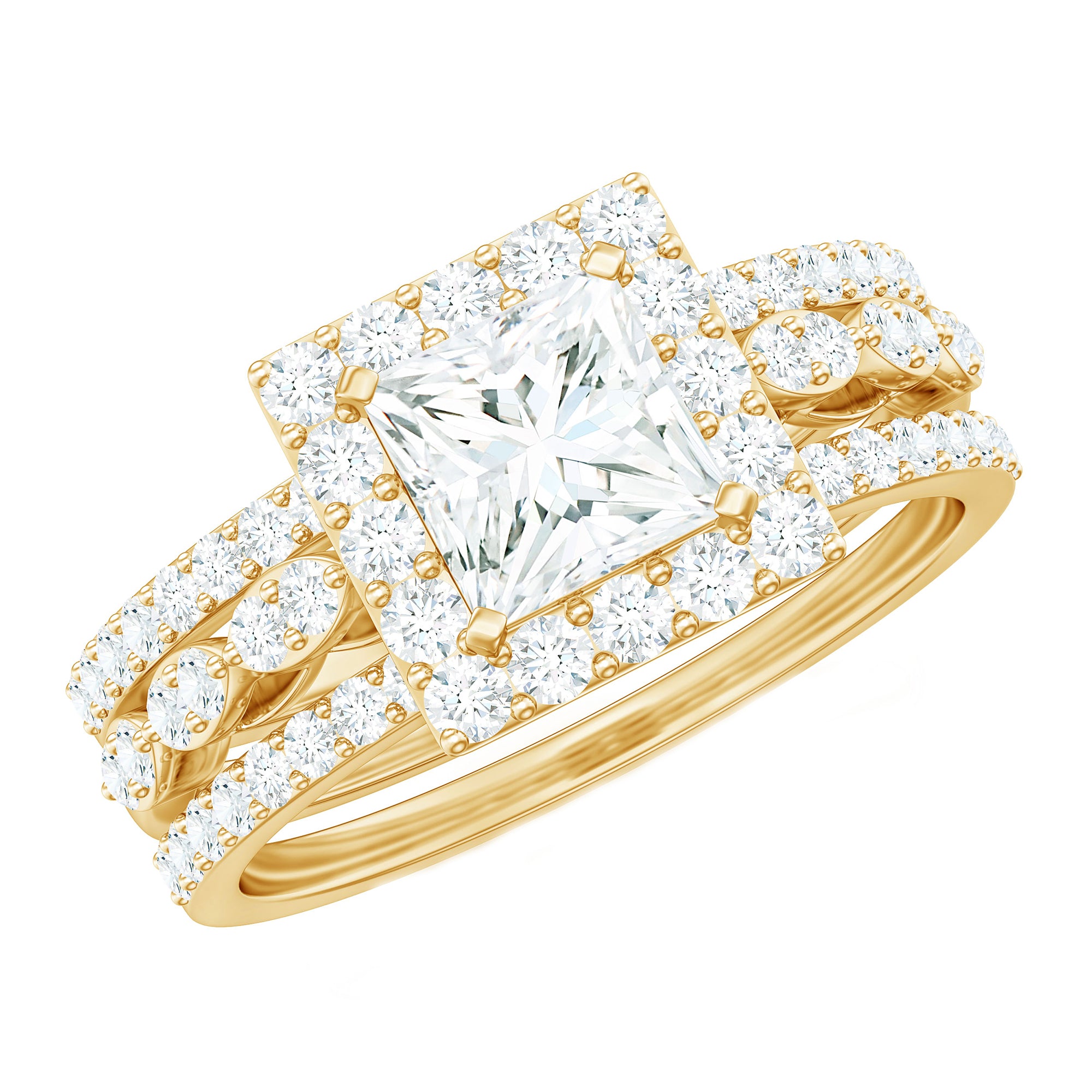 Halo moissanite rings: One center moissanite piece is surrounded by small accent moissanite, which is a halo moissanite setting. Halo gemstone settings are more affordable than gemstone solitaire rings, in case of the same total carat weight, and look similar. the side moissanite in yellow gold moissanite rings creates the illusion of a bigger gemstone.