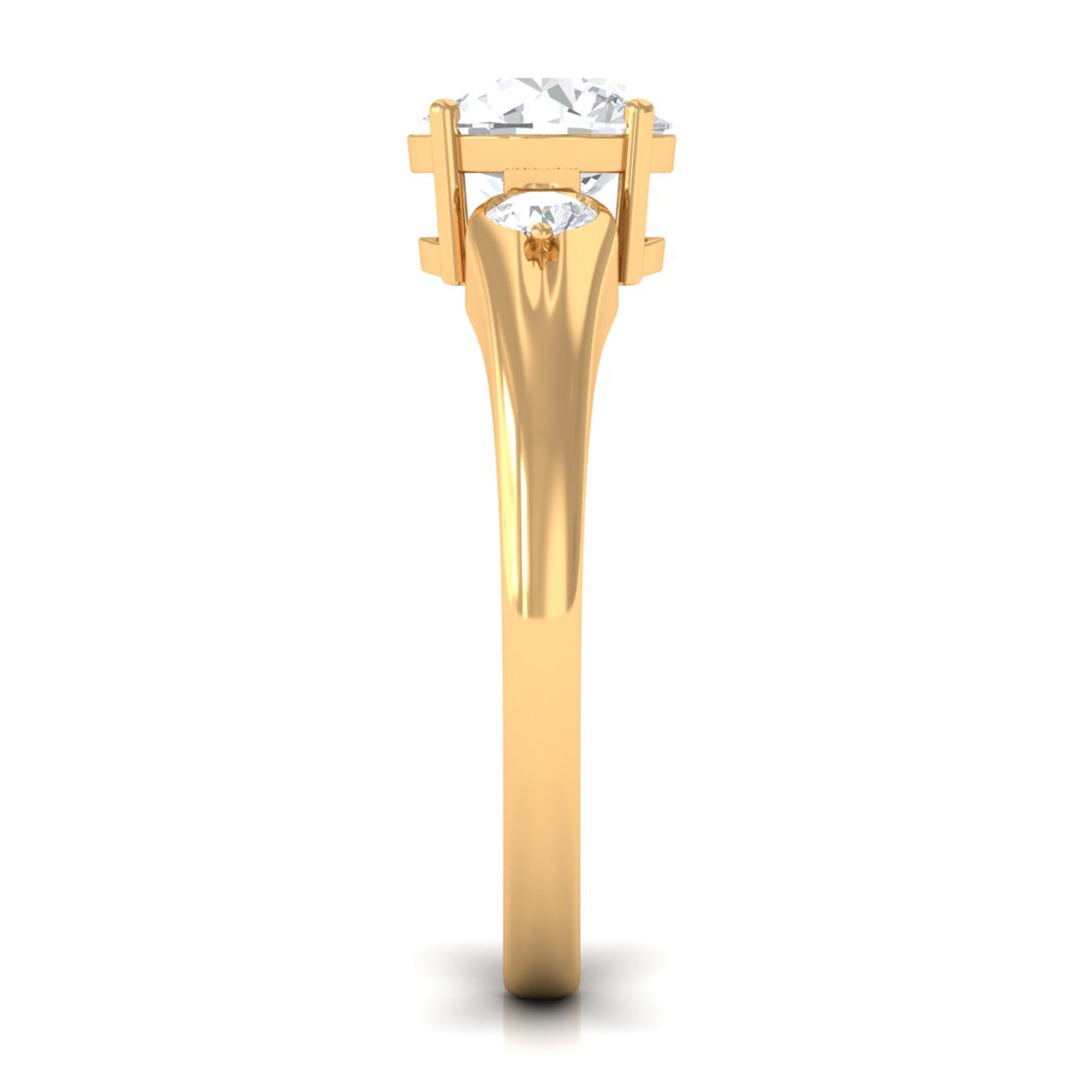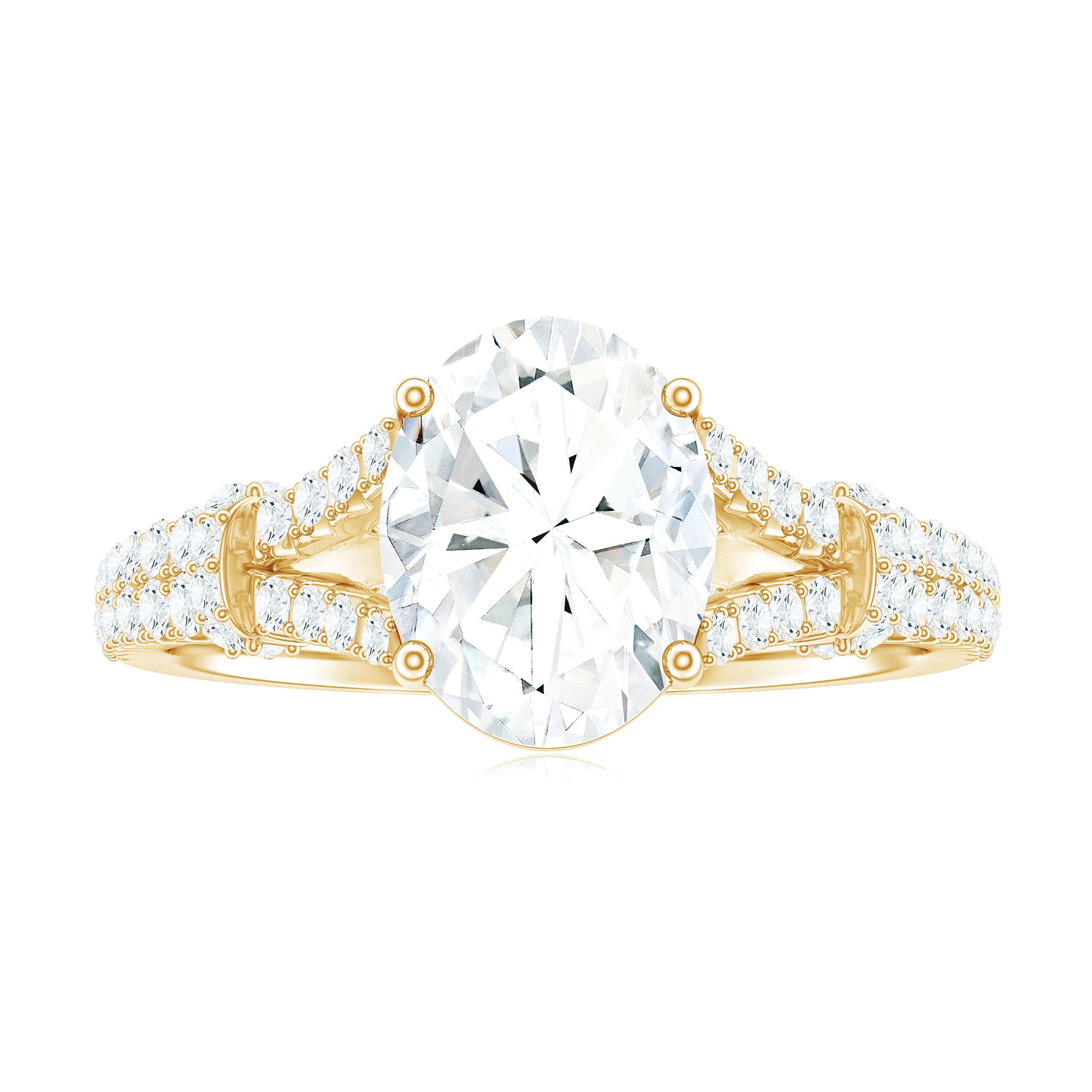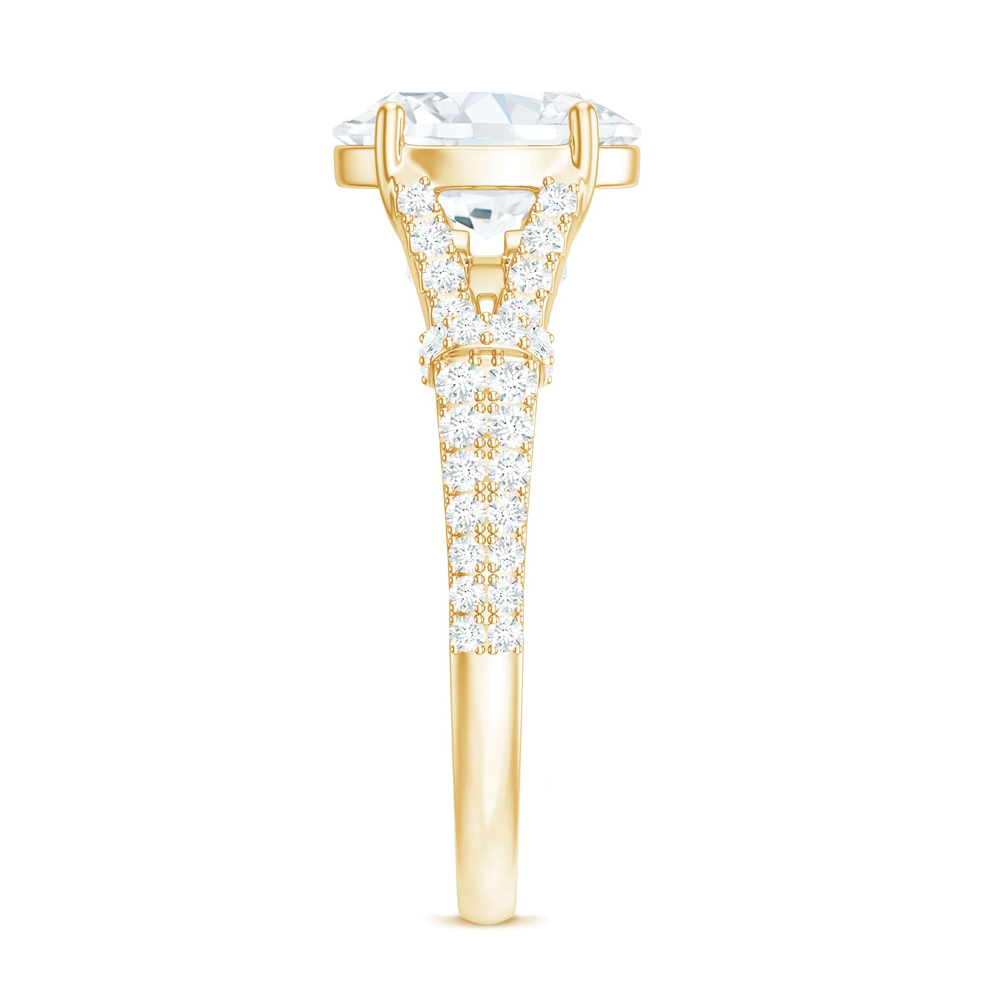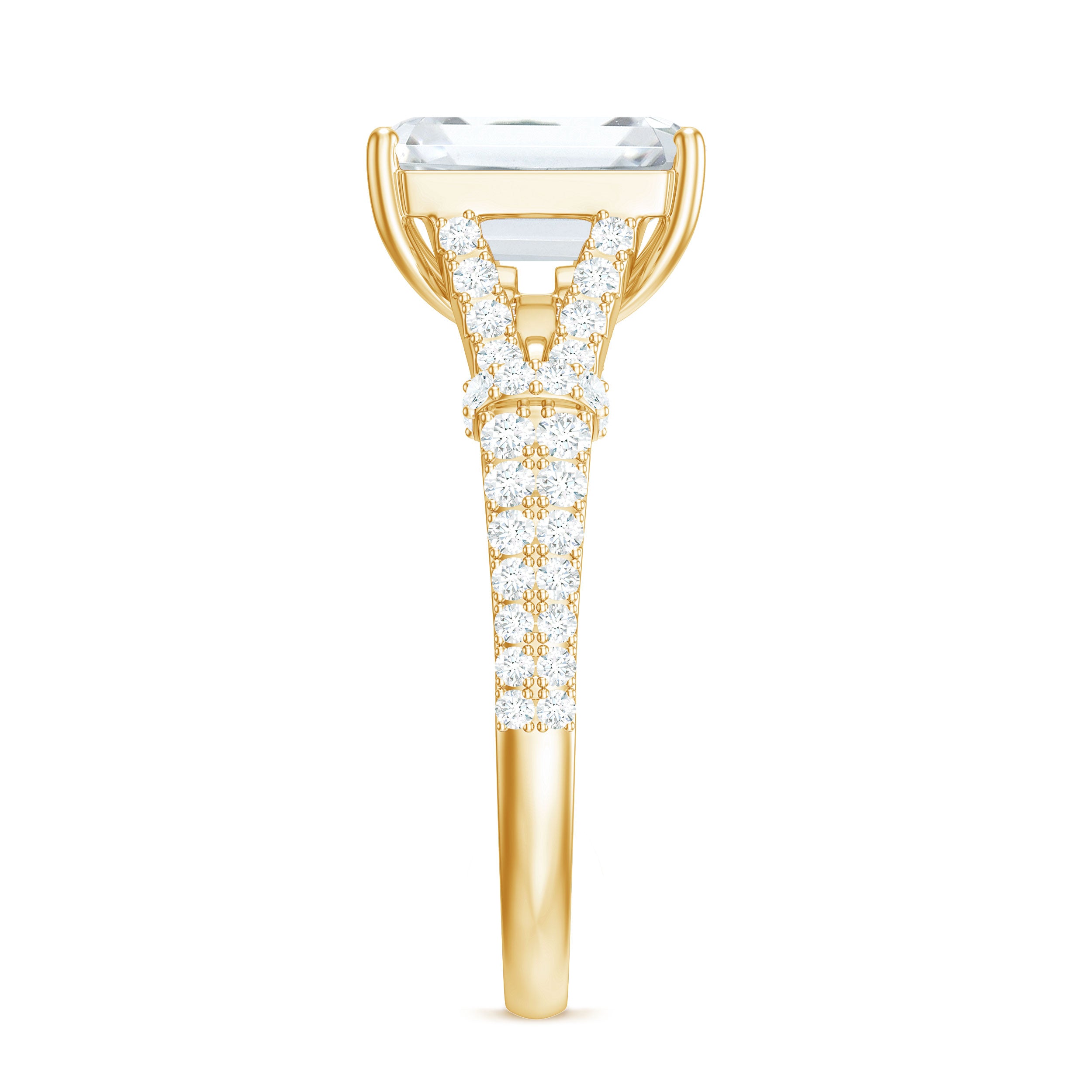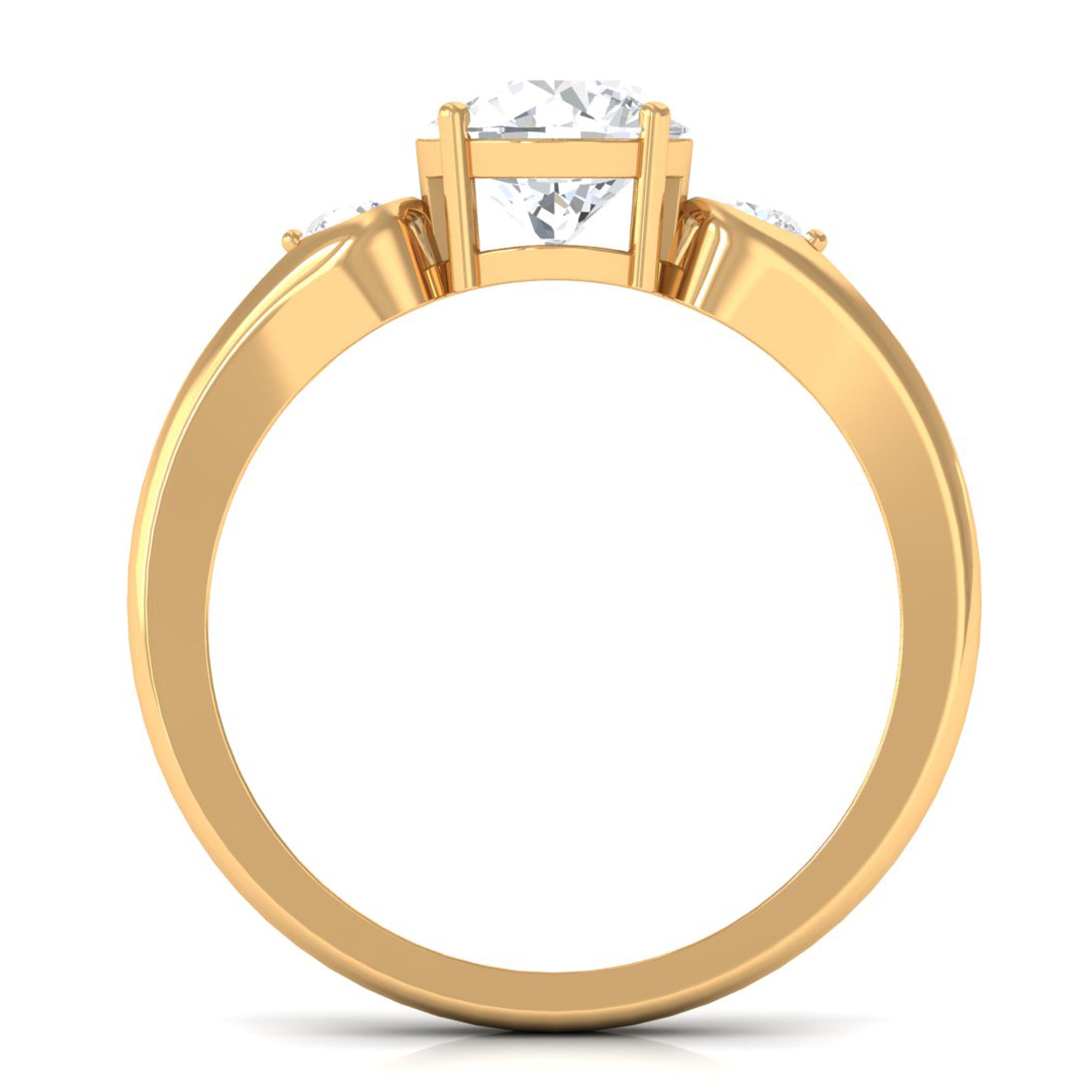 Halo moissanite rings: One center moissanite piece is surrounded by small accent moissanite, which is a halo moissanite setting. Halo gemstone settings are more affordable than gemstone solitaire rings, in case of the same total carat weight, and look similar. the side moissanite in yellow gold moissanite rings creates the illusion of a bigger gemstone.