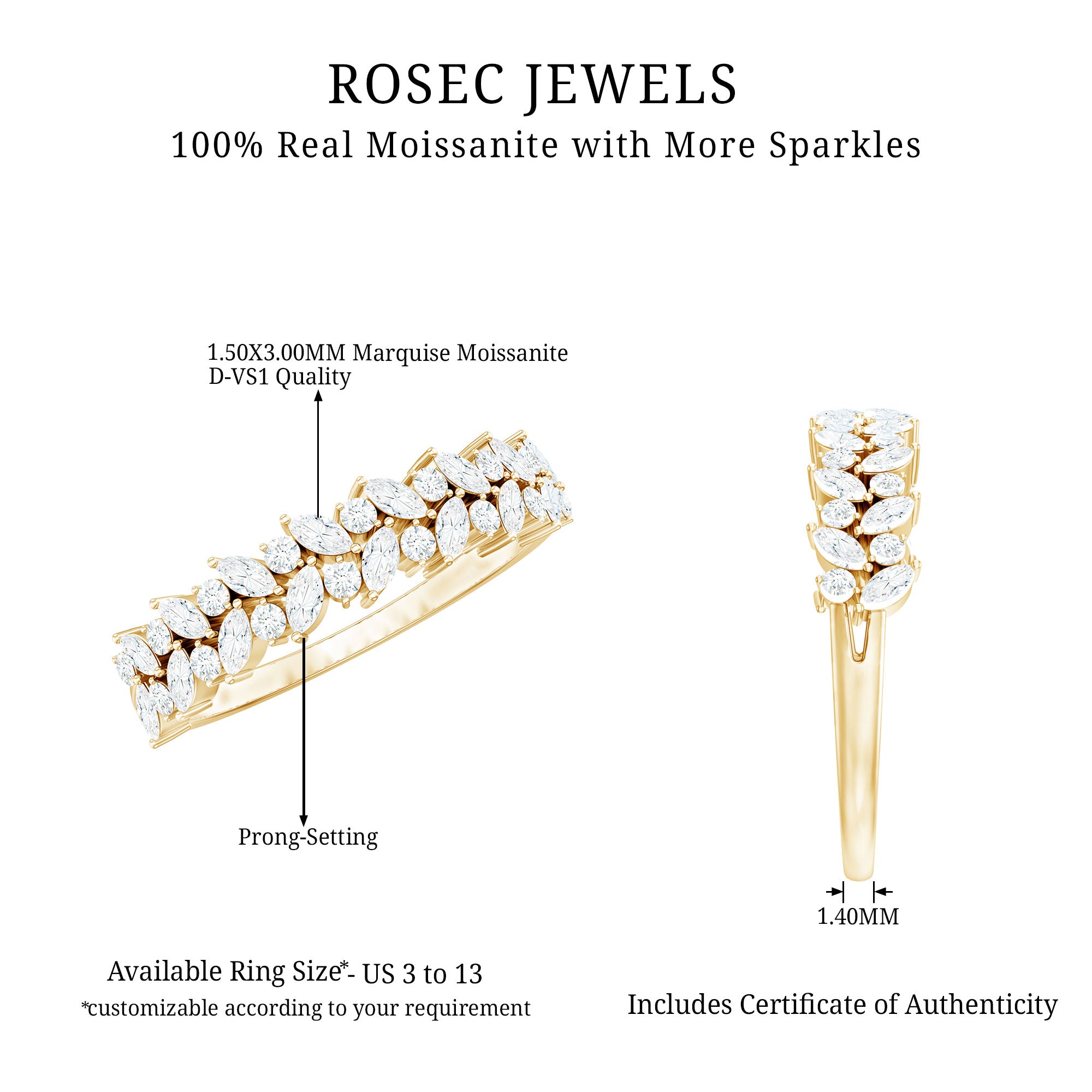 Moissanite has sparkle and fire similar to diamond, but jewelers can distinguish moissanite from diamond using appropriate testing tools. If this is important for you, choose a seller that clearly labels moissanite vs diamond and provides transparent product details.