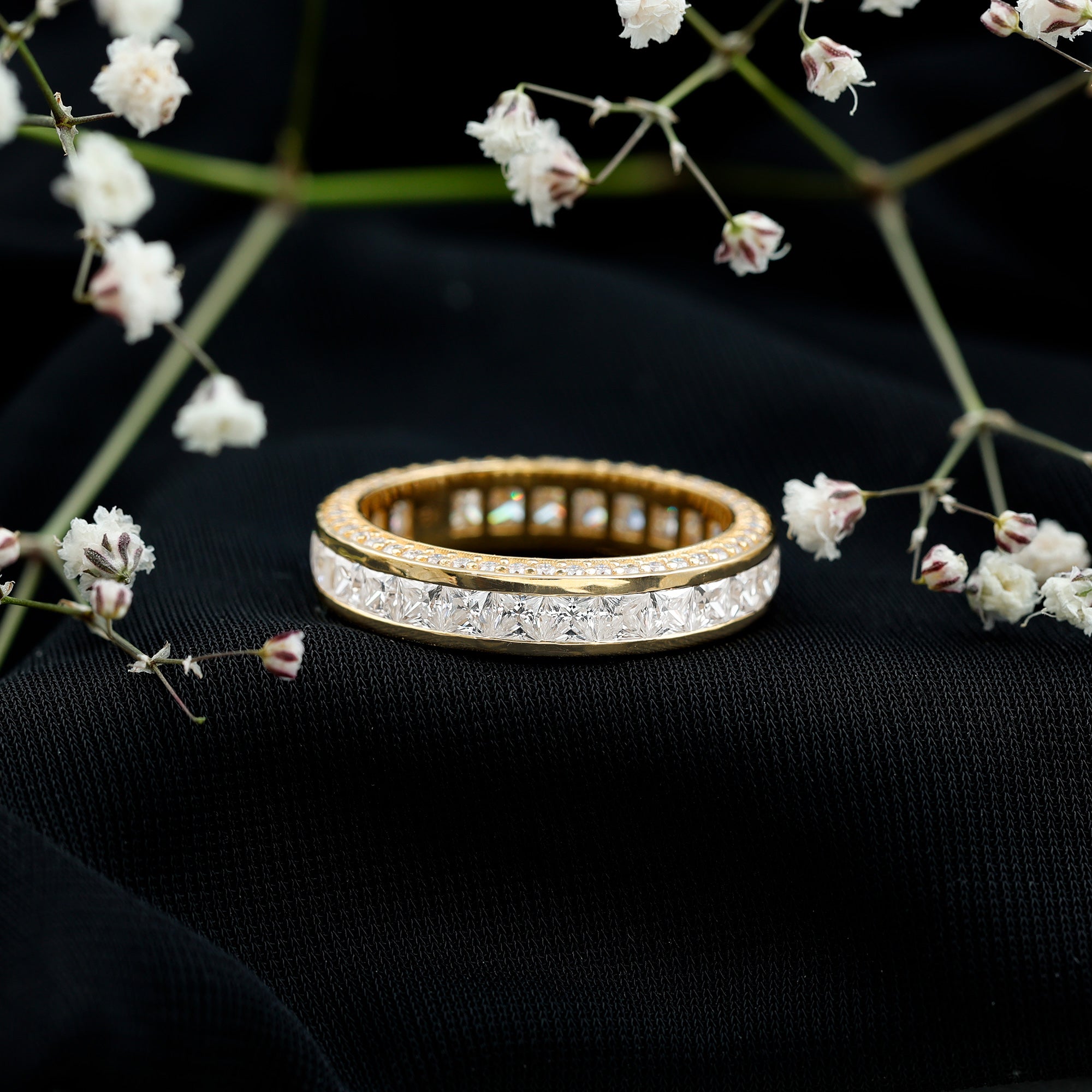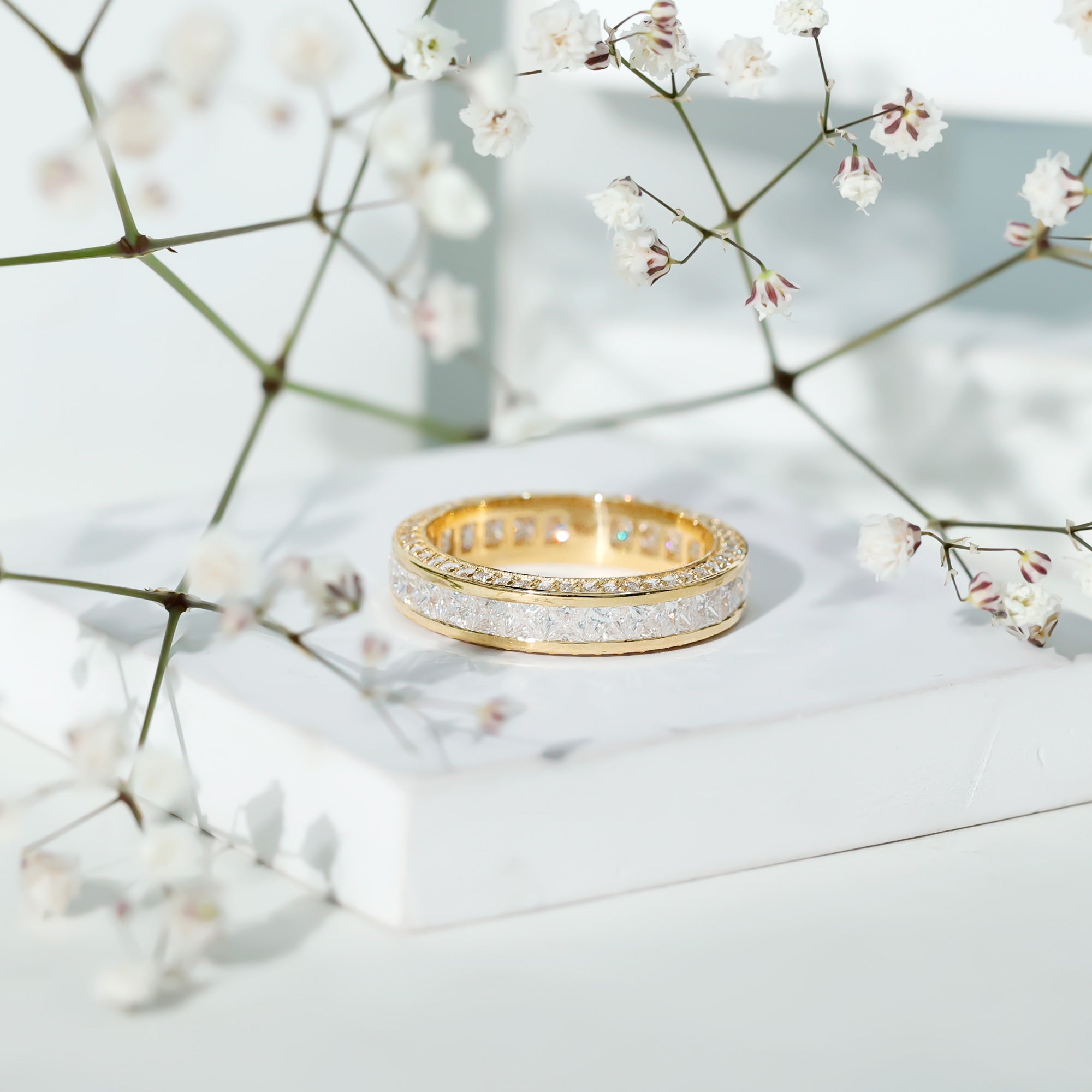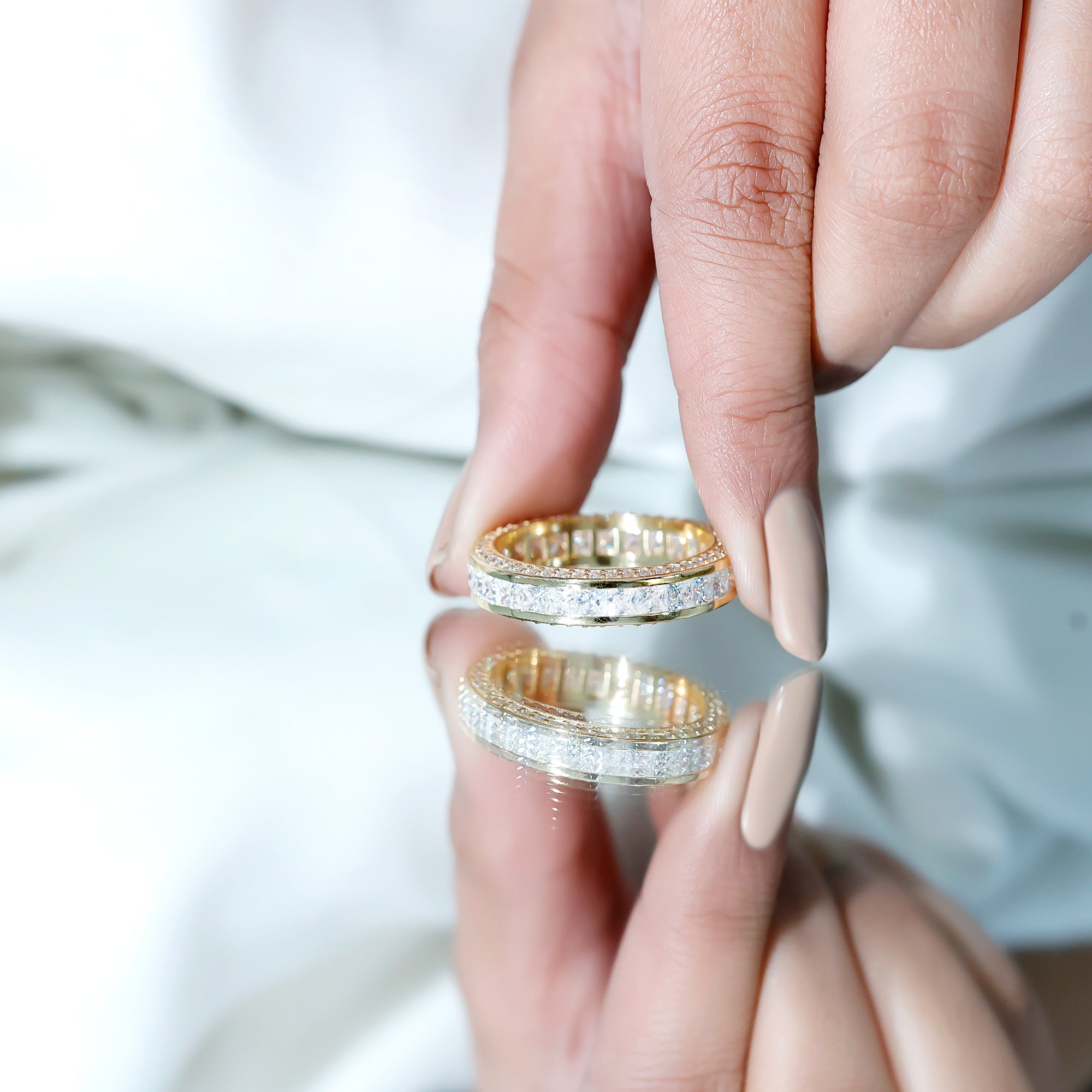 Moissanite is the best alternative to diamond for all the great reasons. The brilliant and fierce moissanite stackable wedding bands can withstand the test of time. Couple are considering moissanite wedding bands leaving behind the diamond ones as moissanite is pretty affordable. Being an Eco-friendly and cruelty-free stone gives moissanite a plus point for sustainability loving brides.