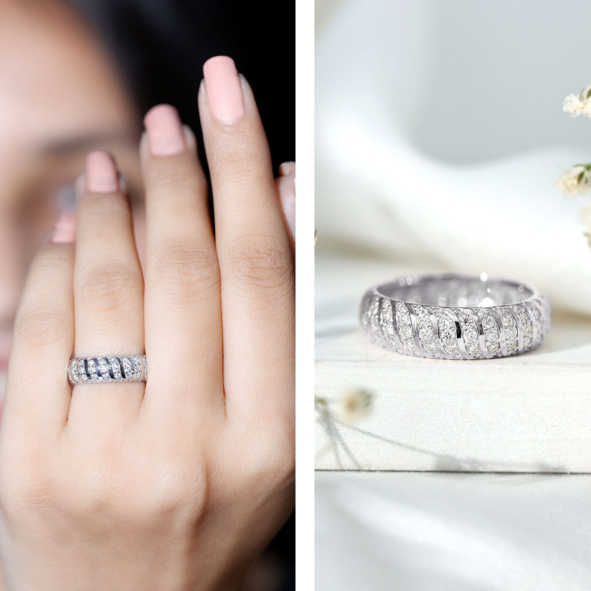 - Decide your sparkle level: Minimal accent bands are subtle; eternity-style bands deliver maximum shine.