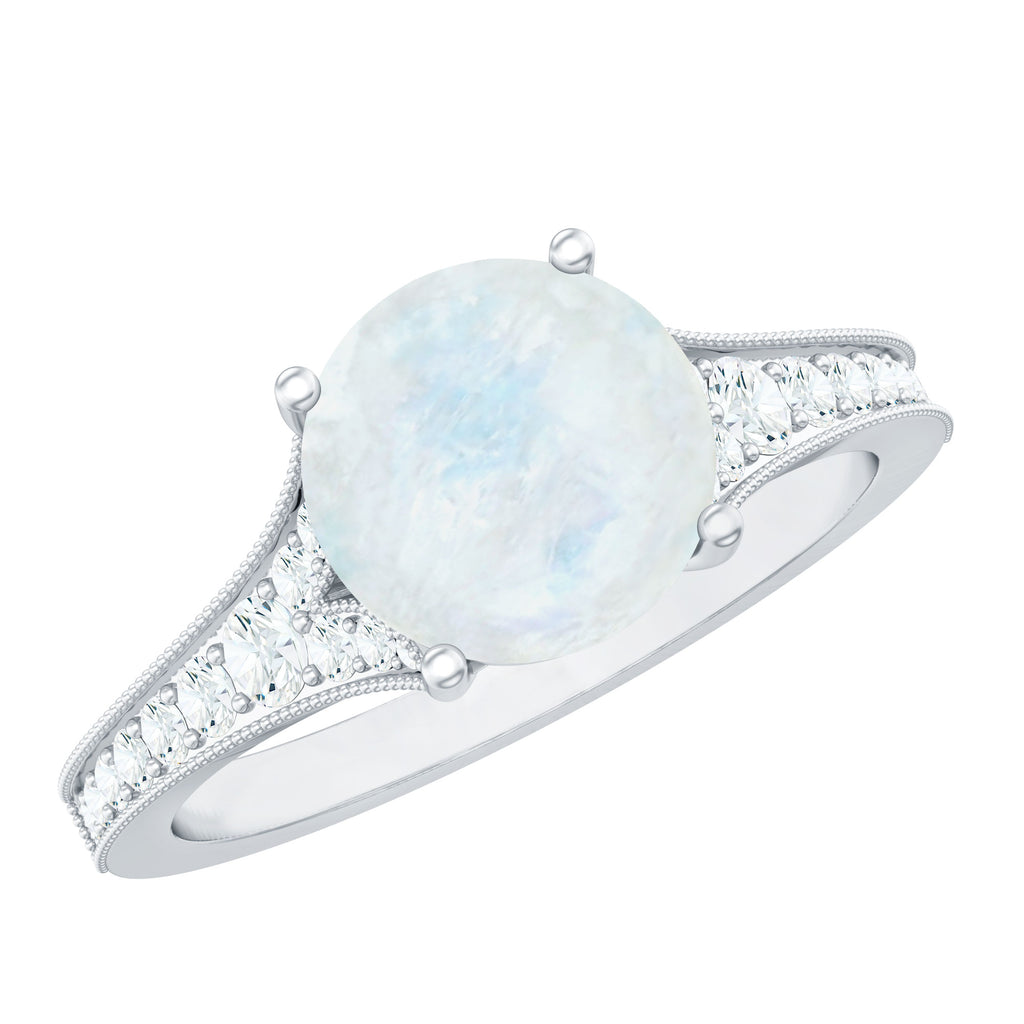 Easily the most sophisticated and Simple Moonstone Ring in the entire collection, a Solitaire Style features the Centerpiece of a Moonstone (of any shape) that stands out on its own. The Moonstone Solitaire here is at least 6 MM in size, which also makes it a one-of-a-kind choice of Moonstone Engagement Ring. It is fashioned in a versatile number of shapes that cater to just as many senses of style. While a Round or Oval Moonstone Ring exudes a conventional touch, a ring adorned with a princess, marquise, or pear-cut Moonstone is more on the fancier side of the spectrum. On the other hand, if you’re on the hunt for an Antique Moonstone Ring, go for the one fashioned in Emerald, Cushion, or Asscher cut Center stone.