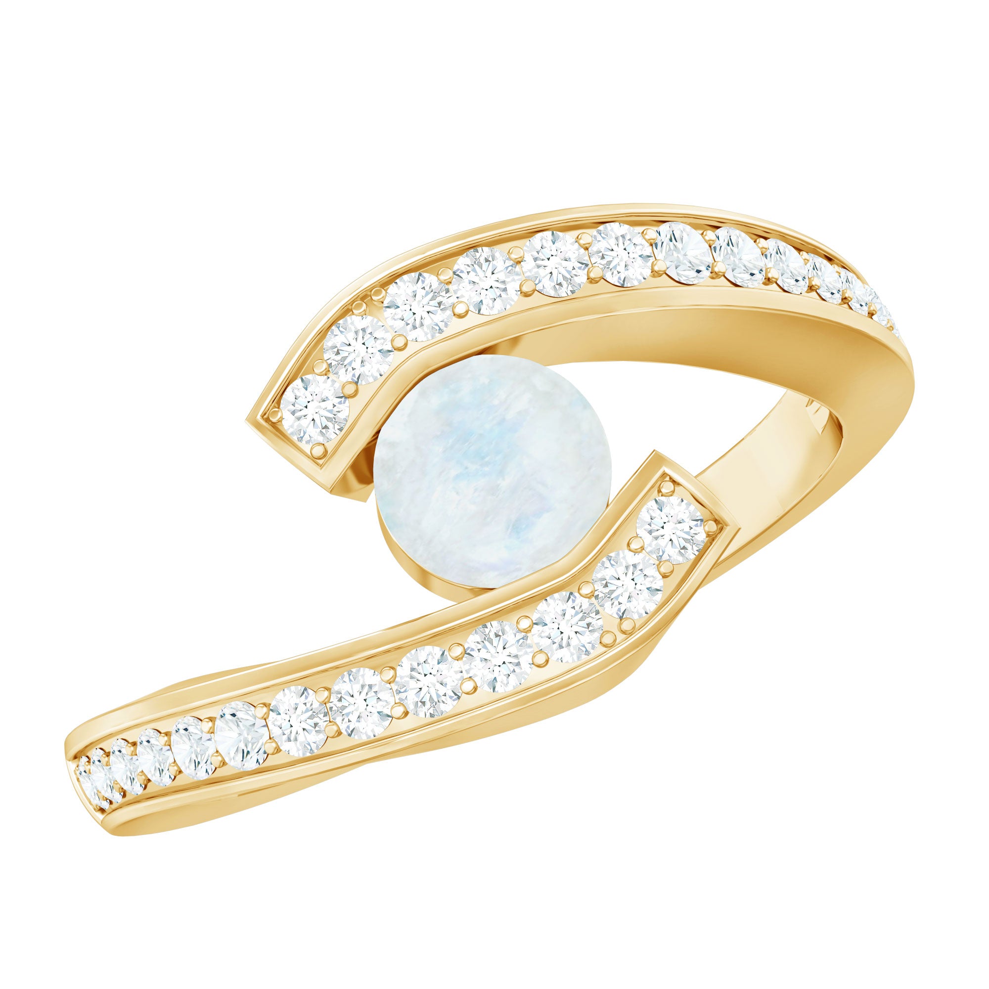 Easily the most sophisticated and Simple Moonstone Ring in the entire collection, a Solitaire Style features the Centerpiece of a Moonstone (of any shape) that stands out on its own. The Moonstone Solitaire here is at least 6 MM in size, which also makes it a one-of-a-kind choice of Moonstone Engagement Ring. It is fashioned in a versatile number of shapes that cater to just as many senses of style. While a Round or Oval Moonstone Ring exudes a conventional touch, a ring adorned with a princess, marquise, or pear-cut Moonstone is more on the fancier side of the spectrum. On the other hand, if you’re on the hunt for an Antique Moonstone Ring, go for the one fashioned in Emerald, Cushion, or Asscher cut Center stone.