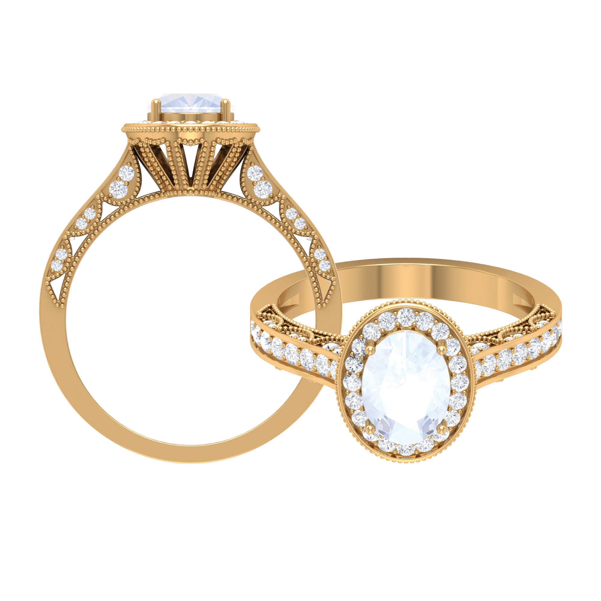 A Halo adorns the sheeny Centerpiece of Moonstone a sparkling touch with the shimmering parade of Diamond/Moissanite all around. Also, if you’re all about glitz and glam but still like a little classic touch, a Moonstone Ring with Diamonds (in a Halo) could be your best bet. The best part? It doesn’t just bestow more character on your Moonstone; it best highlights its beauty by making it appear larger.