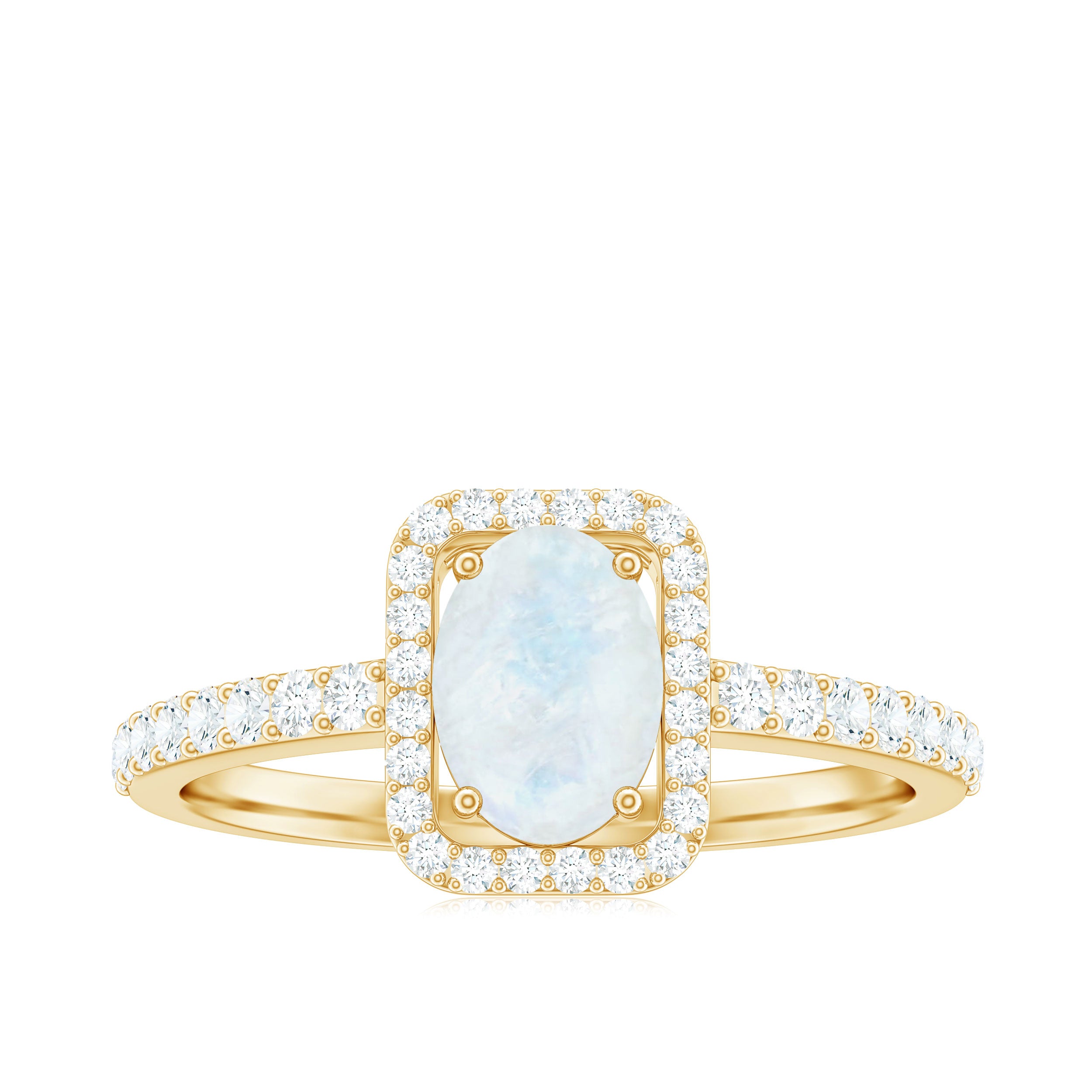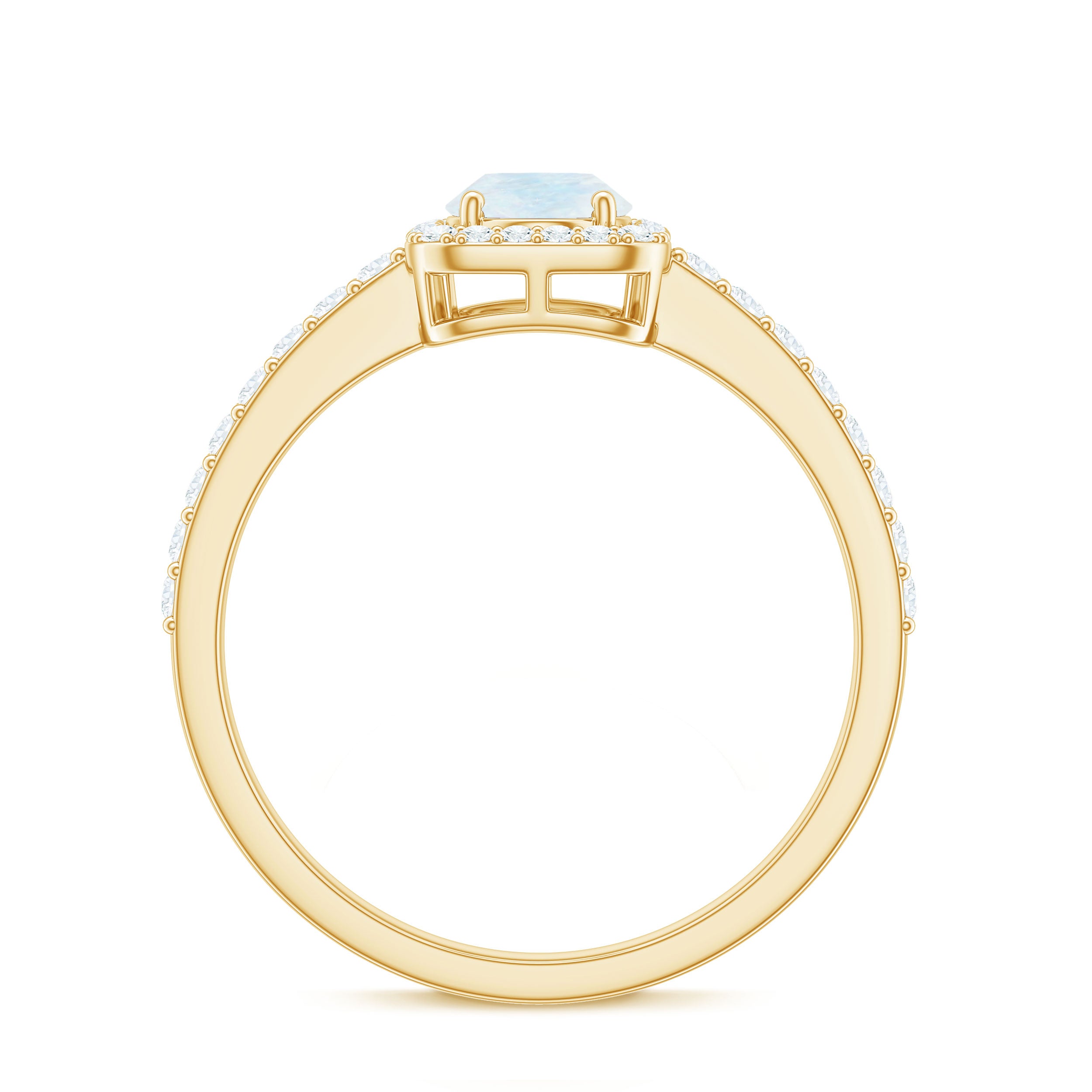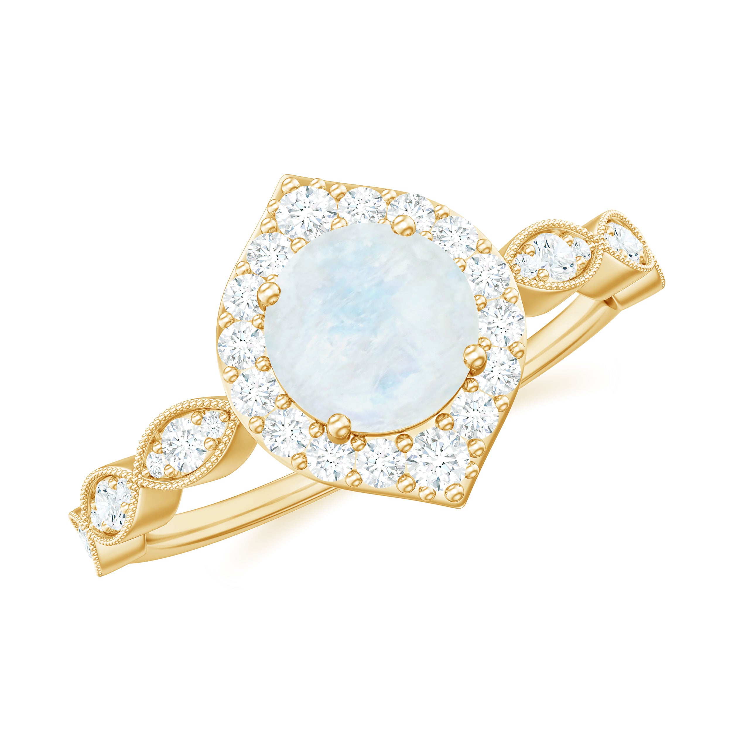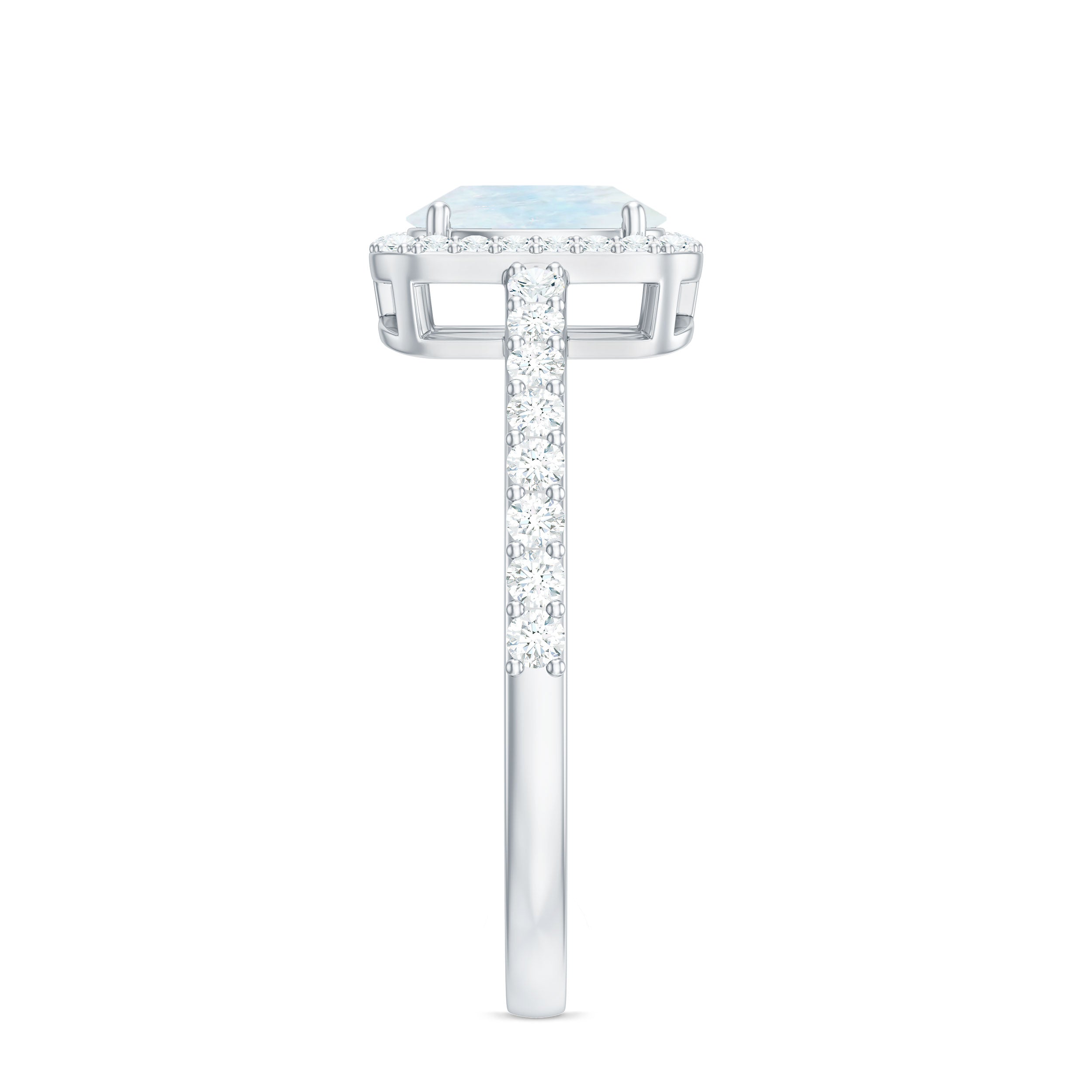 A Halo adorns the sheeny Centerpiece of Moonstone a sparkling touch with the shimmering parade of Diamond/Moissanite all around. Also, if you’re all about glitz and glam but still like a little classic touch, a Moonstone Ring with Diamonds (in a Halo) could be your best bet. The best part? It doesn’t just bestow more character on your Moonstone; it best highlights its beauty by making it appear larger.